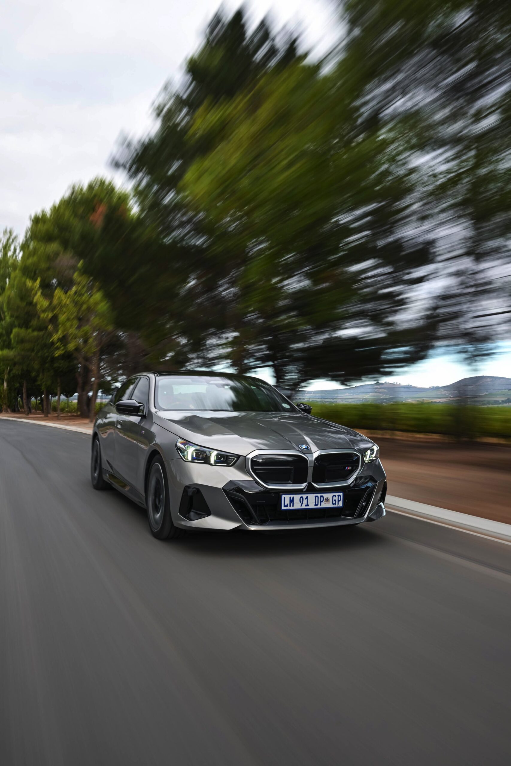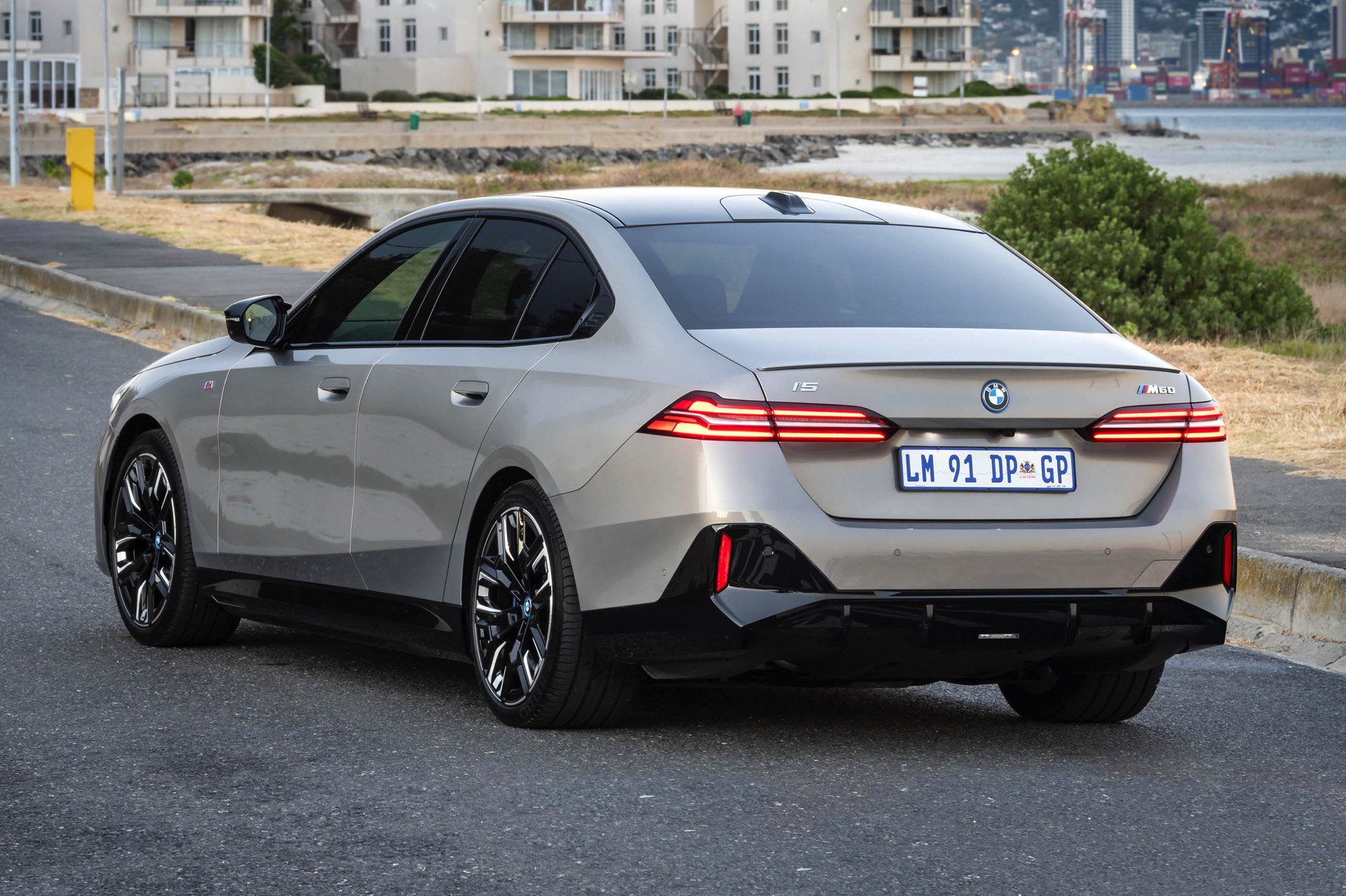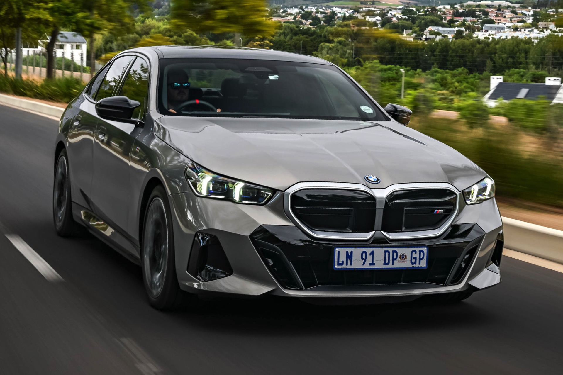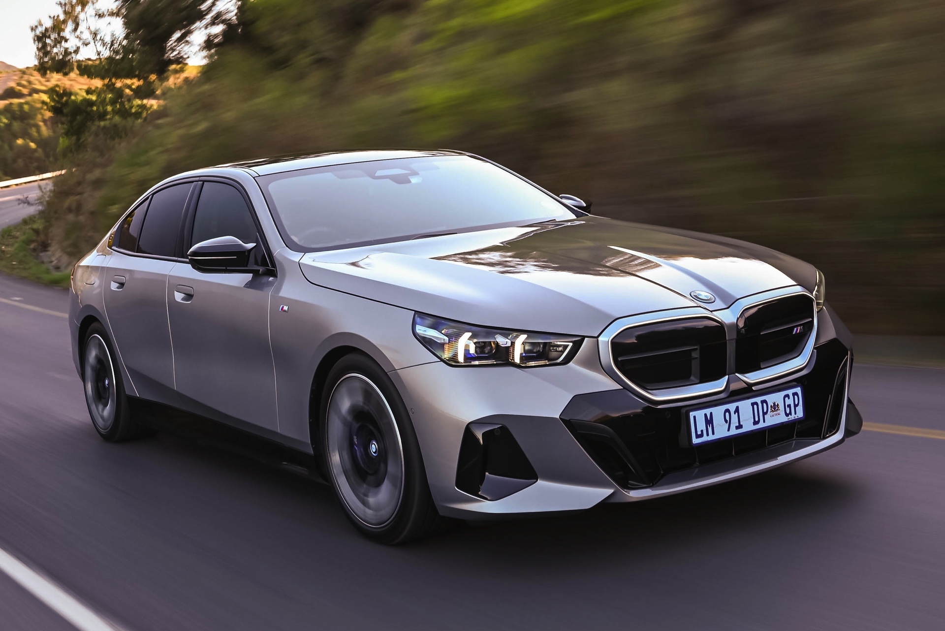 Beide Fahrzeuge tragen das M Sport-Paket beziehungsweise das im Fall des i5 M60 serienmäßige M Aerodynamik-Paket, beide sind mit der beleuchteten Iconic Glow Niere ausgerüstet und beide stehen auf 20 Zoll großen Felgen. Eine weitere Gemeinsamkeit ist der Verzicht auf das M Sport Pro-Paket und die Shadow Line mit erweiterten Umfängen, stattdessen dürfen einige Exterieur-Umfänge weiterhin silbern glänzen. Der BMW i5 M60 im helleren Oxidgrau verfügt dennoch über zahlreiche schwarze Details: Die Lufteinlässe der Frontschürze werden ebenso von großen schwarz lackierten Flächen betont wie das mächtige Diffusor-Element am Heck, dazu kommen schwarze M Außenspiegel, schwarze Seitenschweller, die Sonnenschutzverglasung und die überwiegend in Schwarz gehaltenen 20 Zoll-Aerodynamikräder 940 M Bicolor Jetblack.