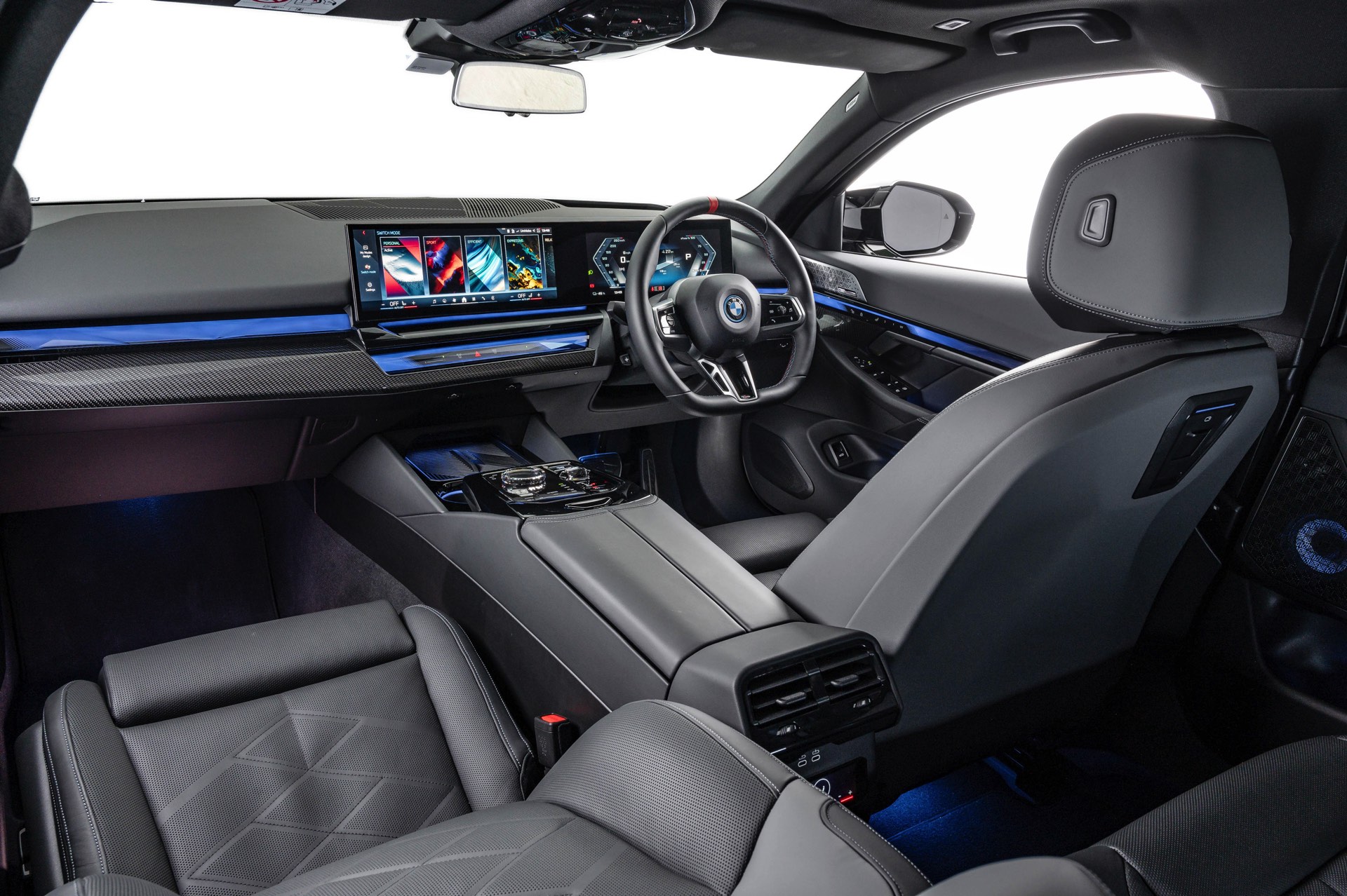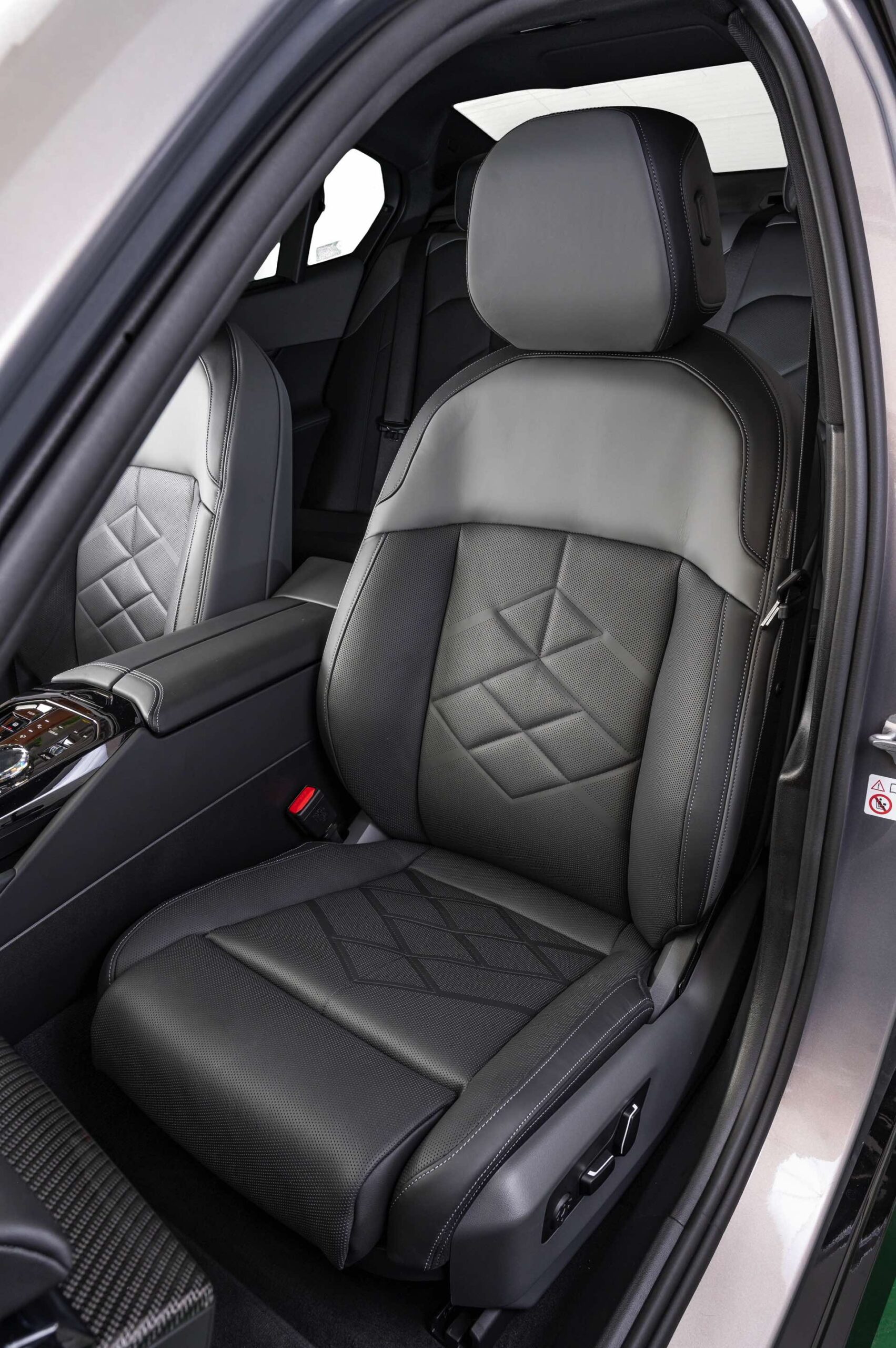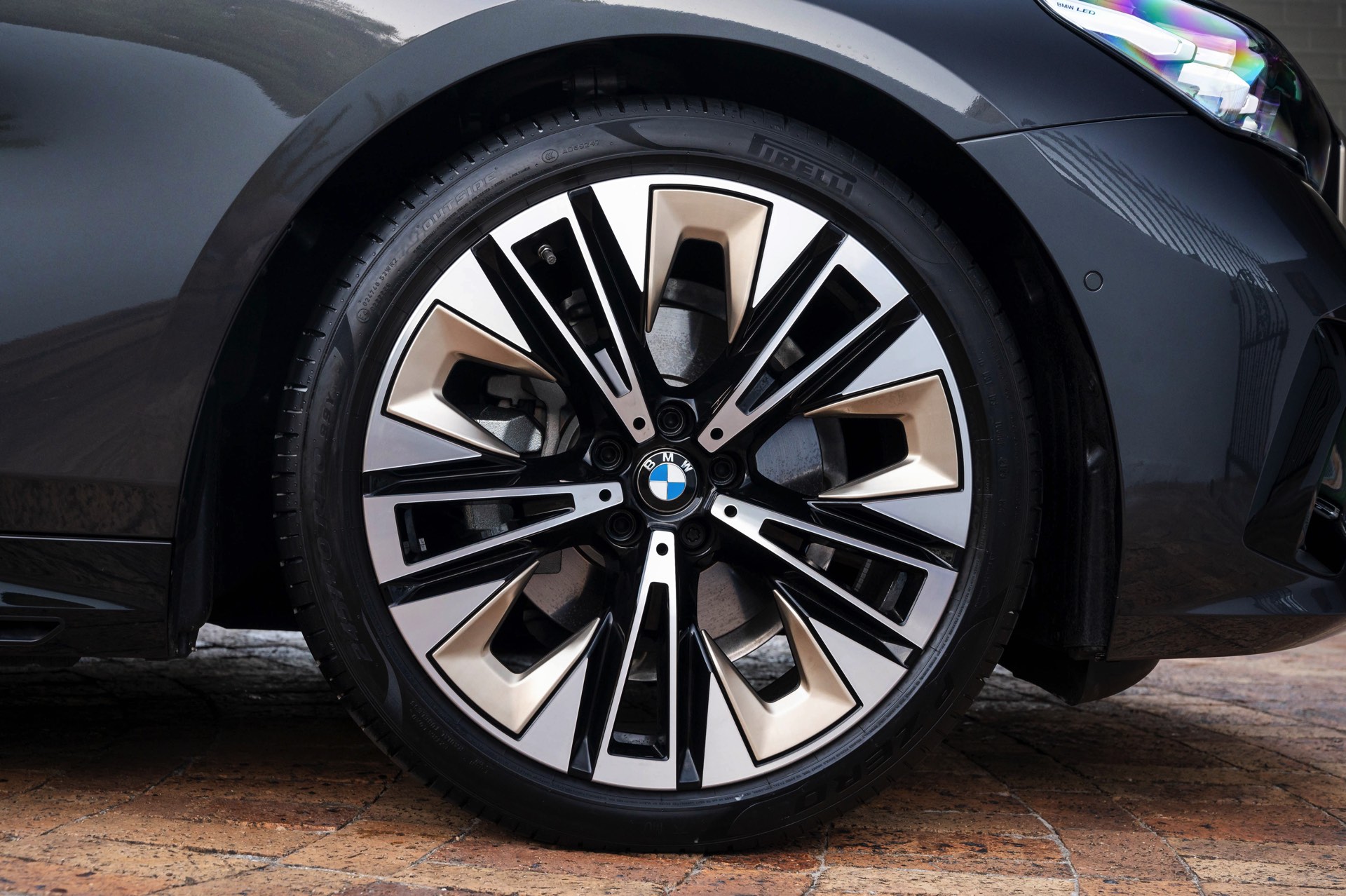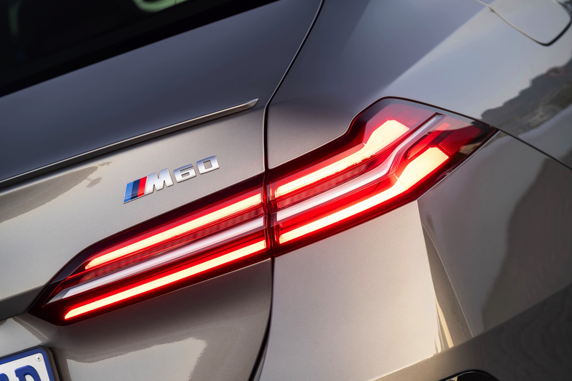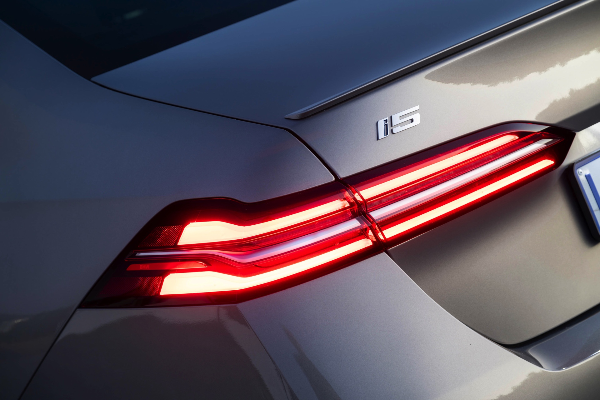 Beide Fahrzeuge tragen das M Sport-Paket beziehungsweise das im Fall des i5 M60 serienmäßige M Aerodynamik-Paket, beide sind mit der beleuchteten Iconic Glow Niere ausgerüstet und beide stehen auf 20 Zoll großen Felgen. Eine weitere Gemeinsamkeit ist der Verzicht auf das M Sport Pro-Paket und die Shadow Line mit erweiterten Umfängen, stattdessen dürfen einige Exterieur-Umfänge weiterhin silbern glänzen. Der BMW i5 M60 im helleren Oxidgrau verfügt dennoch über zahlreiche schwarze Details: Die Lufteinlässe der Frontschürze werden ebenso von großen schwarz lackierten Flächen betont wie das mächtige Diffusor-Element am Heck, dazu kommen schwarze M Außenspiegel, schwarze Seitenschweller, die Sonnenschutzverglasung und die überwiegend in Schwarz gehaltenen 20 Zoll-Aerodynamikräder 940 M Bicolor Jetblack.
