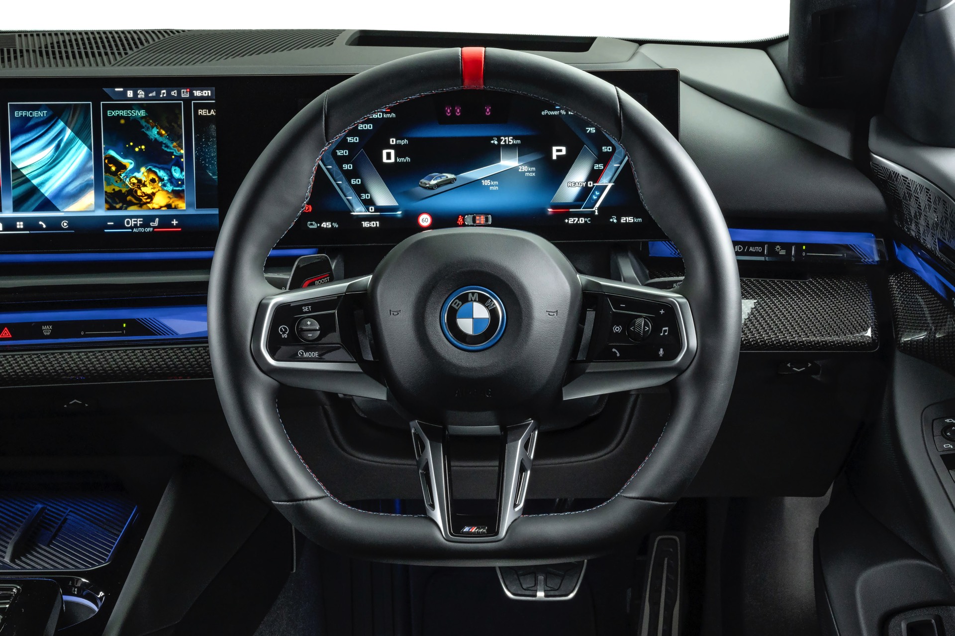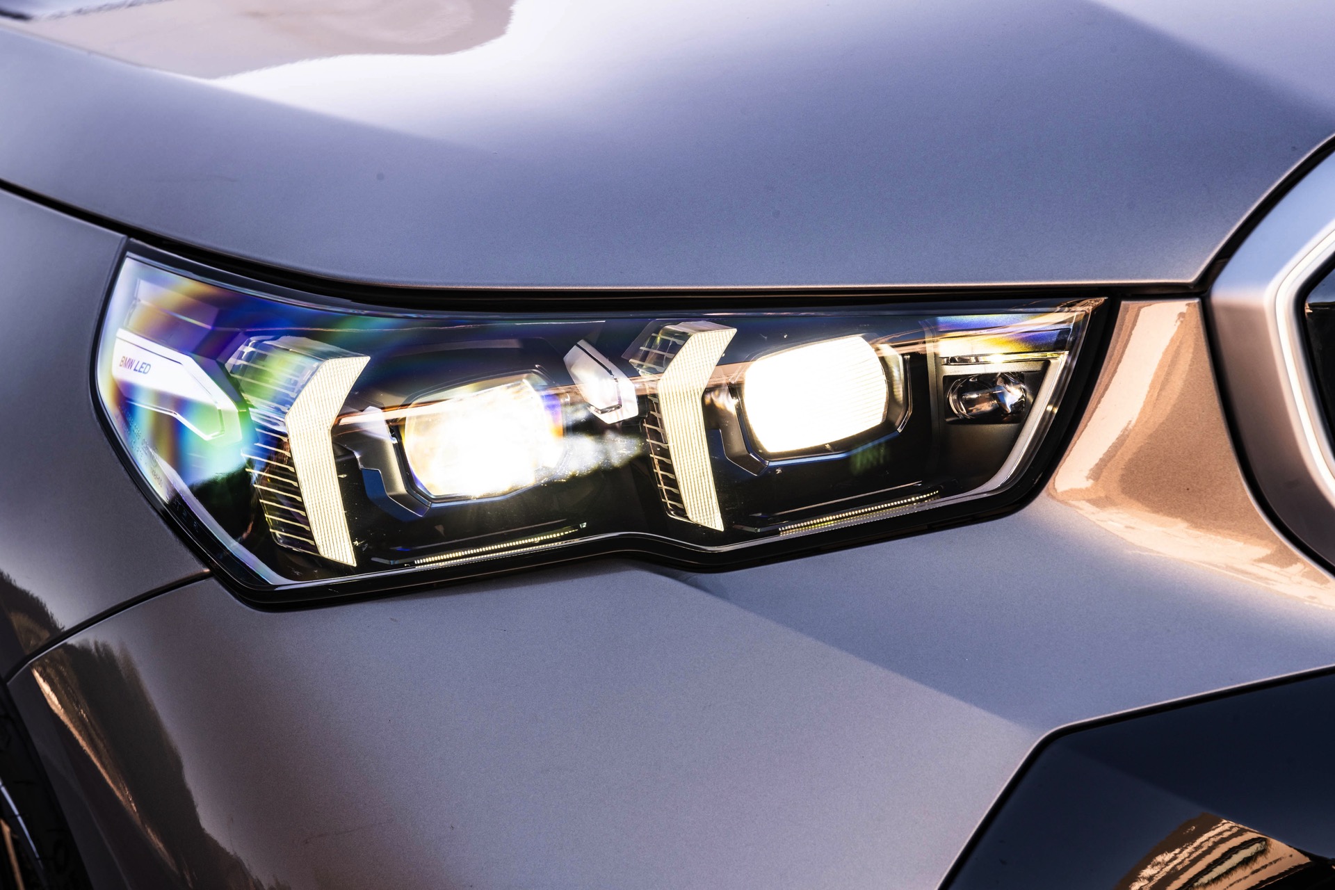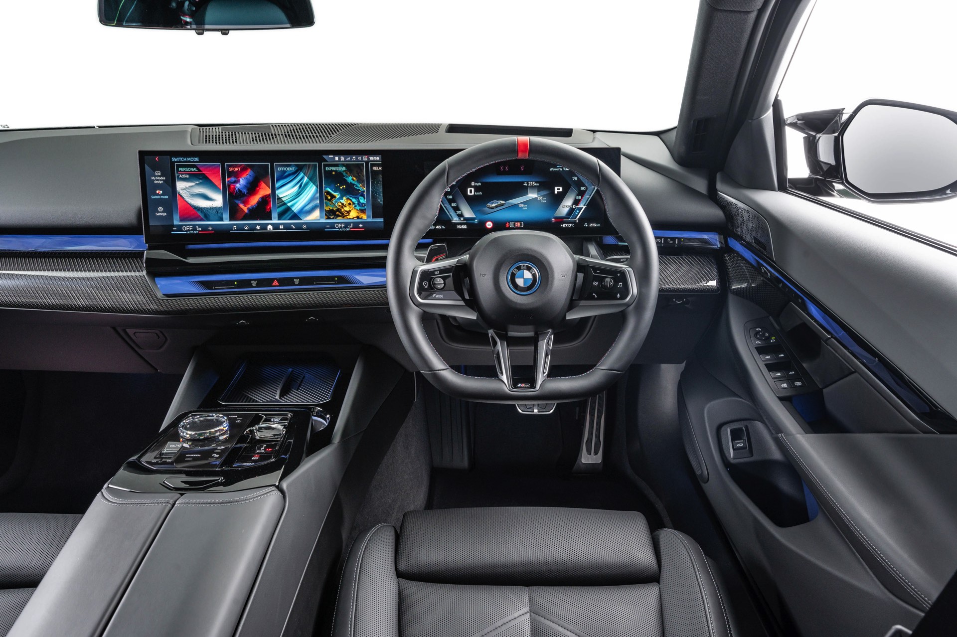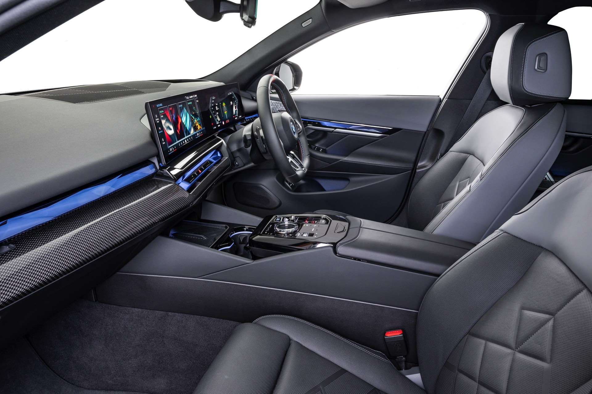 Beide Fahrzeuge tragen das M Sport-Paket beziehungsweise das im Fall des i5 M60 serienmäßige M Aerodynamik-Paket, beide sind mit der beleuchteten Iconic Glow Niere ausgerüstet und beide stehen auf 20 Zoll großen Felgen. Eine weitere Gemeinsamkeit ist der Verzicht auf das M Sport Pro-Paket und die Shadow Line mit erweiterten Umfängen, stattdessen dürfen einige Exterieur-Umfänge weiterhin silbern glänzen. Der BMW i5 M60 im helleren Oxidgrau verfügt dennoch über zahlreiche schwarze Details: Die Lufteinlässe der Frontschürze werden ebenso von großen schwarz lackierten Flächen betont wie das mächtige Diffusor-Element am Heck, dazu kommen schwarze M Außenspiegel, schwarze Seitenschweller, die Sonnenschutzverglasung und die überwiegend in Schwarz gehaltenen 20 Zoll-Aerodynamikräder 940 M Bicolor Jetblack.
