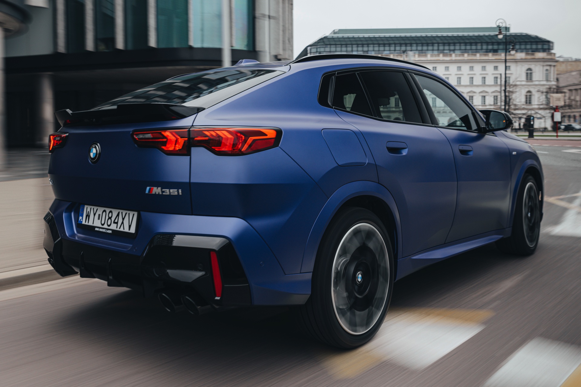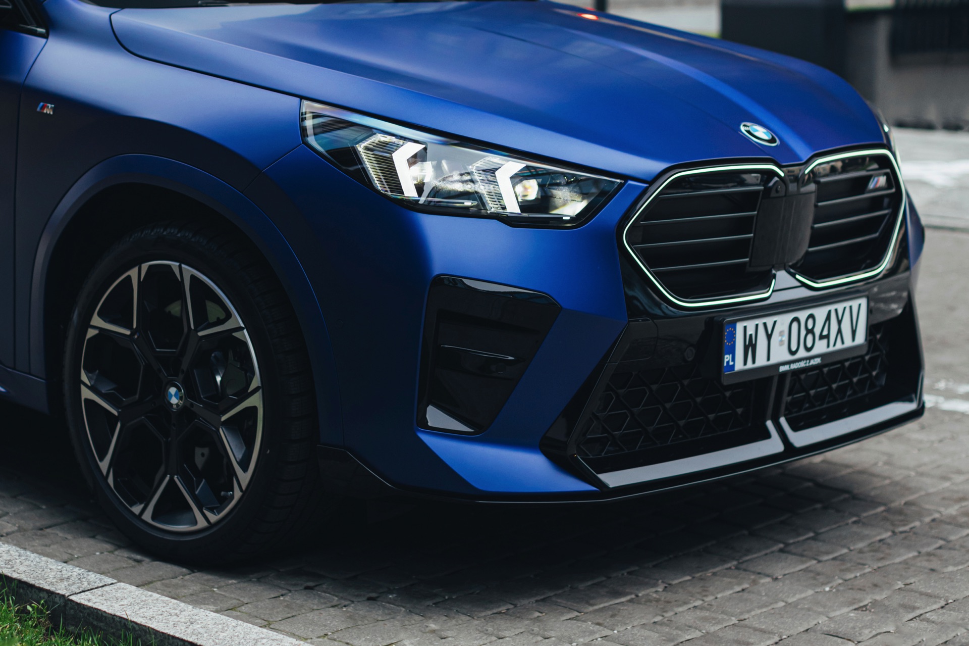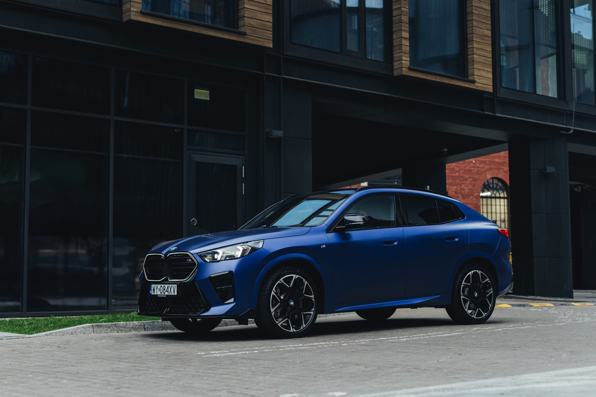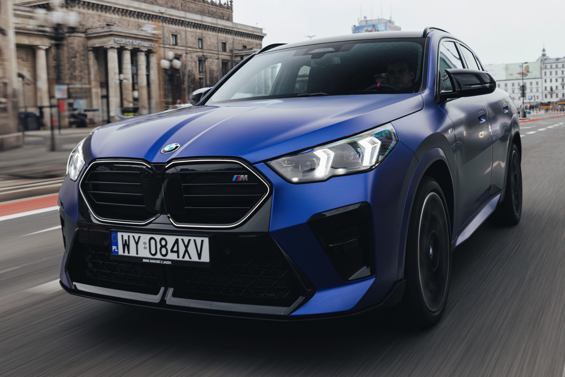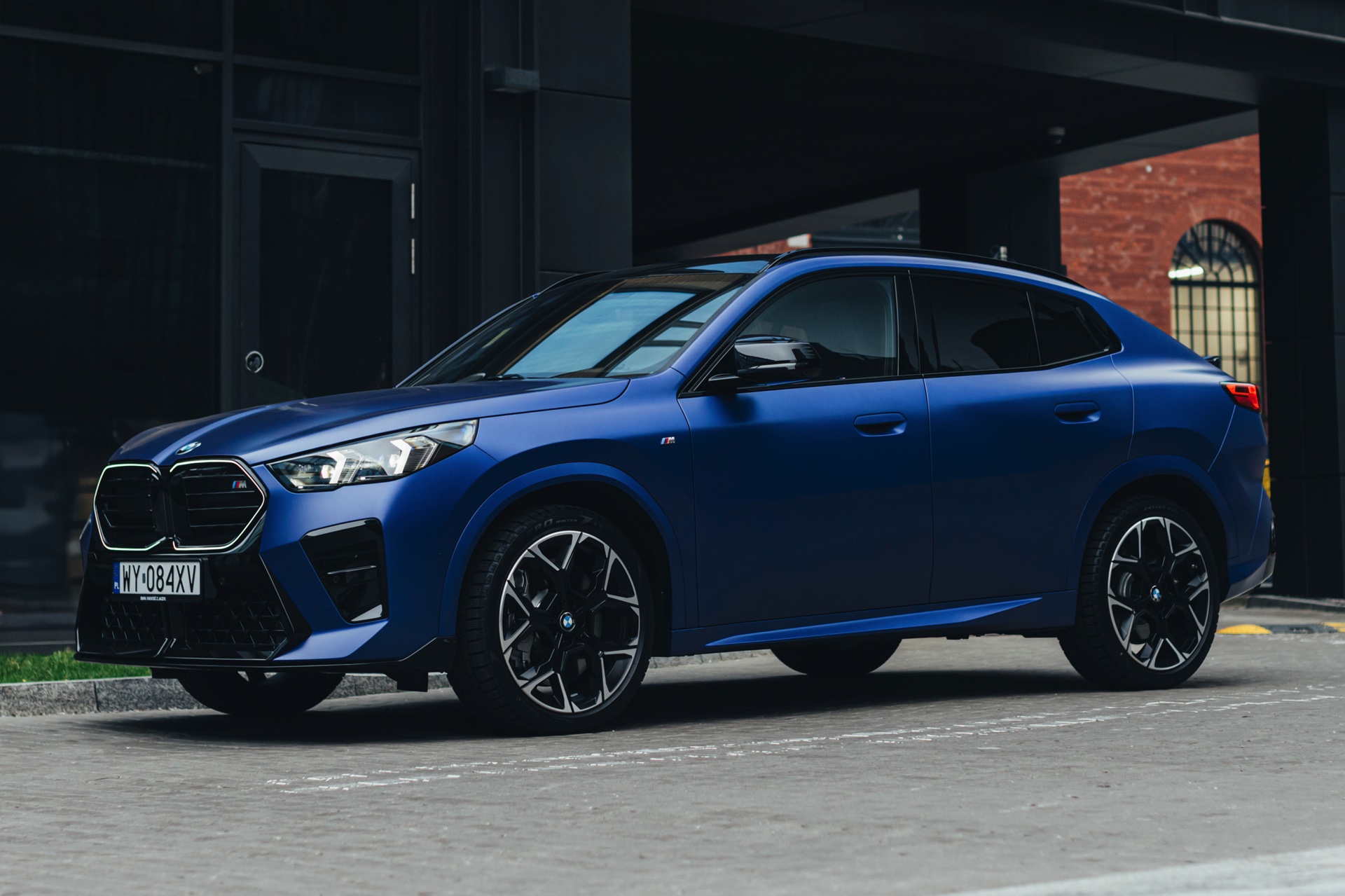 Frozen Portimao Blue ist der Star einer neuen Foto-Serie zum BMW X2 (U10) in Warschau. Das intensive Blau mit mattem Finish wird dabei auf einem X2 M35i präsentiert, der zudem das M Sportpaket Pro trägt und deshalb mit den schwarzen Umfängen der Shadow Line mit erweiterten Umfängen glänzt. Besonders sichtbar wird das an der schwarzen Niere, die bei aktivierter Zündung dank Iconic Glow-Beleuchtung dennoch prominent in Erscheinung tritt. Während die meisten Details des gezeigten X2 für alle Motorisierungen verfügbar sind, sind das Nieren-Innenleben mit horizontalen Streben und die vier Endrohre am Heck exklusiv dem Topmodell M35i vorbehalten.