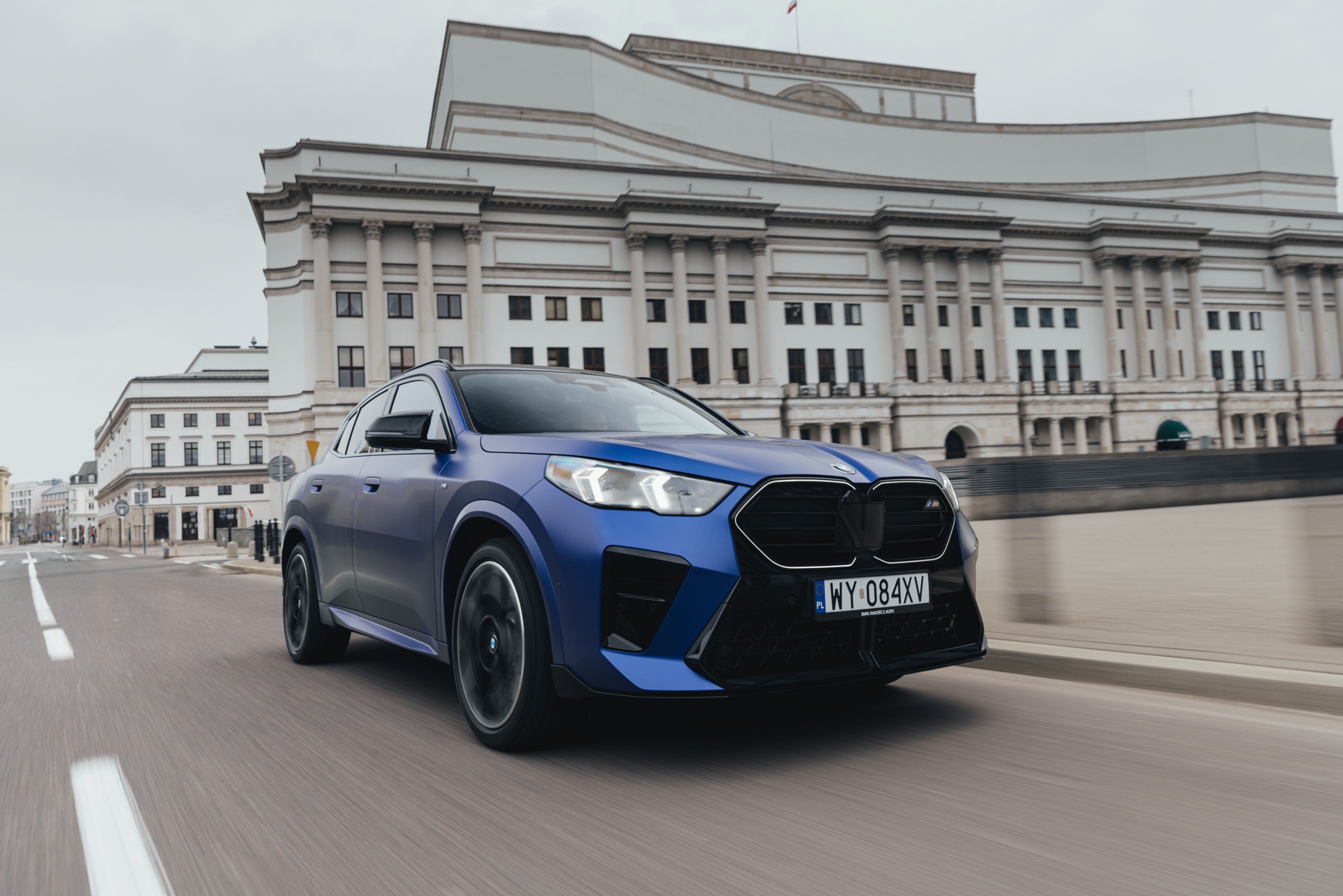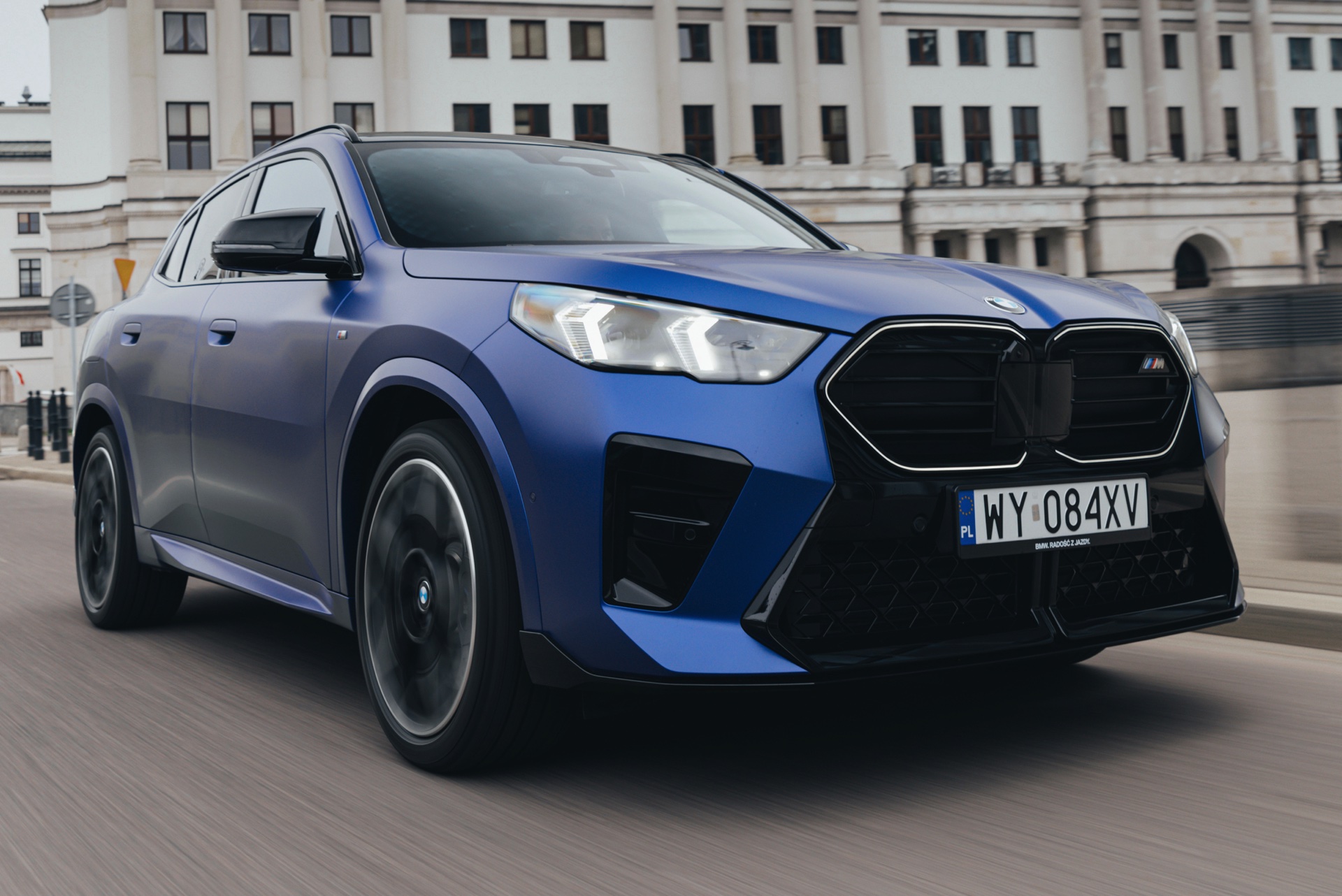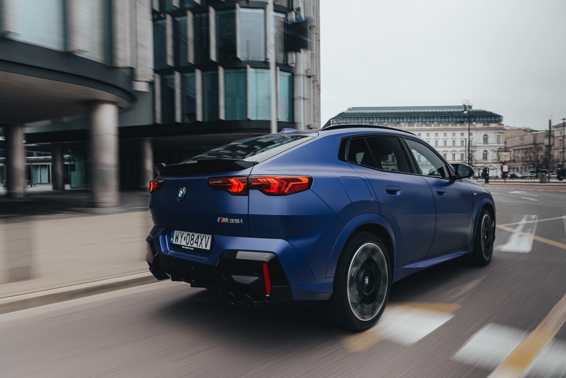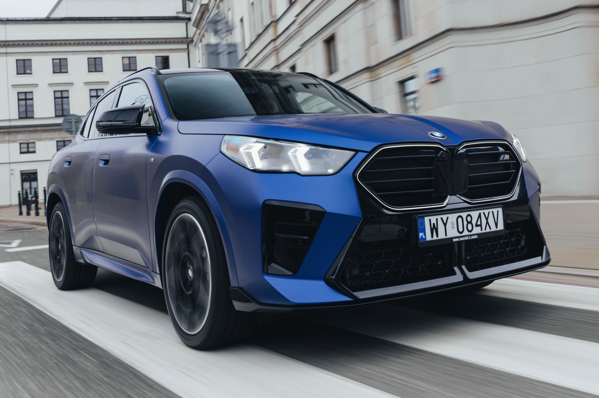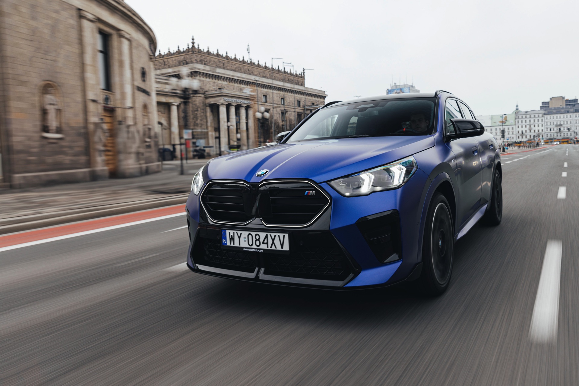Frozen Portimao Blue ist der Star einer neuen Foto-Serie zum BMW X2 (U10) in Warschau. Das intensive Blau mit mattem Finish wird dabei auf einem X2 M35i präsentiert, der zudem das M Sportpaket Pro trägt und deshalb mit den schwarzen Umfängen der Shadow Line mit erweiterten Umfängen glänzt. Besonders sichtbar wird das an der schwarzen Niere, die bei aktivierter Zündung dank Iconic Glow-Beleuchtung dennoch prominent in Erscheinung tritt. Während die meisten Details des gezeigten X2 für alle Motorisierungen verfügbar sind, sind das Nieren-Innenleben mit horizontalen Streben und die vier Endrohre am Heck exklusiv dem Topmodell M35i vorbehalten.