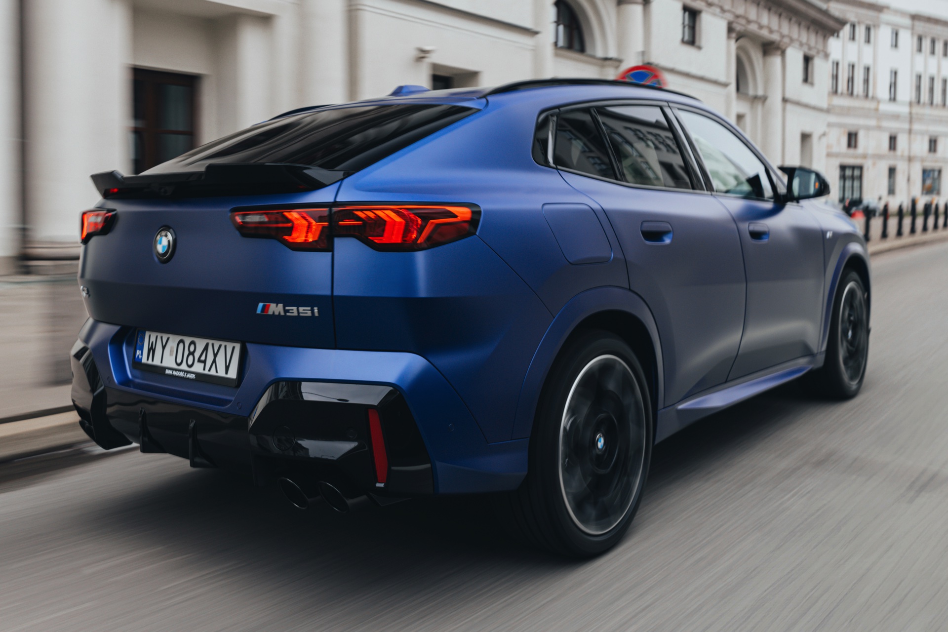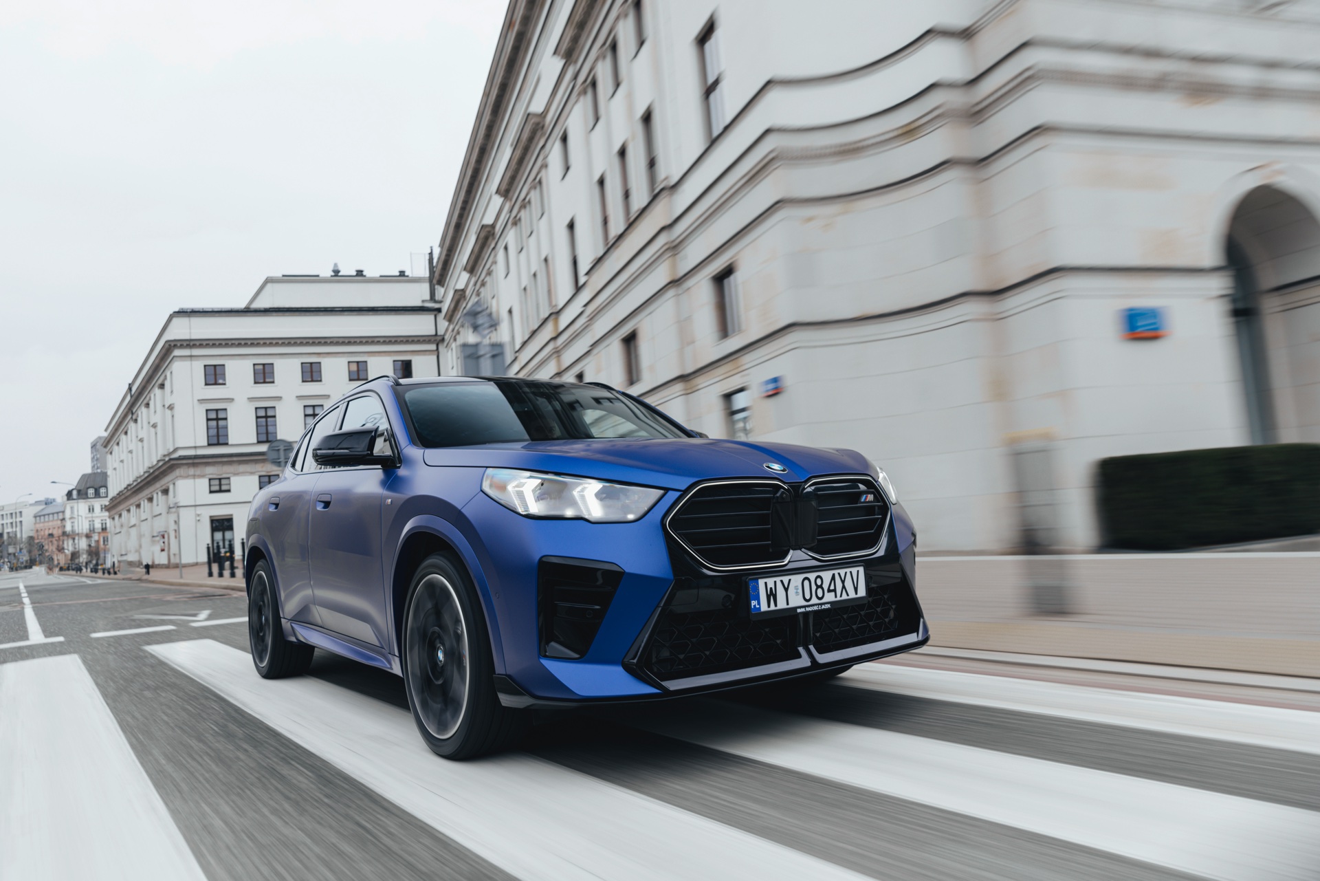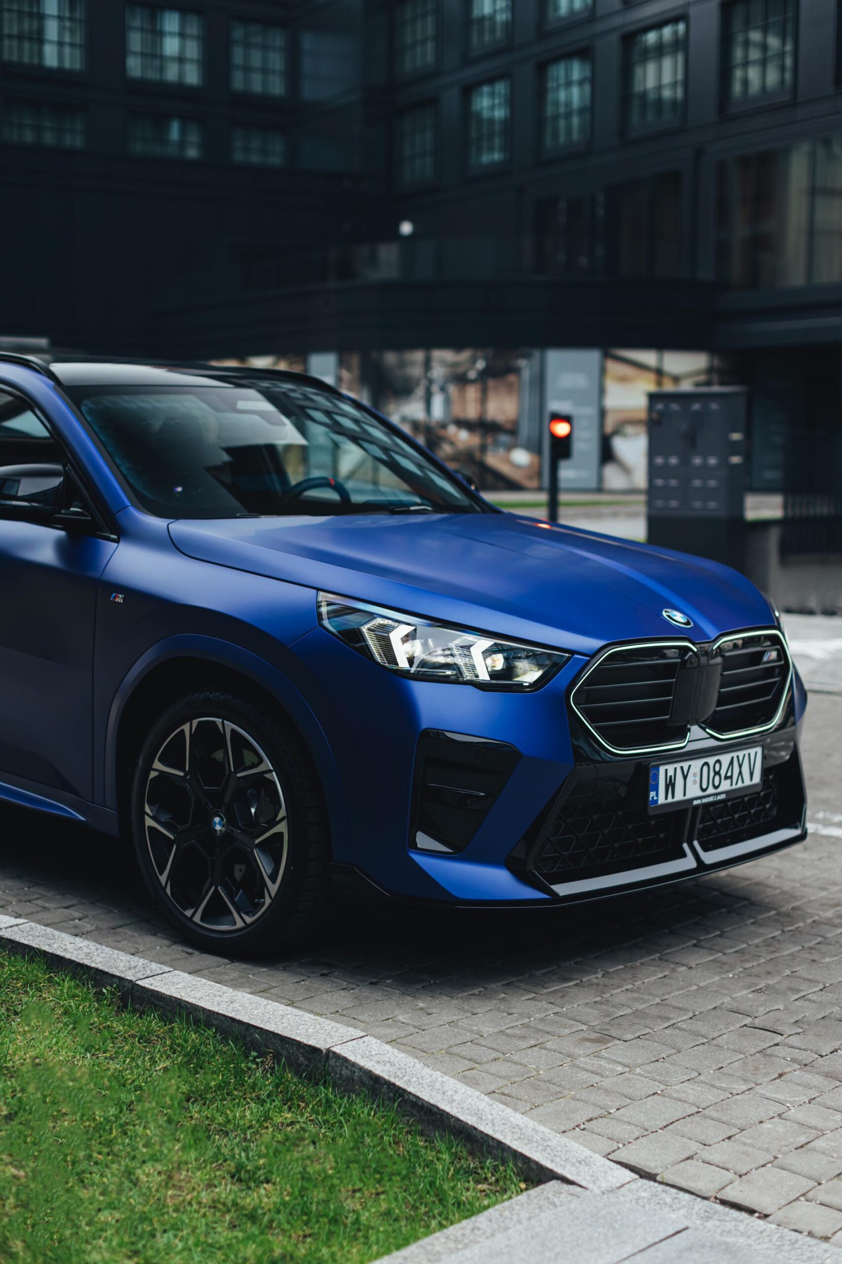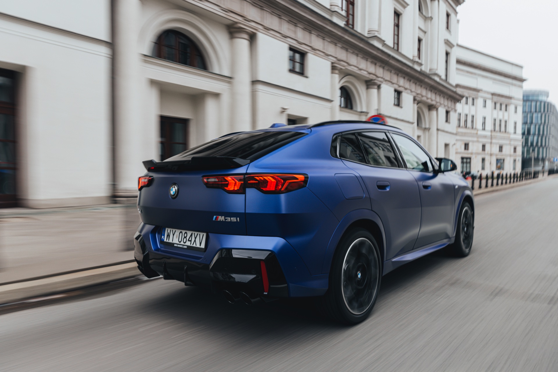 Frozen Portimao Blue ist der Star einer neuen Foto-Serie zum BMW X2 (U10) in Warschau. Das intensive Blau mit mattem Finish wird dabei auf einem X2 M35i präsentiert, der zudem das M Sportpaket Pro trägt und deshalb mit den schwarzen Umfängen der Shadow Line mit erweiterten Umfängen glänzt. Besonders sichtbar wird das an der schwarzen Niere, die bei aktivierter Zündung dank Iconic Glow-Beleuchtung dennoch prominent in Erscheinung tritt. Während die meisten Details des gezeigten X2 für alle Motorisierungen verfügbar sind, sind das Nieren-Innenleben mit horizontalen Streben und die vier Endrohre am Heck exklusiv dem Topmodell M35i vorbehalten.