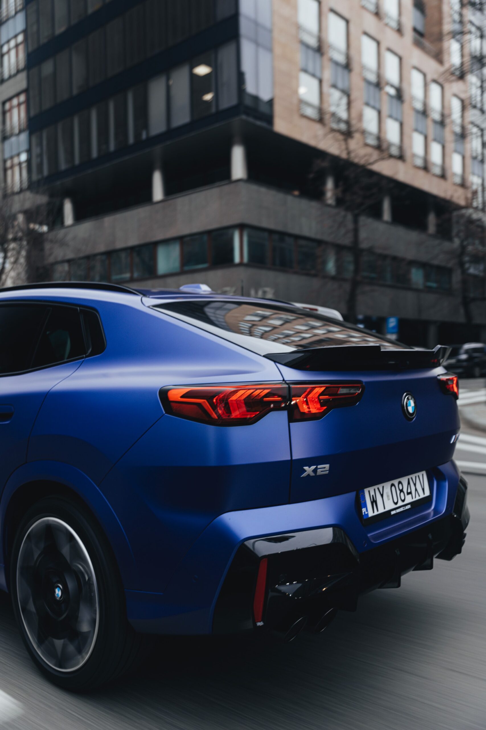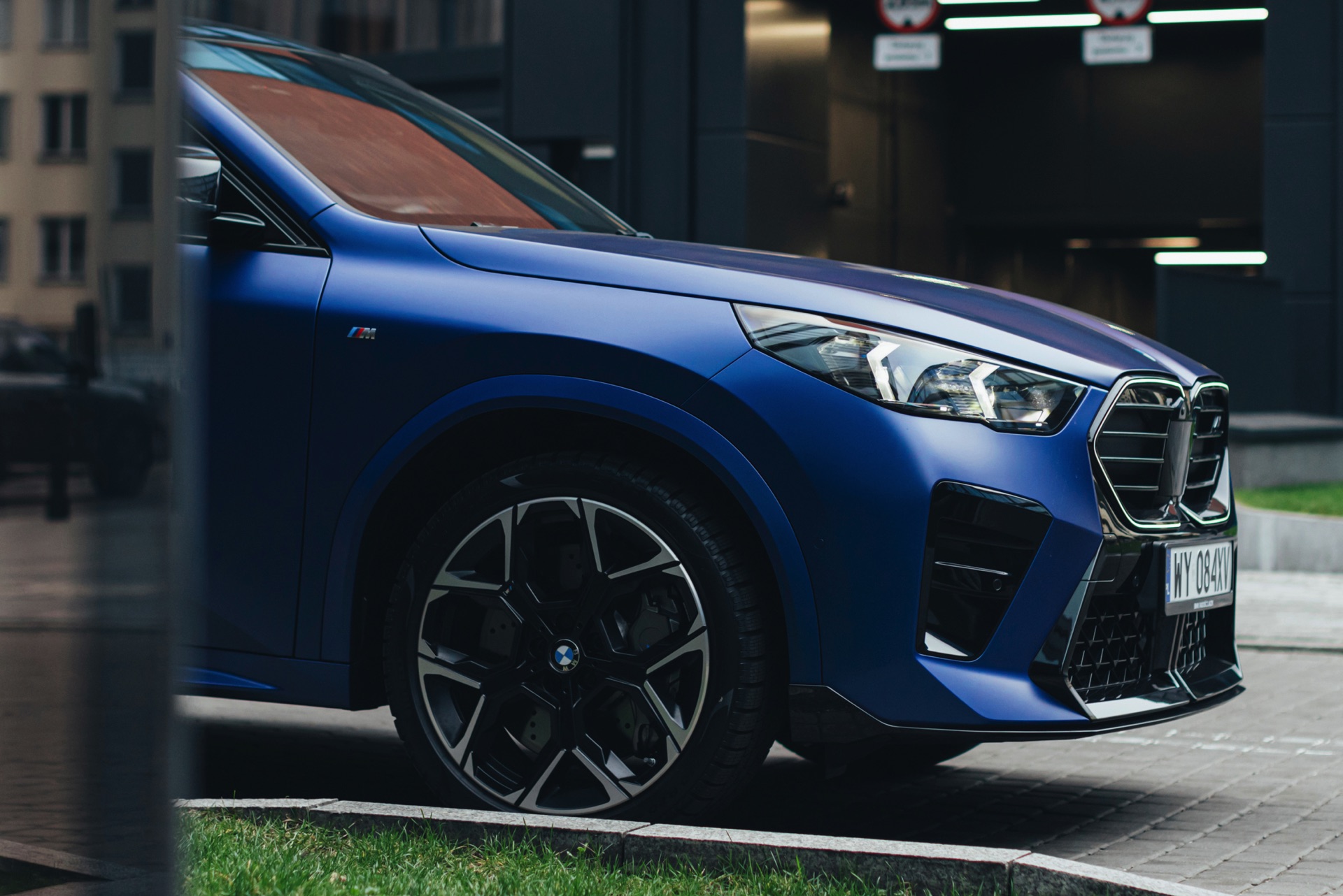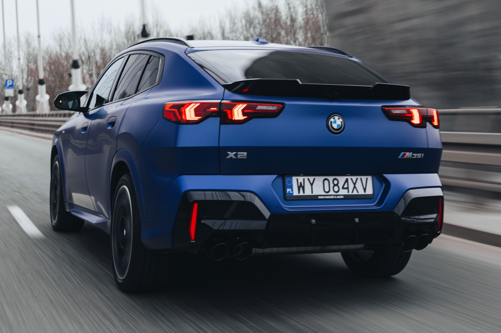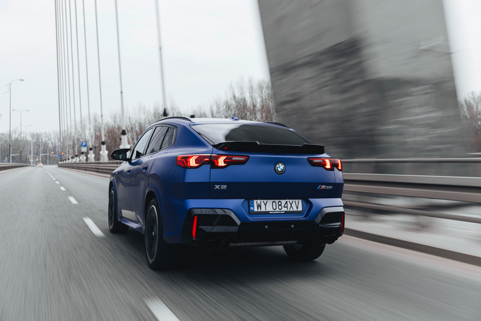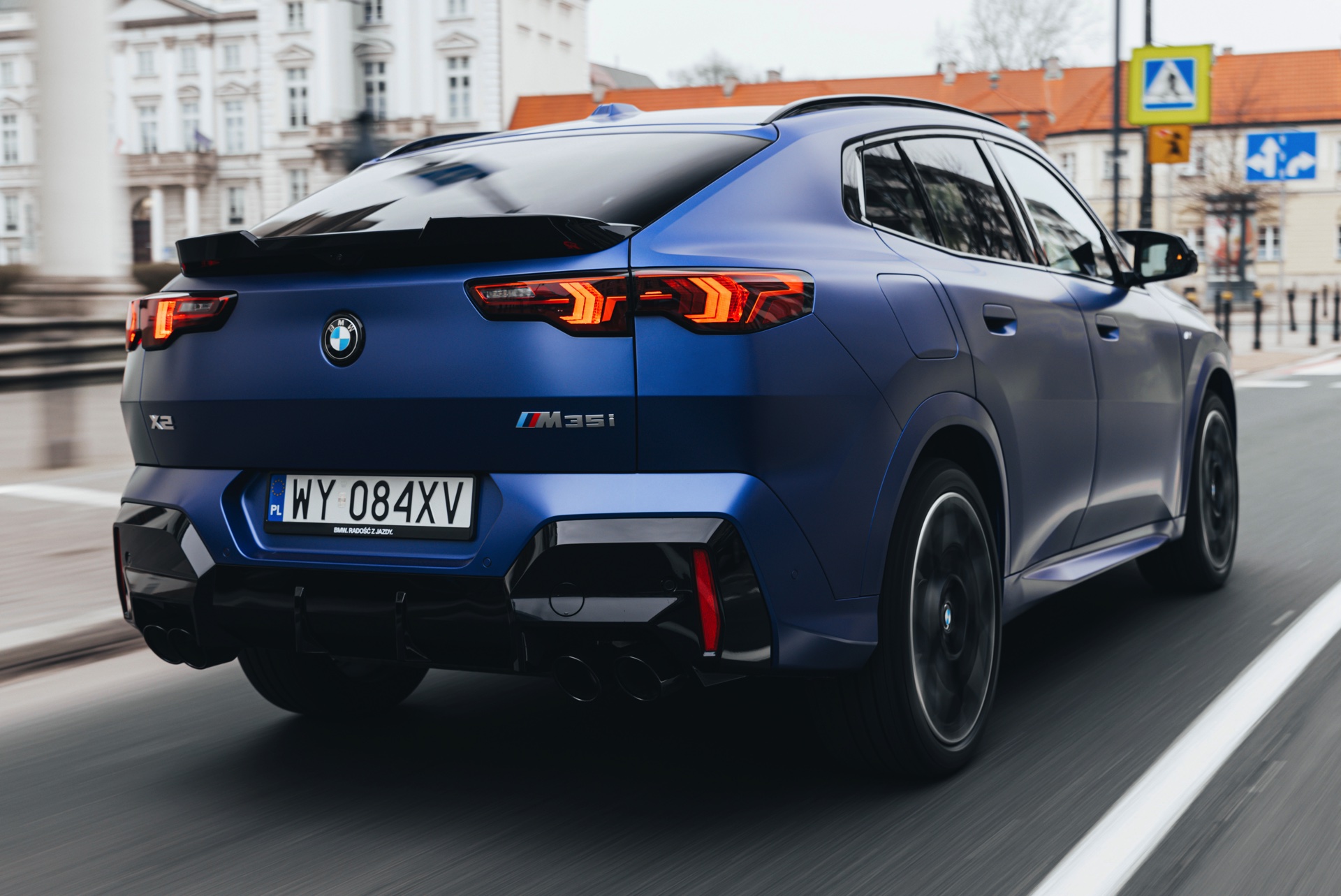 Frozen Portimao Blue ist der Star einer neuen Foto-Serie zum BMW X2 (U10) in Warschau. Das intensive Blau mit mattem Finish wird dabei auf einem X2 M35i präsentiert, der zudem das M Sportpaket Pro trägt und deshalb mit den schwarzen Umfängen der Shadow Line mit erweiterten Umfängen glänzt. Besonders sichtbar wird das an der schwarzen Niere, die bei aktivierter Zündung dank Iconic Glow-Beleuchtung dennoch prominent in Erscheinung tritt. Während die meisten Details des gezeigten X2 für alle Motorisierungen verfügbar sind, sind das Nieren-Innenleben mit horizontalen Streben und die vier Endrohre am Heck exklusiv dem Topmodell M35i vorbehalten.