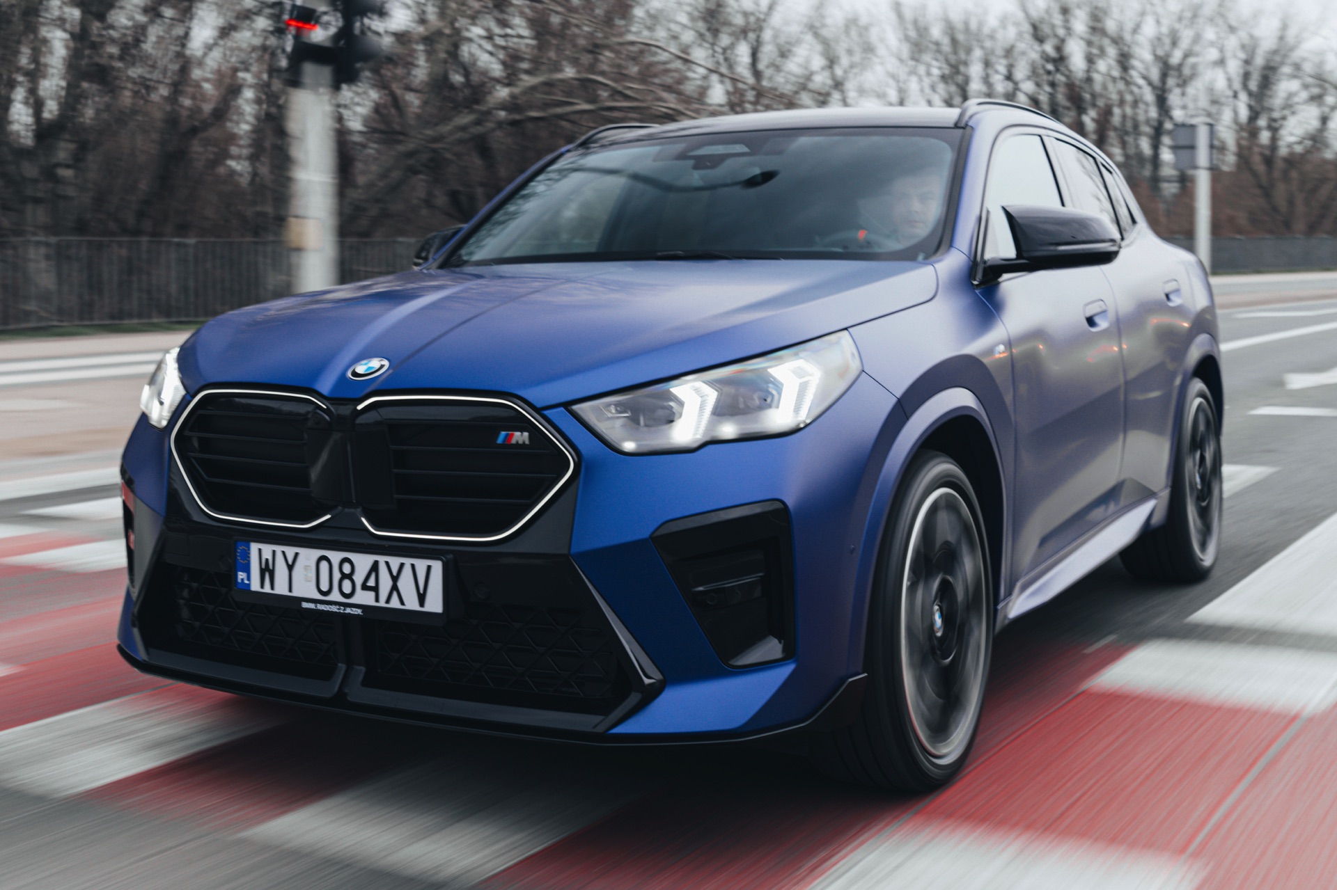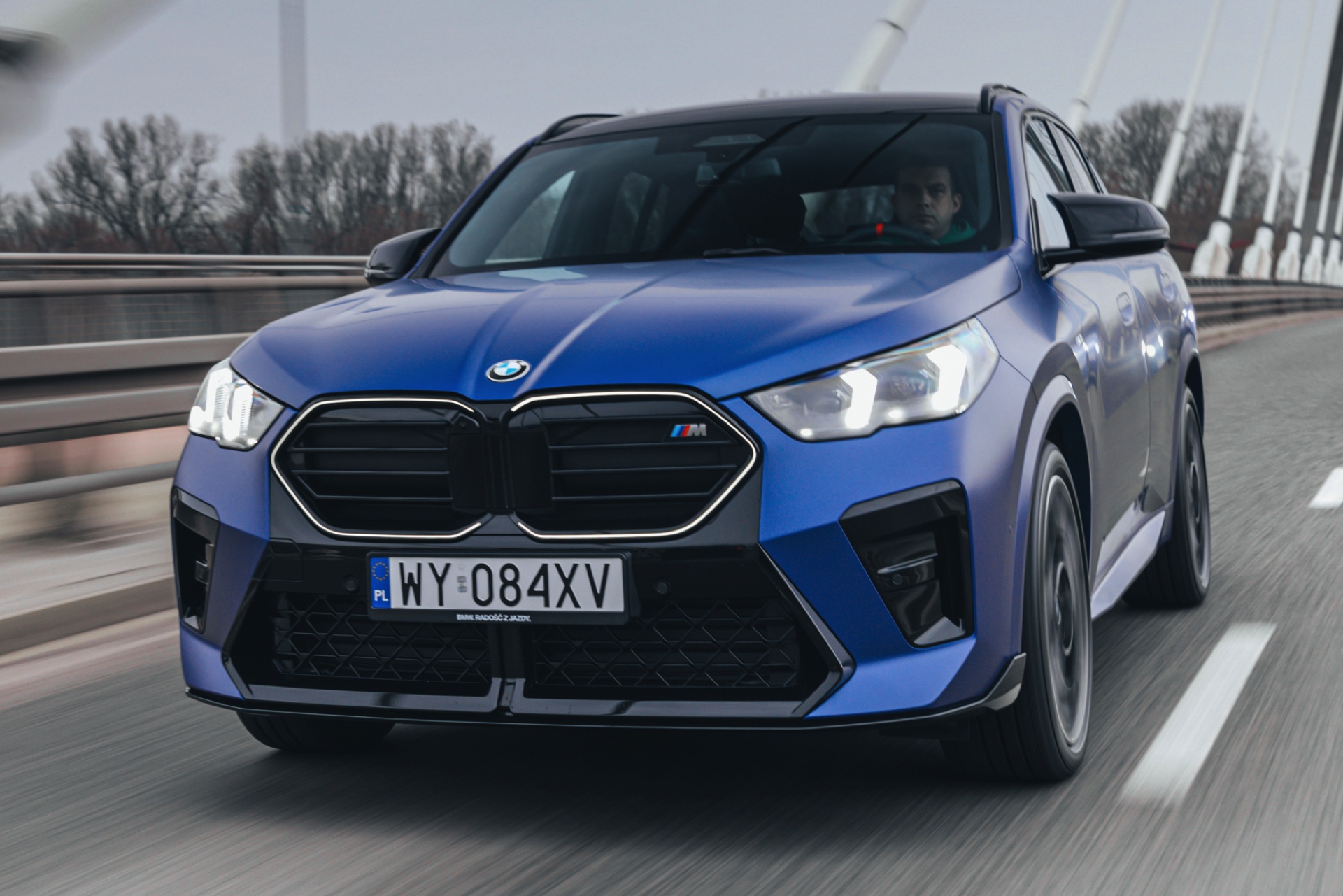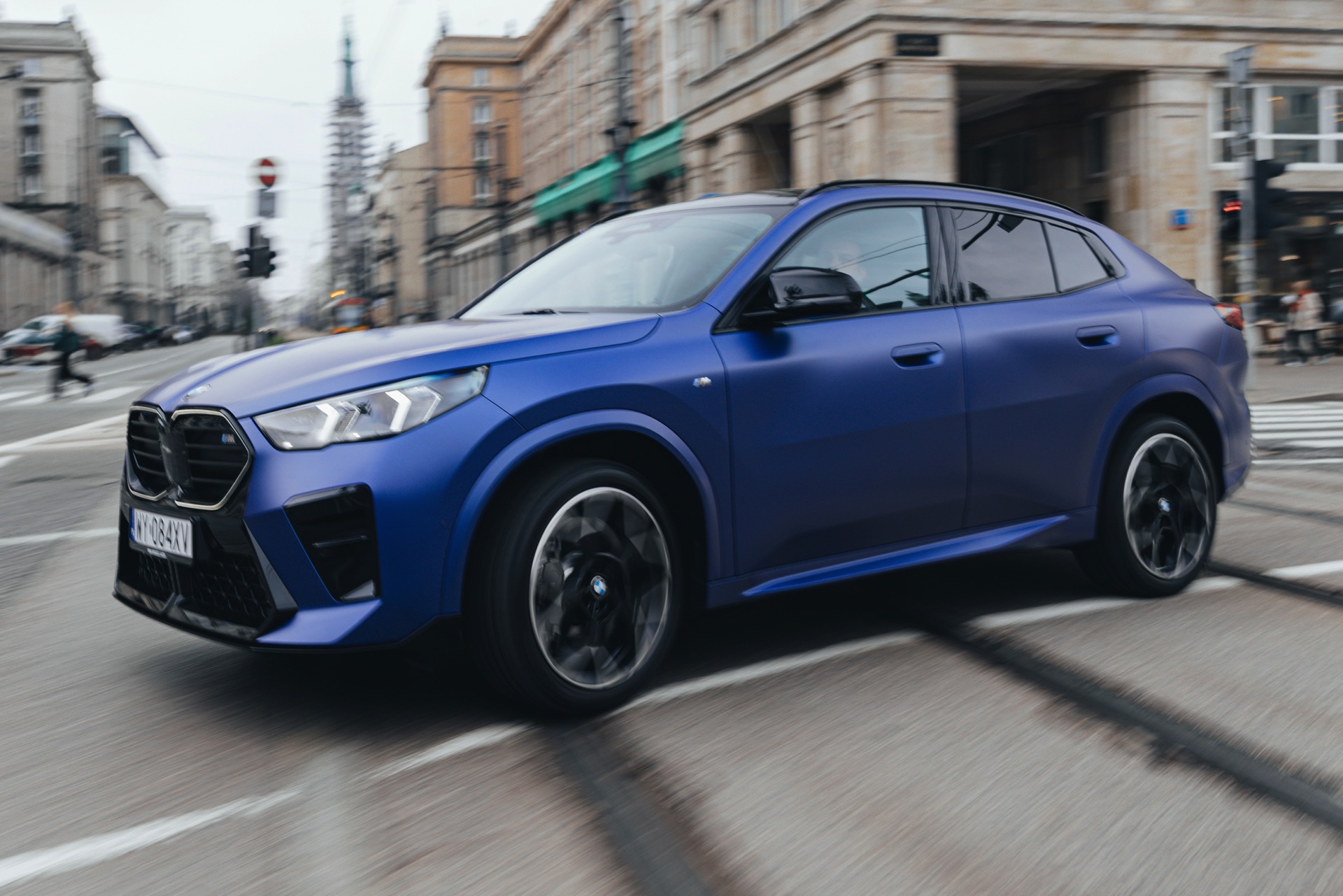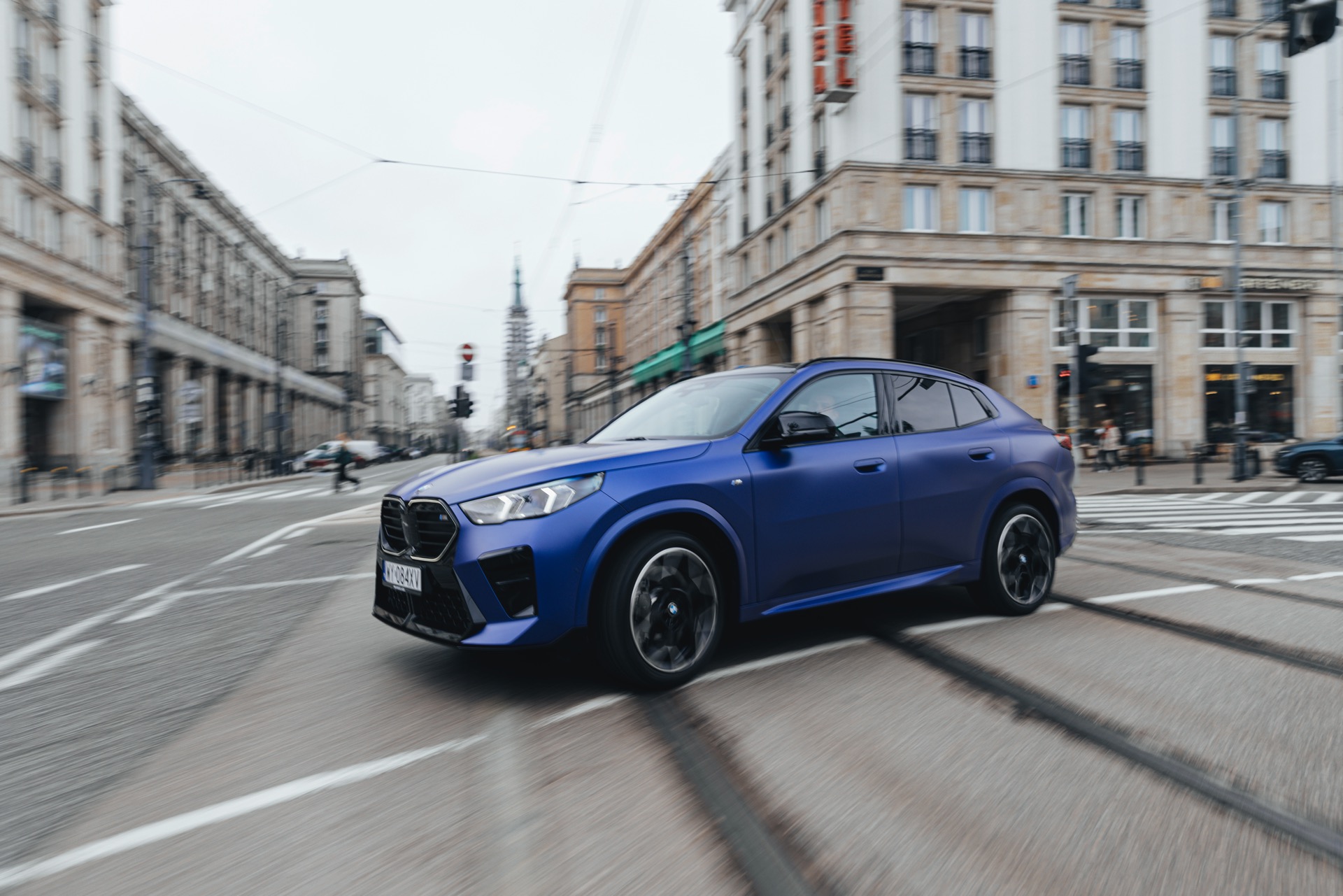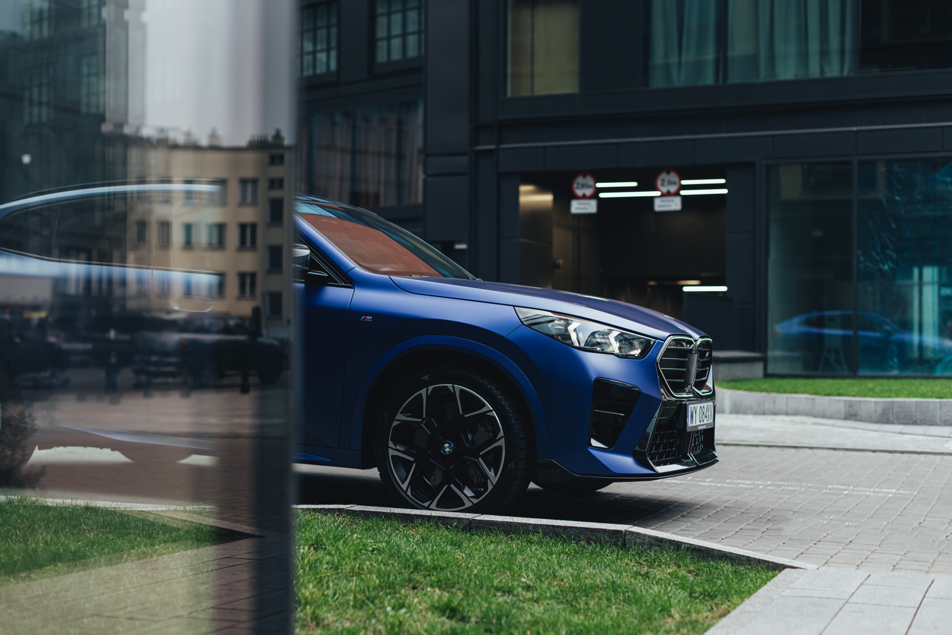 Frozen Portimao Blue ist der Star einer neuen Foto-Serie zum BMW X2 (U10) in Warschau. Das intensive Blau mit mattem Finish wird dabei auf einem X2 M35i präsentiert, der zudem das M Sportpaket Pro trägt und deshalb mit den schwarzen Umfängen der Shadow Line mit erweiterten Umfängen glänzt. Besonders sichtbar wird das an der schwarzen Niere, die bei aktivierter Zündung dank Iconic Glow-Beleuchtung dennoch prominent in Erscheinung tritt. Während die meisten Details des gezeigten X2 für alle Motorisierungen verfügbar sind, sind das Nieren-Innenleben mit horizontalen Streben und die vier Endrohre am Heck exklusiv dem Topmodell M35i vorbehalten.