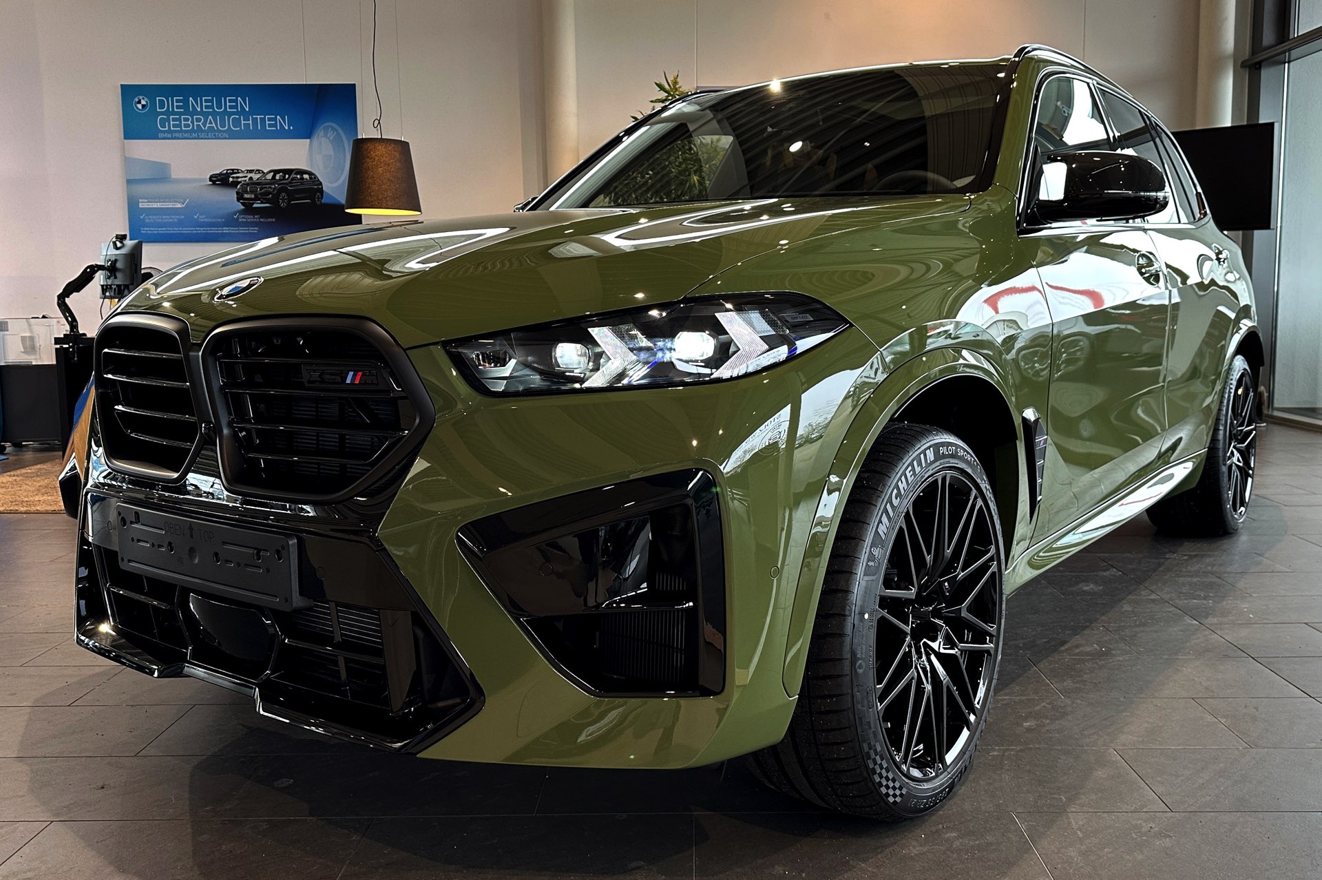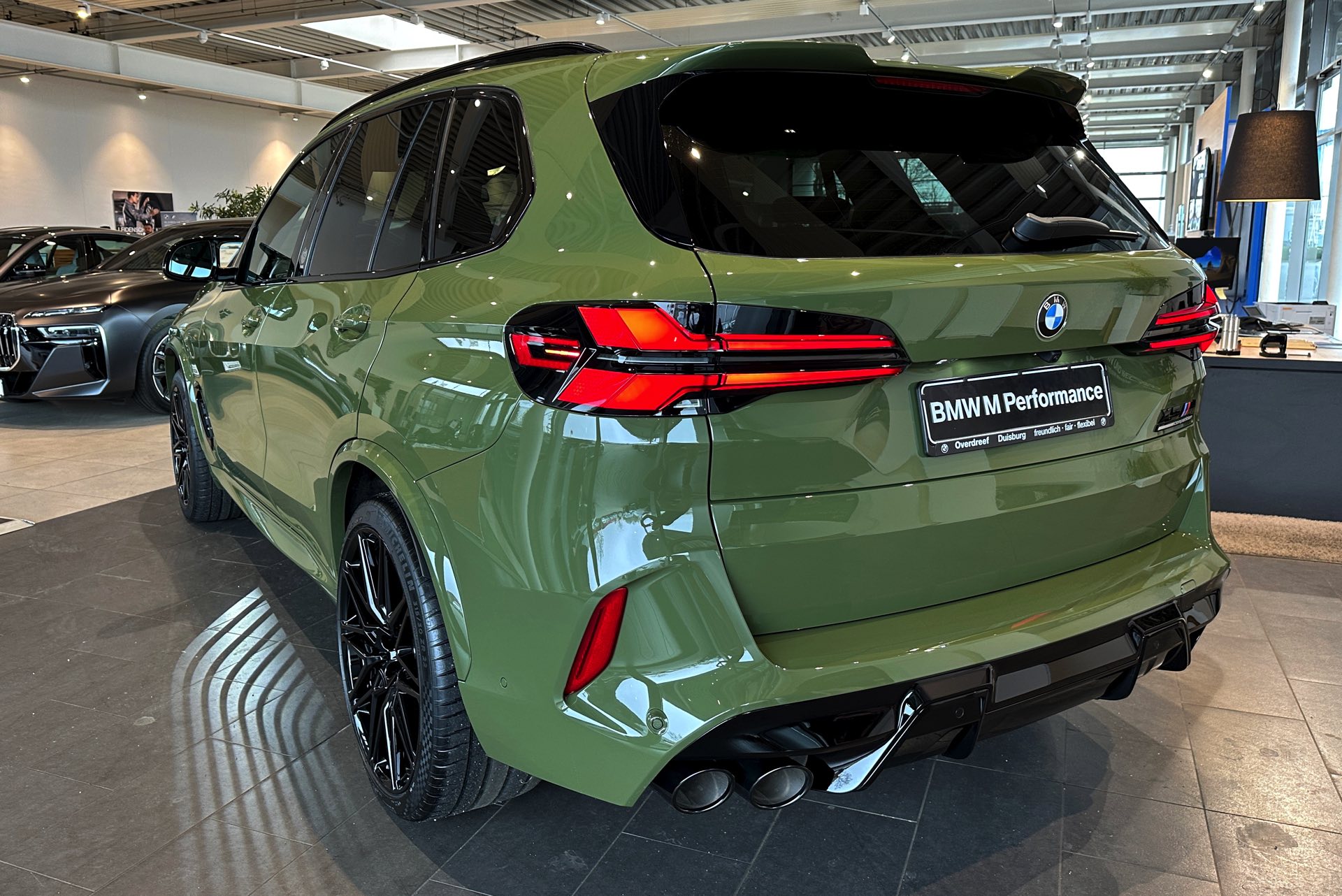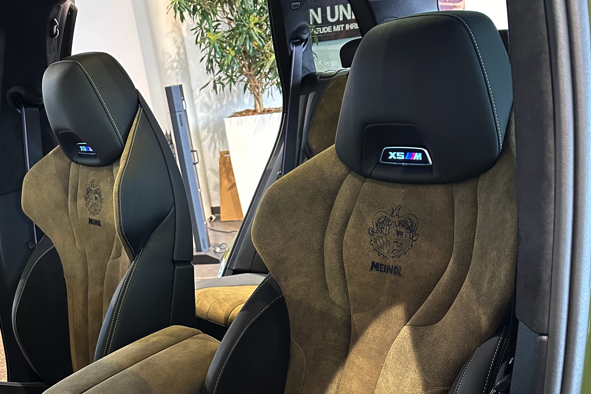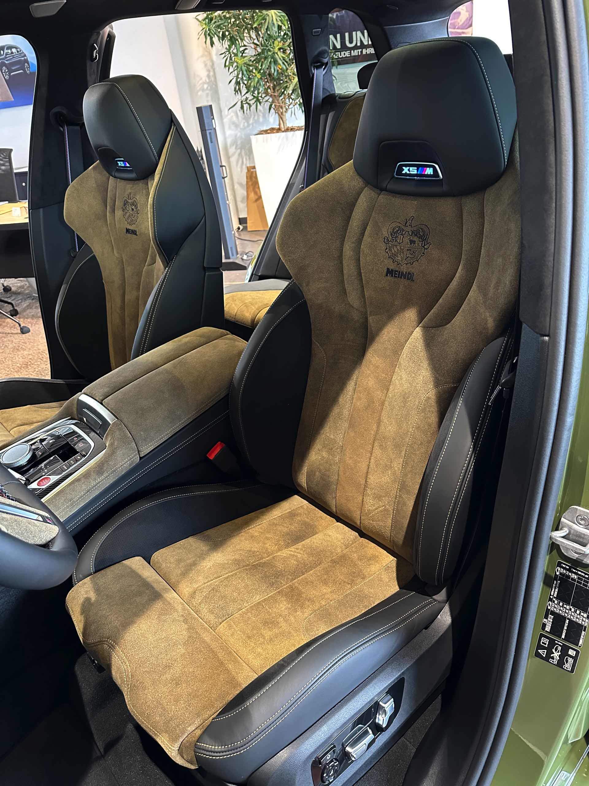 Eines der weltweit nur 25 Fahrzeuge steht derzeit im Showroom von BMW Overdreef in Duisburg, weshalb wir an dieser Stelle einige Live-Fotos präsentieren können. Zwar hat der BMW X5 M Competition (F95 LCI) mit Individual-Lackierung in Urban Green auch äußerlich viel zu bieten, die wahren Highlights befinden sich aber unstrittig im Innenraum. Neben der seltenen Lackierung weisen auch die Meindl-Logos auf der B-Säule auf die Sonderedition hin, die vorne 21 und hinten sogar 22 Zoll großen Felgen gehören hingegen zum Standardumfang vieler X5 M.