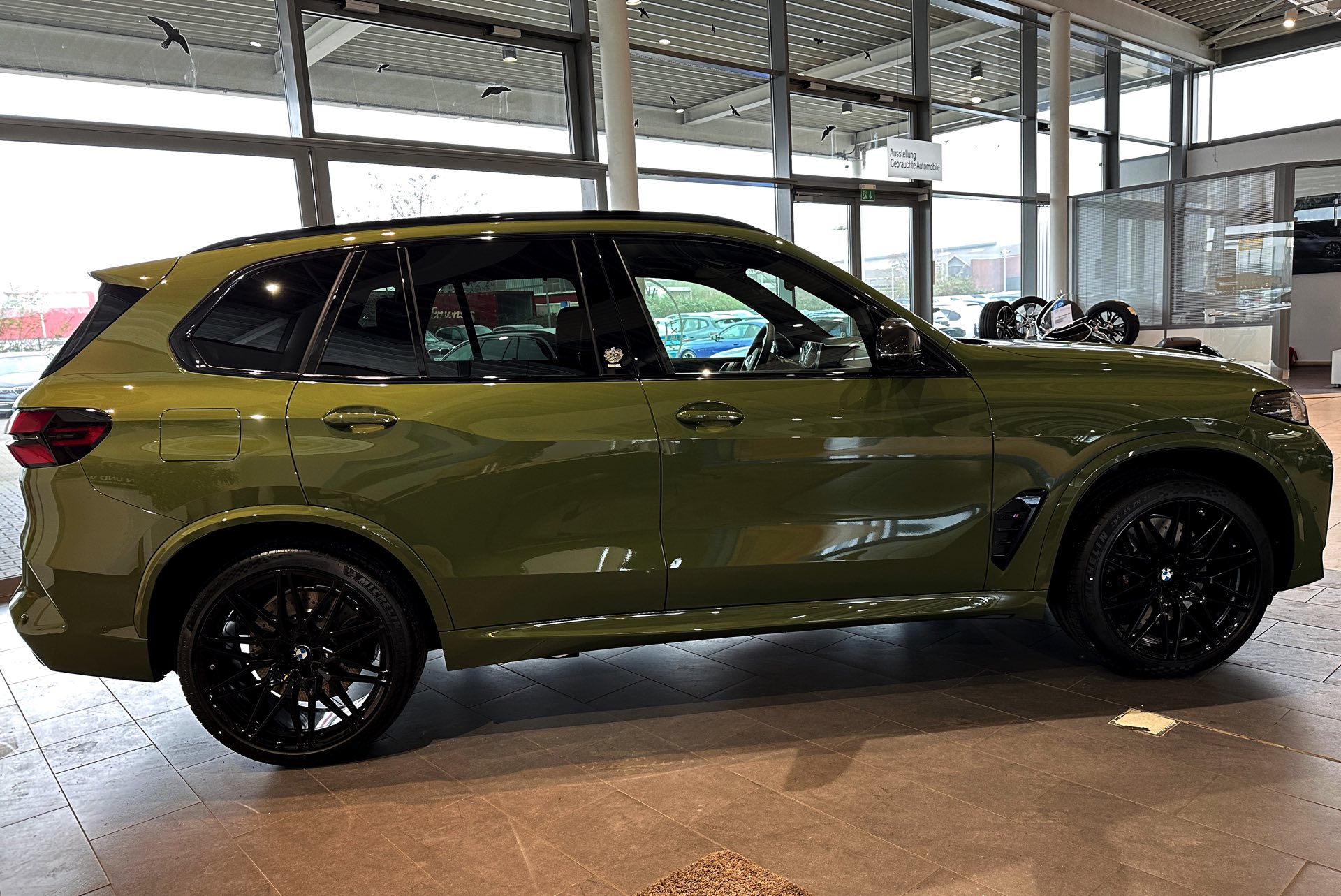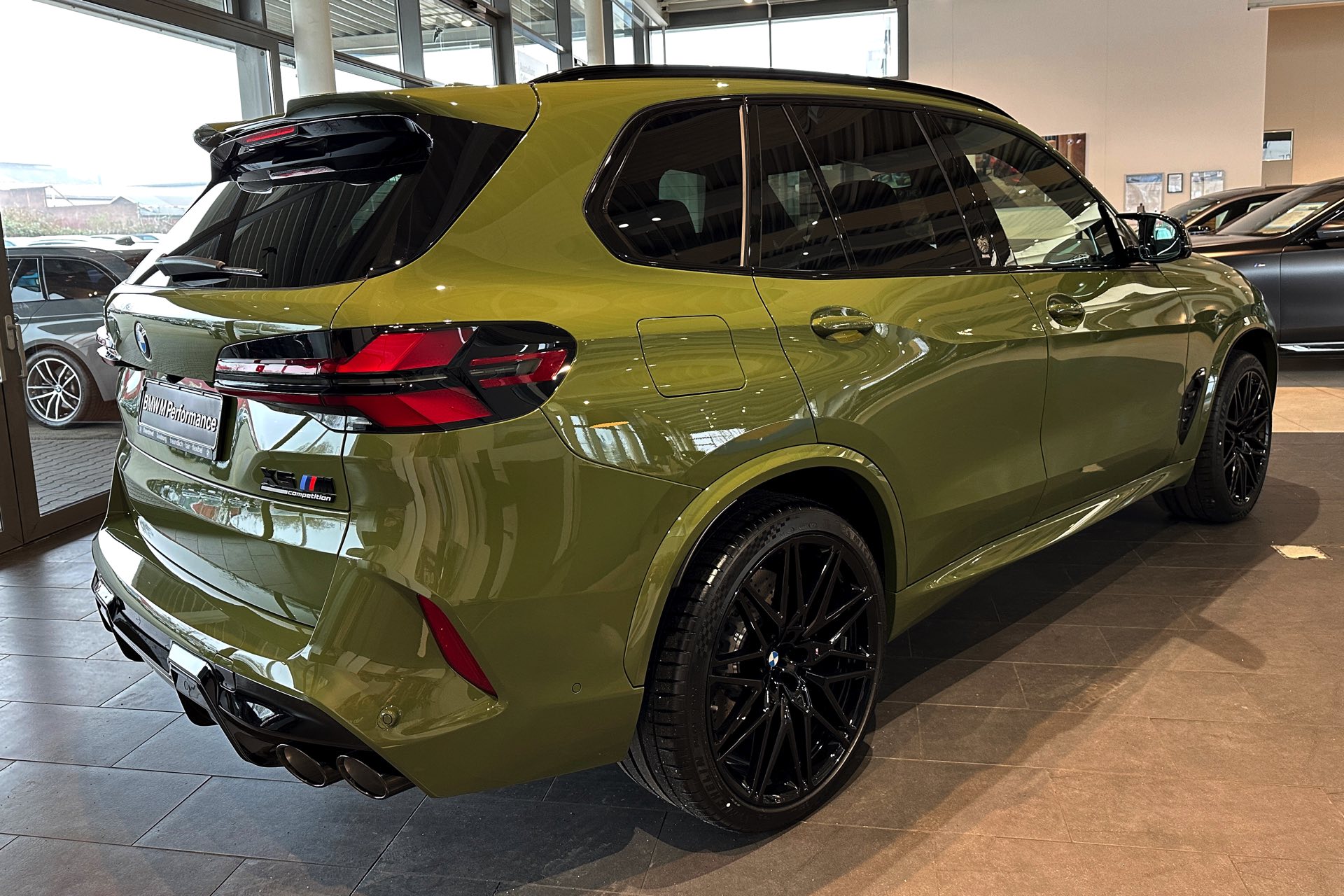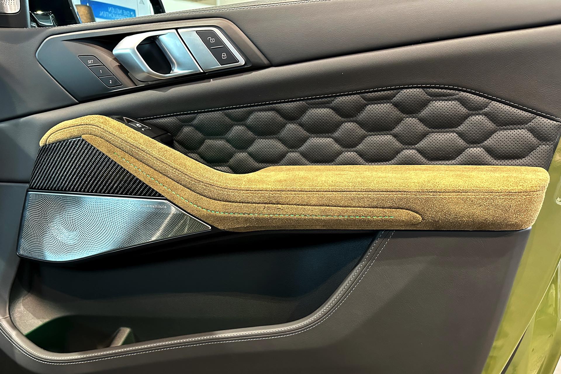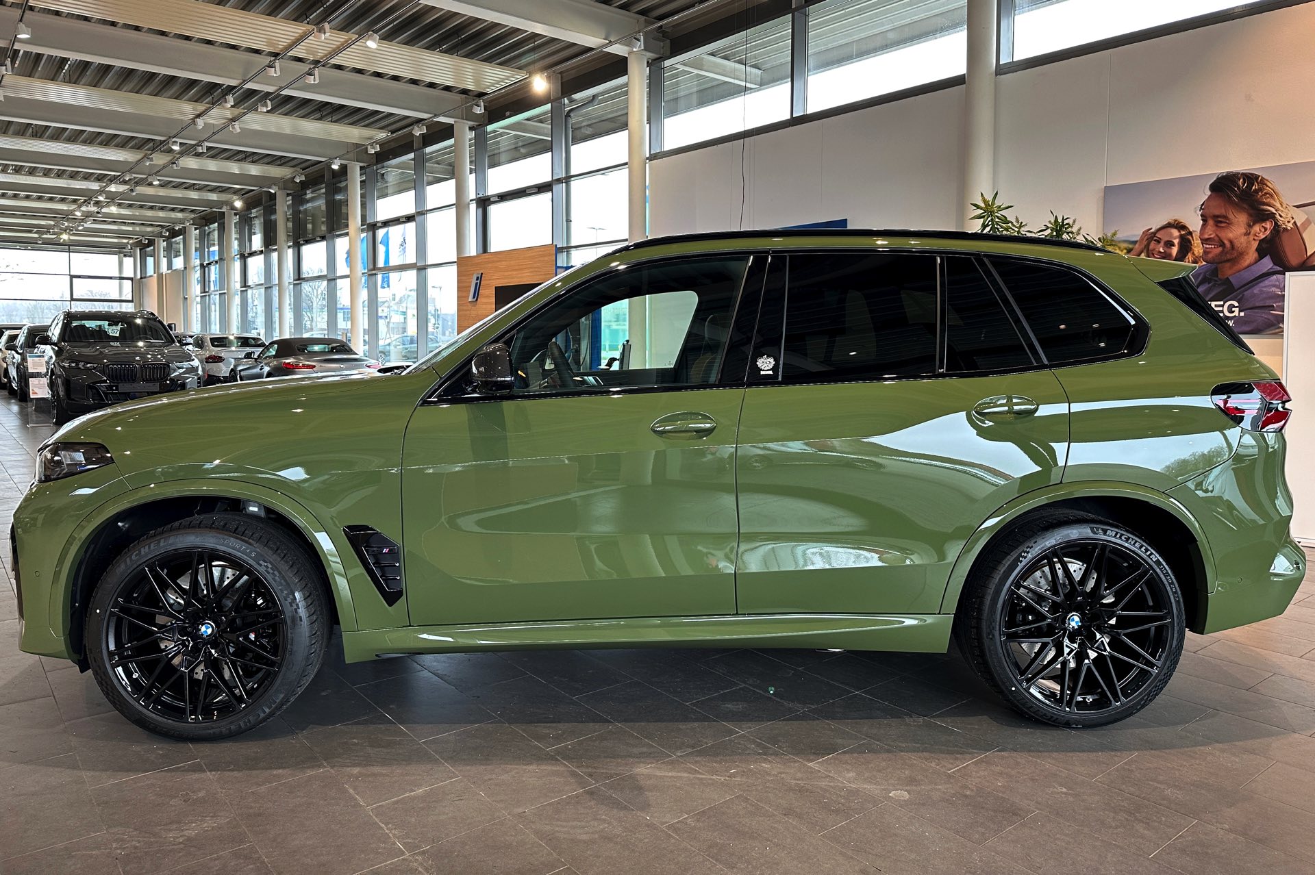 Eines der weltweit nur 25 Fahrzeuge steht derzeit im Showroom von BMW Overdreef in Duisburg, weshalb wir an dieser Stelle einige Live-Fotos präsentieren können. Zwar hat der BMW X5 M Competition (F95 LCI) mit Individual-Lackierung in Urban Green auch äußerlich viel zu bieten, die wahren Highlights befinden sich aber unstrittig im Innenraum. Neben der seltenen Lackierung weisen auch die Meindl-Logos auf der B-Säule auf die Sonderedition hin, die vorne 21 und hinten sogar 22 Zoll großen Felgen gehören hingegen zum Standardumfang vieler X5 M.