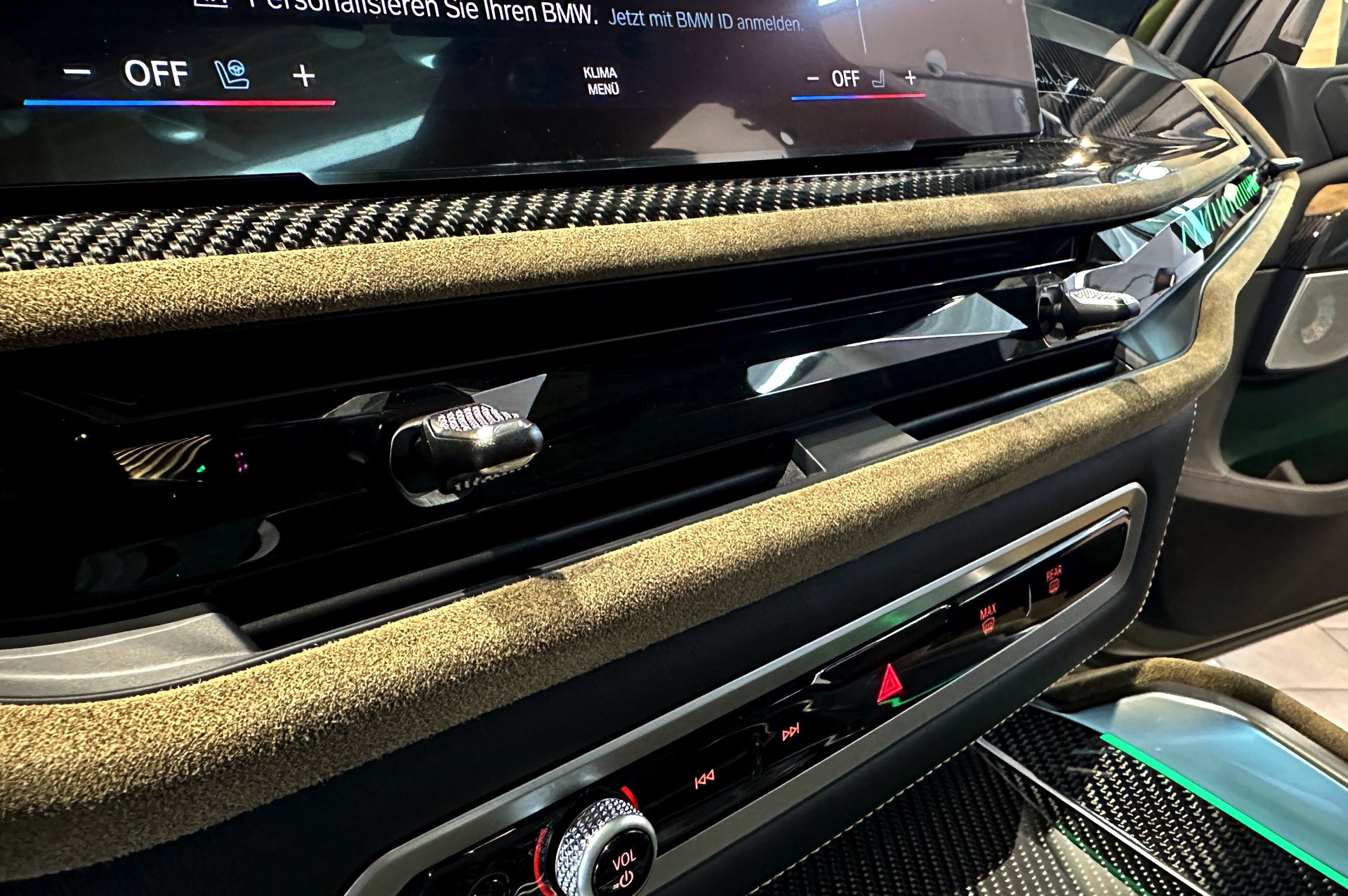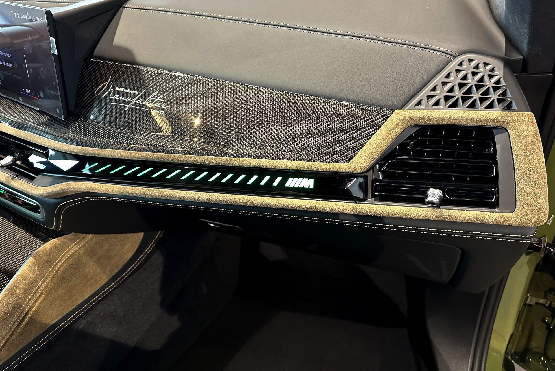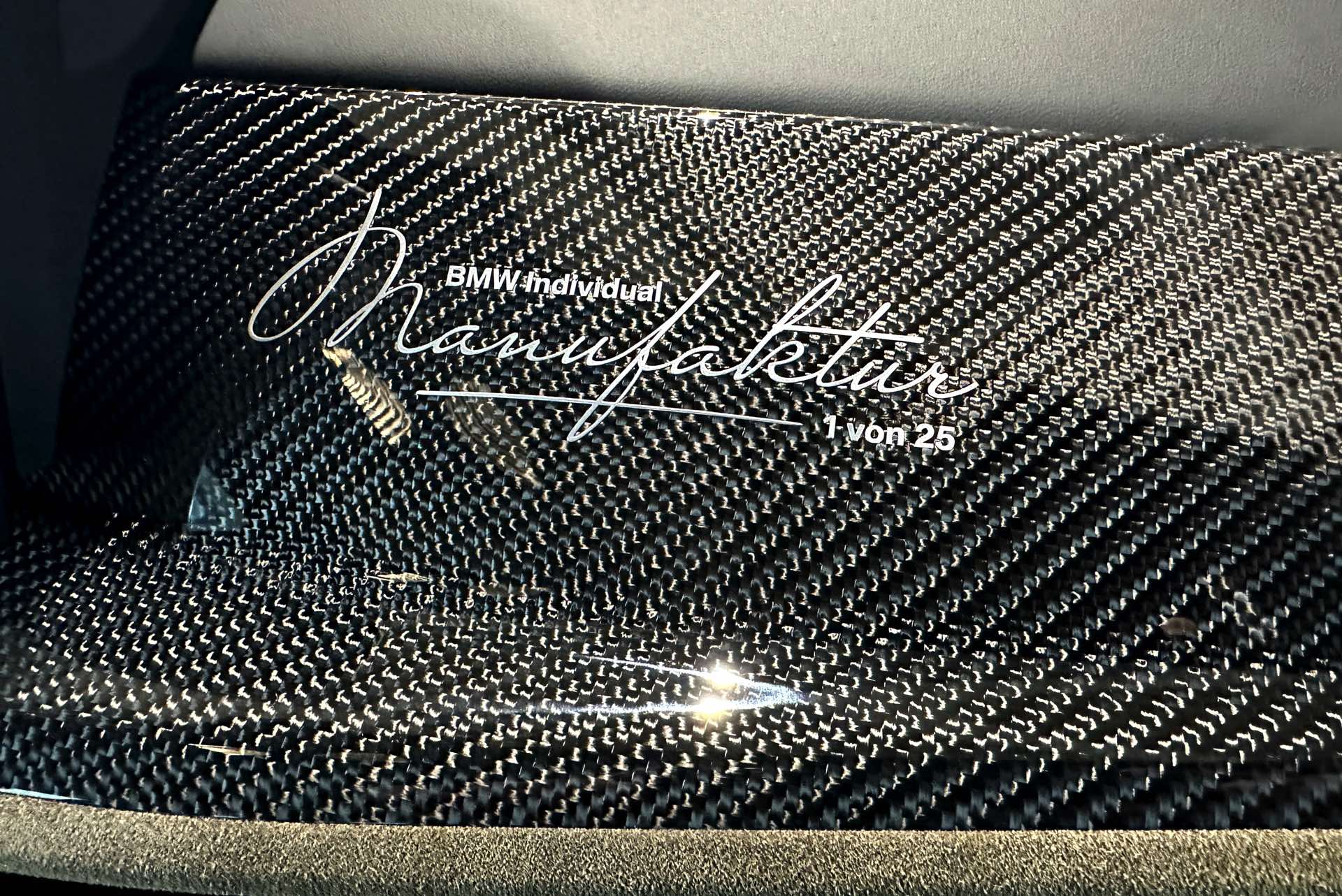 Im Interieur geht die Individualisierung weit über die Sitze hinaus: Das hochwertige Hirsch-Leder findet sich auch auf Teilen der Interieurleisten und Türverkleidungen, der Mittelkonsole, der Sonnenschutzblenden und selbst der Kartentaschen an der Rückenlehne der Vordersitze. Verantwortlich für die Umsetzung war die Sattlerei der BMW Individual Manufaktur, deren Logo auch auf der großen Carbon-Zierleiste vor dem Beifahrer prangt und deutlich auf die strenge Limitierung hinweist.