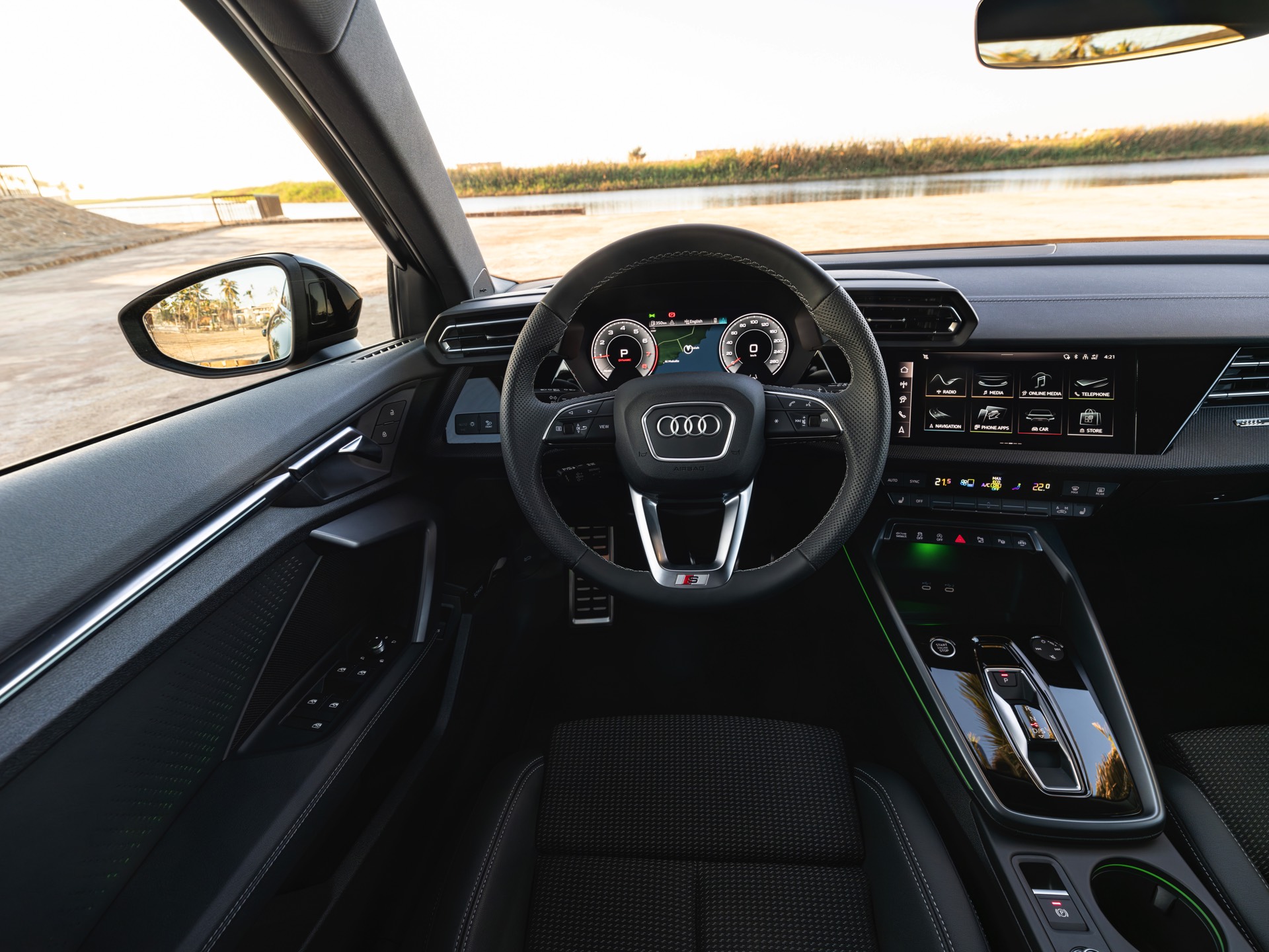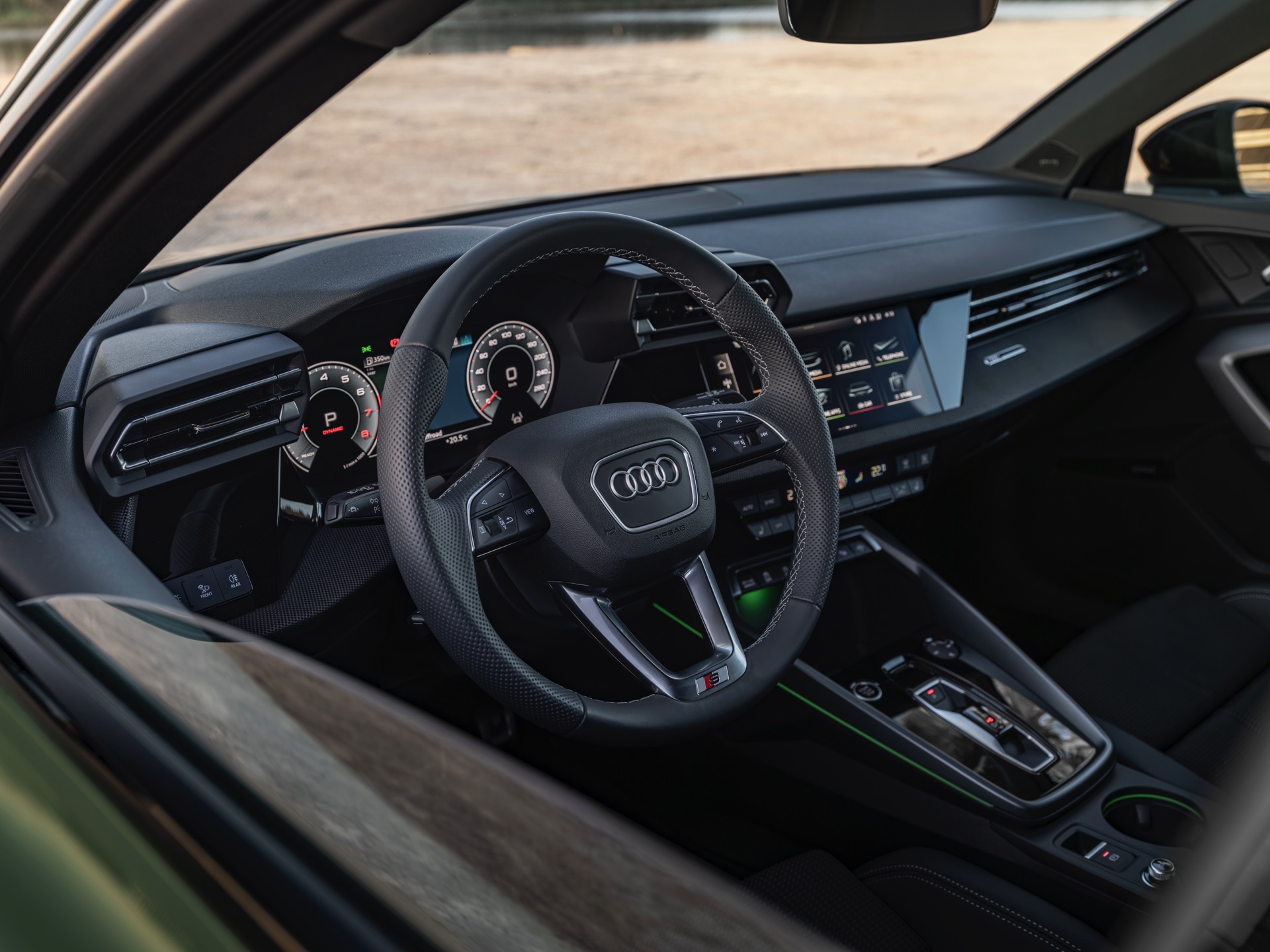 Gründlich überarbeitet präsentiert sich auch der Innenraum, der mit Fahrerorientierung und integrierten Displays punktet. Auf der Mittelkonsole sehen wir nun auch an Bord des Audi A3 Facelift eine dezente Wähleinheit für den Getriebe-Modus, der klassische Schalthebel hat genau wie in den allermeisten BMW ausgedient. Ein umfassend vernetztes Infotainment mit zahlreichen Features versteht sich genau wie ein großes Angebot von Assistenzsystemen im Jahr 2024 von selbst.