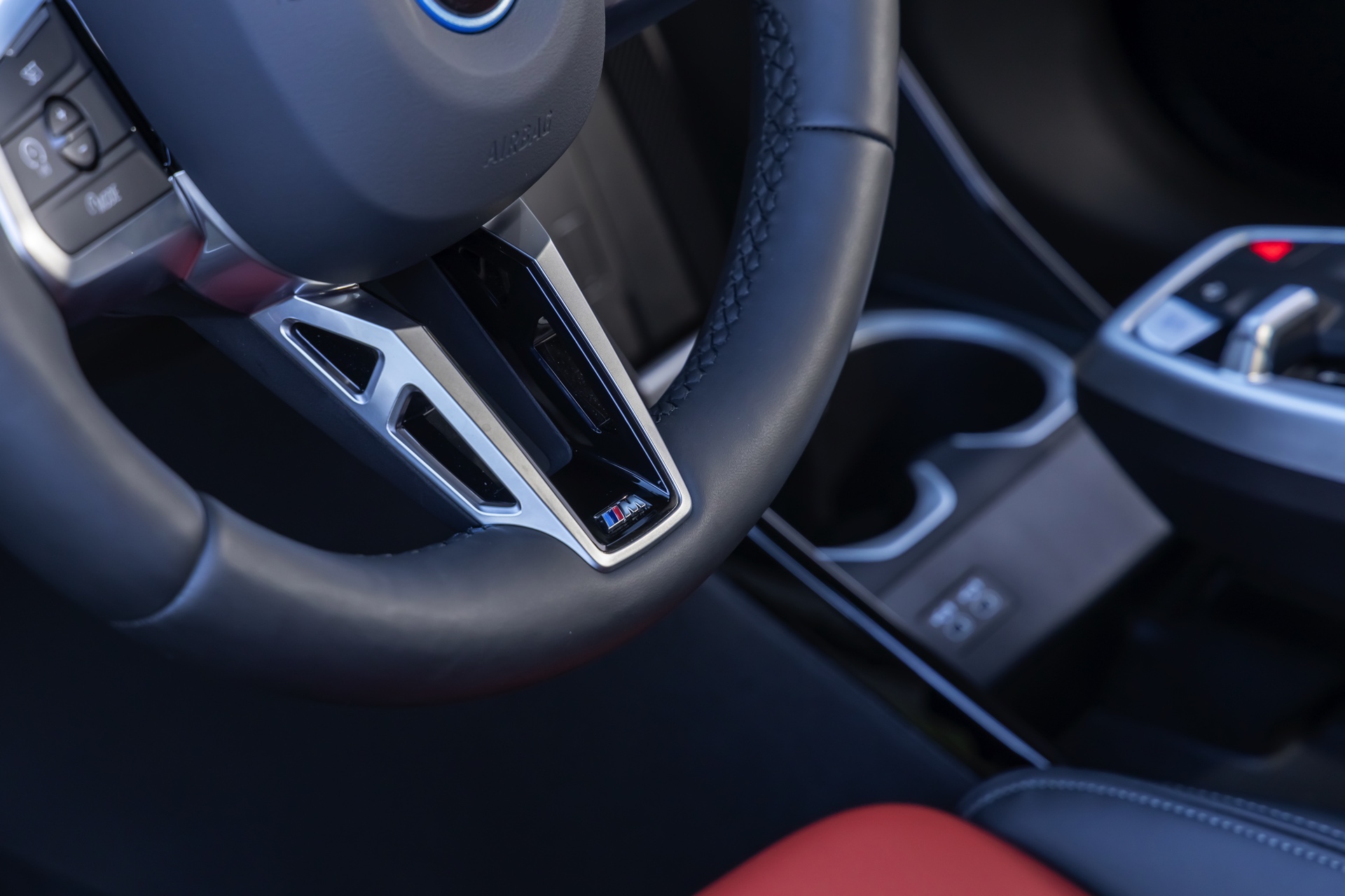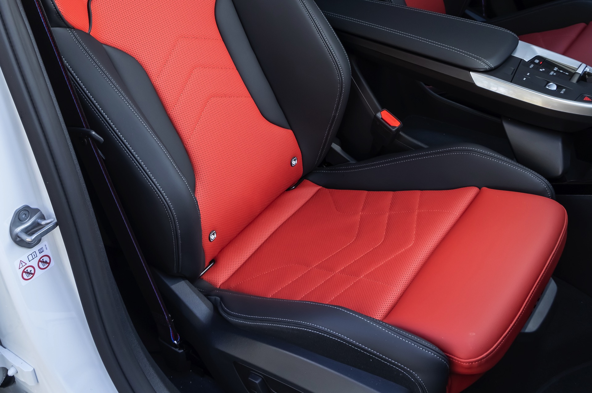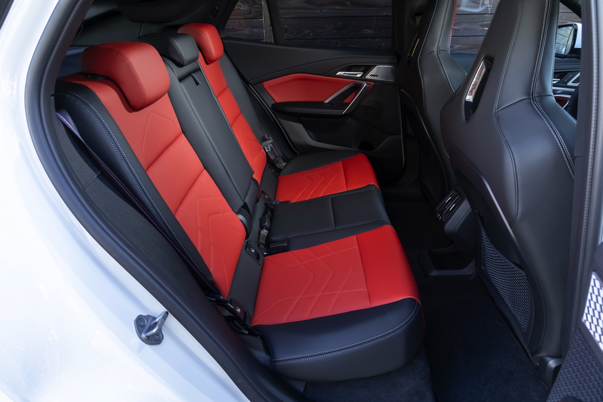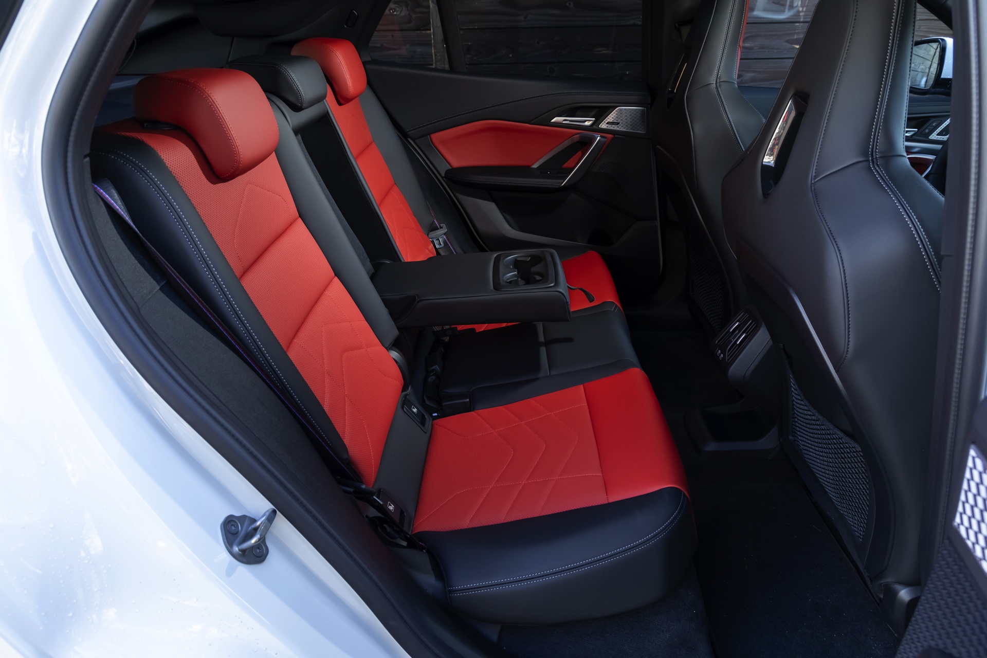 Während das Exterieur konsequent Schwarz-Weiß gehalten ist und nur mit den Rückleuchten und Bremssätteln farbige Akzente setzt, geht es im Innenraum betont farbig zur Sache: Die Bicolor-Ausstattung Veganza perforiert ist in der Farbkombination Korallrot / Schwarz zu sehen, die ohne Frage für den markantesten Look an Bord von X2 und iX2 sorgt. Ein weiterer Hingucker sind die optionalen M Sportsitze mit integrierten Kopfstützen und beleuchtetem M-Logo.