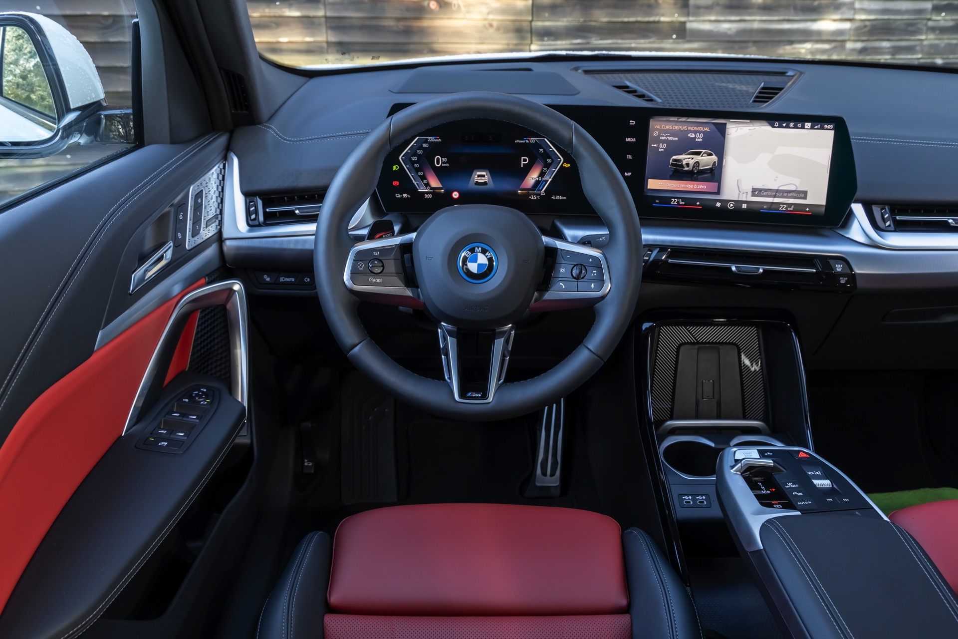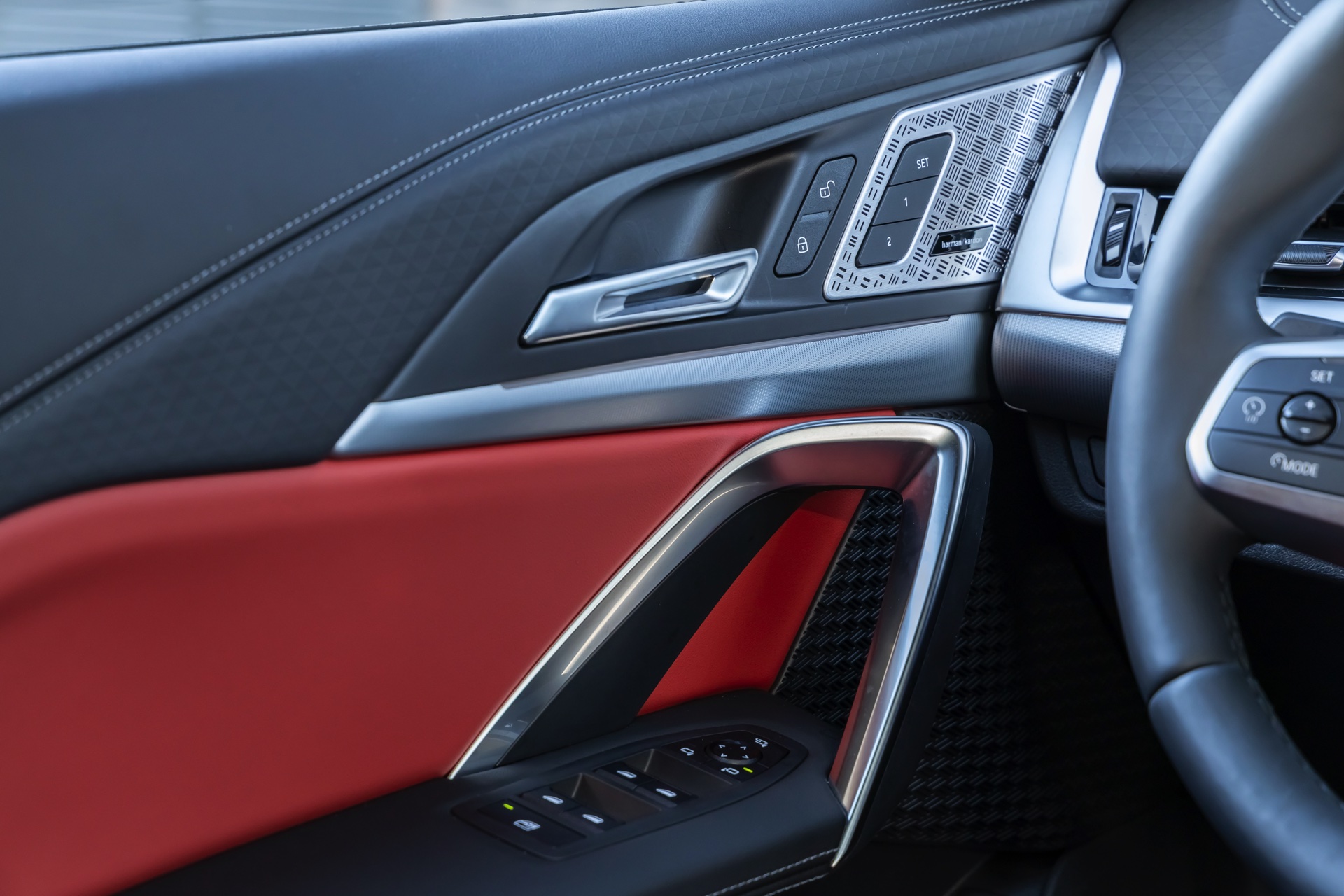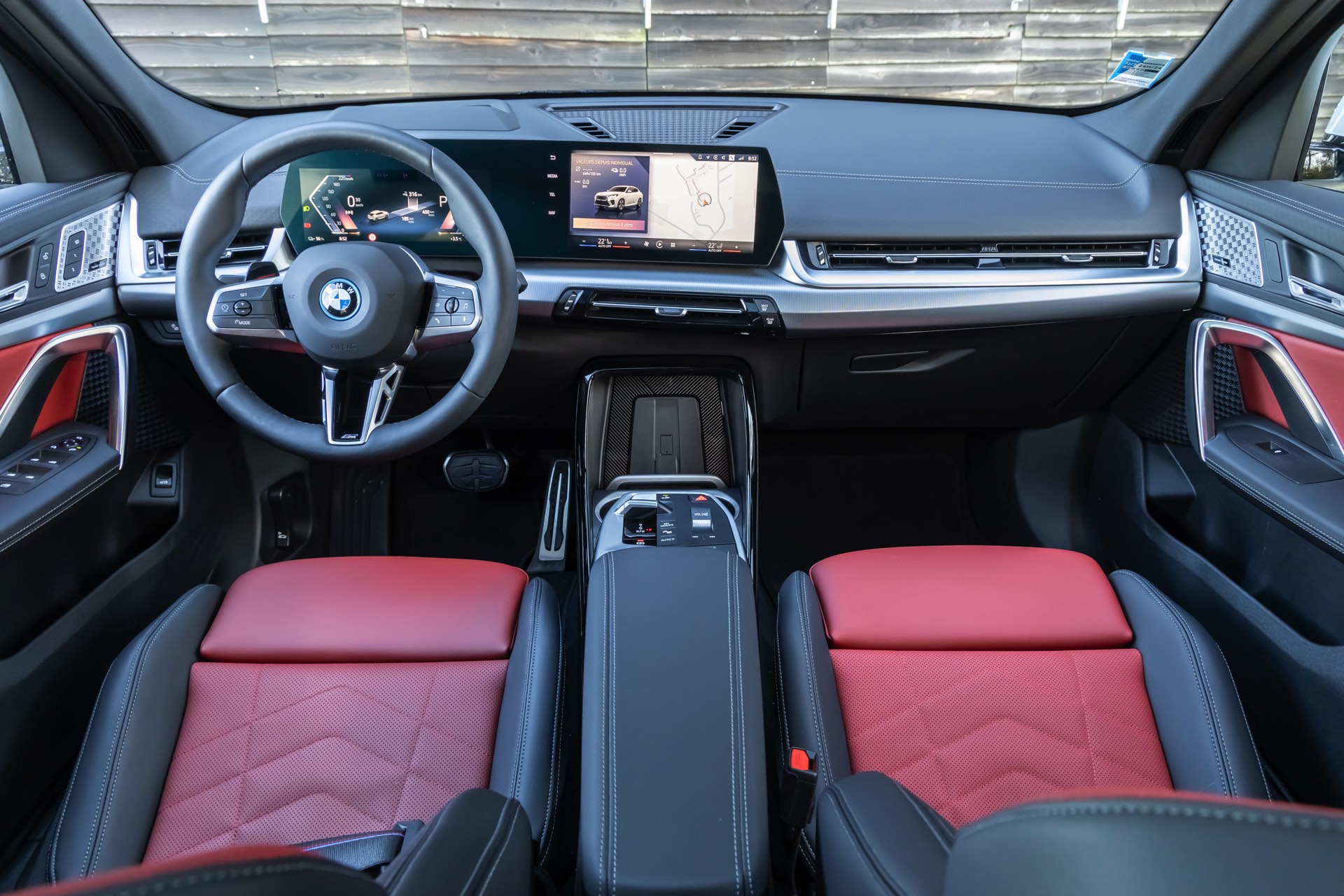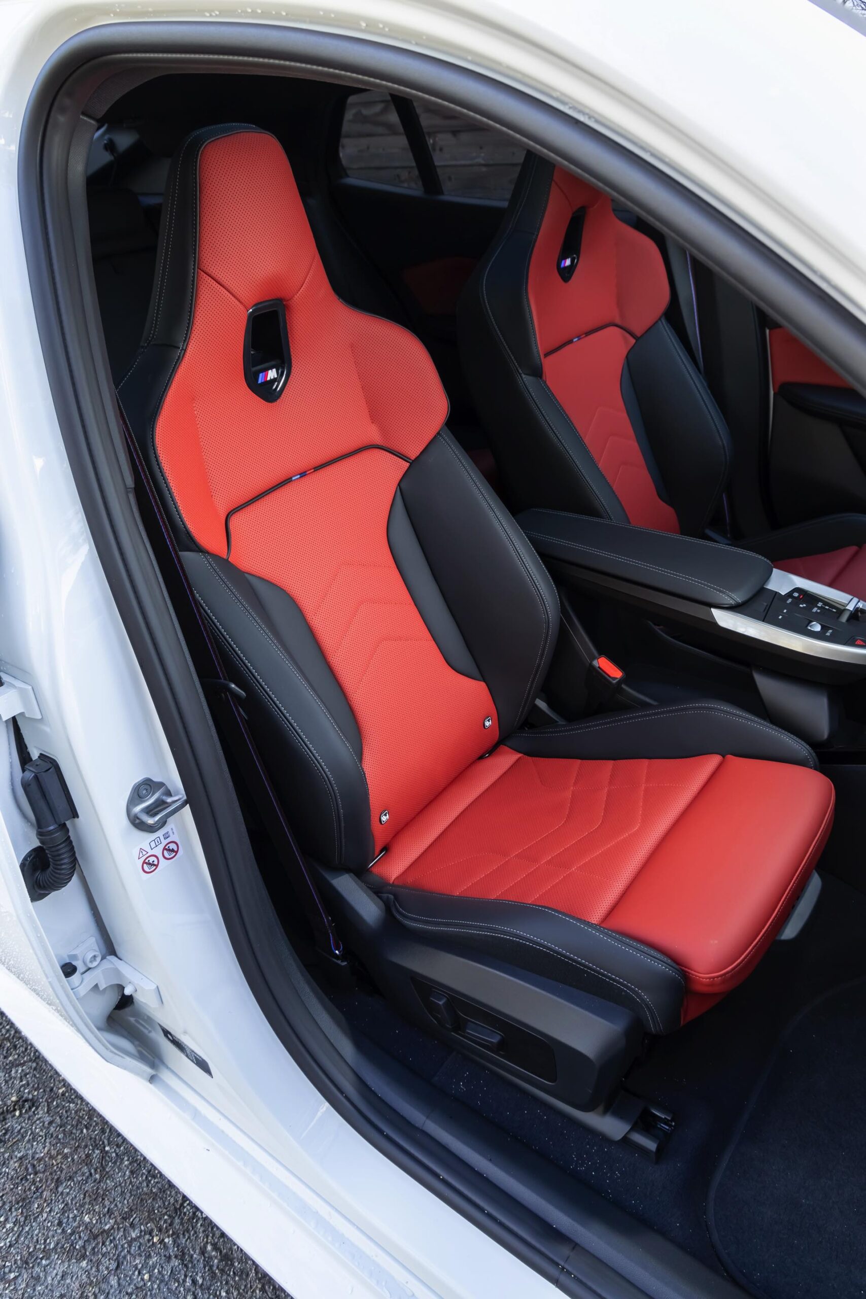 Während das Exterieur konsequent Schwarz-Weiß gehalten ist und nur mit den Rückleuchten und Bremssätteln farbige Akzente setzt, geht es im Innenraum betont farbig zur Sache: Die Bicolor-Ausstattung Veganza perforiert ist in der Farbkombination Korallrot / Schwarz zu sehen, die ohne Frage für den markantesten Look an Bord von X2 und iX2 sorgt. Ein weiterer Hingucker sind die optionalen M Sportsitze mit integrierten Kopfstützen und beleuchtetem M-Logo.