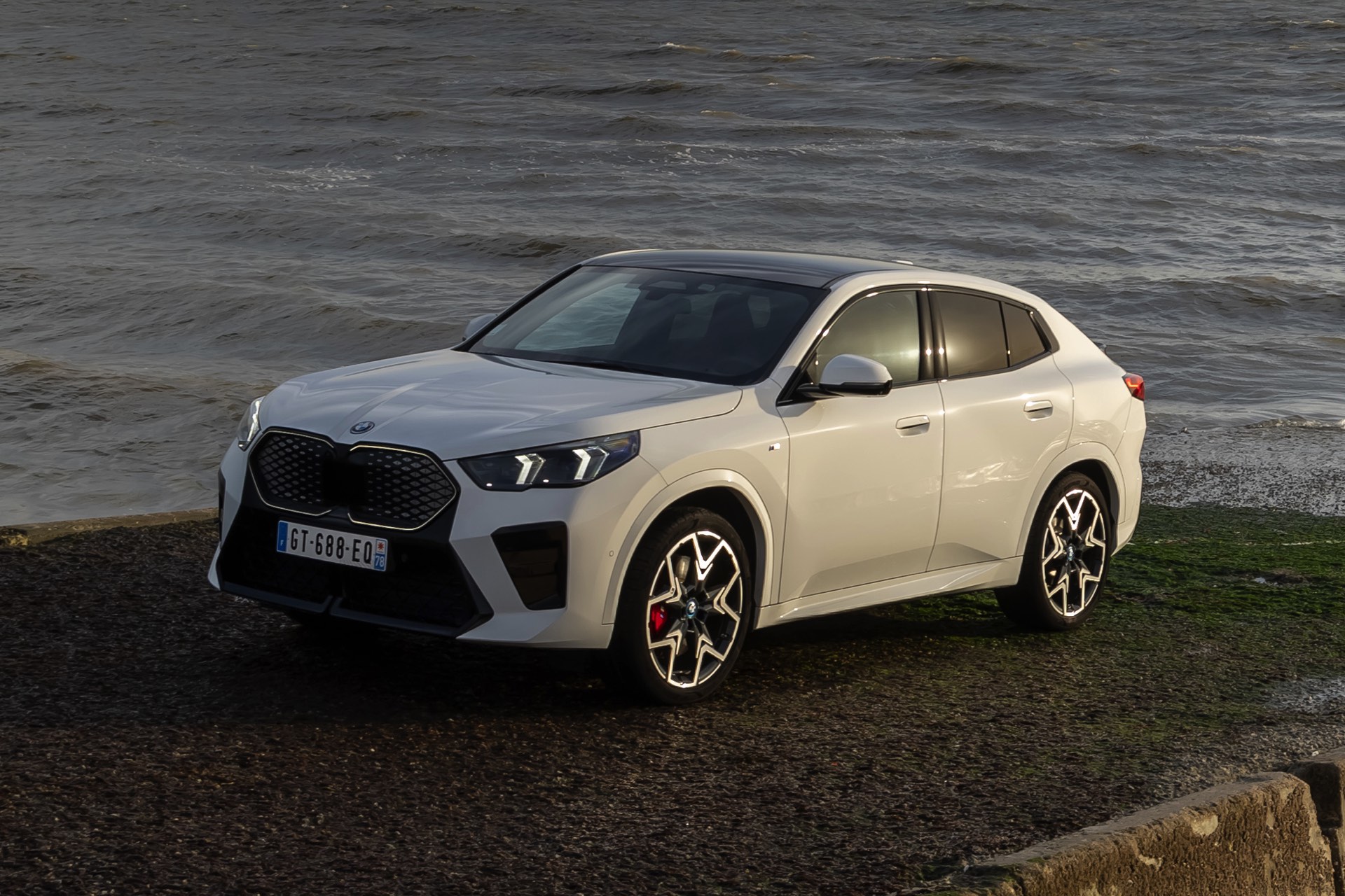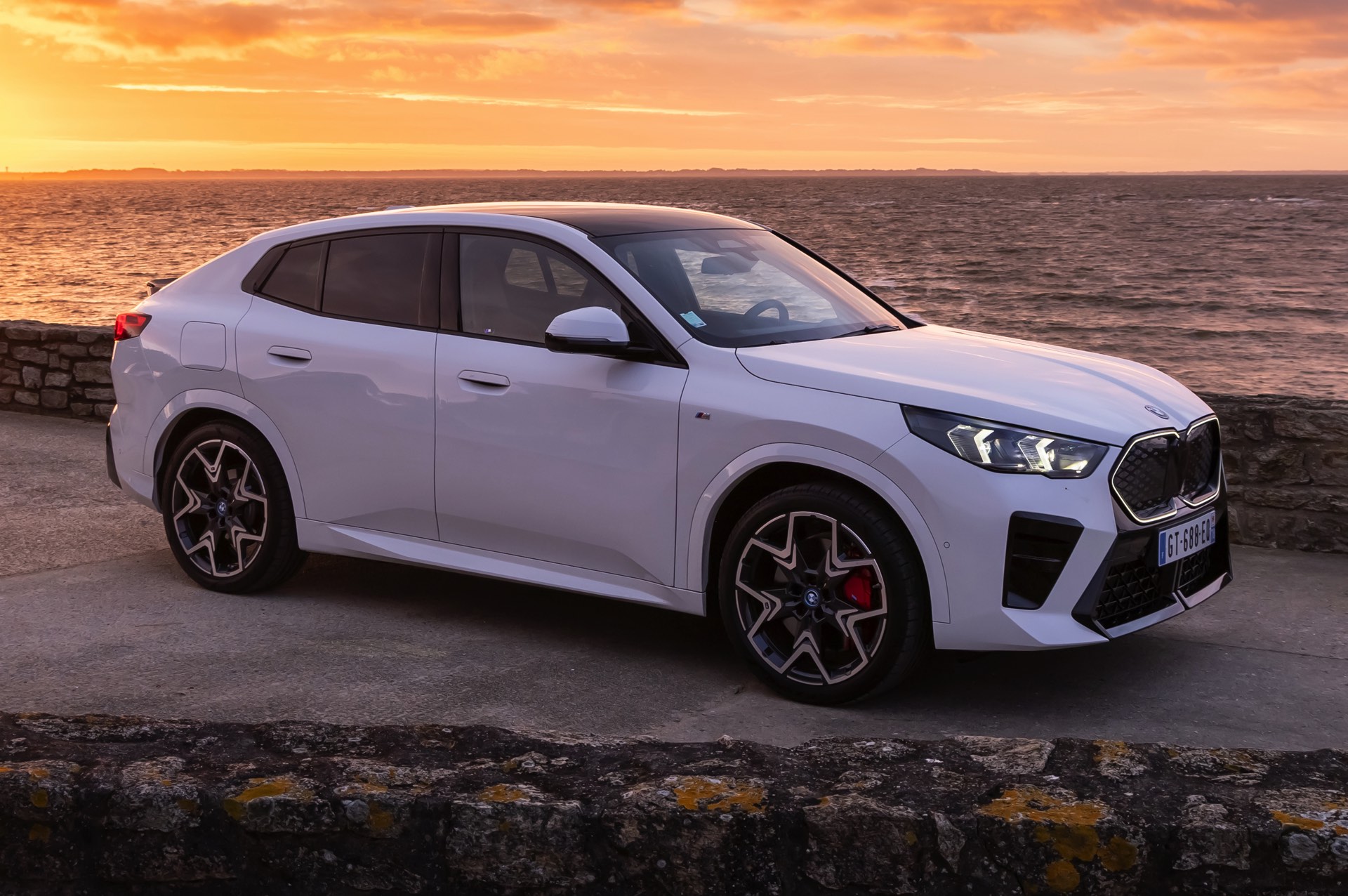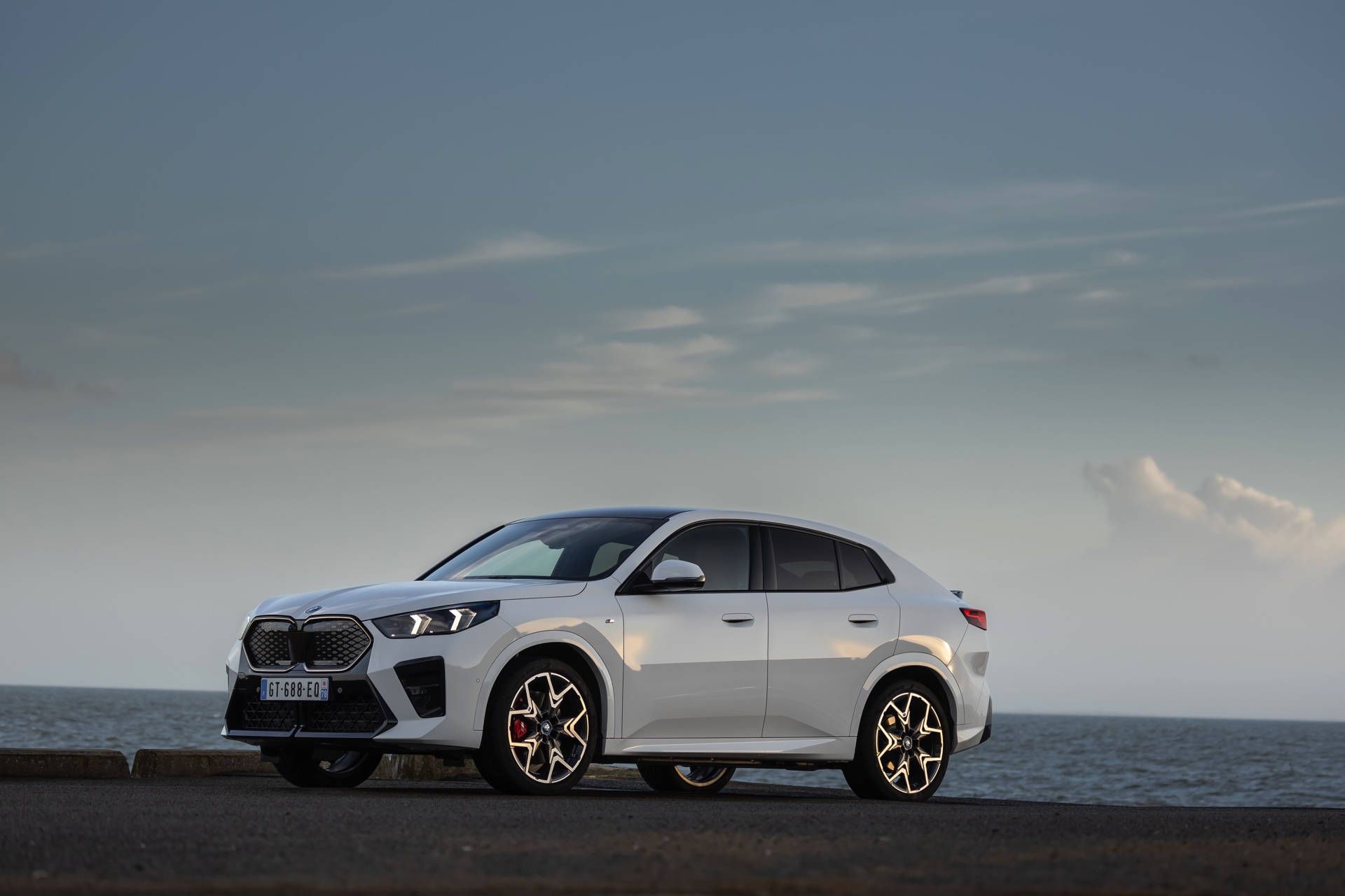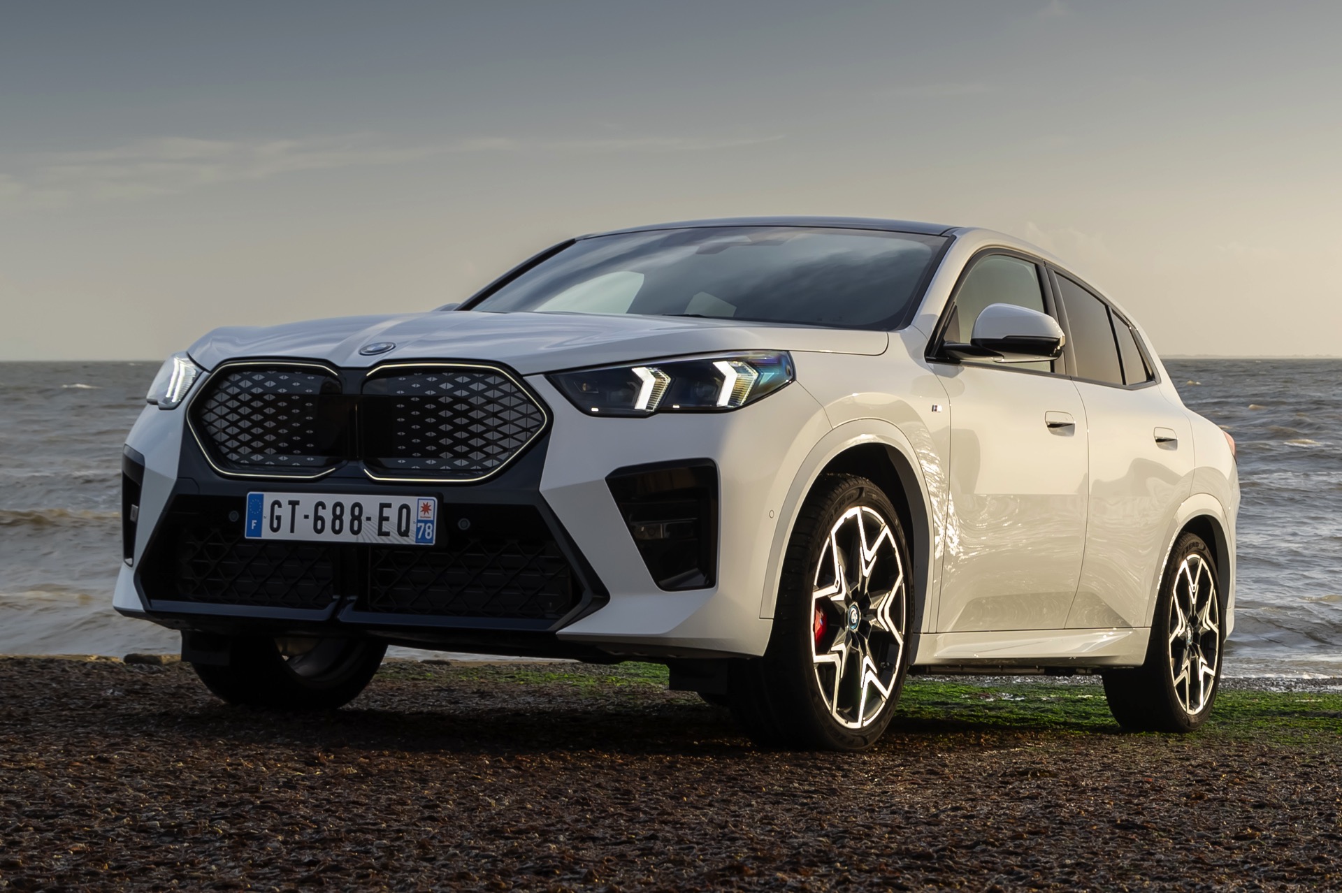 Die markanten Iconic Glow-Nieren stehen im Fokus einer neuen Foto-Serie zum BMW iX2 (U10) aus Frankreich. Die elektrische Variante des neuen X2 kombiniert dabei eine Lackierung in Alpinweiß uni mit dem M Sport Pro-Paket, sodass sich ein konsequenter Schwarz-Weiß-Look ergibt. Die nur noch über das M Sport Pro-Paket erhältliche Shadow Line mit erweiterten Umfängen sorgt dabei für die Nieren-Einfassung in Hochglanz-Schwarz, außerdem zählen unter anderem die M Leuchten Shadow Line mit abgedunkeltem Innenleben, die M Sportbremse mit roten Sätteln und der stärker ausgeformte M Heckspoiler zu den Bestandteilen des Pakets.
