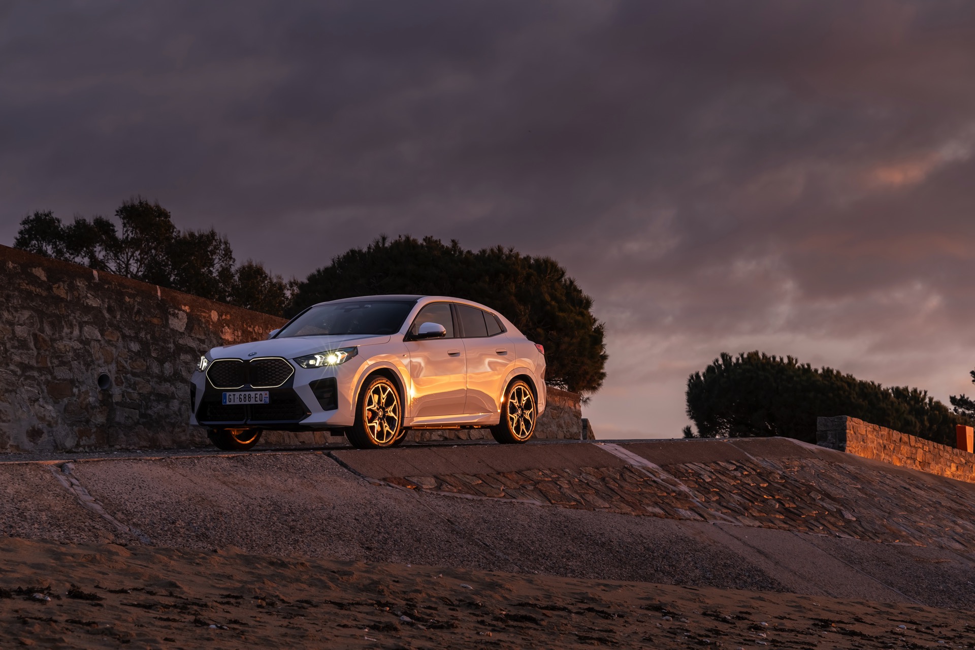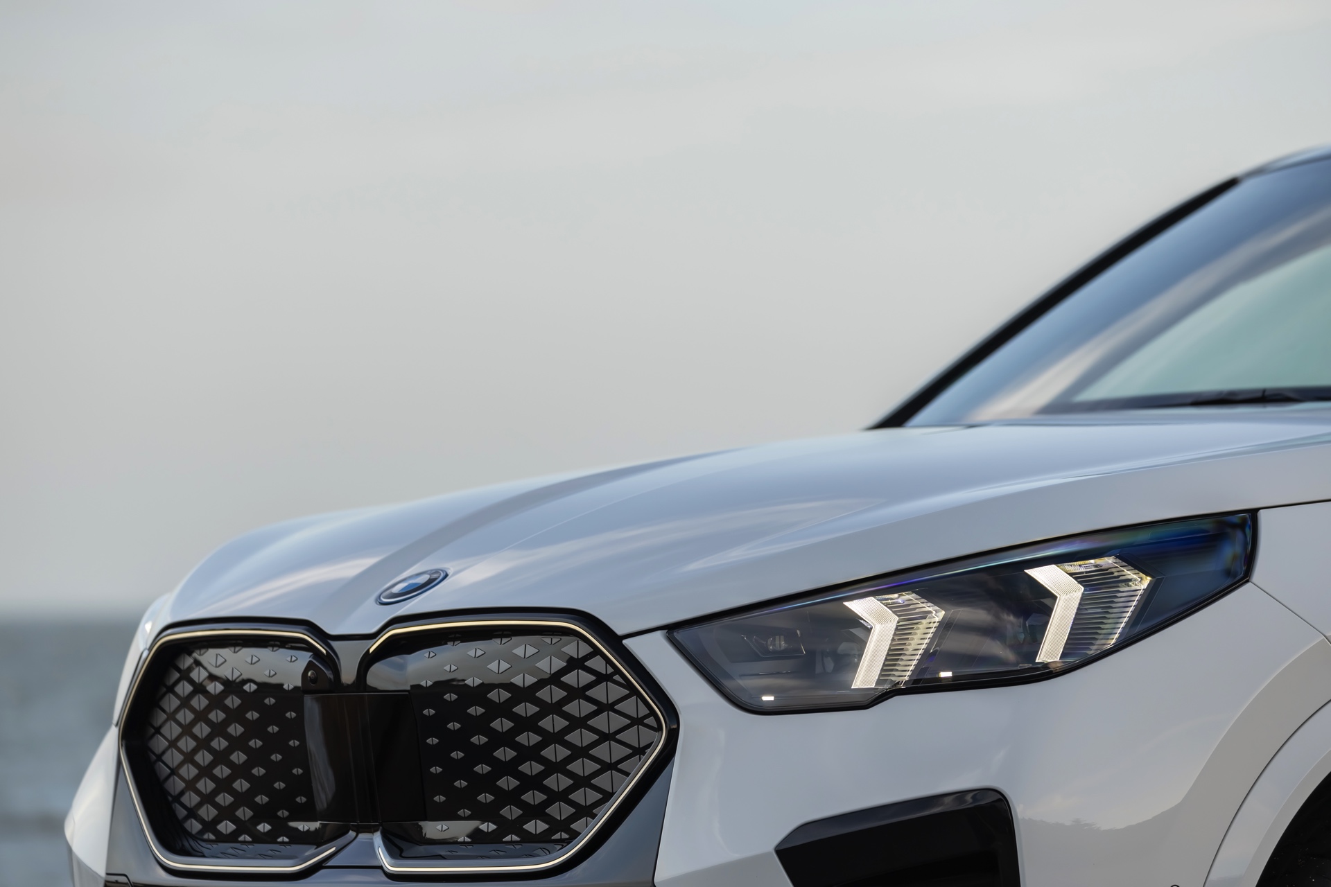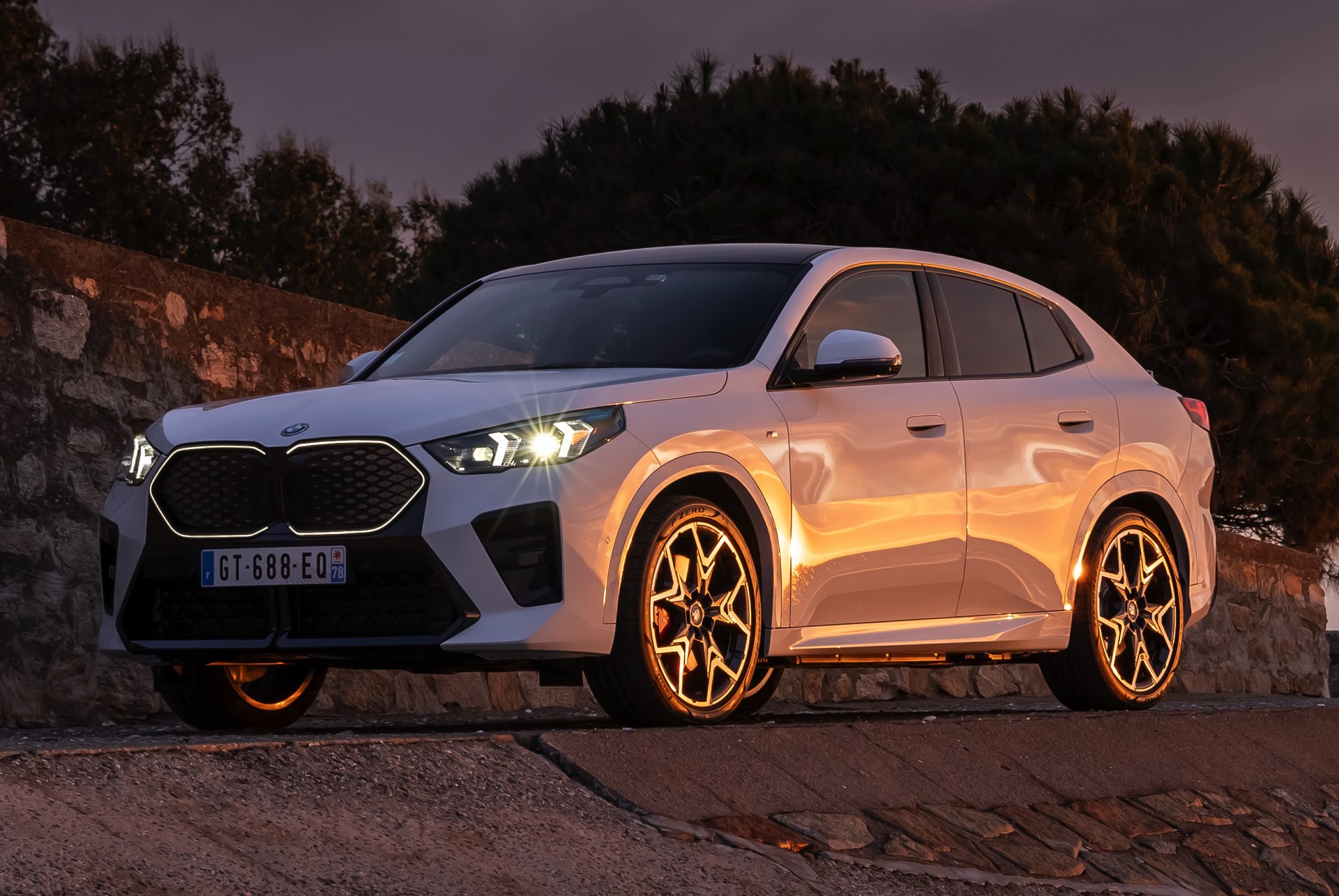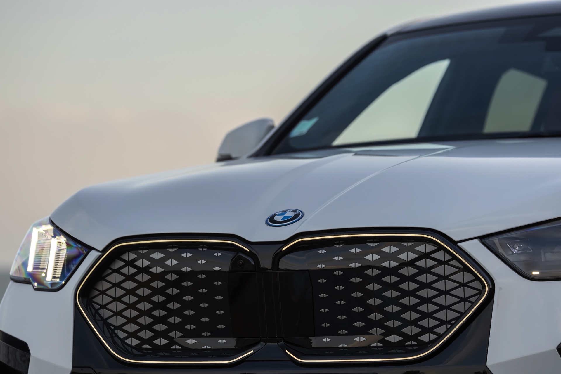 Die markanten Iconic Glow-Nieren stehen im Fokus einer neuen Foto-Serie zum BMW iX2 (U10) aus Frankreich. Die elektrische Variante des neuen X2 kombiniert dabei eine Lackierung in Alpinweiß uni mit dem M Sport Pro-Paket, sodass sich ein konsequenter Schwarz-Weiß-Look ergibt. Die nur noch über das M Sport Pro-Paket erhältliche Shadow Line mit erweiterten Umfängen sorgt dabei für die Nieren-Einfassung in Hochglanz-Schwarz, außerdem zählen unter anderem die M Leuchten Shadow Line mit abgedunkeltem Innenleben, die M Sportbremse mit roten Sätteln und der stärker ausgeformte M Heckspoiler zu den Bestandteilen des Pakets.