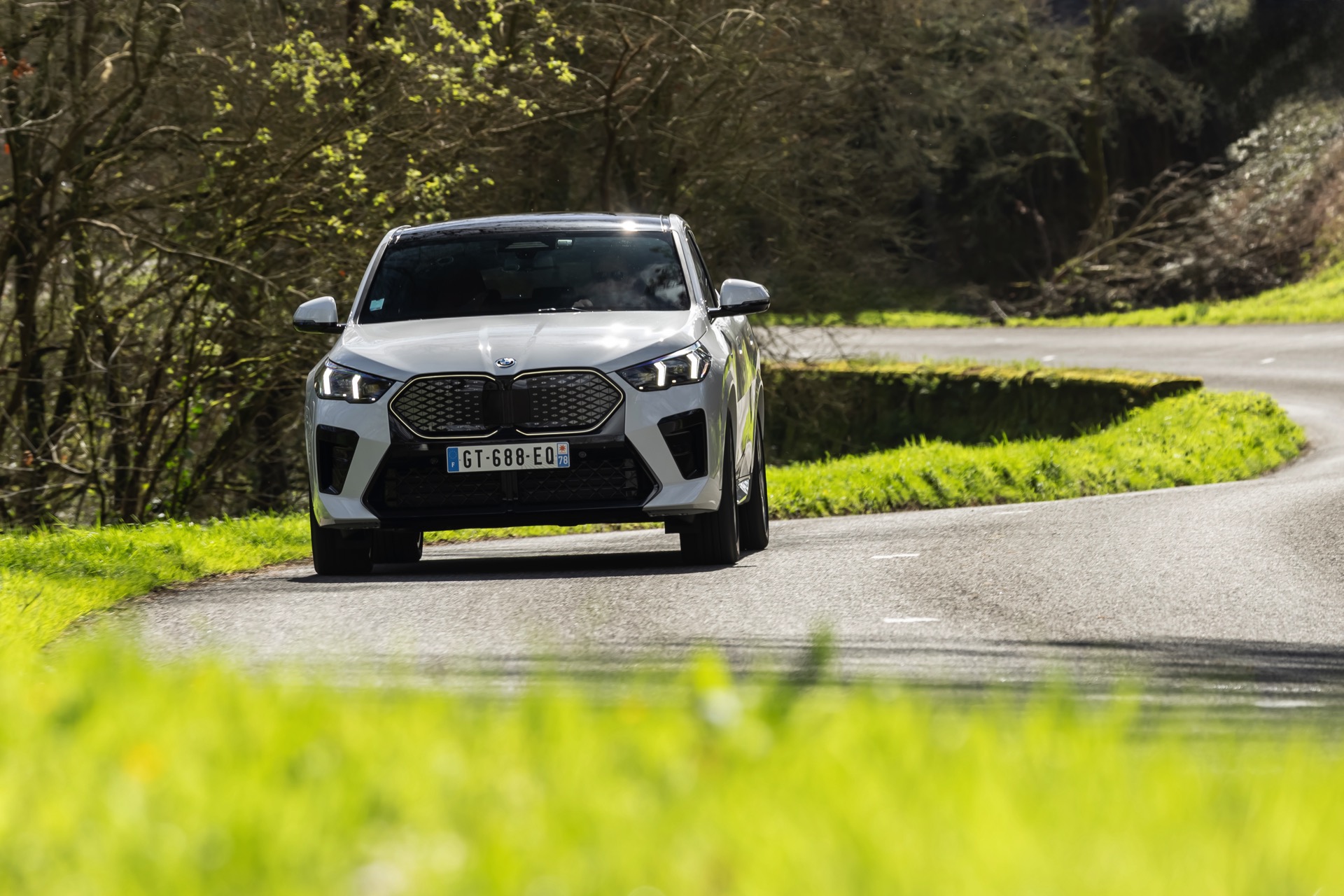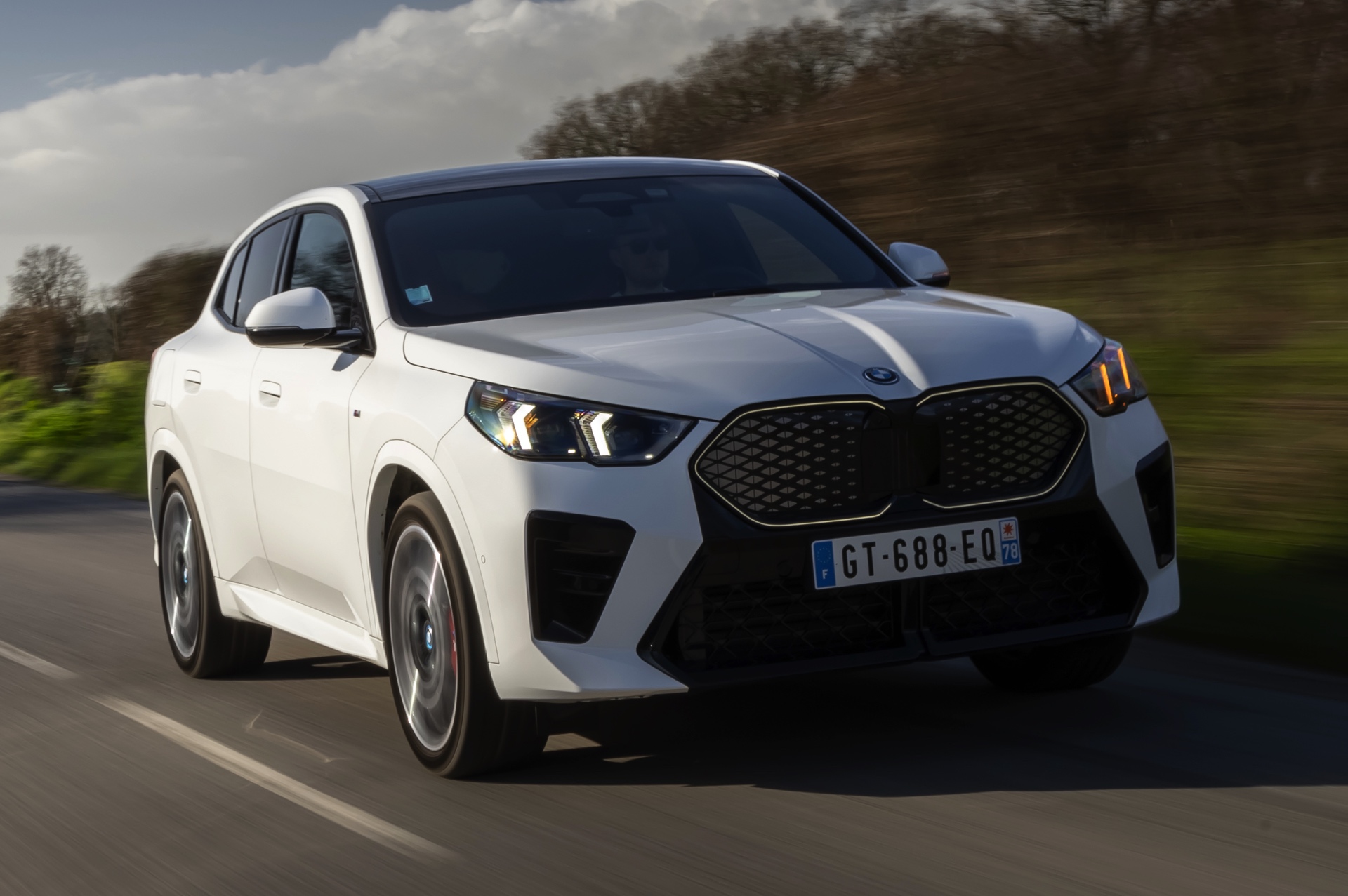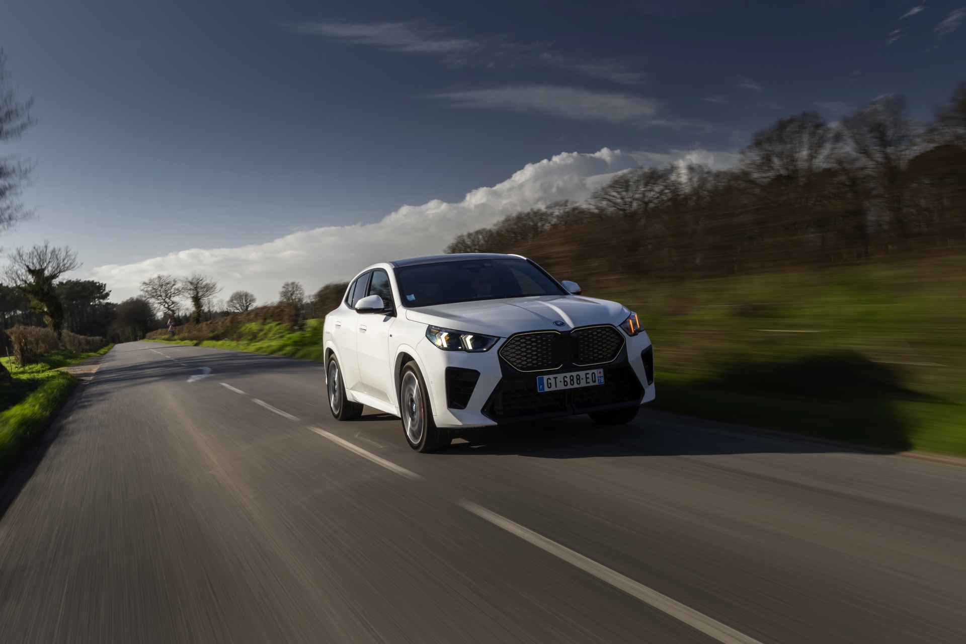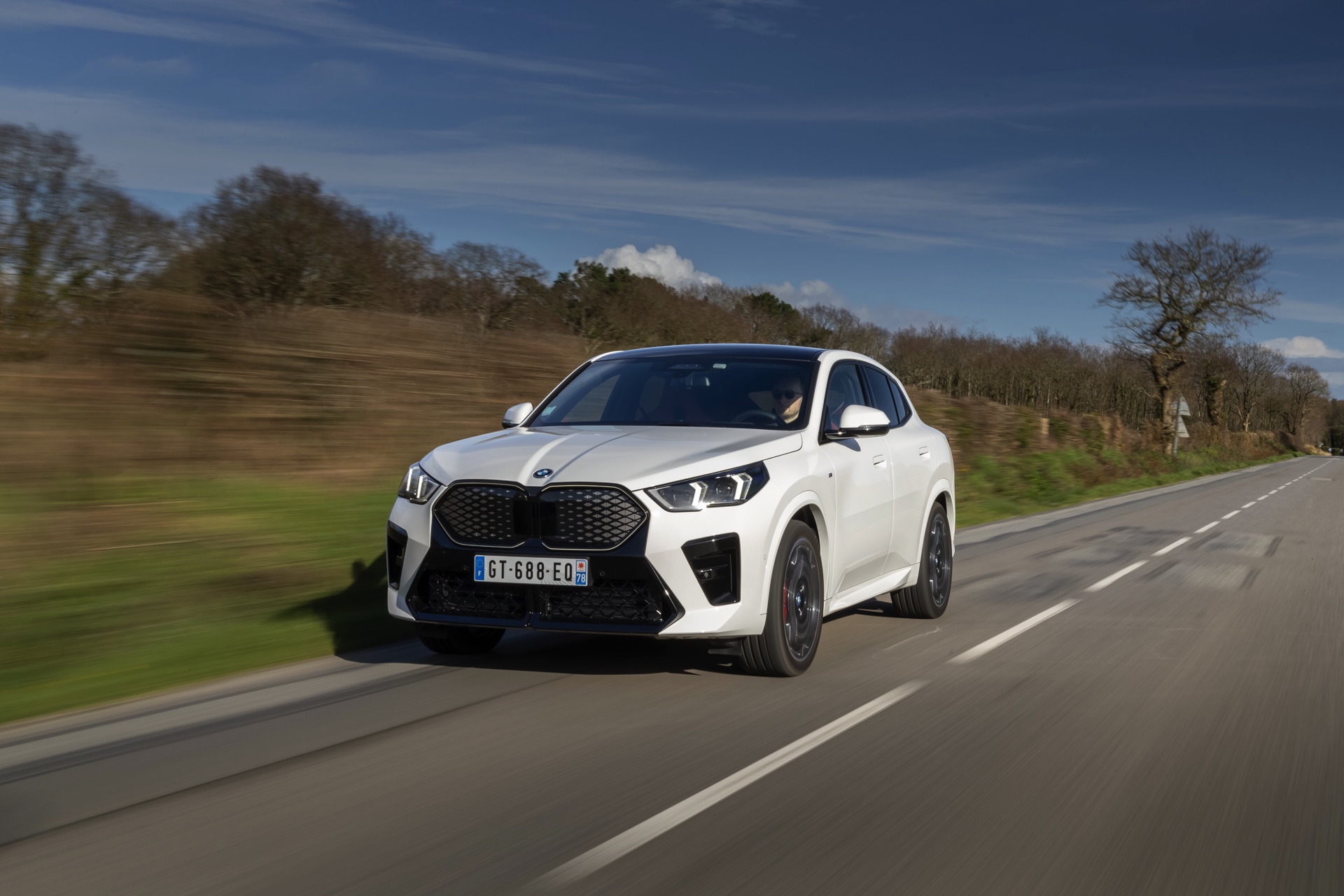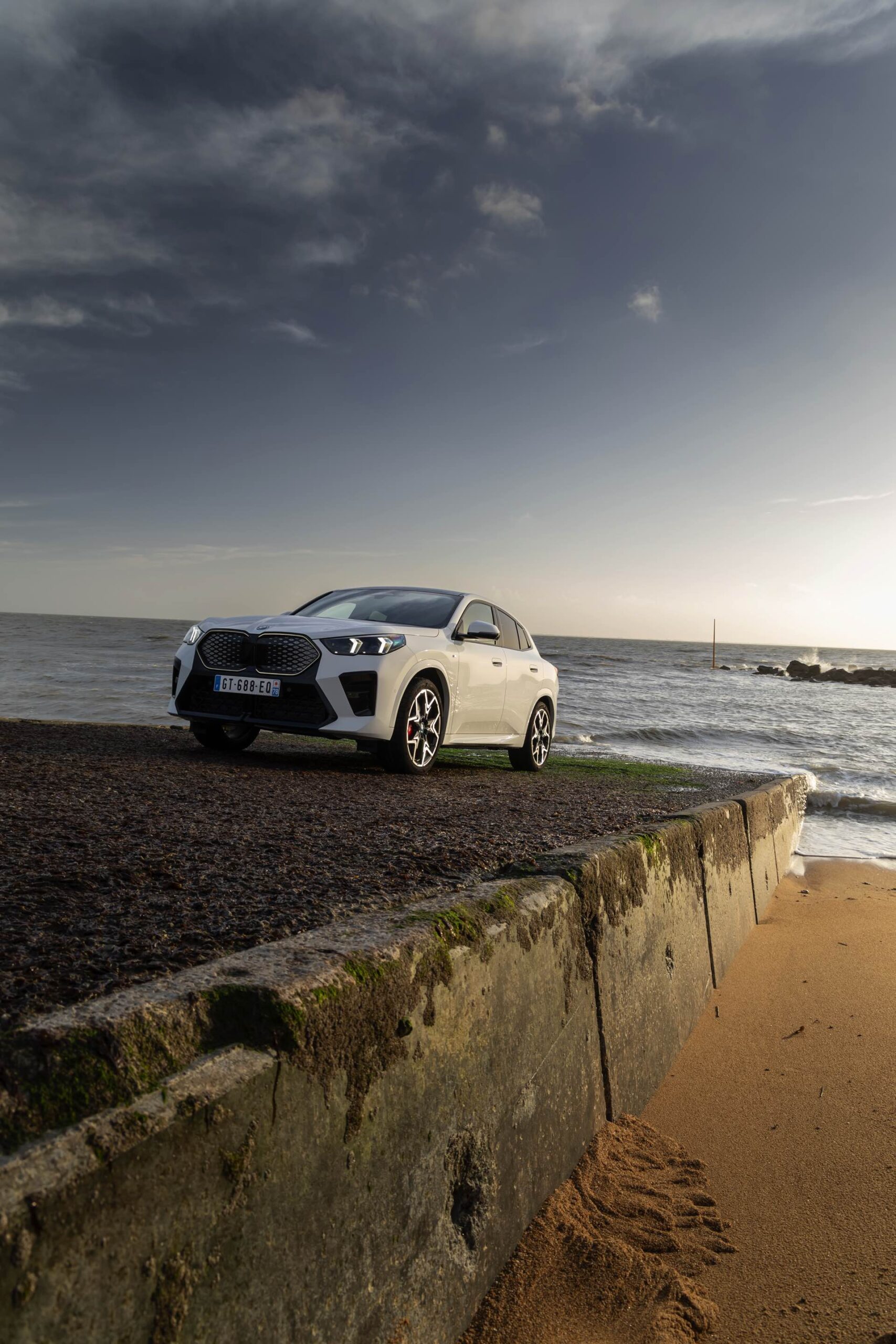 Die markanten Iconic Glow-Nieren stehen im Fokus einer neuen Foto-Serie zum BMW iX2 (U10) aus Frankreich. Die elektrische Variante des neuen X2 kombiniert dabei eine Lackierung in Alpinweiß uni mit dem M Sport Pro-Paket, sodass sich ein konsequenter Schwarz-Weiß-Look ergibt. Die nur noch über das M Sport Pro-Paket erhältliche Shadow Line mit erweiterten Umfängen sorgt dabei für die Nieren-Einfassung in Hochglanz-Schwarz, außerdem zählen unter anderem die M Leuchten Shadow Line mit abgedunkeltem Innenleben, die M Sportbremse mit roten Sätteln und der stärker ausgeformte M Heckspoiler zu den Bestandteilen des Pakets.