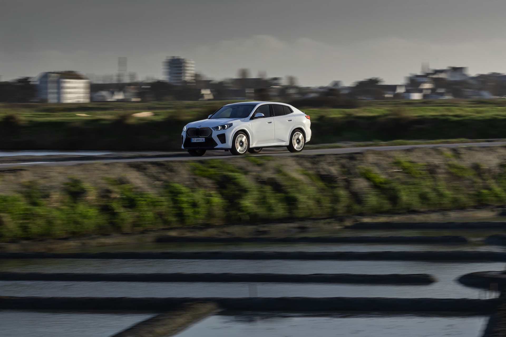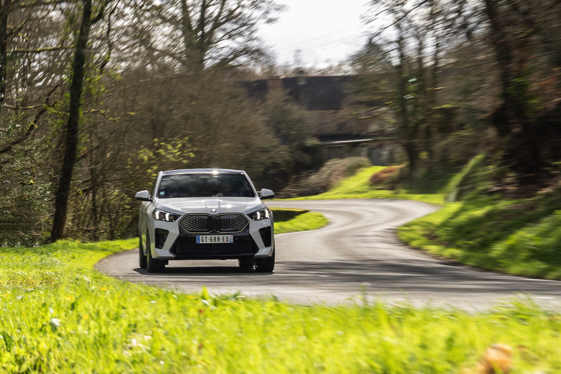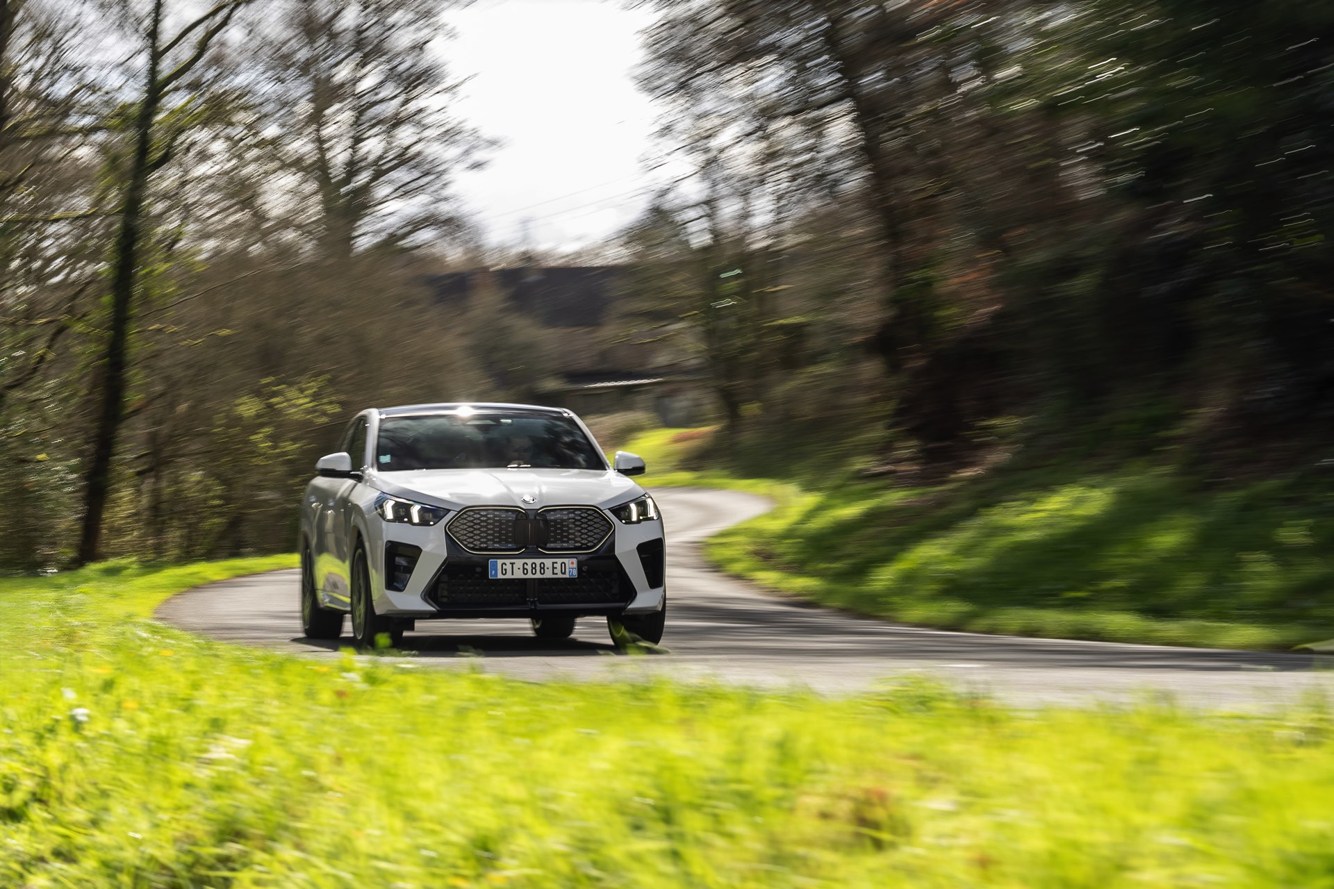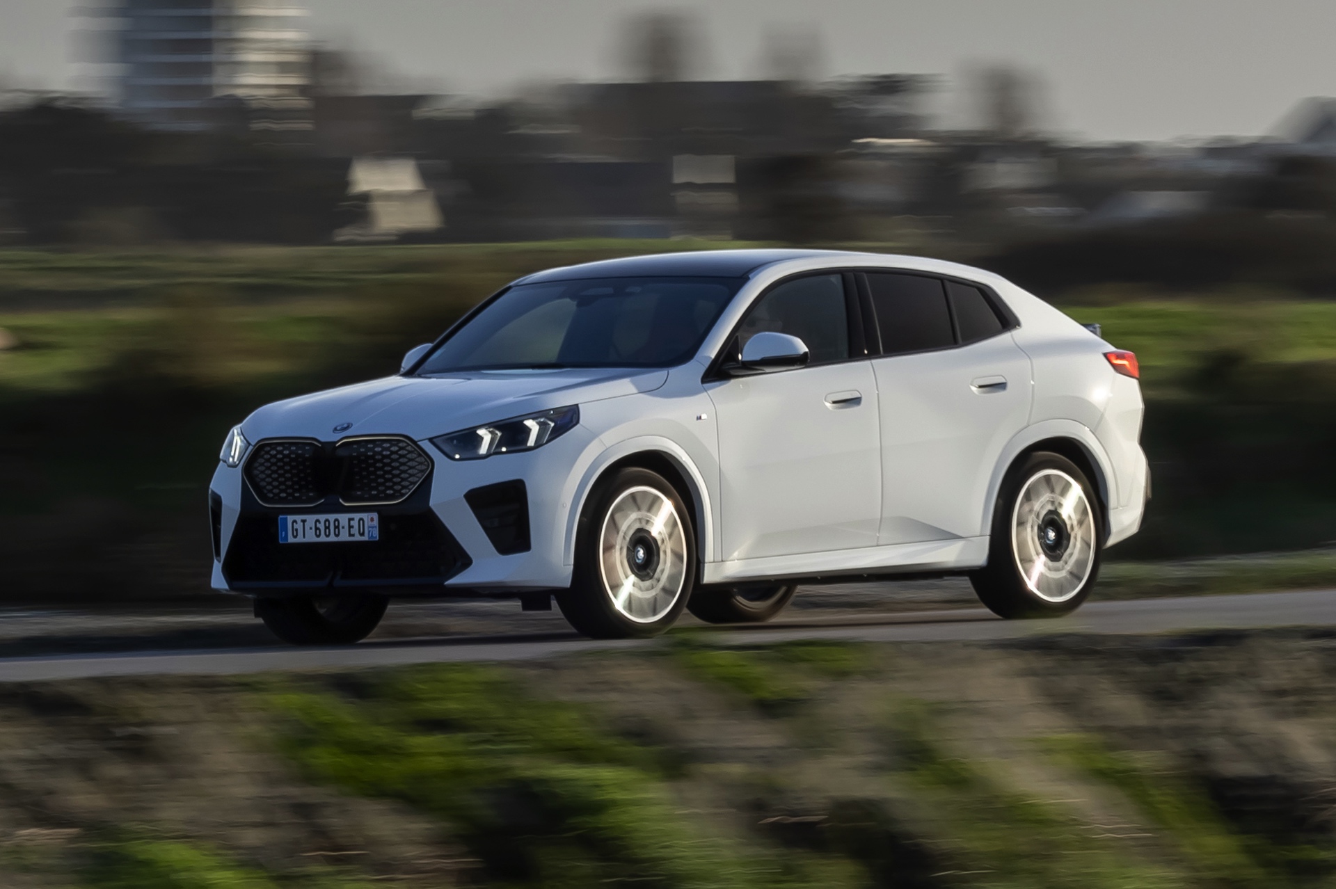 Die markanten Iconic Glow-Nieren stehen im Fokus einer neuen Foto-Serie zum BMW iX2 (U10) aus Frankreich. Die elektrische Variante des neuen X2 kombiniert dabei eine Lackierung in Alpinweiß uni mit dem M Sport Pro-Paket, sodass sich ein konsequenter Schwarz-Weiß-Look ergibt. Die nur noch über das M Sport Pro-Paket erhältliche Shadow Line mit erweiterten Umfängen sorgt dabei für die Nieren-Einfassung in Hochglanz-Schwarz, außerdem zählen unter anderem die M Leuchten Shadow Line mit abgedunkeltem Innenleben, die M Sportbremse mit roten Sätteln und der stärker ausgeformte M Heckspoiler zu den Bestandteilen des Pakets.