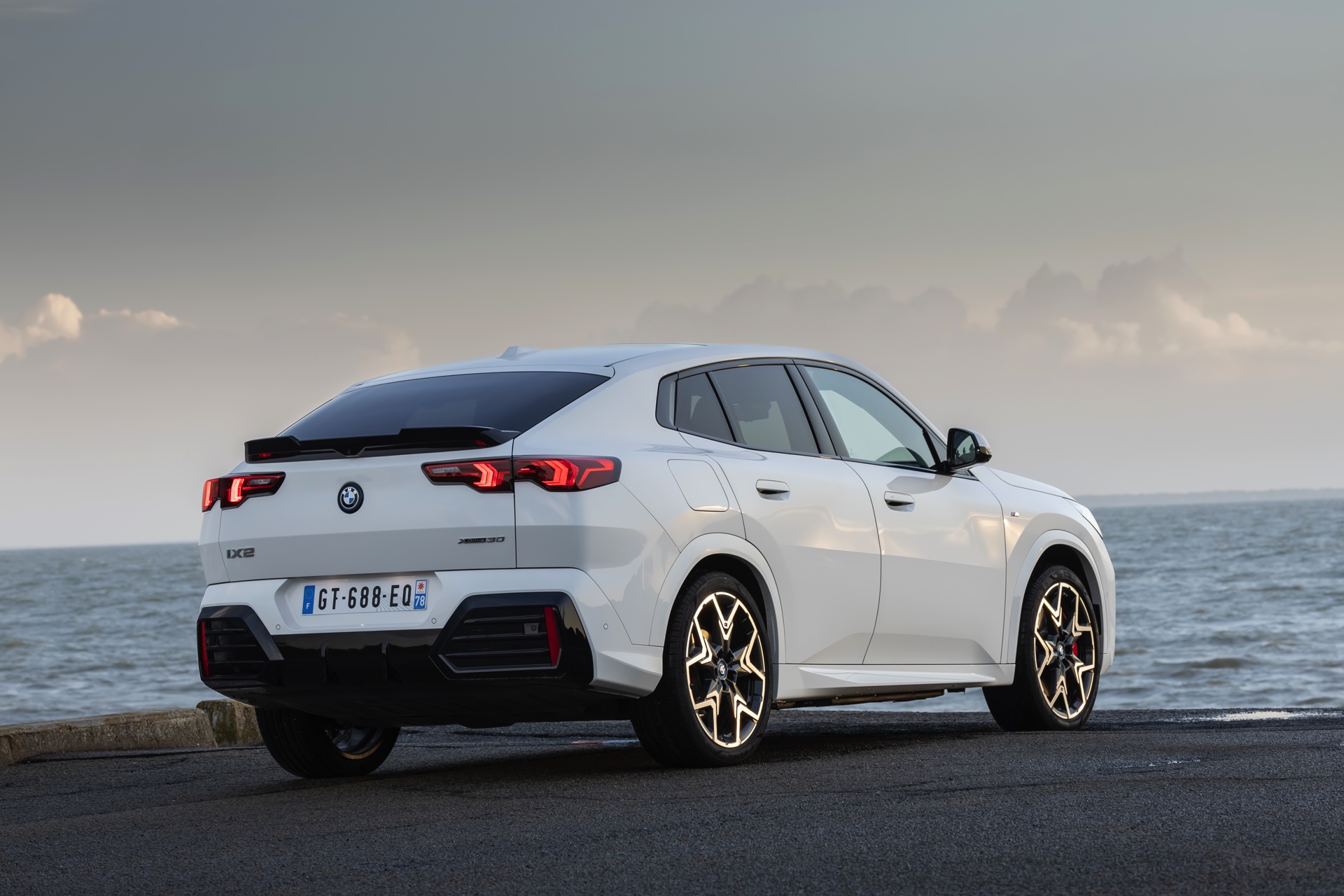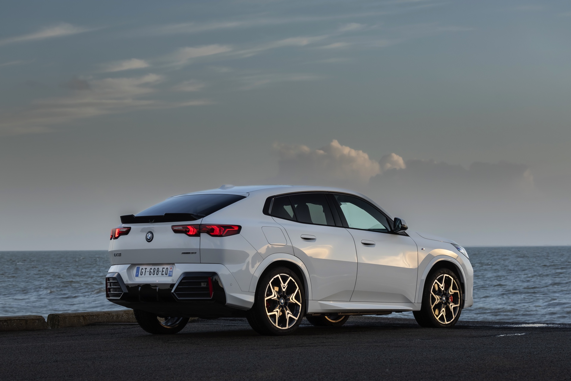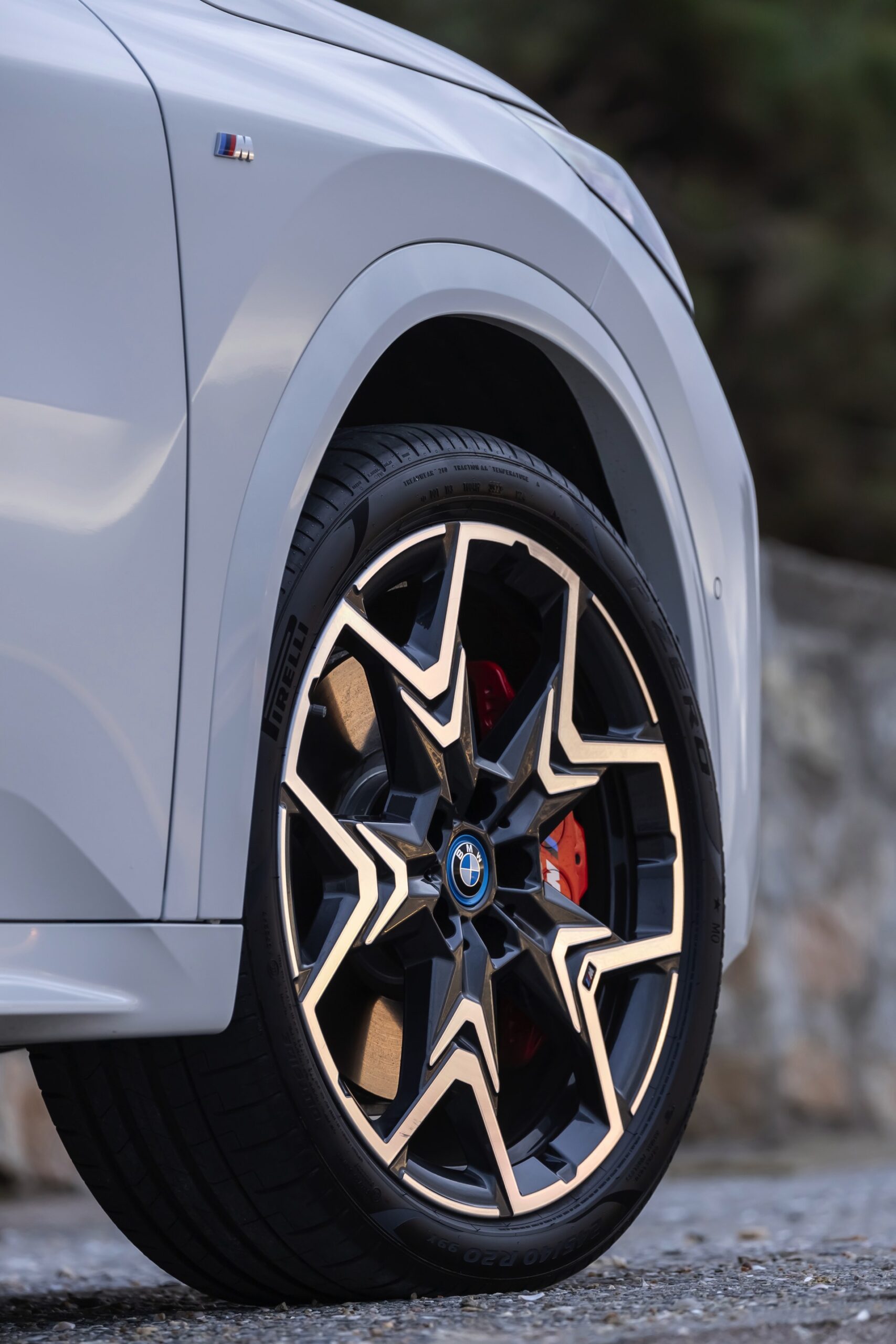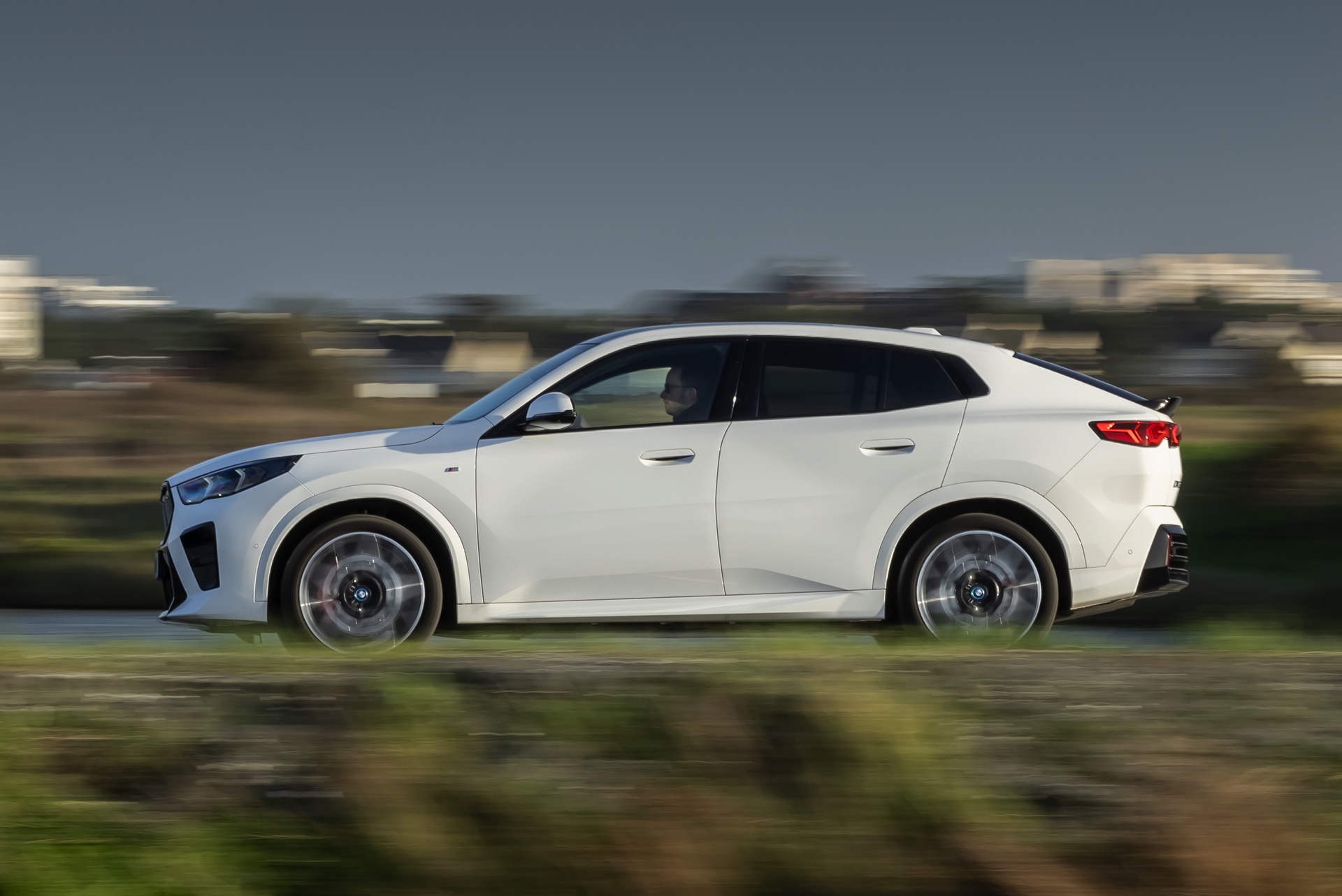 In der Seitenansicht zeigt der BMW iX2 xDrive nicht nur seine Coupé-artige Silhouette mit flach abfallender Dachlinie, sondern auch die 20 großen Leichtmetallräder V-Speiche 873 M Bicolor. Die Räder zählen zu den größten ab Werk erhältlichen Felgen für den elektrischen iX2, nur die konventionell angetriebenen Modelle wie der BMW X2 M35i sind auch mit 21-Zöllern bestellbar.