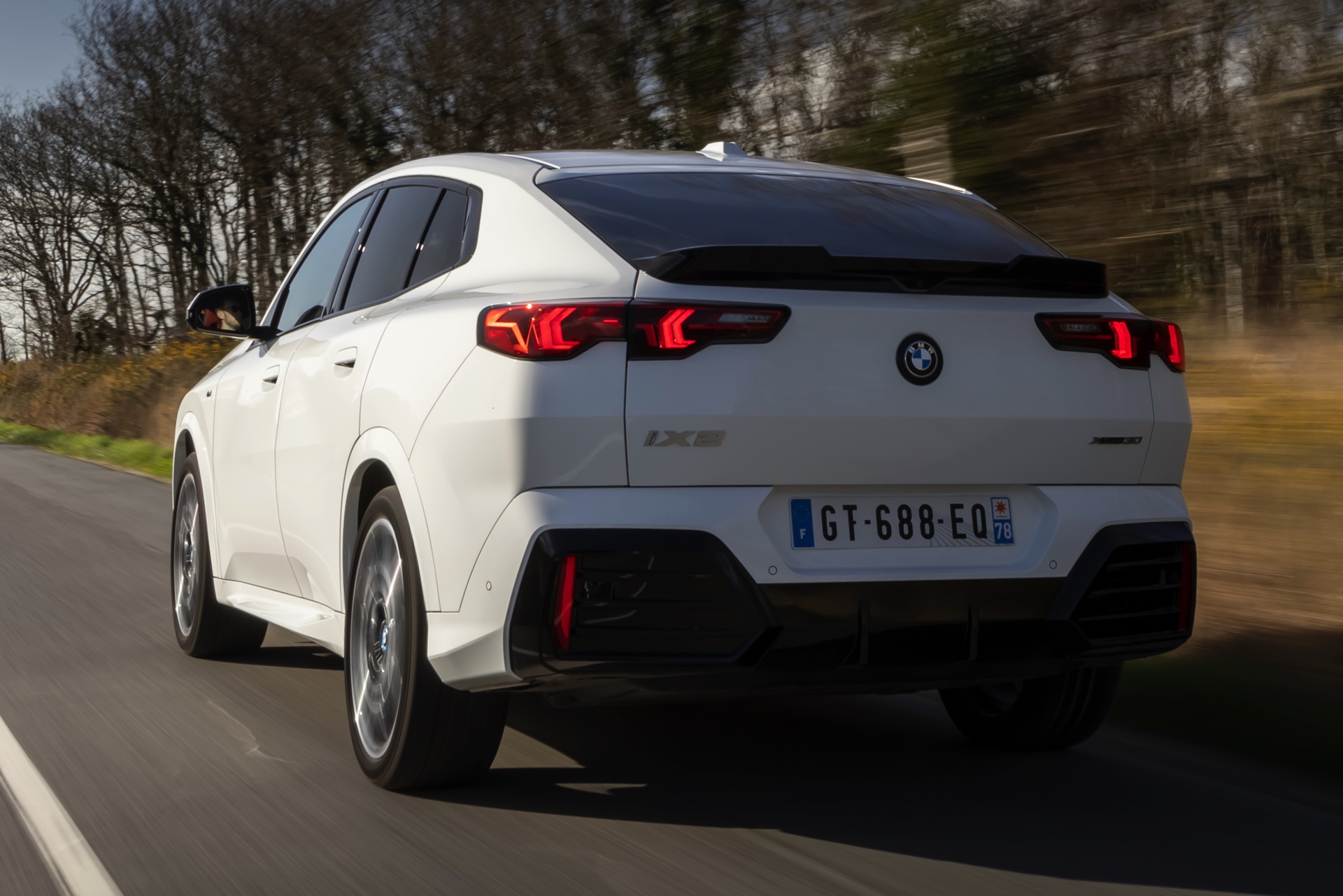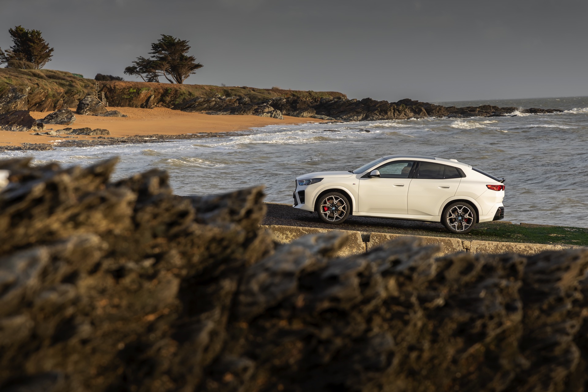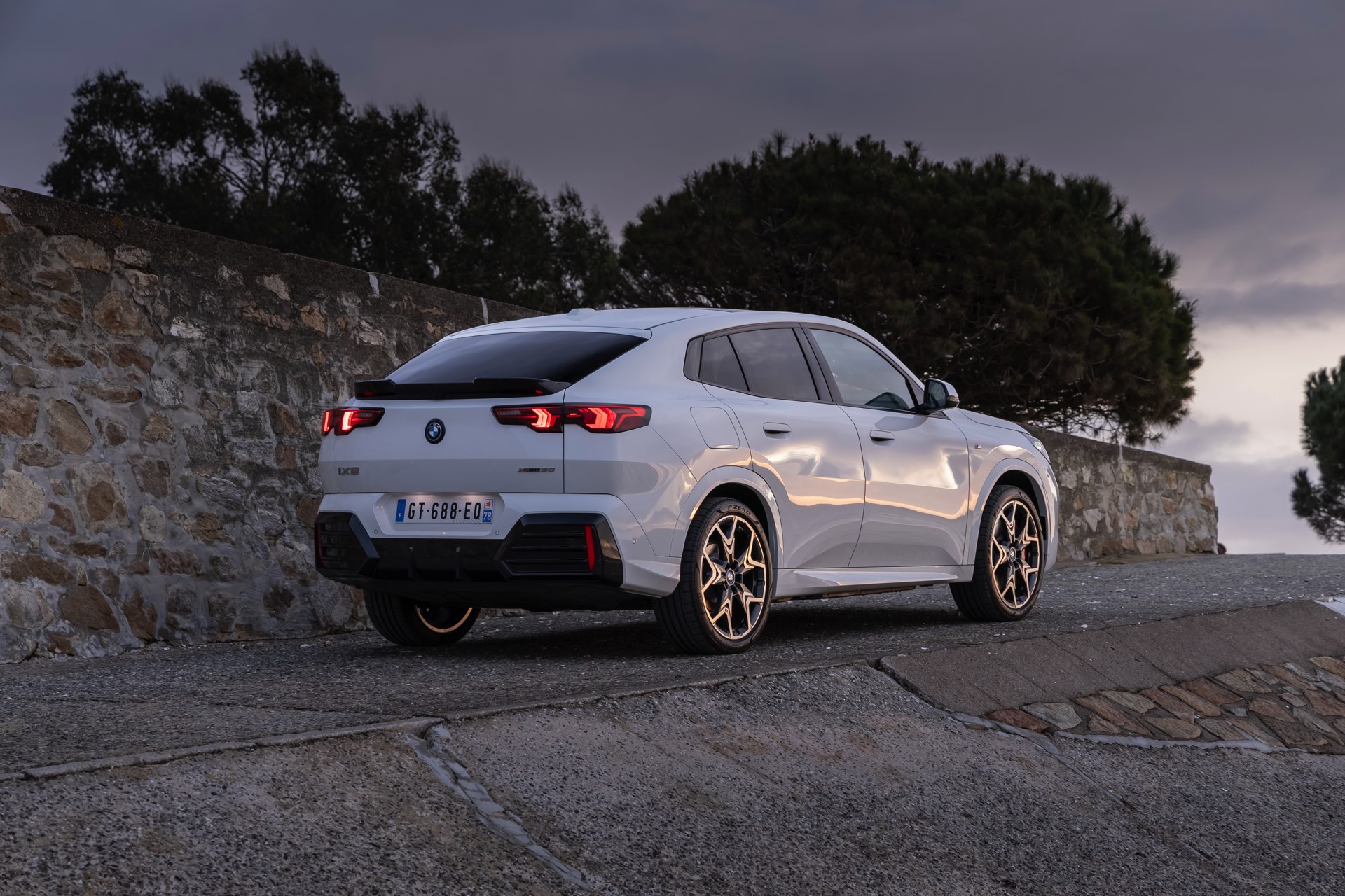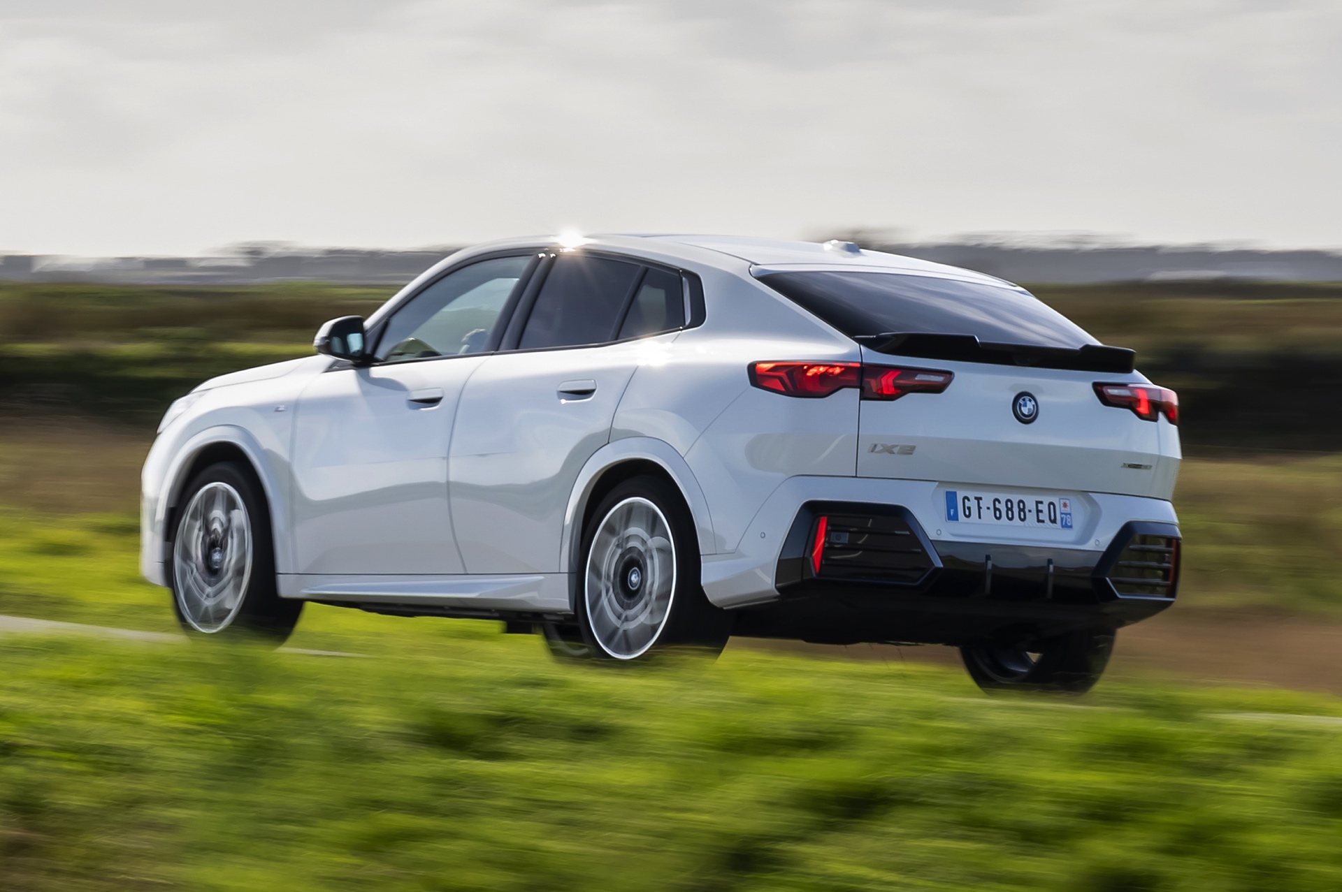In der Seitenansicht zeigt der BMW iX2 xDrive nicht nur seine Coupé-artige Silhouette mit flach abfallender Dachlinie, sondern auch die 20 großen Leichtmetallräder V-Speiche 873 M Bicolor. Die Räder zählen zu den größten ab Werk erhältlichen Felgen für den elektrischen iX2, nur die konventionell angetriebenen Modelle wie der BMW X2 M35i sind auch mit 21-Zöllern bestellbar.