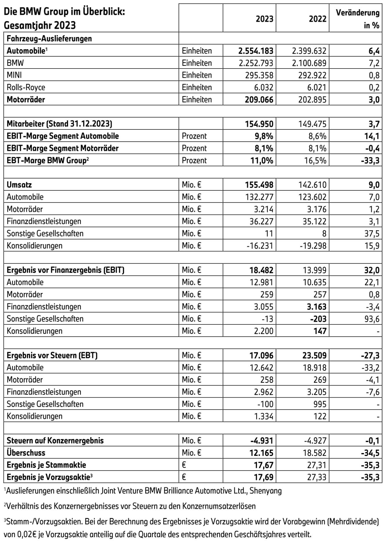 Legt man den Fokus auf andere Zahlen, kann die BMW Group durchaus auf ein starkes Jahr 2023 zurückblicken: Der weltweite Absatz stieg um 6,4 Prozent auf 2.554.183 Fahrzeuge der Marken BMW, MINI und Rolls-Royce, der Umsatz kletterte um 9,0 Prozent auf 155,498 Milliarden Euro und die EBIT-Marge im Segment Automobile legte sogar um 14,1 Prozent auf 9,8 Prozent zu. Die Verkaufszahlen beeindrucken gerade auch im Vergleich mit den direkten Rivalen im Premium-Segment, denn die BMW Group lag 2023 sowohl insgesamt als auch mit ihrer Kernmarke BMW klar vor Mercedes und Audi.