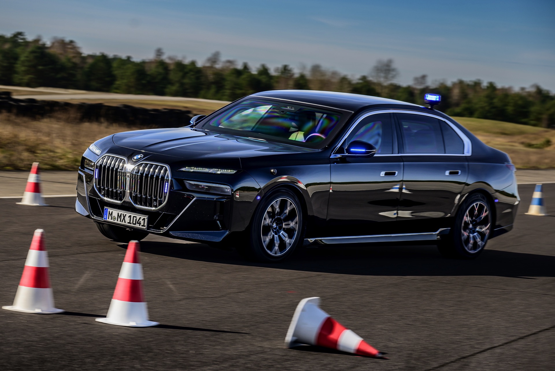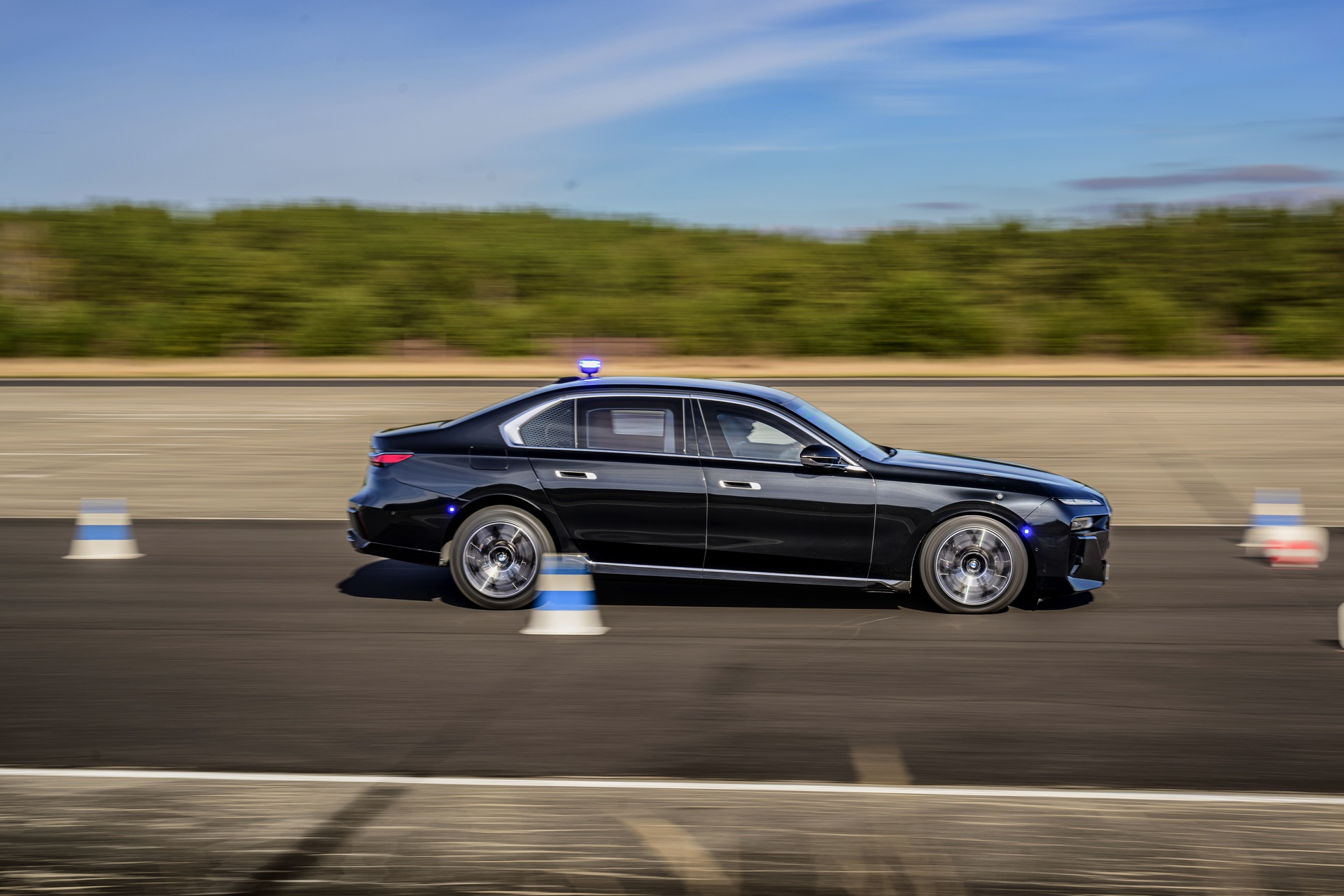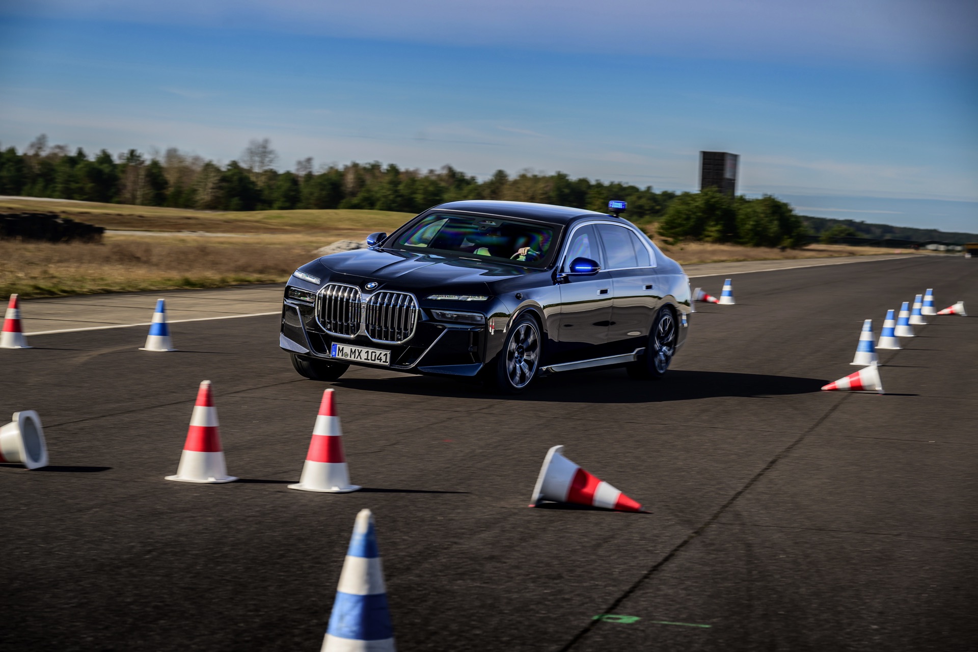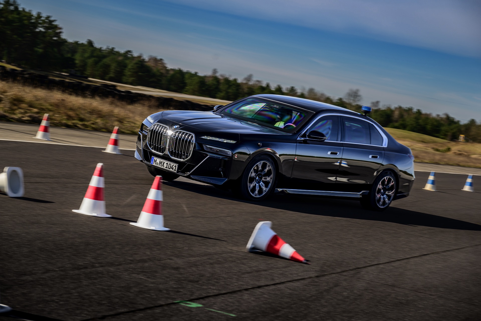 Eine wichtige Rolle spielt dabei der sichere Umgang mit den schweren Fahrzeugen, denn aufgrund der Panzerung bringt ein BMW i7 Protection (G73) rund 4,4 Tonnen auf die Waage. Bei praktisch jedem dynamischen Manöver, von der vollen Beschleunigung über eine Vollbremsung mit entsprechend längerem Bremsweg bis hin zum Verhalten bei Hochgeschwindigkeits-Spurwechseln, darf dieses Gewicht niemals außer Acht gelassen werden.