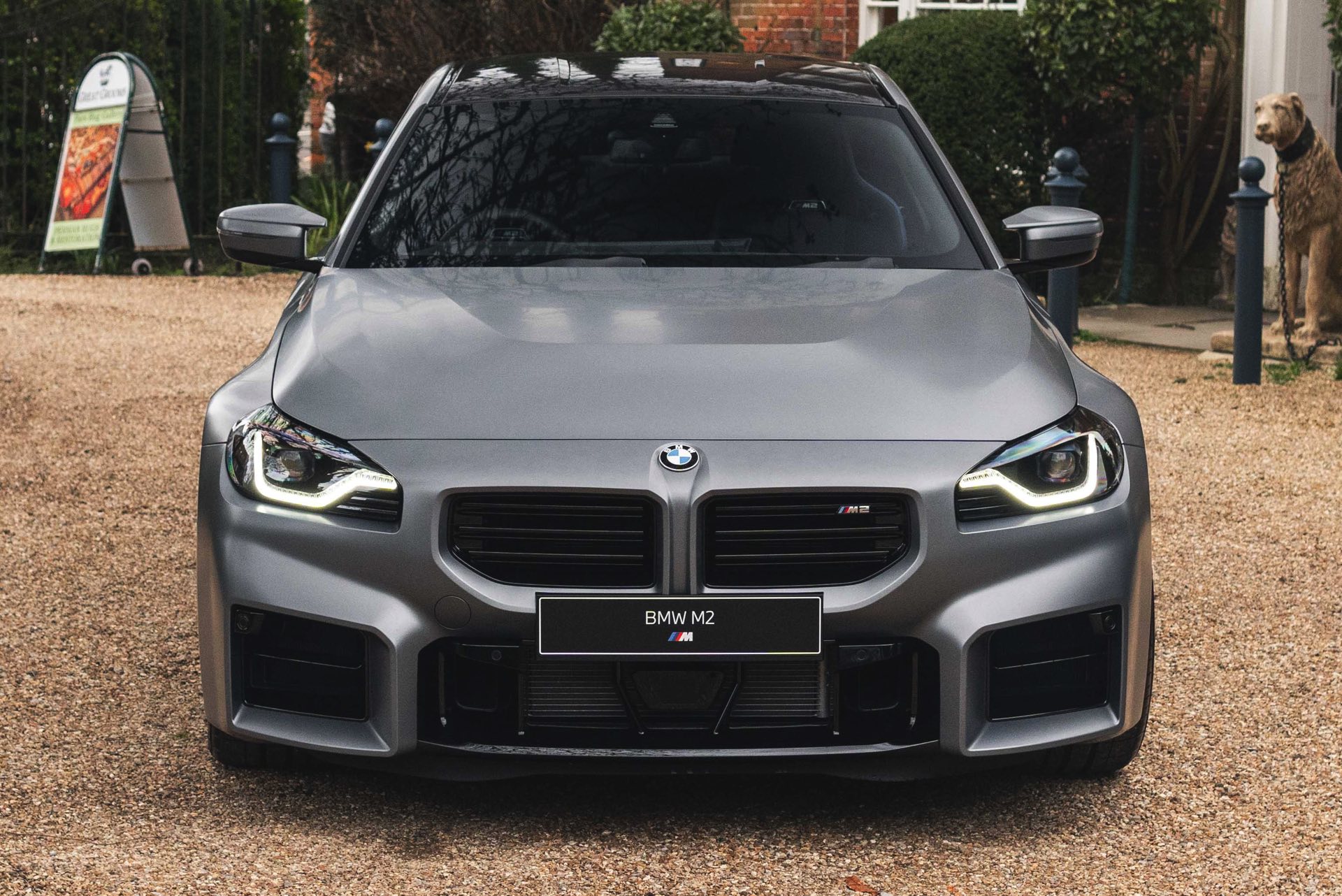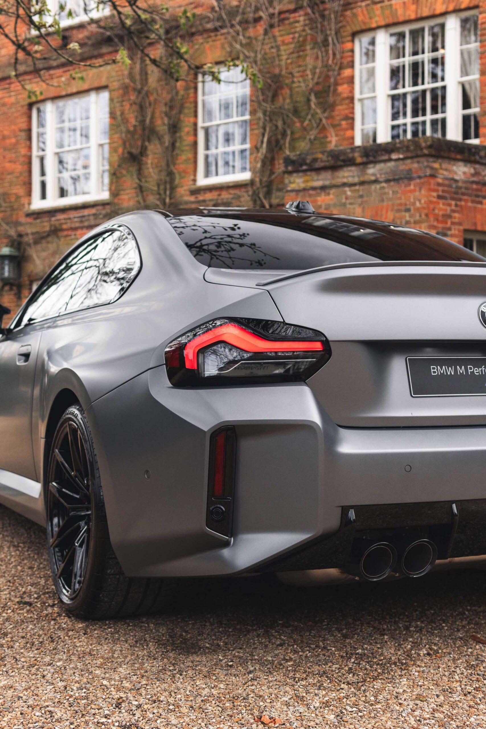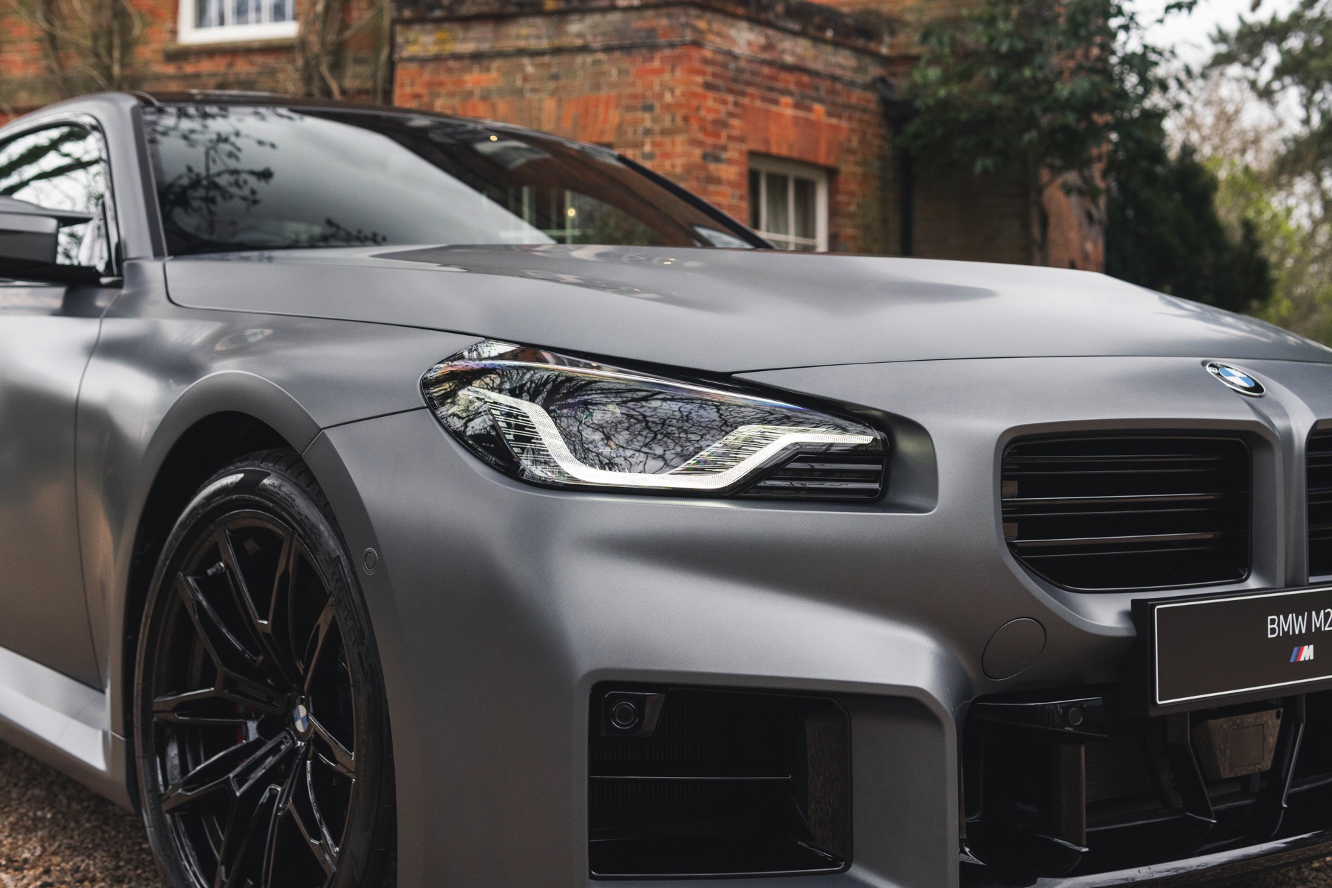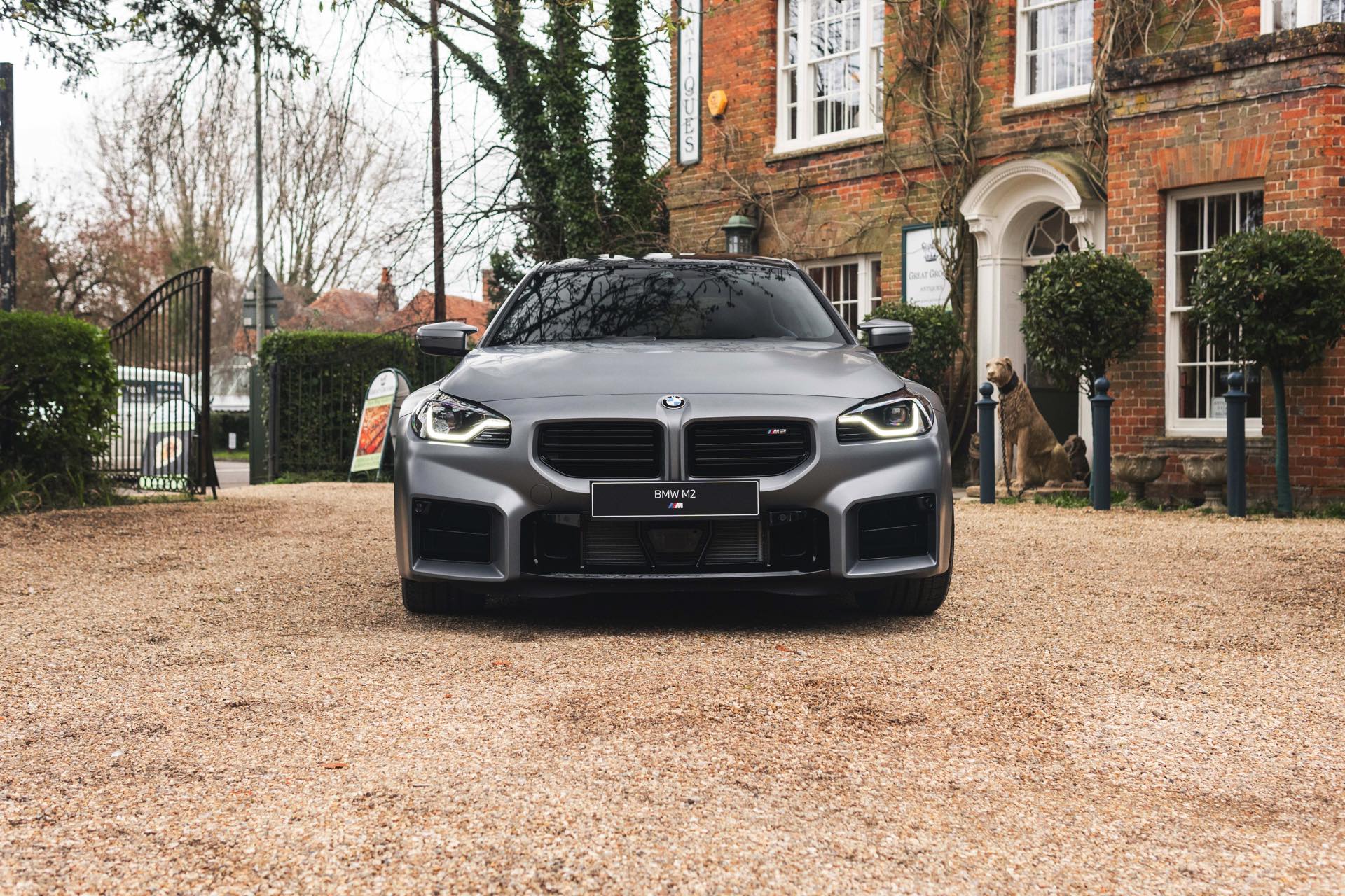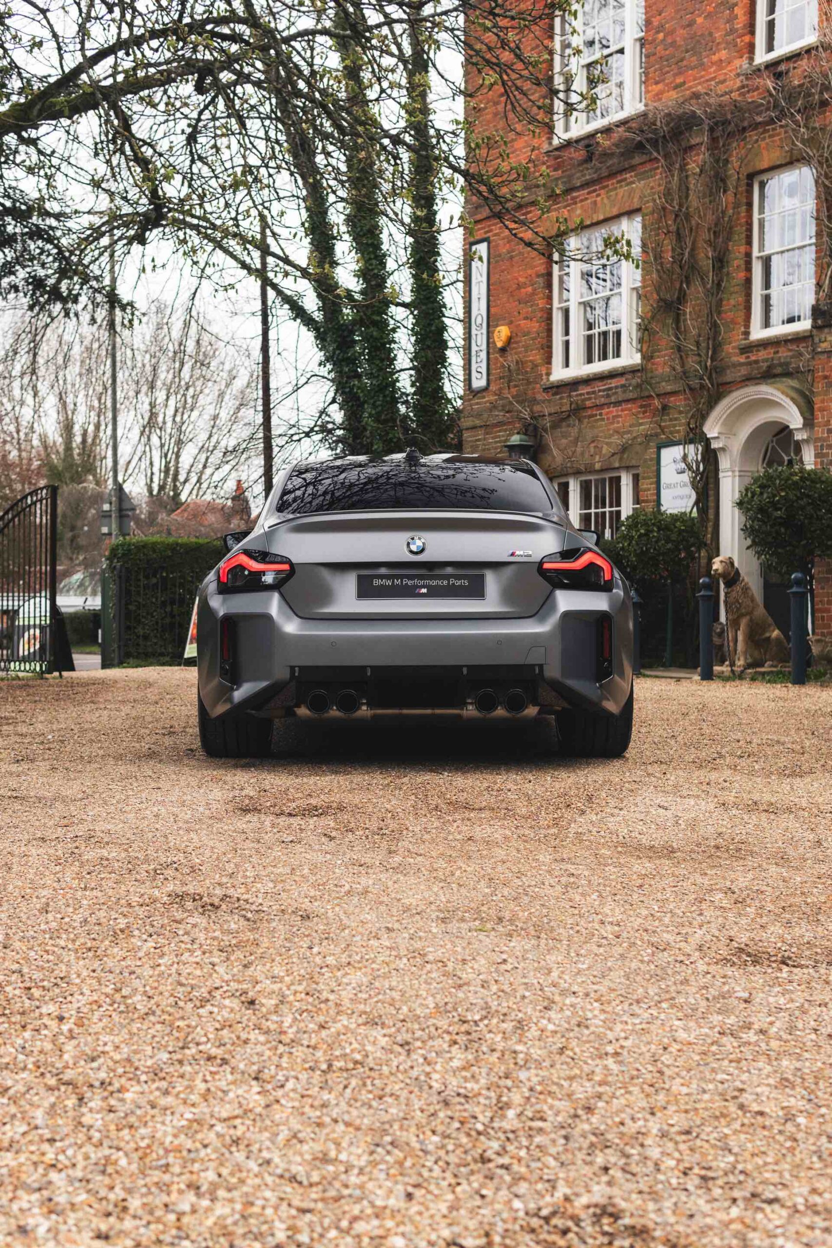 Durch die matte Lackierung in Frozen Pure Grey werden die Formen des BMW M2 zusätzlich betont, vor allem die deutlich verbreiterten Kotflügel kommen so extrem gut zur Geltung. Unter den dicken Backen sehen wir die vorne 19 und hinten 20 Zoll großen Leichtmetallräder Doppelspeiche 930 M, die auf Wunsch auch ab Werk mit Track-Bereifung bestellt werden können. Auf diese Option wurde beim gezeigten G87 verzichtet, aber mit Blick auf wechselhaftes Wetter setzen gerade in England auch besonders sportliche Fahrer auf eine alltagstaugliche Bereifung – und ziehen die Cup-Reifen nur dann auf, wenn sie am Wochenende eine der zahlreichen kleinen Rennstrecken zum Trackday besuchen.