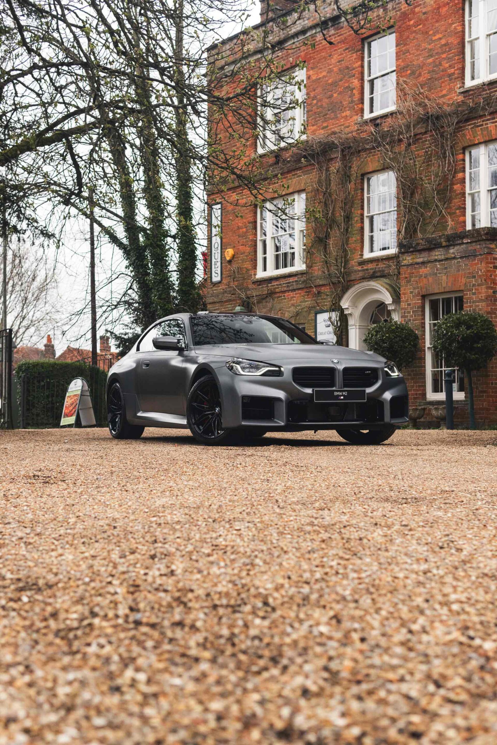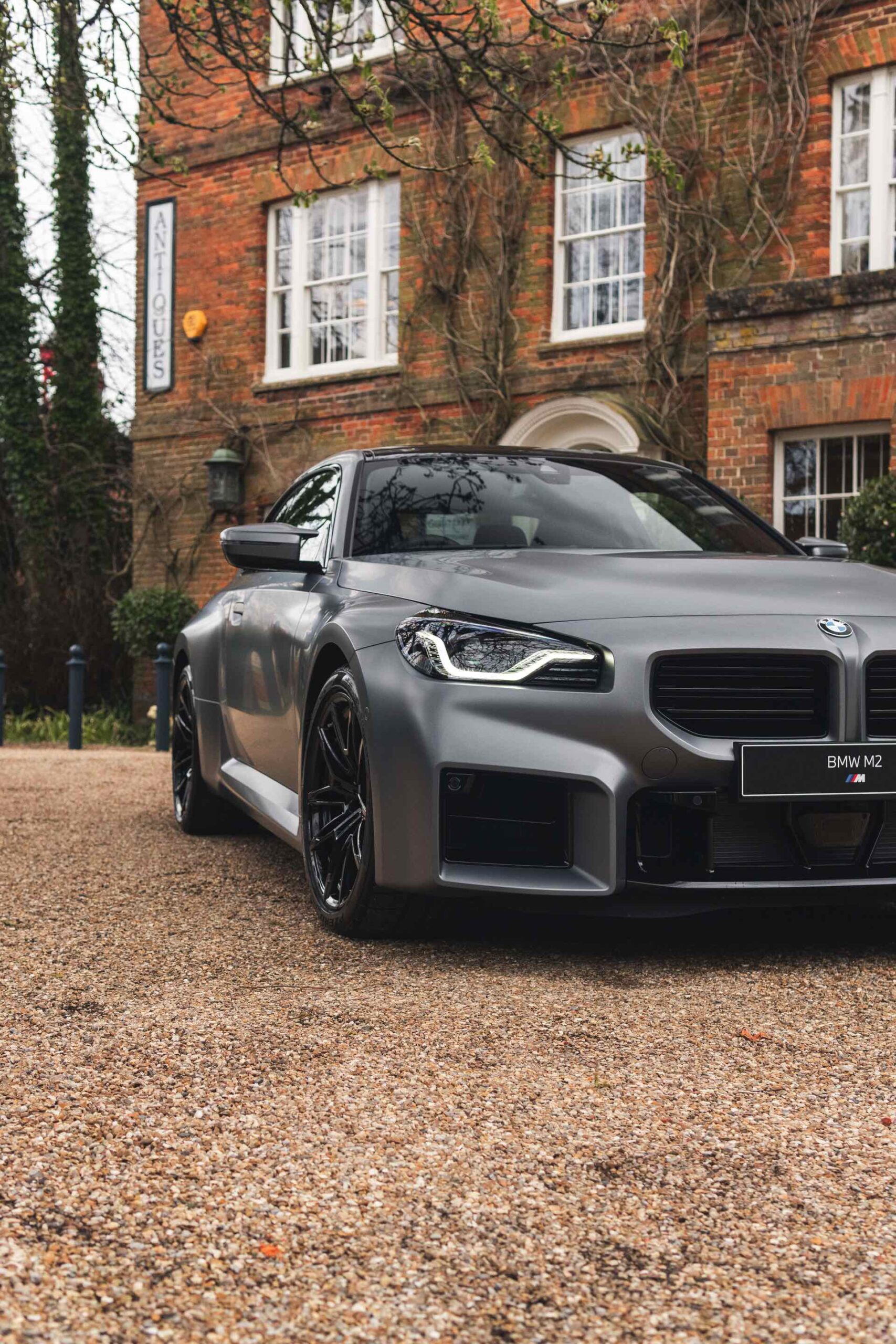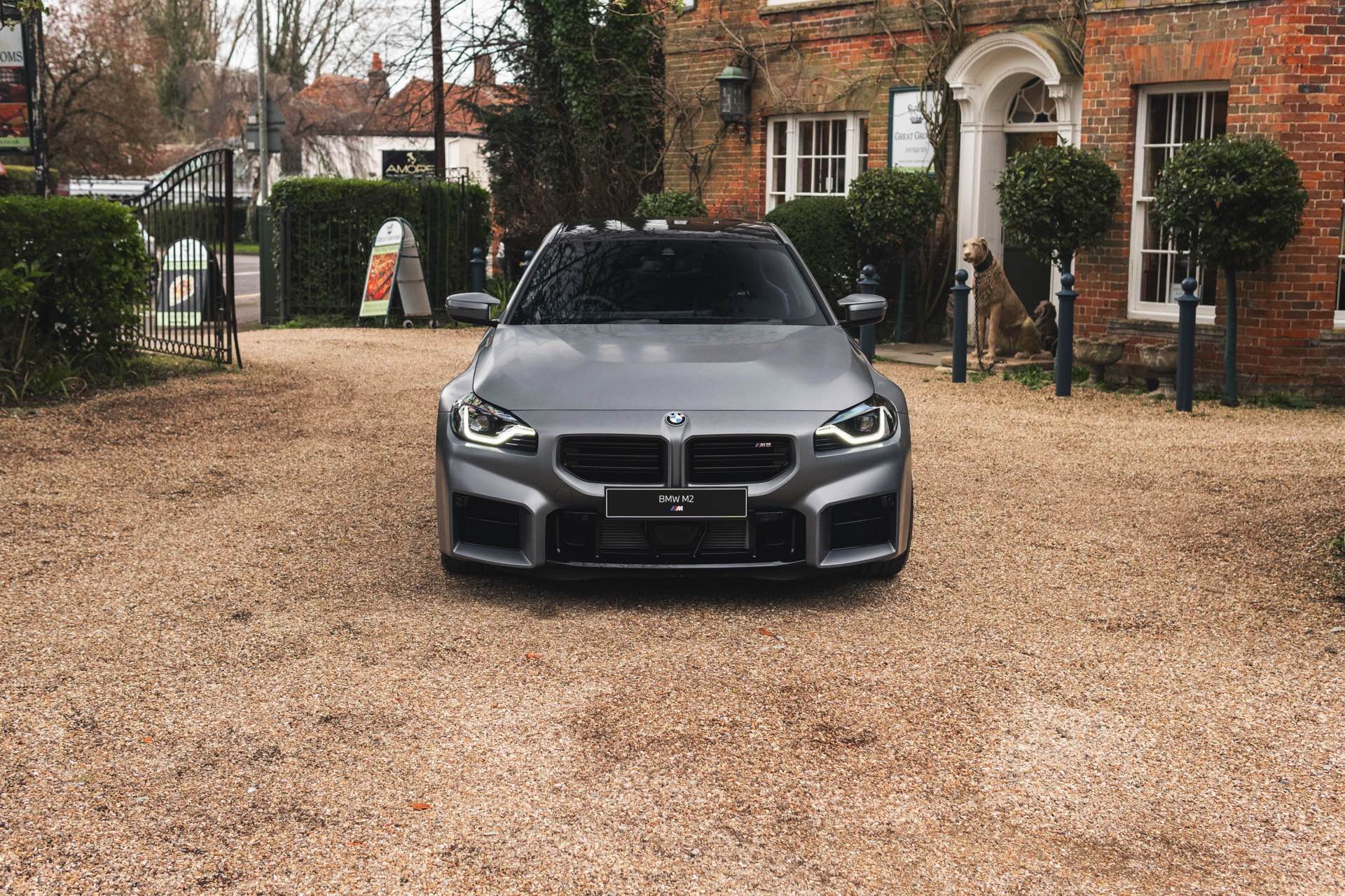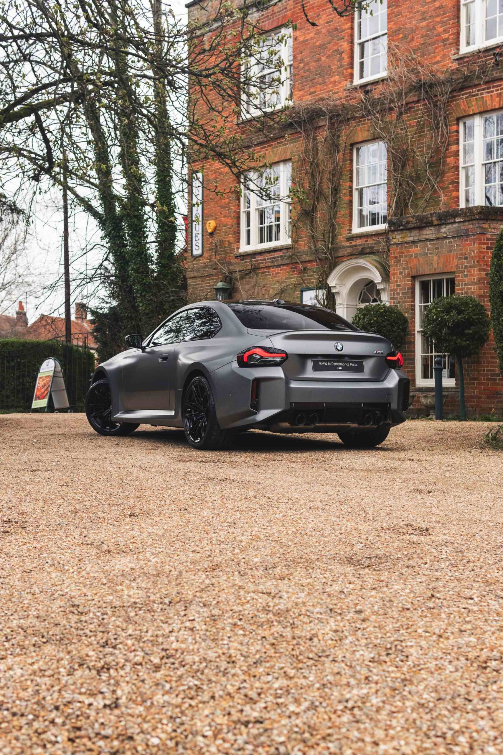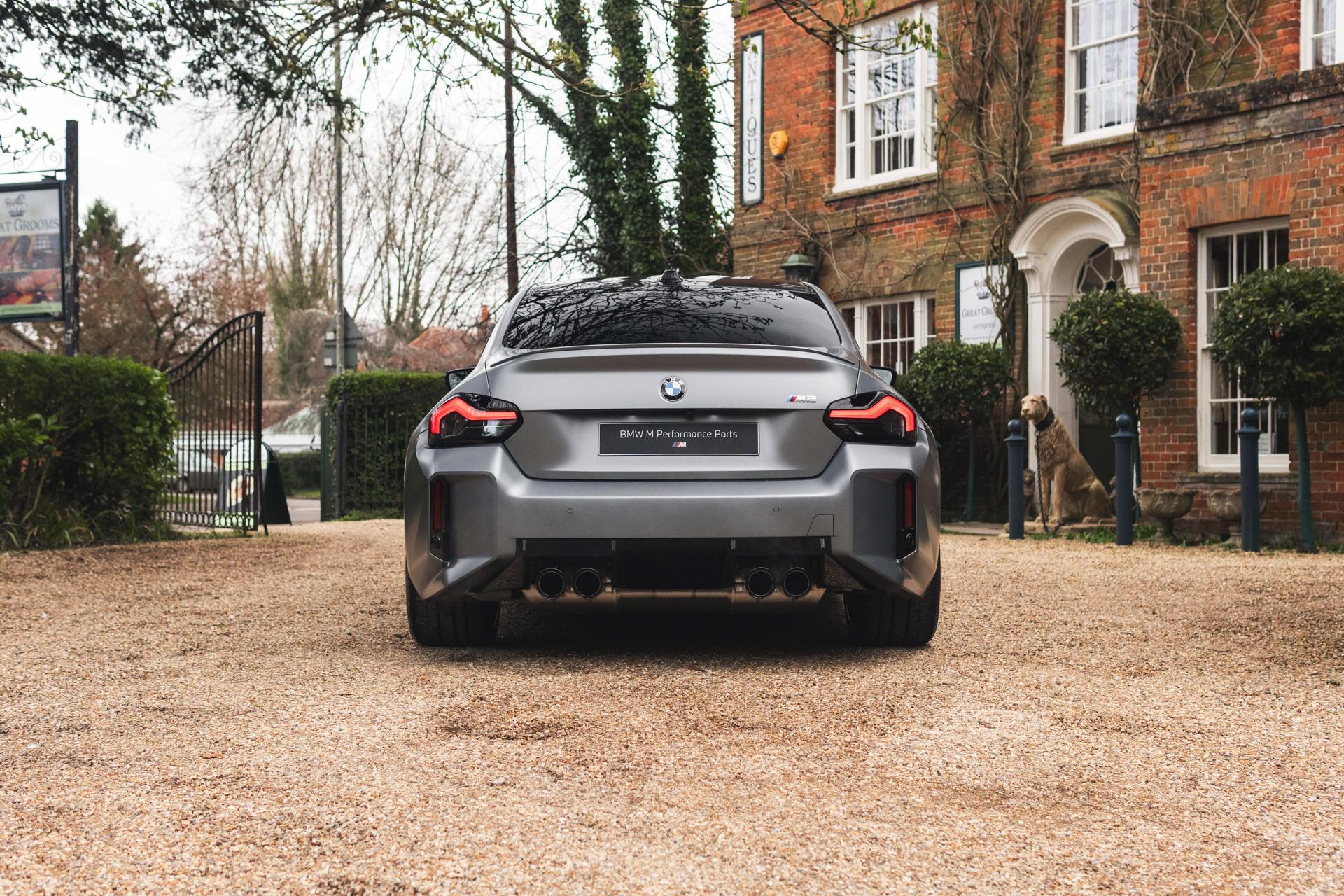 Durch die matte Lackierung in Frozen Pure Grey werden die Formen des BMW M2 zusätzlich betont, vor allem die deutlich verbreiterten Kotflügel kommen so extrem gut zur Geltung. Unter den dicken Backen sehen wir die vorne 19 und hinten 20 Zoll großen Leichtmetallräder Doppelspeiche 930 M, die auf Wunsch auch ab Werk mit Track-Bereifung bestellt werden können. Auf diese Option wurde beim gezeigten G87 verzichtet, aber mit Blick auf wechselhaftes Wetter setzen gerade in England auch besonders sportliche Fahrer auf eine alltagstaugliche Bereifung – und ziehen die Cup-Reifen nur dann auf, wenn sie am Wochenende eine der zahlreichen kleinen Rennstrecken zum Trackday besuchen.
