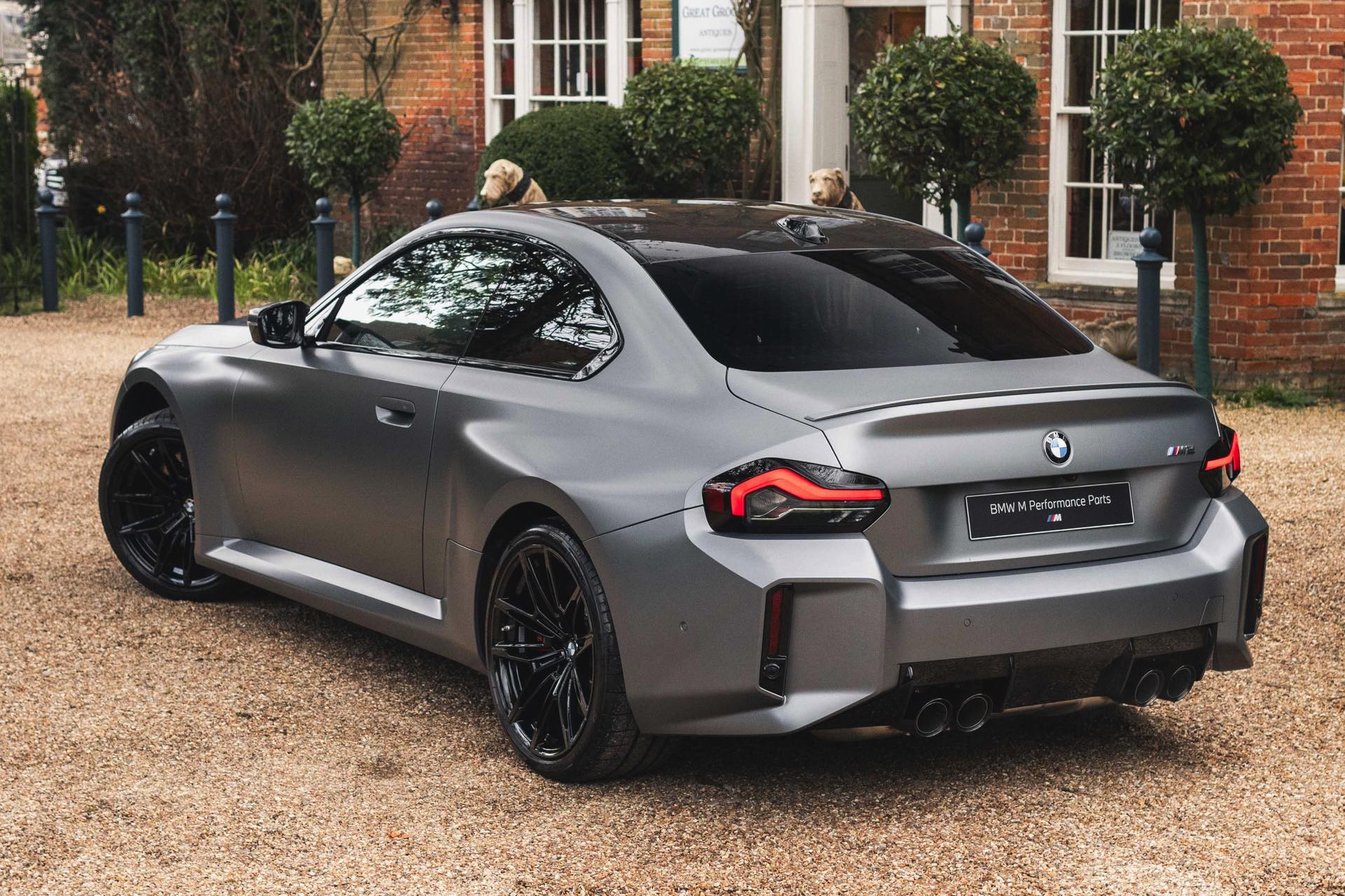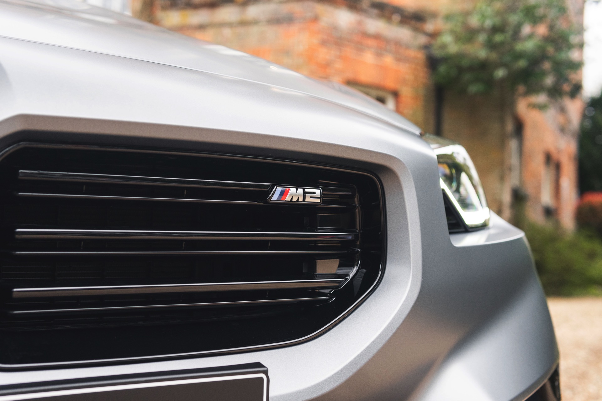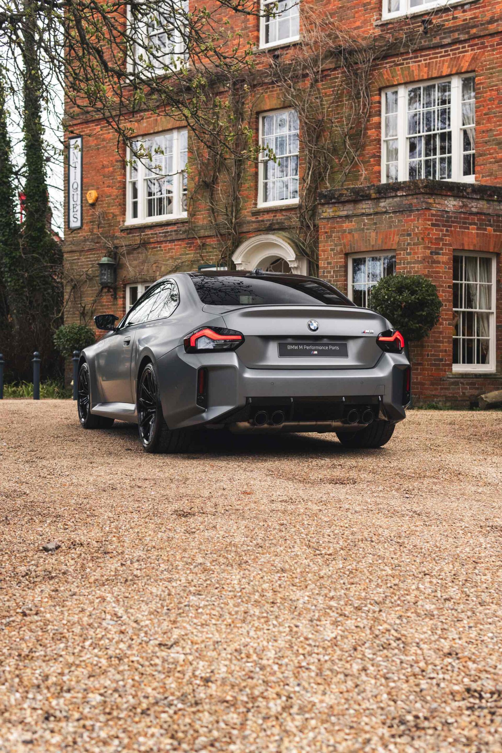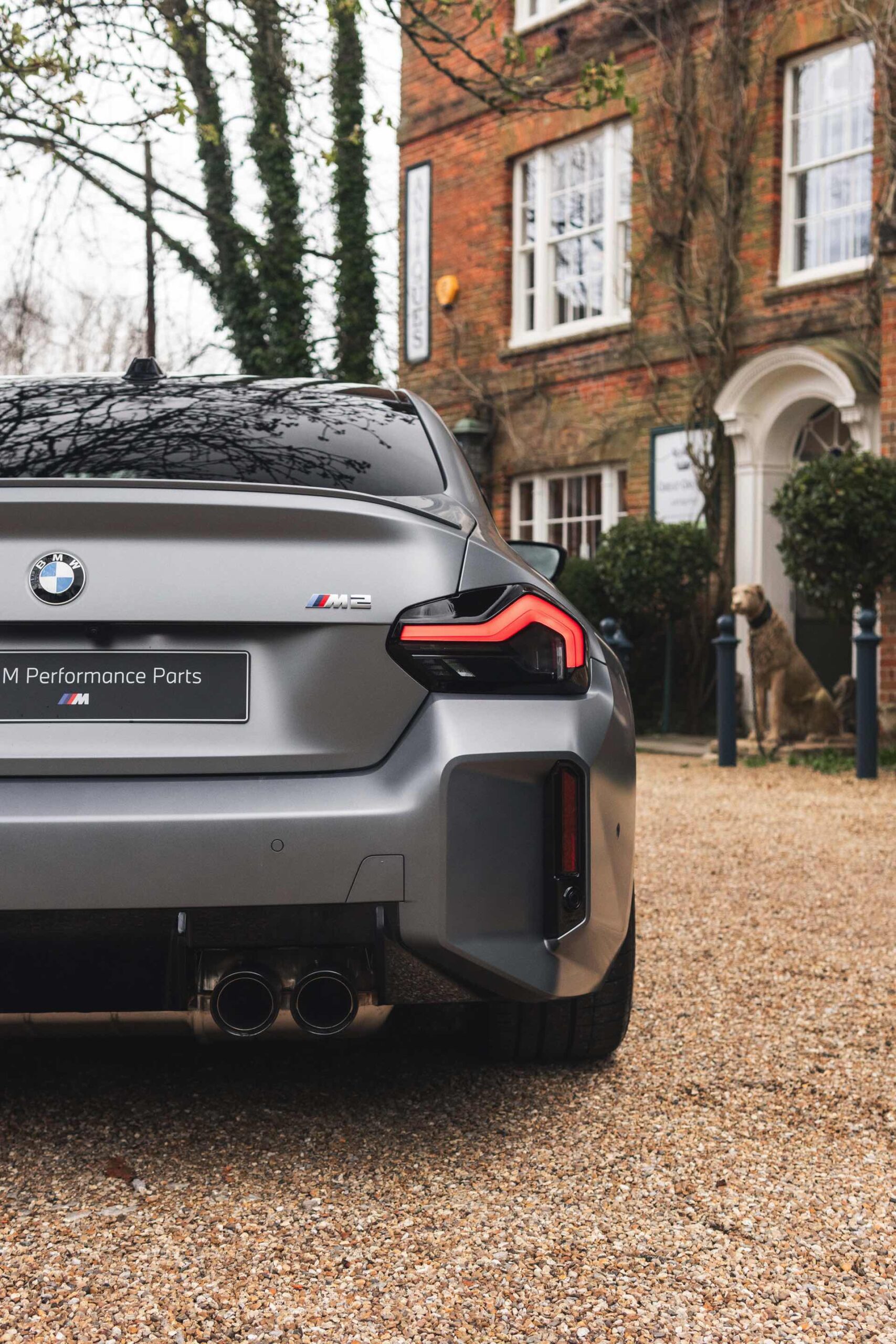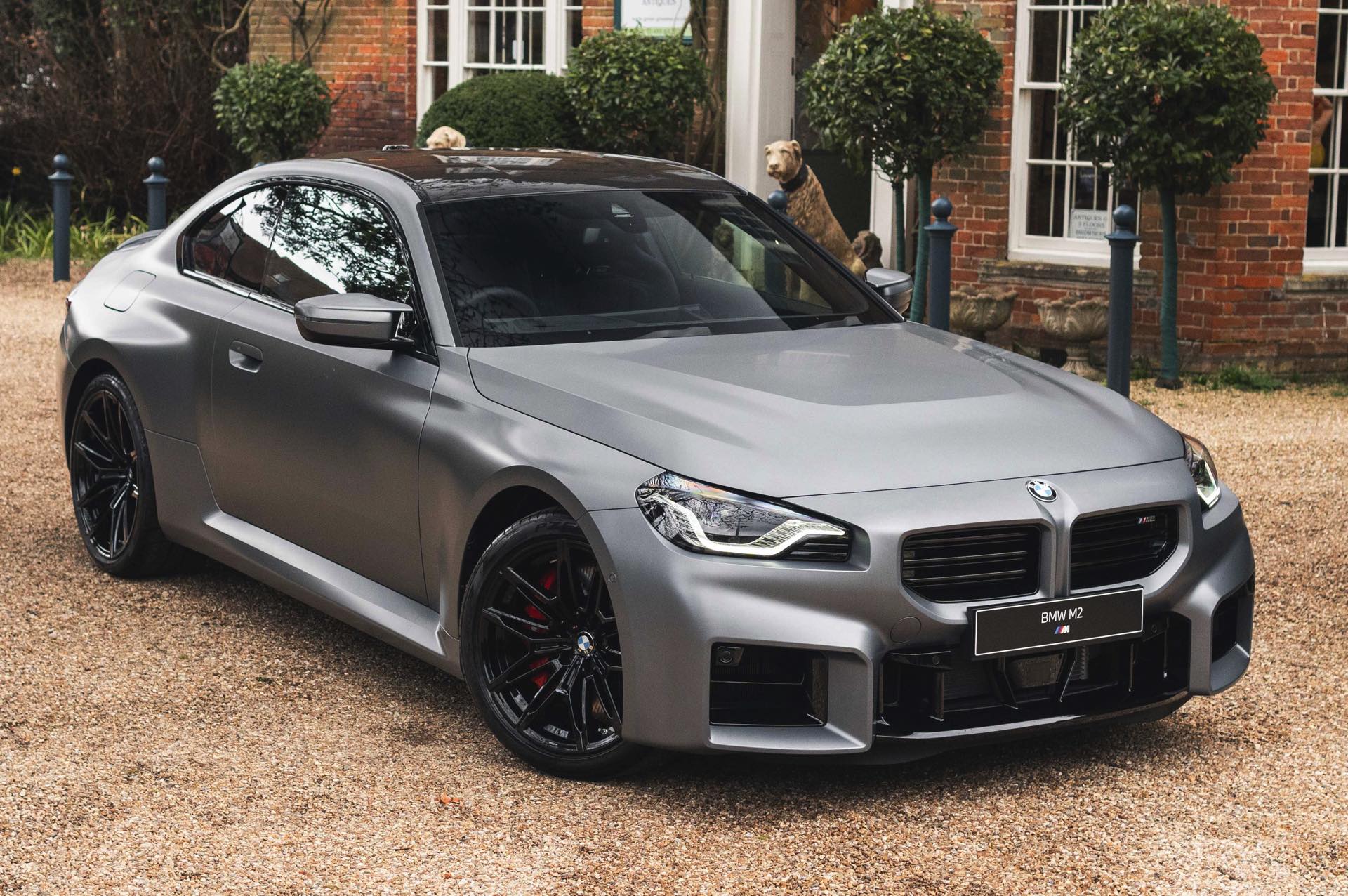 Durch die matte Lackierung in Frozen Pure Grey werden die Formen des BMW M2 zusätzlich betont, vor allem die deutlich verbreiterten Kotflügel kommen so extrem gut zur Geltung. Unter den dicken Backen sehen wir die vorne 19 und hinten 20 Zoll großen Leichtmetallräder Doppelspeiche 930 M, die auf Wunsch auch ab Werk mit Track-Bereifung bestellt werden können. Auf diese Option wurde beim gezeigten G87 verzichtet, aber mit Blick auf wechselhaftes Wetter setzen gerade in England auch besonders sportliche Fahrer auf eine alltagstaugliche Bereifung – und ziehen die Cup-Reifen nur dann auf, wenn sie am Wochenende eine der zahlreichen kleinen Rennstrecken zum Trackday besuchen.