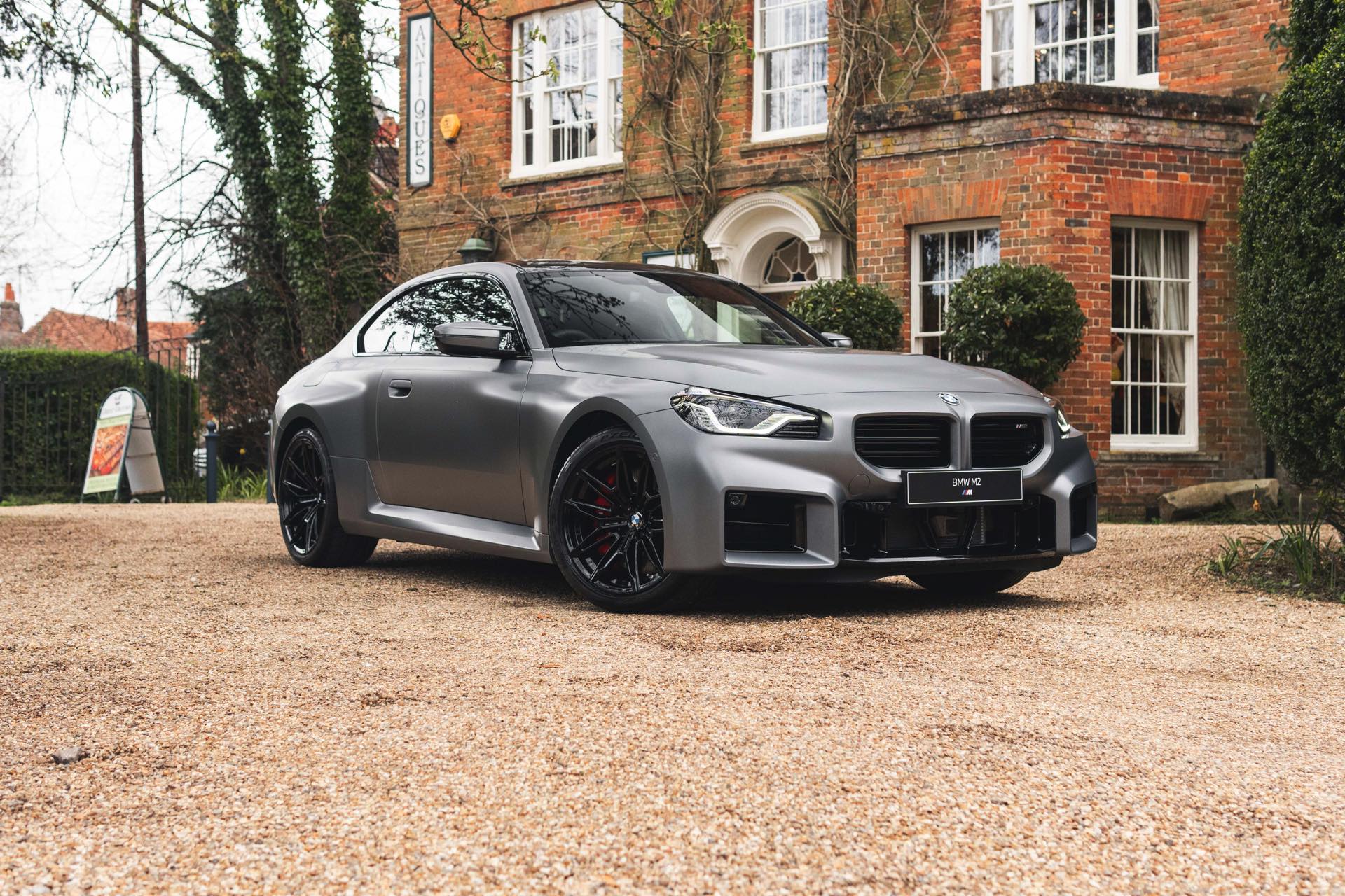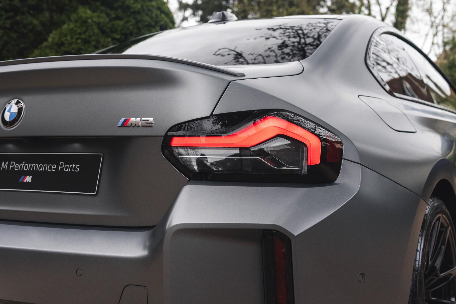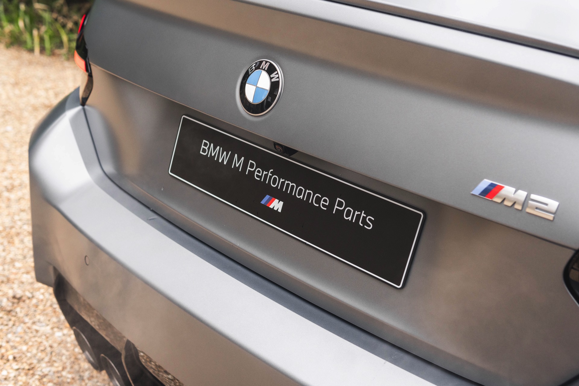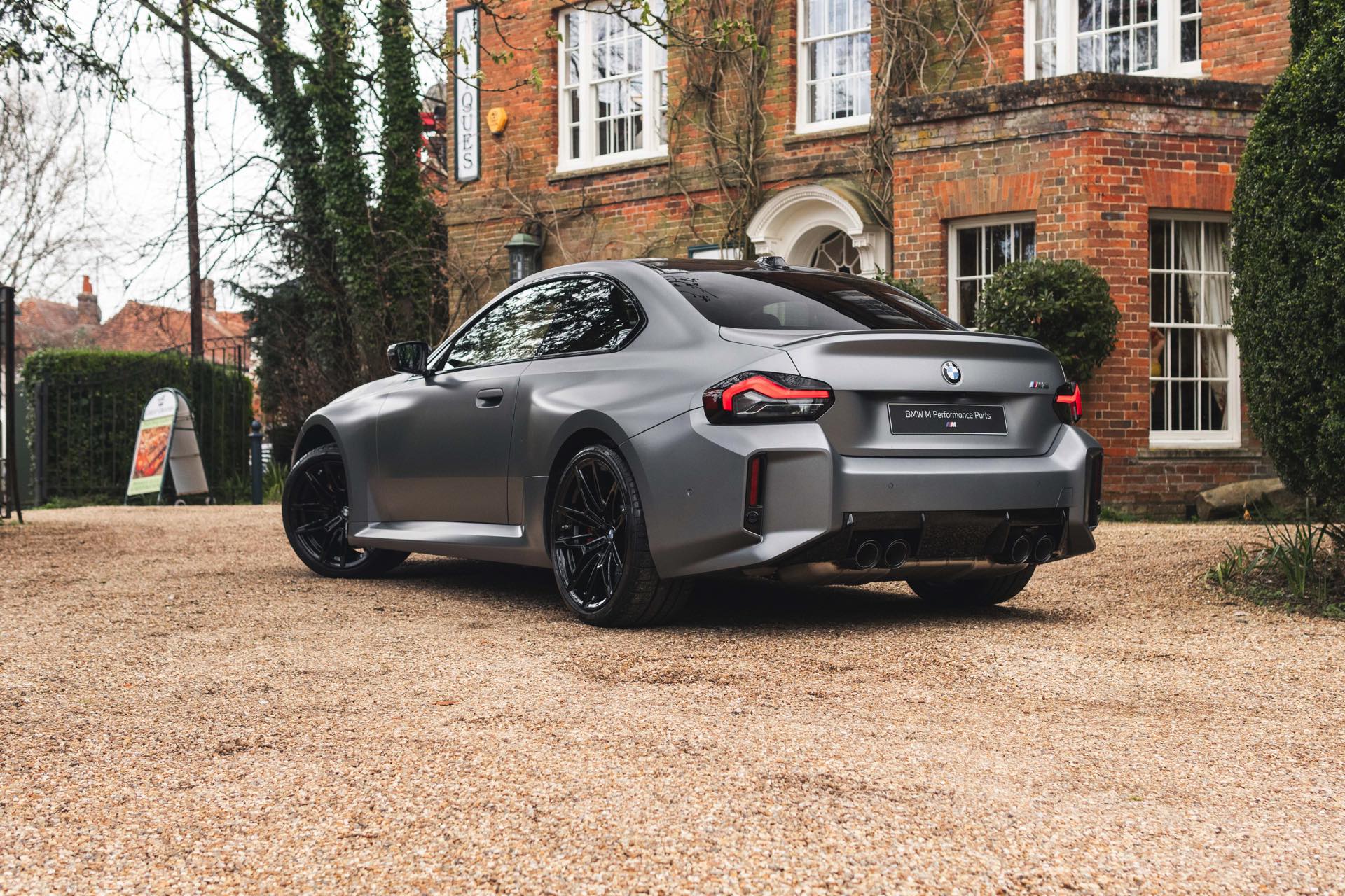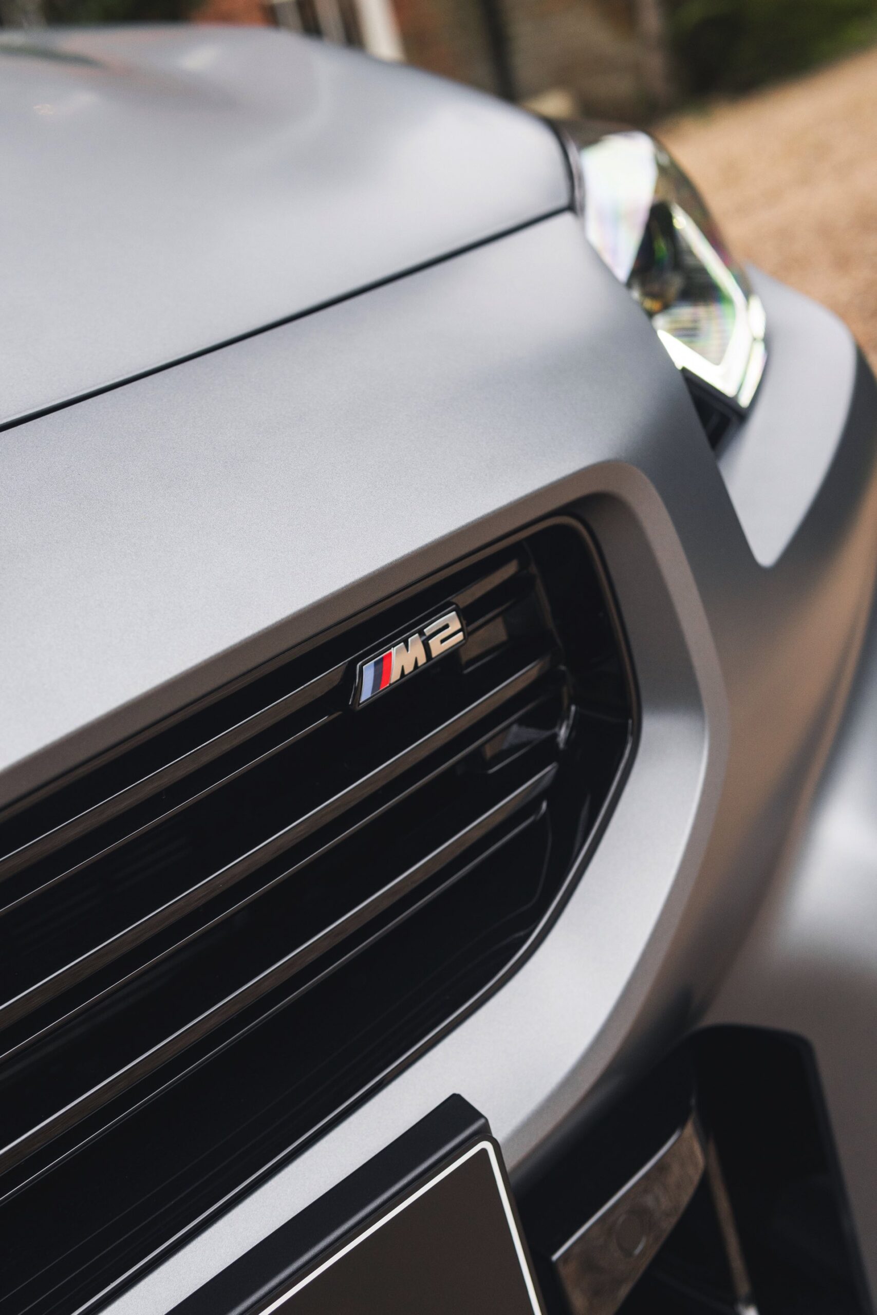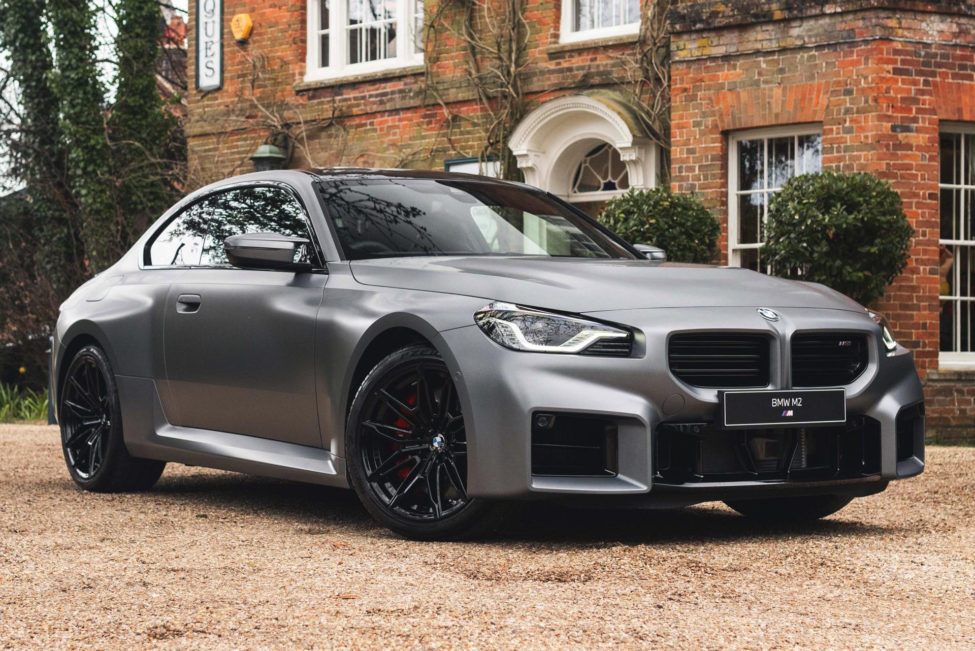 Durch die matte Lackierung in Frozen Pure Grey werden die Formen des BMW M2 zusätzlich betont, vor allem die deutlich verbreiterten Kotflügel kommen so extrem gut zur Geltung. Unter den dicken Backen sehen wir die vorne 19 und hinten 20 Zoll großen Leichtmetallräder Doppelspeiche 930 M, die auf Wunsch auch ab Werk mit Track-Bereifung bestellt werden können. Auf diese Option wurde beim gezeigten G87 verzichtet, aber mit Blick auf wechselhaftes Wetter setzen gerade in England auch besonders sportliche Fahrer auf eine alltagstaugliche Bereifung – und ziehen die Cup-Reifen nur dann auf, wenn sie am Wochenende eine der zahlreichen kleinen Rennstrecken zum Trackday besuchen.