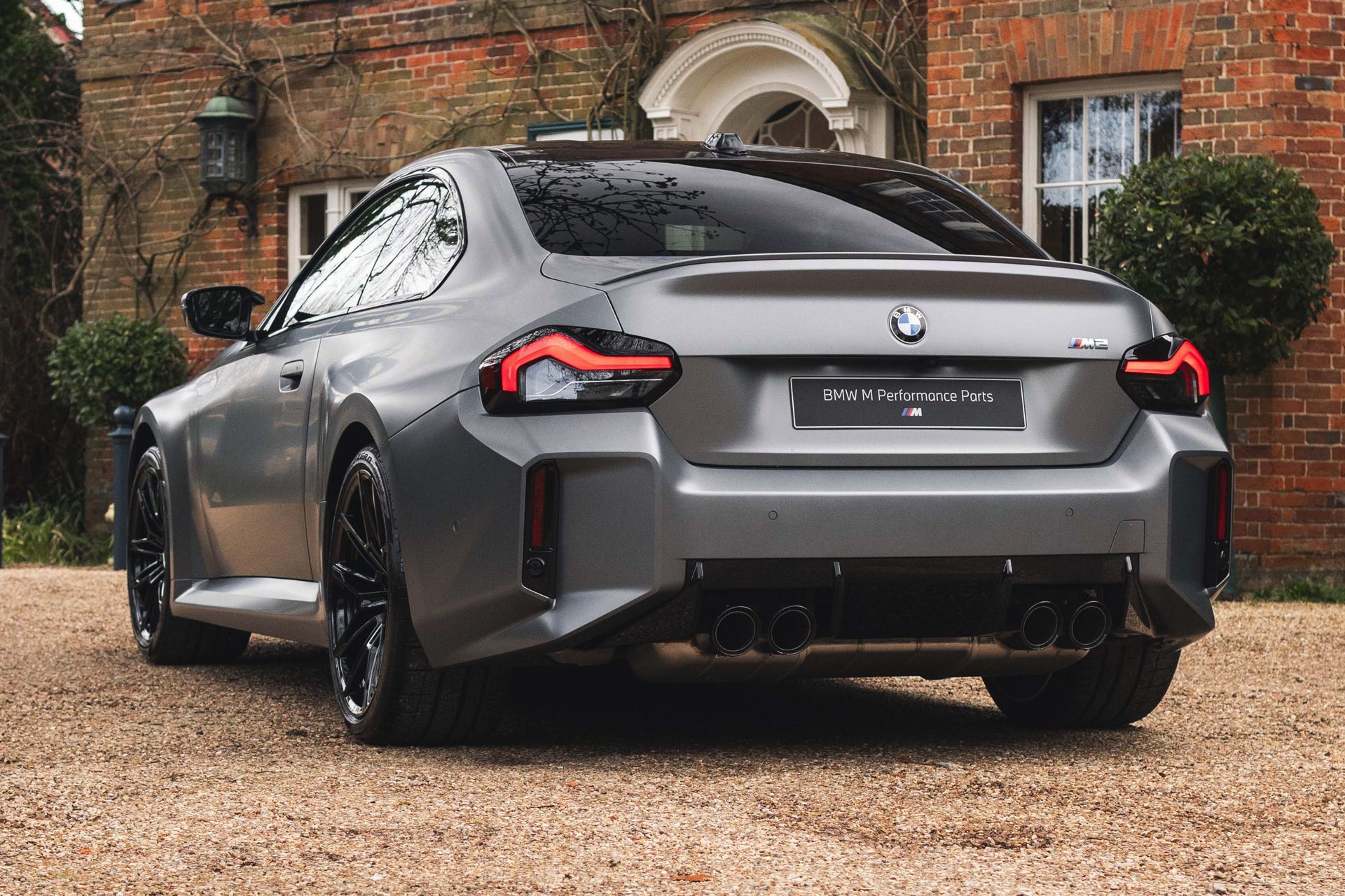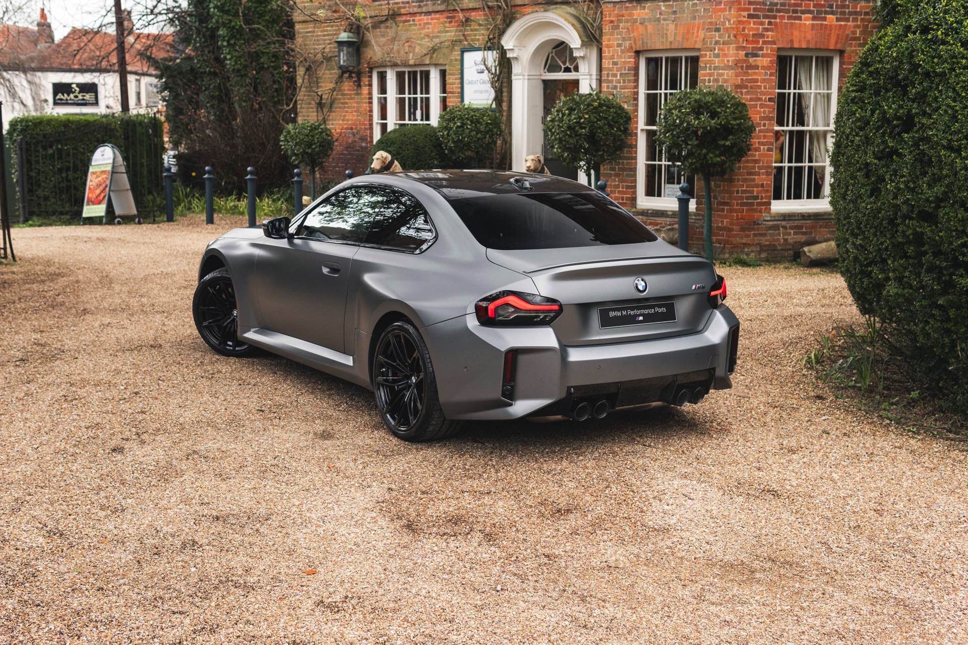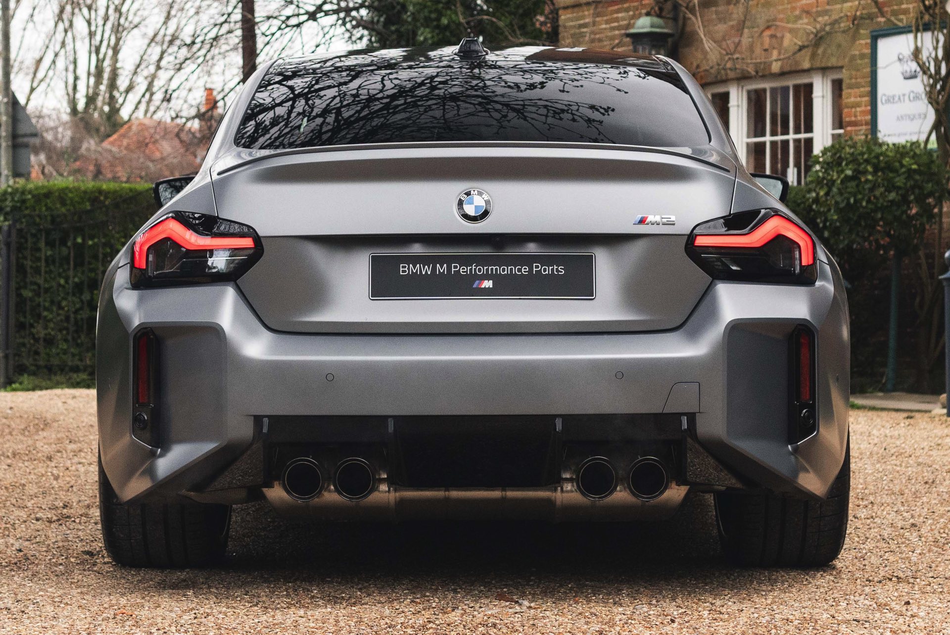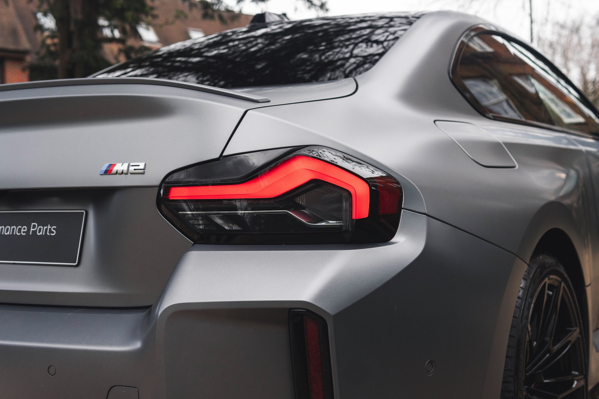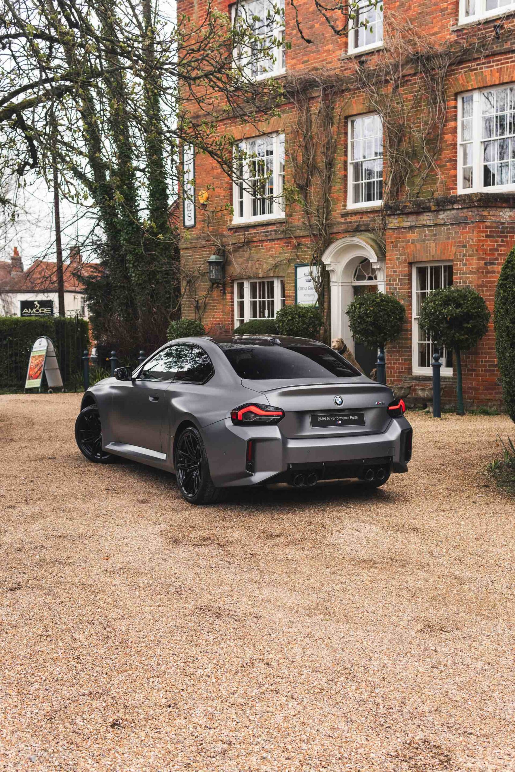 Durch die matte Lackierung in Frozen Pure Grey werden die Formen des BMW M2 zusätzlich betont, vor allem die deutlich verbreiterten Kotflügel kommen so extrem gut zur Geltung. Unter den dicken Backen sehen wir die vorne 19 und hinten 20 Zoll großen Leichtmetallräder Doppelspeiche 930 M, die auf Wunsch auch ab Werk mit Track-Bereifung bestellt werden können. Auf diese Option wurde beim gezeigten G87 verzichtet, aber mit Blick auf wechselhaftes Wetter setzen gerade in England auch besonders sportliche Fahrer auf eine alltagstaugliche Bereifung – und ziehen die Cup-Reifen nur dann auf, wenn sie am Wochenende eine der zahlreichen kleinen Rennstrecken zum Trackday besuchen.