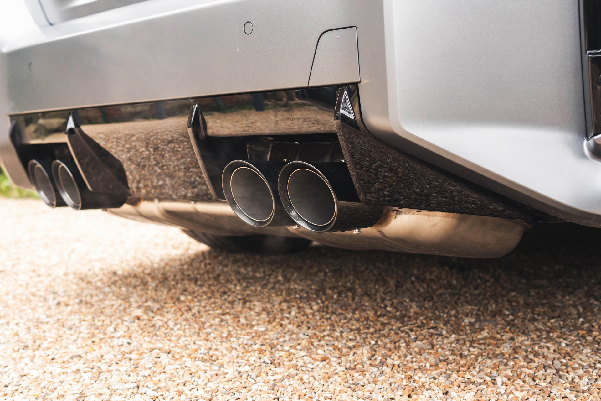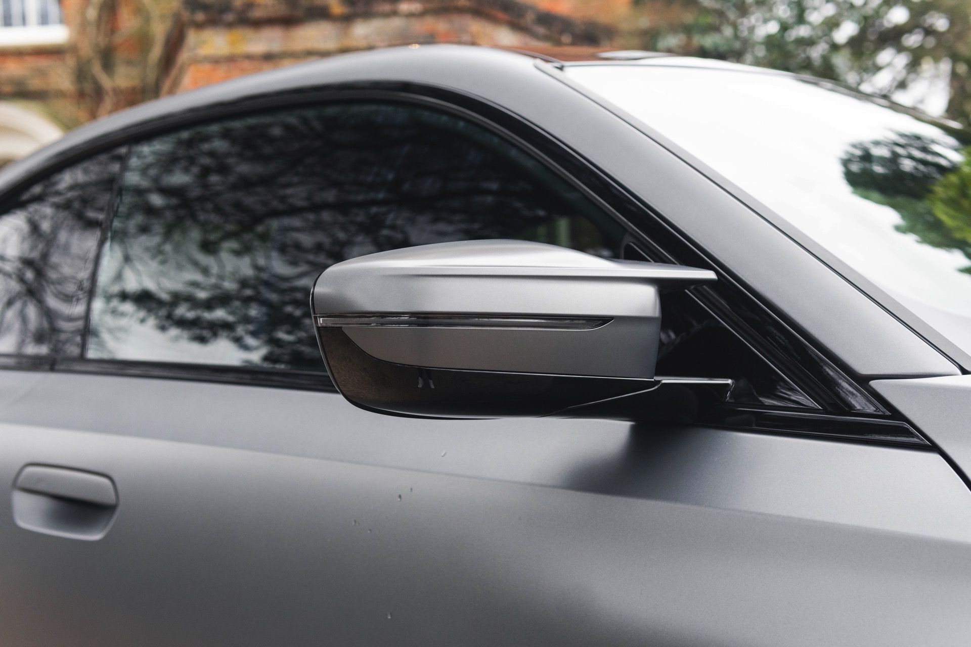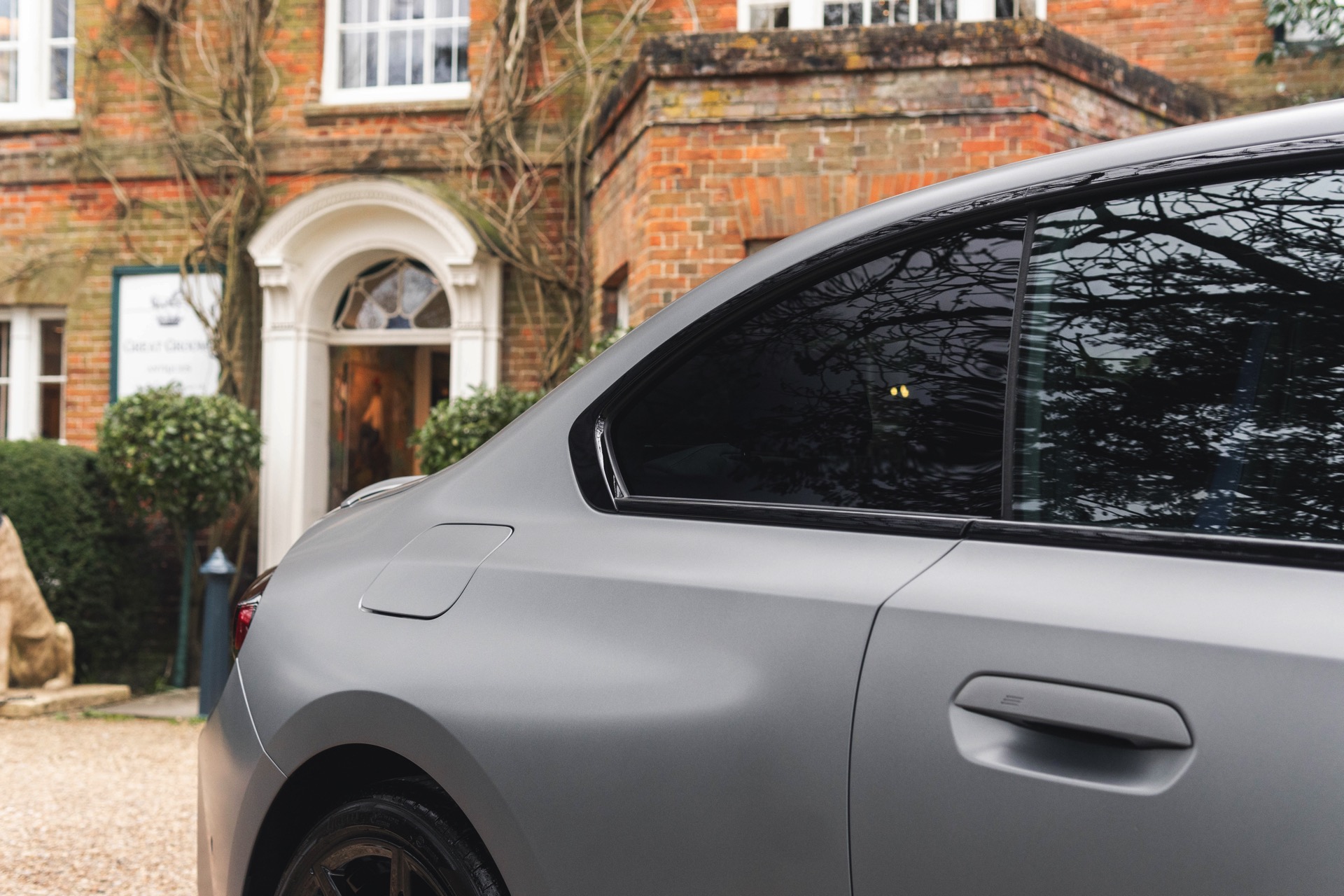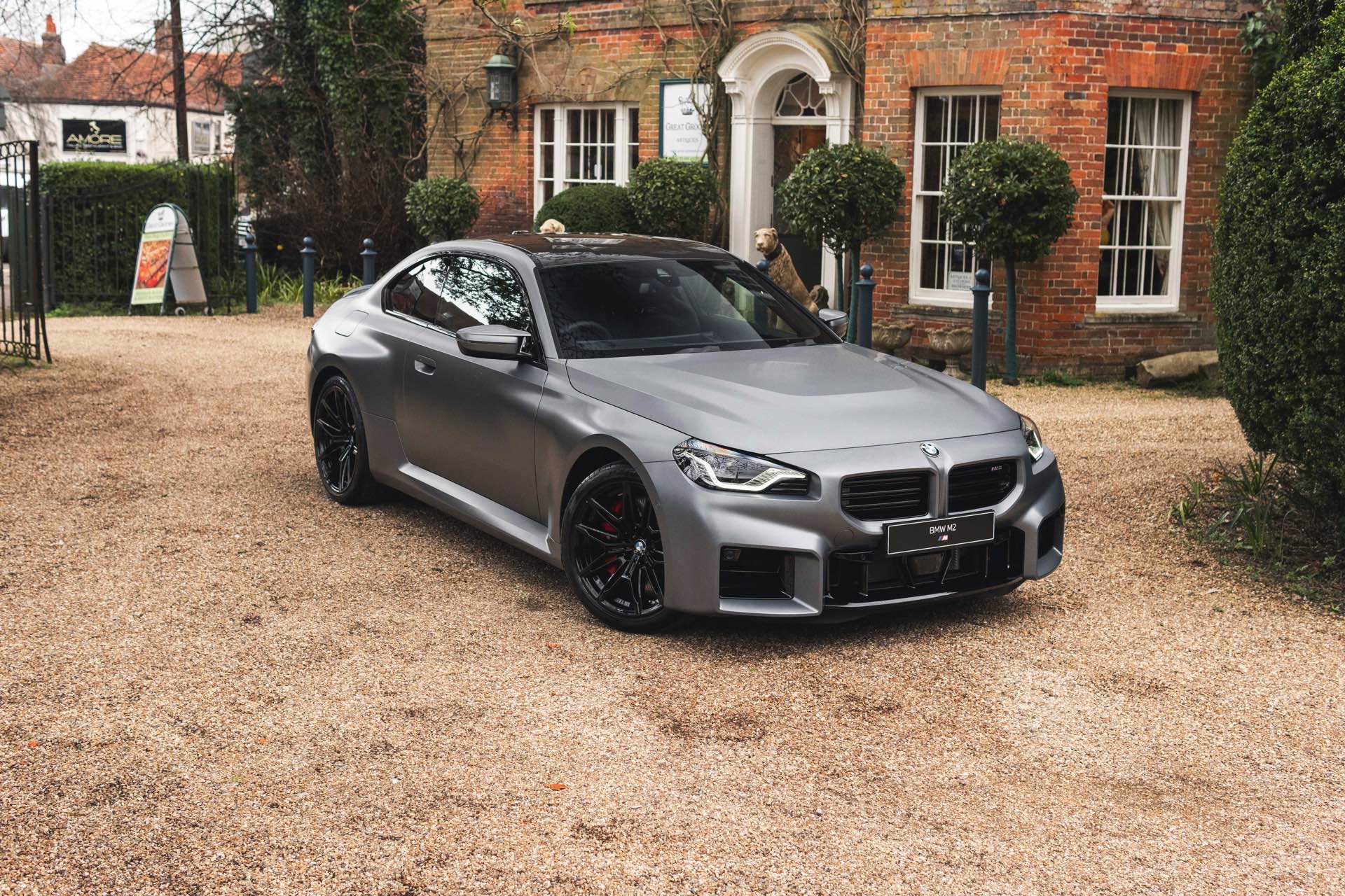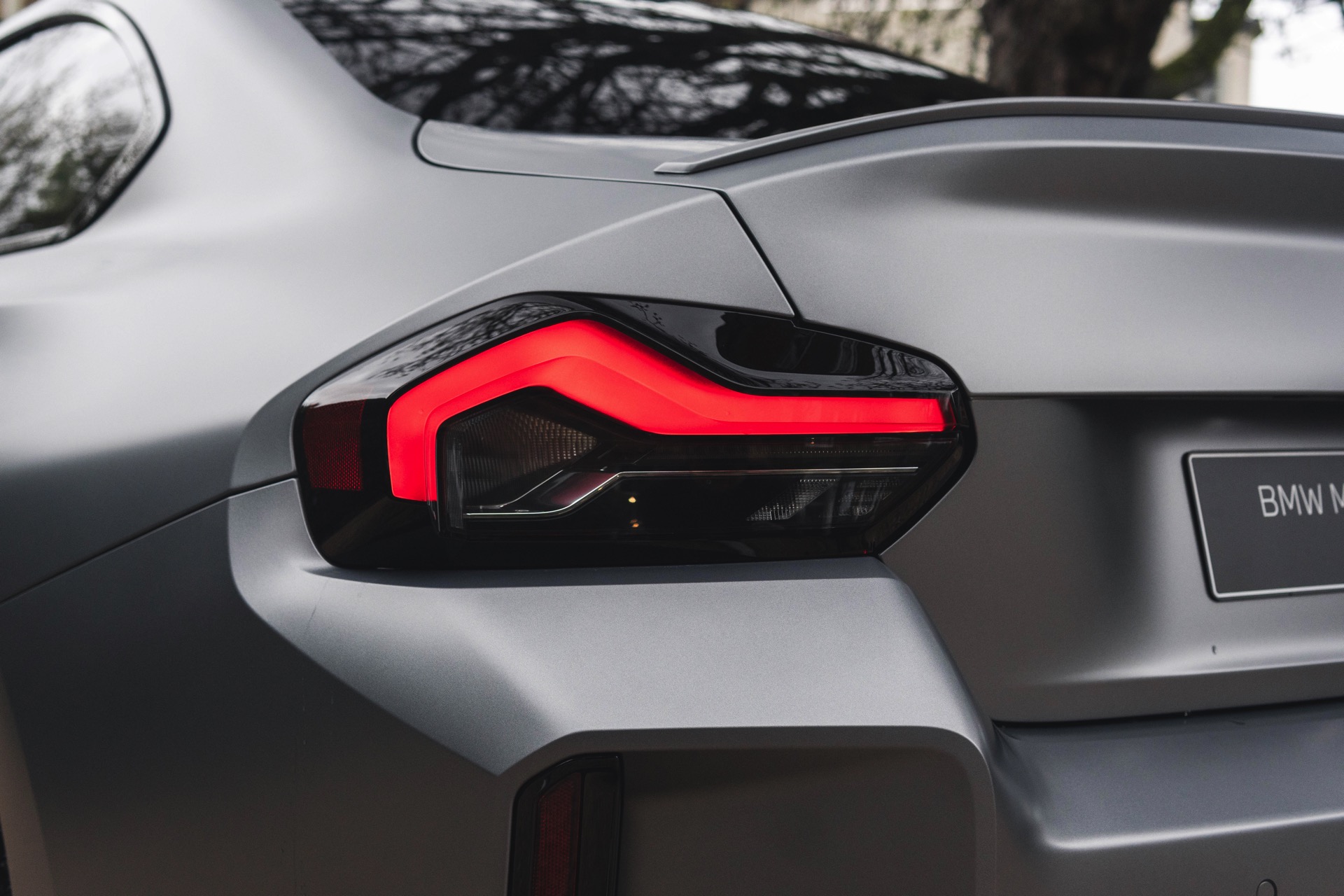 Durch die matte Lackierung in Frozen Pure Grey werden die Formen des BMW M2 zusätzlich betont, vor allem die deutlich verbreiterten Kotflügel kommen so extrem gut zur Geltung. Unter den dicken Backen sehen wir die vorne 19 und hinten 20 Zoll großen Leichtmetallräder Doppelspeiche 930 M, die auf Wunsch auch ab Werk mit Track-Bereifung bestellt werden können. Auf diese Option wurde beim gezeigten G87 verzichtet, aber mit Blick auf wechselhaftes Wetter setzen gerade in England auch besonders sportliche Fahrer auf eine alltagstaugliche Bereifung – und ziehen die Cup-Reifen nur dann auf, wenn sie am Wochenende eine der zahlreichen kleinen Rennstrecken zum Trackday besuchen.