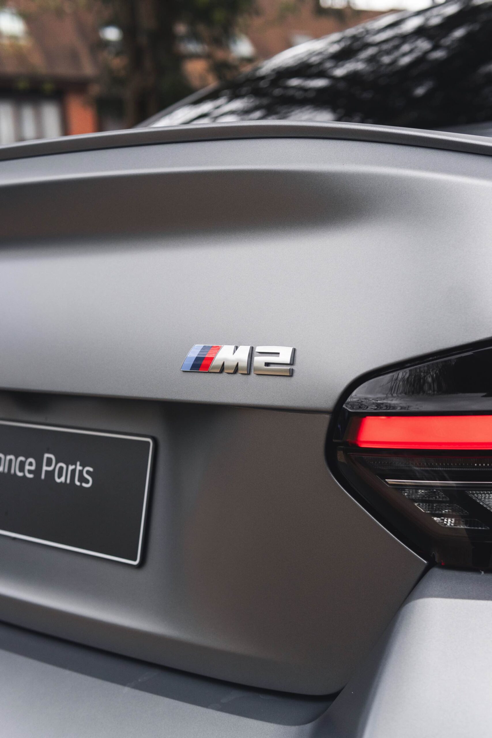 Durch die matte Lackierung in Frozen Pure Grey werden die Formen des BMW M2 zusätzlich betont, vor allem die deutlich verbreiterten Kotflügel kommen so extrem gut zur Geltung. Unter den dicken Backen sehen wir die vorne 19 und hinten 20 Zoll großen Leichtmetallräder Doppelspeiche 930 M, die auf Wunsch auch ab Werk mit Track-Bereifung bestellt werden können. Auf diese Option wurde beim gezeigten G87 verzichtet, aber mit Blick auf wechselhaftes Wetter setzen gerade in England auch besonders sportliche Fahrer auf eine alltagstaugliche Bereifung – und ziehen die Cup-Reifen nur dann auf, wenn sie am Wochenende eine der zahlreichen kleinen Rennstrecken zum Trackday besuchen. "