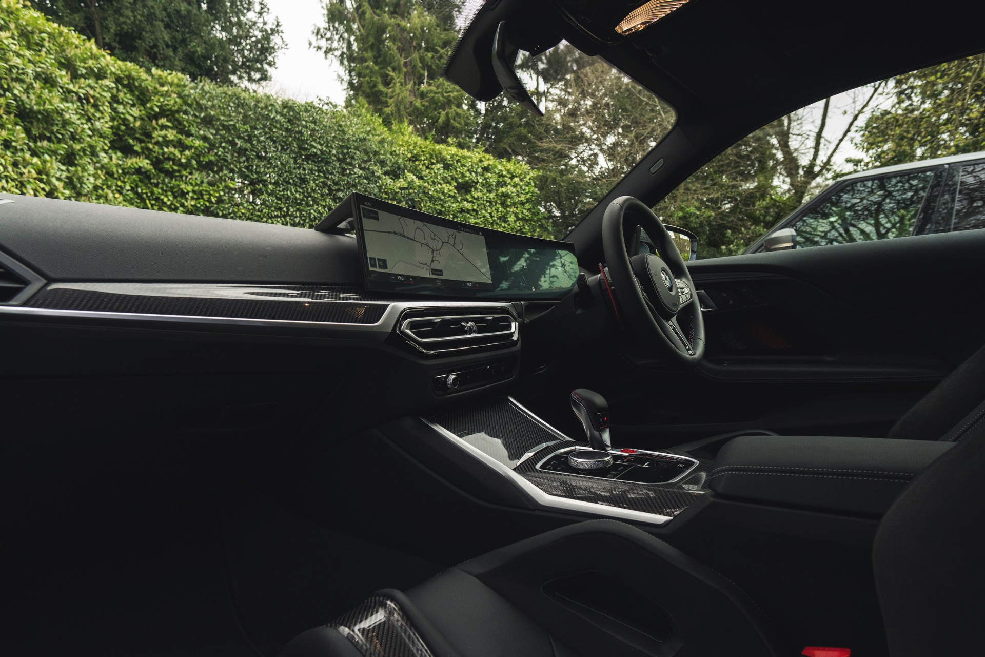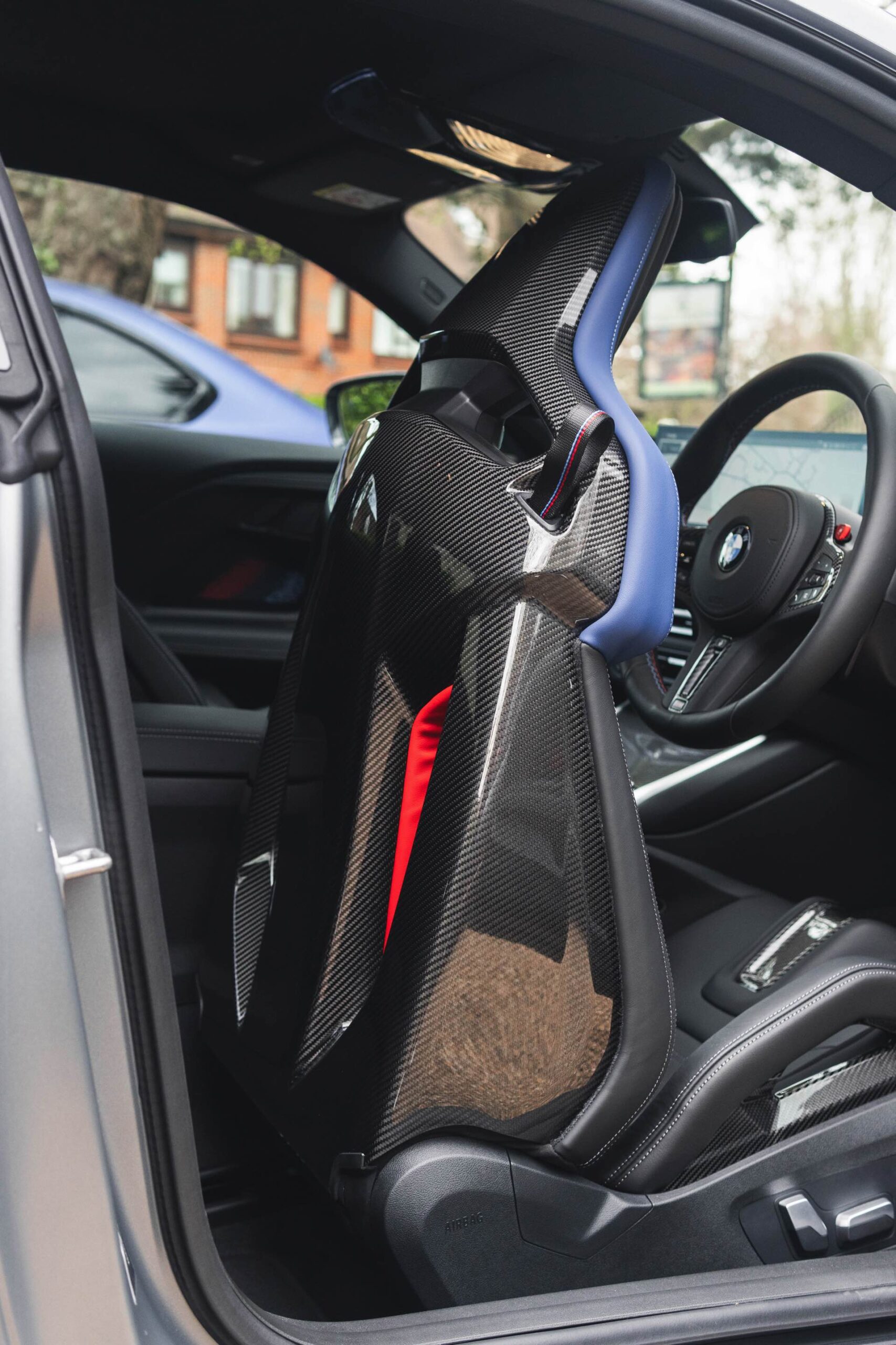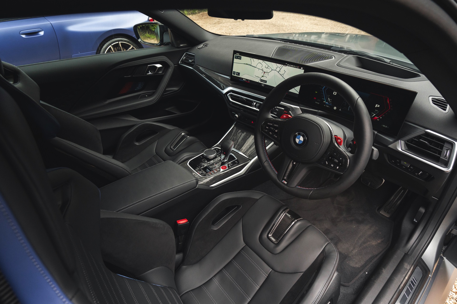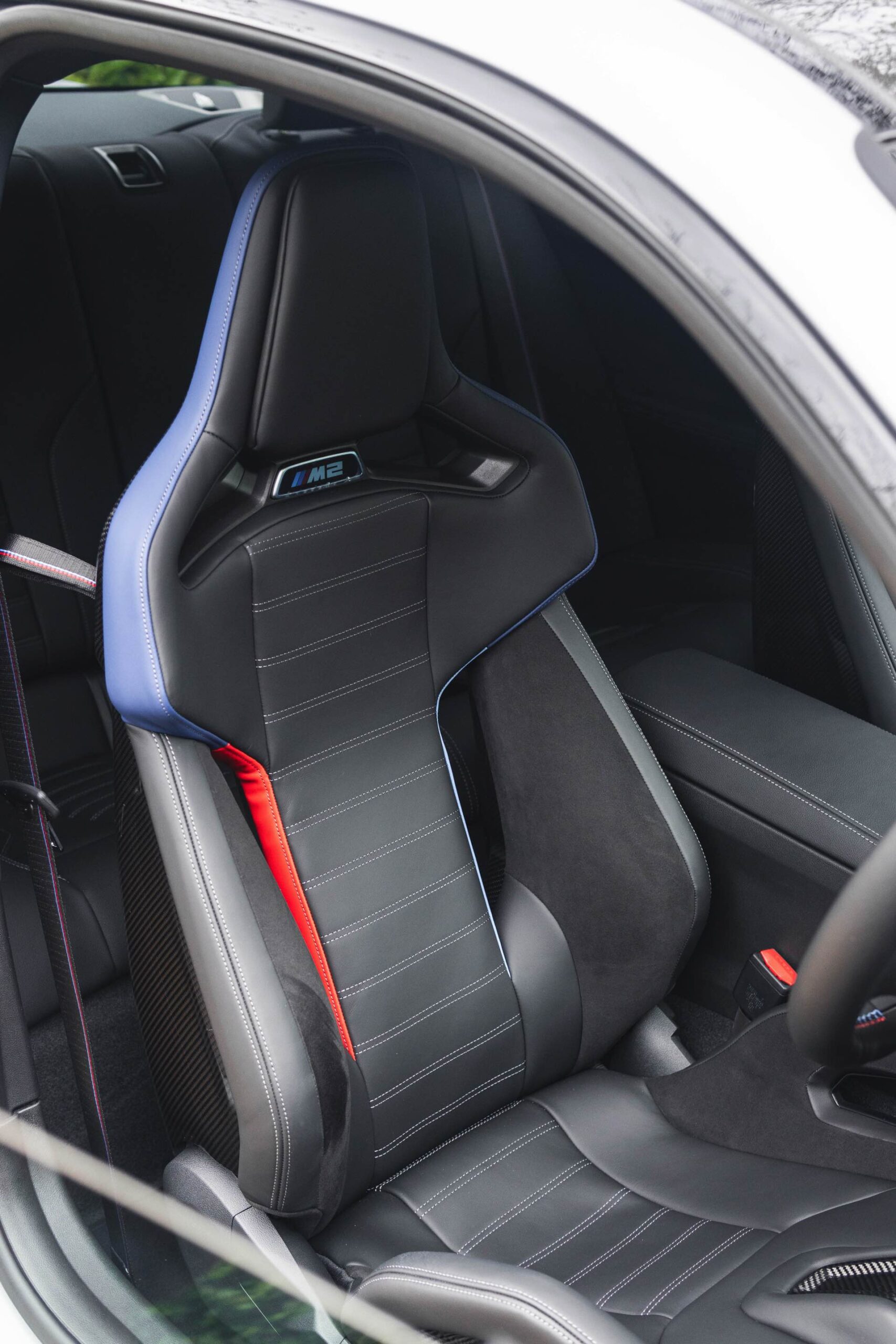 Genau wie beim Dach spielt Carbon auch im Innenraum eine wichtige Rolle: Der BMW M2 aus dem Showroom des BMW-Händlers Dick Lovett im Südwesten Englands wurde von Andrew Barker konfiguriert und ist mit den Interieurleisten ‘Carbon Fibre’ und sogar mit den optionalen M Carbon Schalensitzen ausgestattet. Letztere sind nur als Bestandteil des M Race Track-Pakets bestellbar. Die Schalensitze bieten nicht nur jede Menge Halt und sorgen mit Elementen in M-Farben und beleuchtetem M2-Logo für einen sportlichen Touch, sie eignen sich dank ihrer Öffnungen auch zur Installation von Mehrpunkt-Gurten für den Rennstrecken-Einsatz.