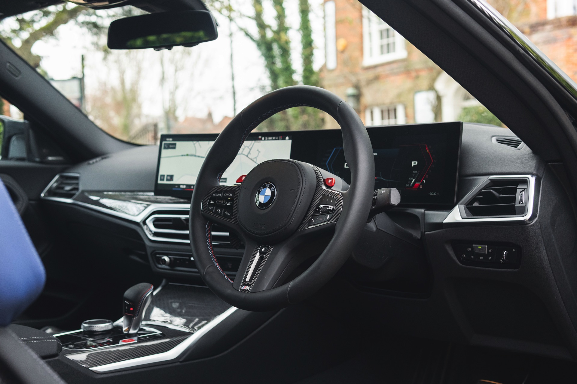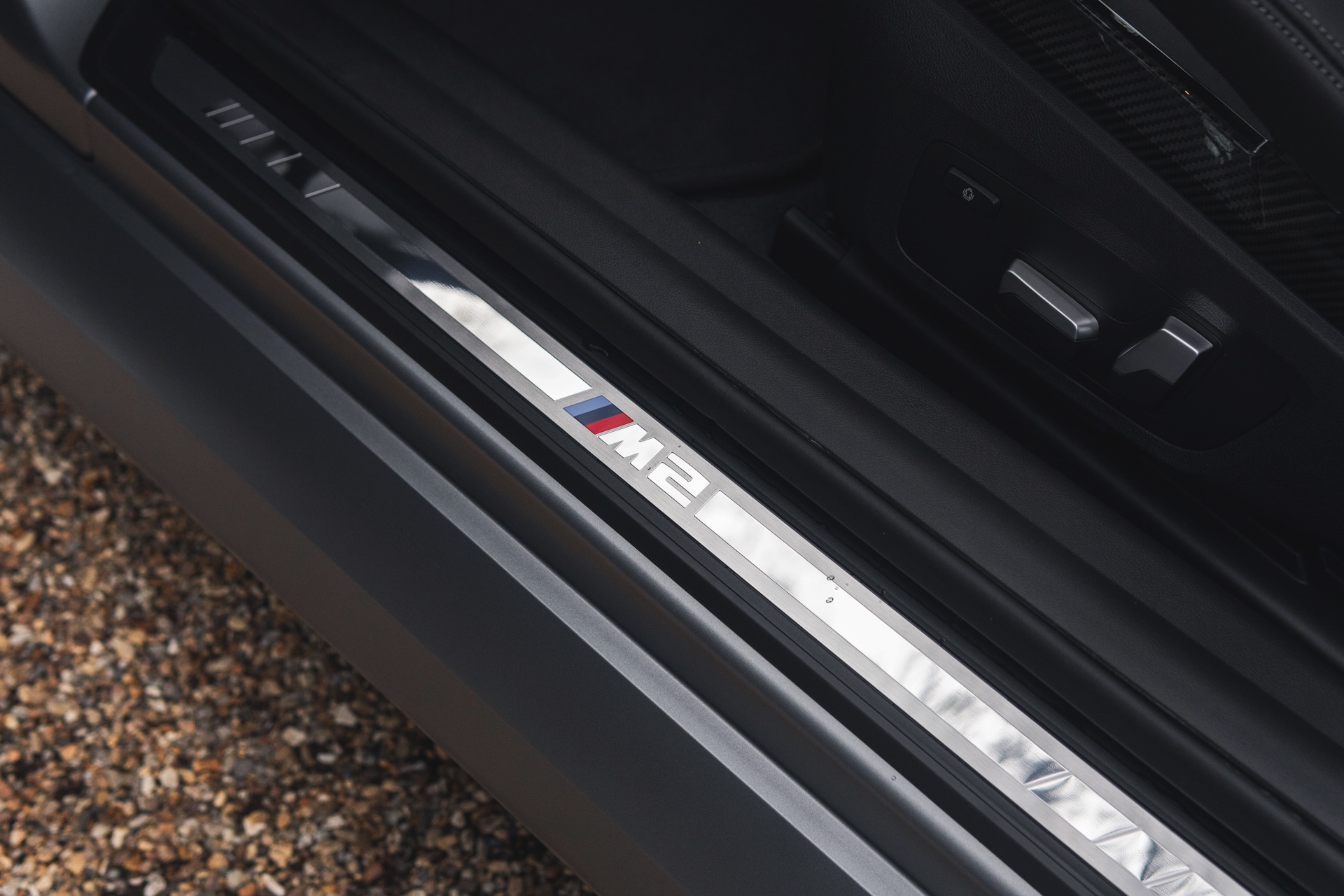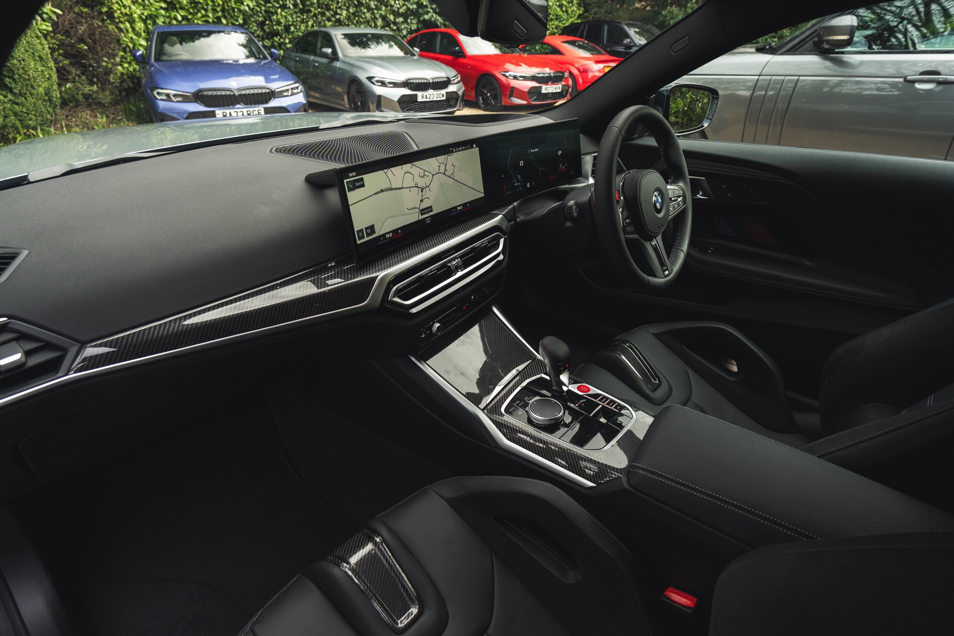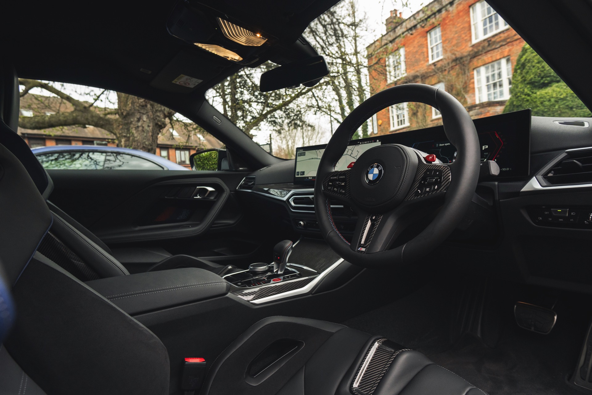 Genau wie beim Dach spielt Carbon auch im Innenraum eine wichtige Rolle: Der BMW M2 aus dem Showroom des BMW-Händlers Dick Lovett im Südwesten Englands wurde von Andrew Barker konfiguriert und ist mit den Interieurleisten ‘Carbon Fibre’ und sogar mit den optionalen M Carbon Schalensitzen ausgestattet. Letztere sind nur als Bestandteil des M Race Track-Pakets bestellbar. Die Schalensitze bieten nicht nur jede Menge Halt und sorgen mit Elementen in M-Farben und beleuchtetem M2-Logo für einen sportlichen Touch, sie eignen sich dank ihrer Öffnungen auch zur Installation von Mehrpunkt-Gurten für den Rennstrecken-Einsatz.
