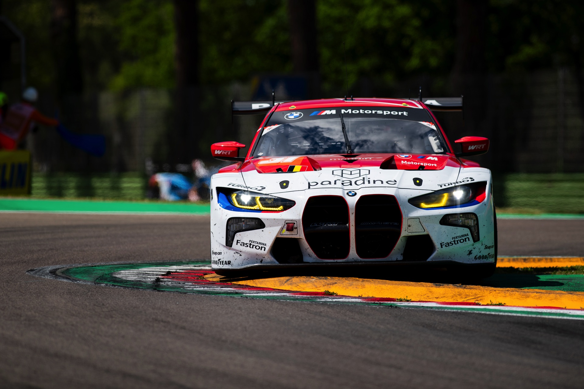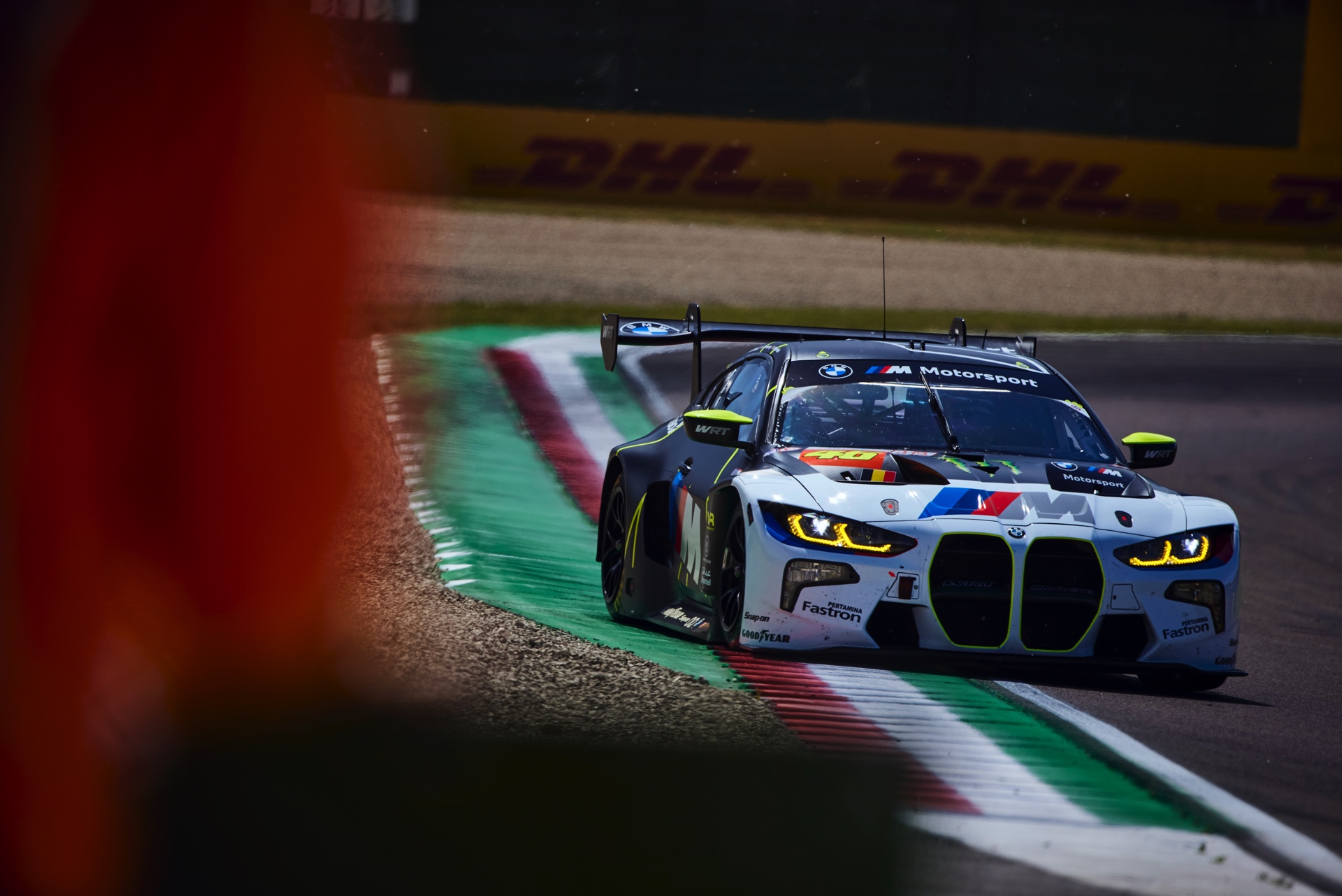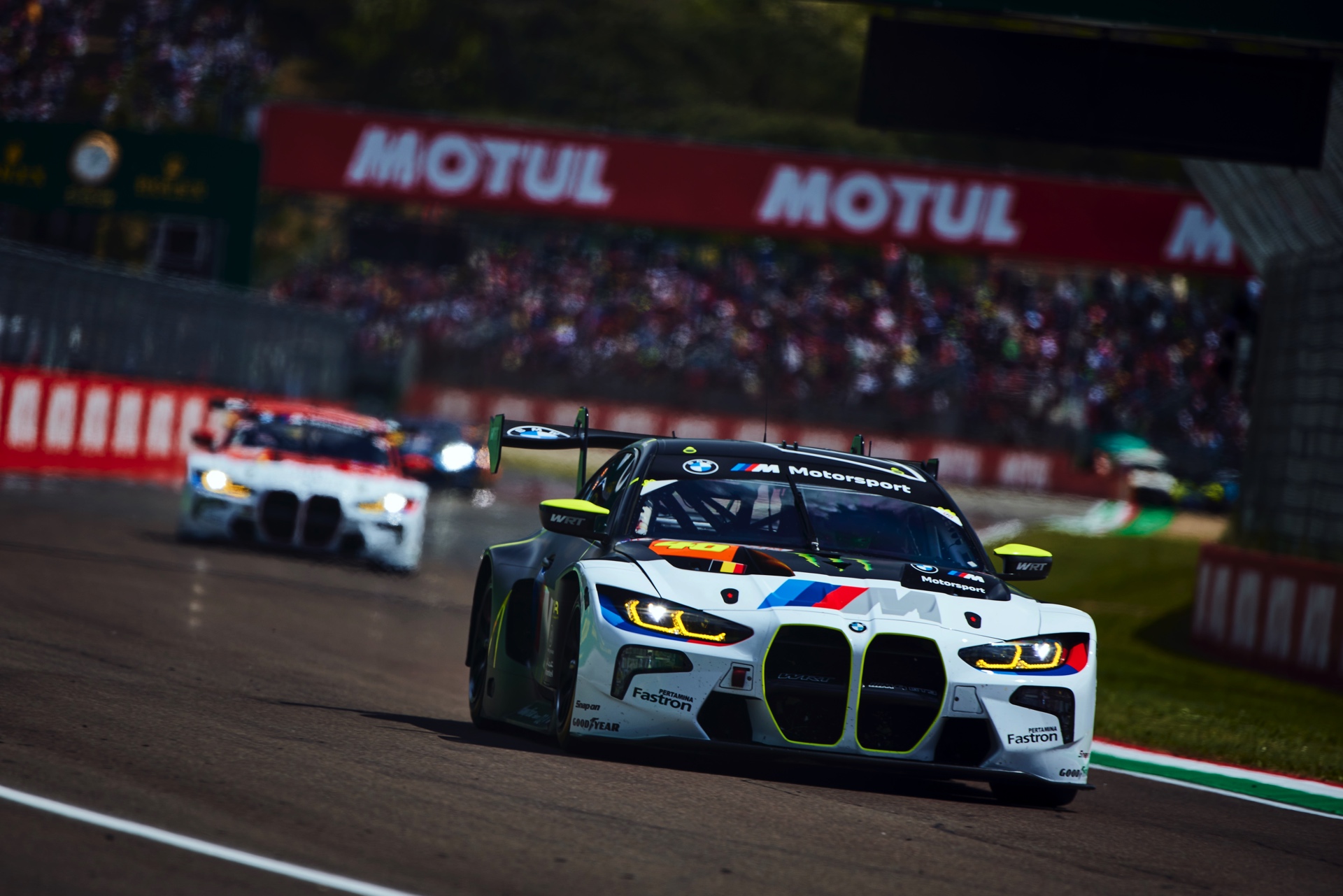 Für Valentino Rossi war das Heimspiel – sein Geburtsort Urbino liegt nur zwei Autostunden Fahrtzeit von Imola entfernt – das nächste Ausrufezeichen seiner noch jungen GT3-Karriere. Beim Saisonauftakt in Katar hatte der BMW M4 GT3 mit der Nummer 46 das Podium noch haarscharf verpasst, aber unter dem Jubel der Tifosi durfte sich Rossi nun wieder aufs Treppchen stellen. Beide BMW profitierten vom Mut der Fahrer, die sich trotz gelegentlicher Regenschauer für Slick-Bereifung entschieden und damit offenbar die unterm Strich bessere Entscheidung trafen: Was auf nassem Asphalt etwas Zeit kostete, war auf trockener Strecke ein klarer Vorteil.
