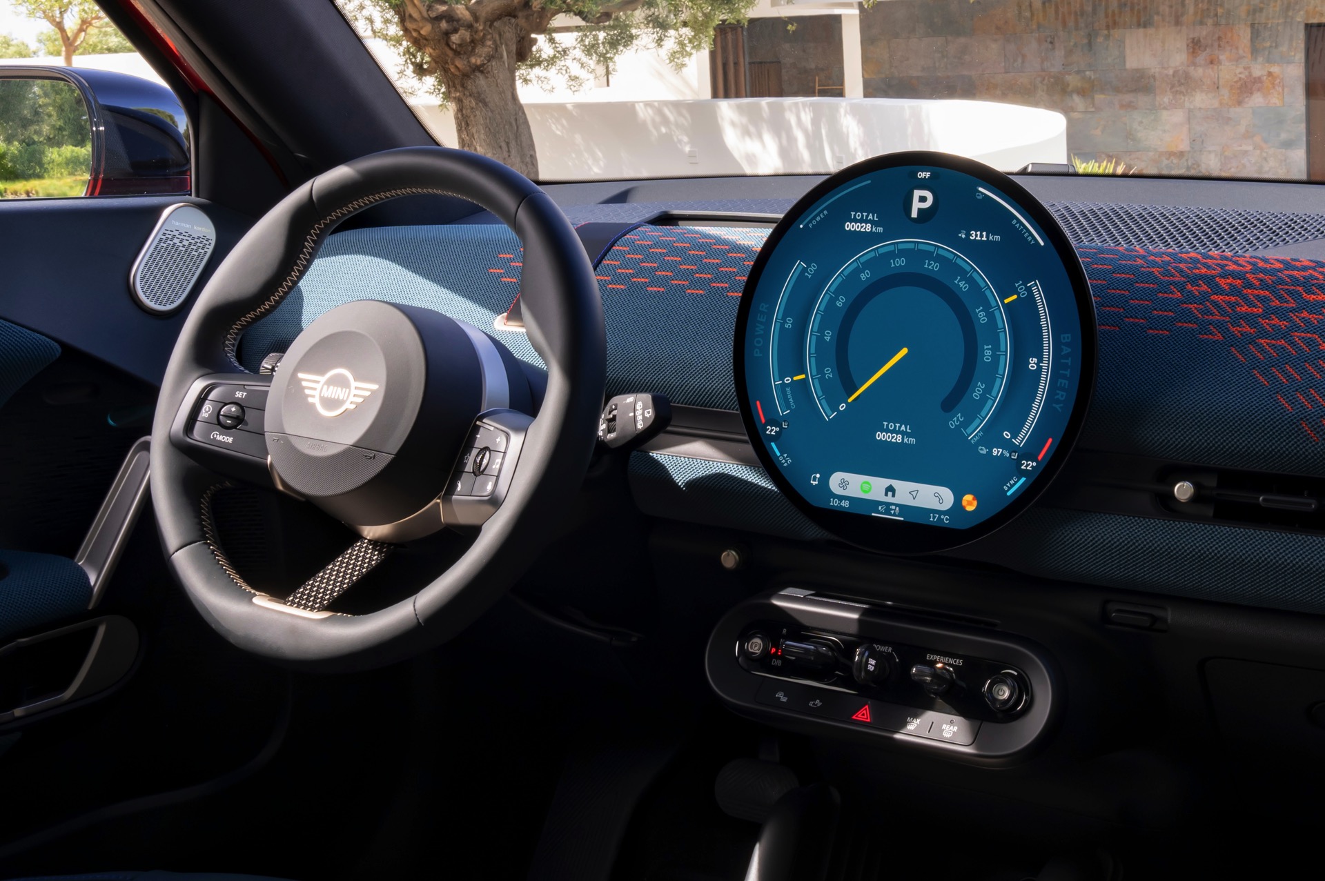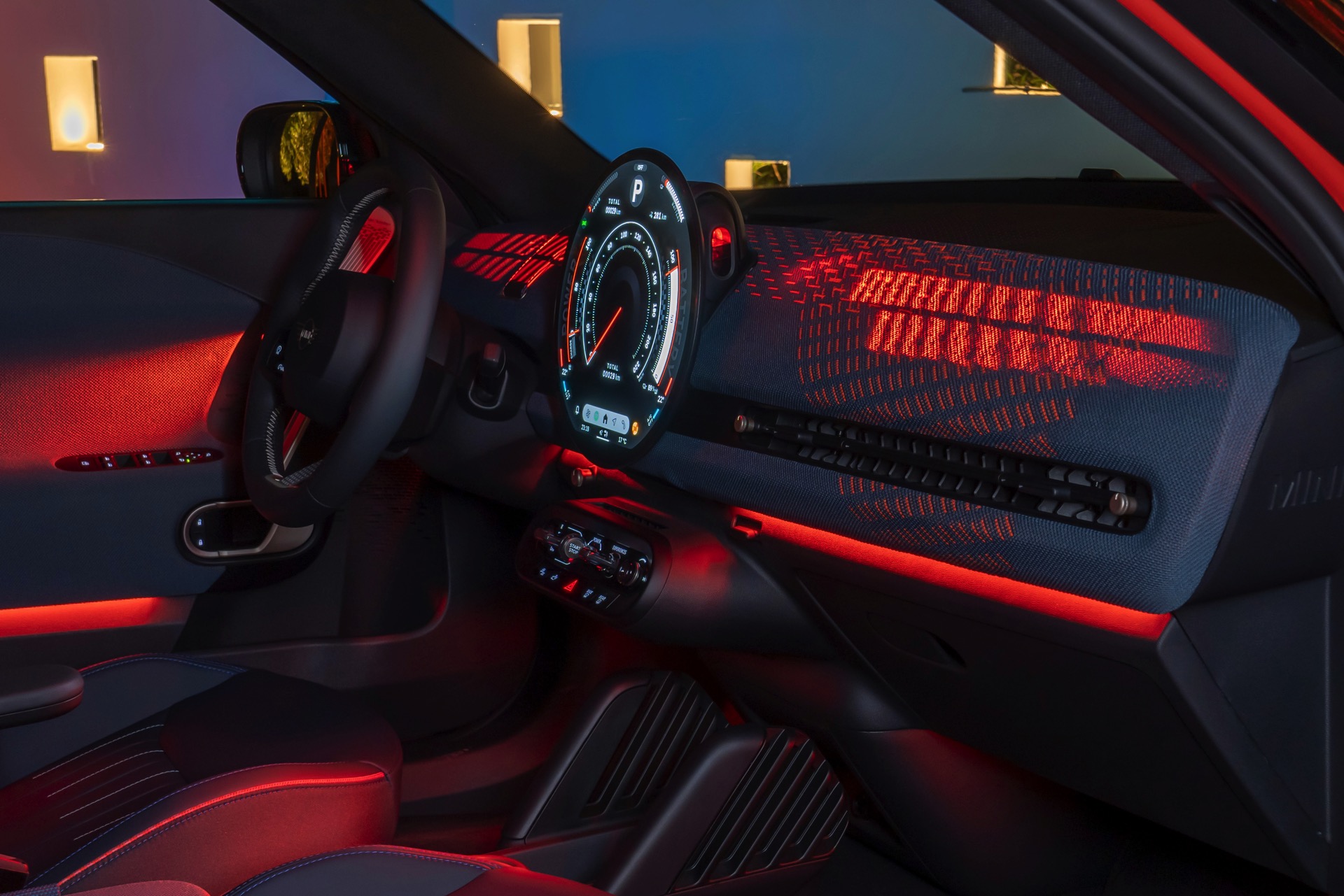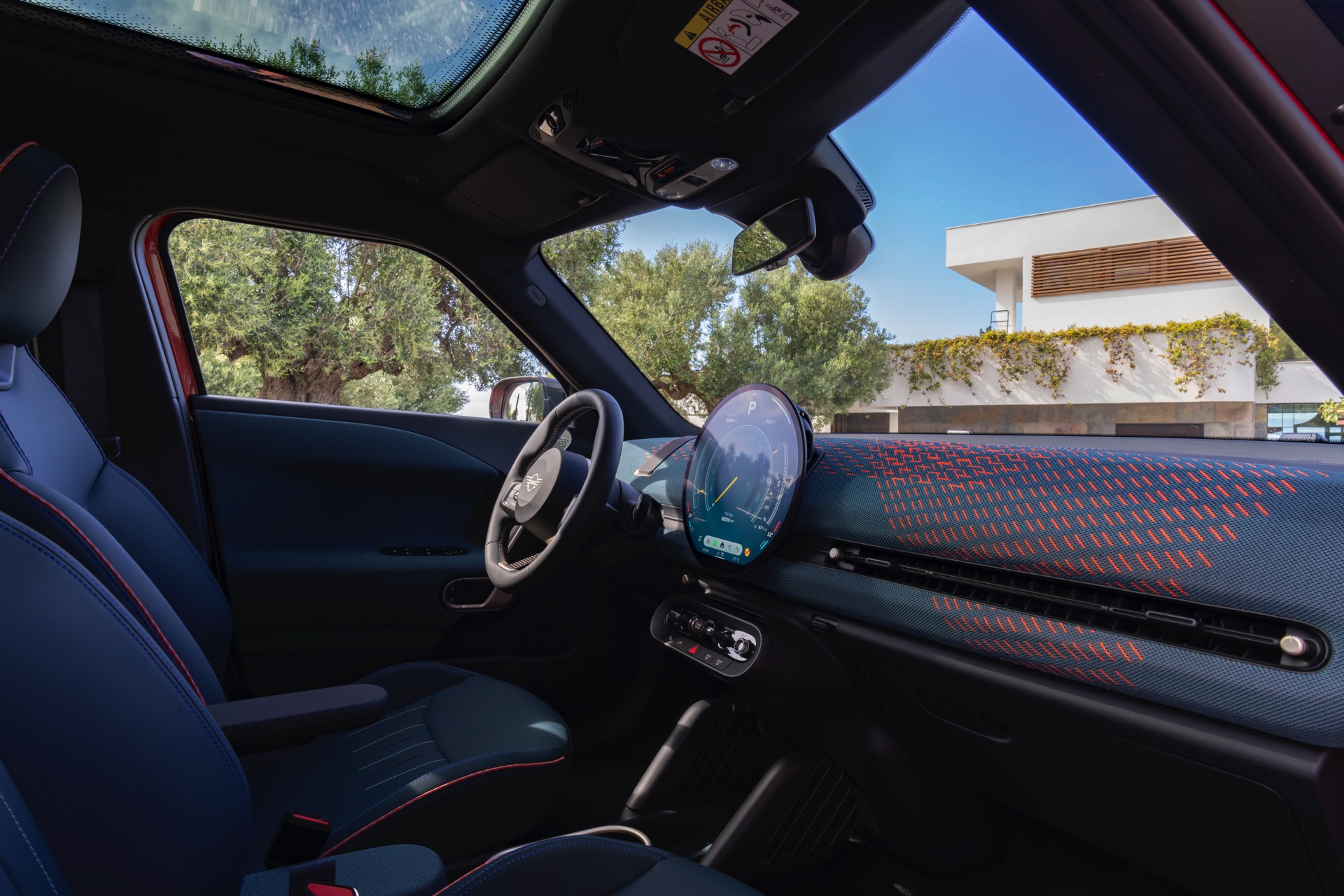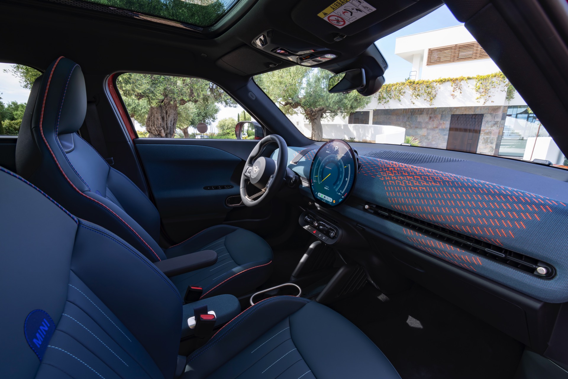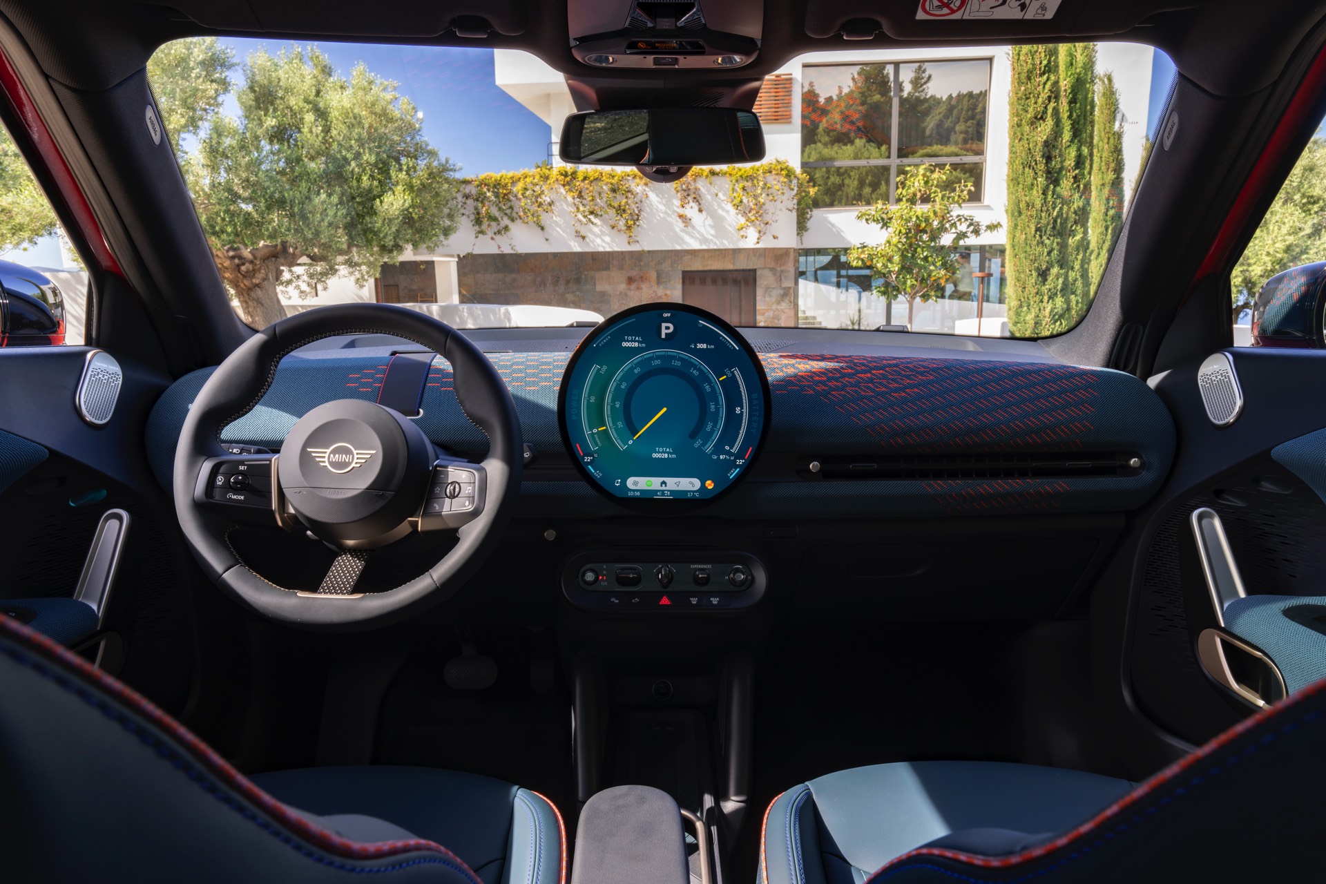 Im Innenraum verfolgt der MINI Aceman einen ganz ähnlichen Ansatz wie die übrigen Mitglieder der aktuellen MIIN-Familie: Hier wie da dominiert das kreisrunde OLED-Display das Cockpit, außerdem sorgen textile Oberflächen für eine wohnliche Atmosphäre.