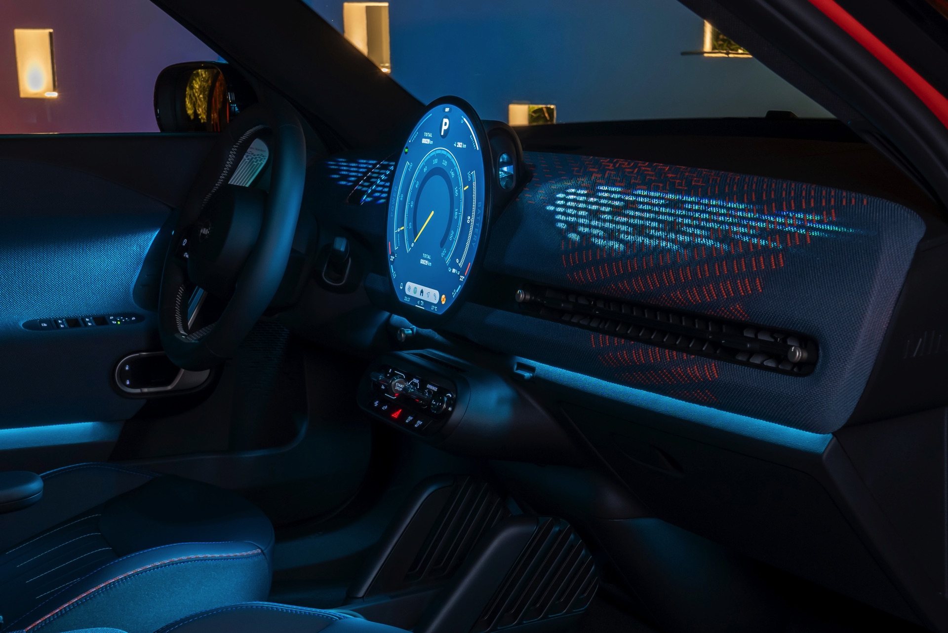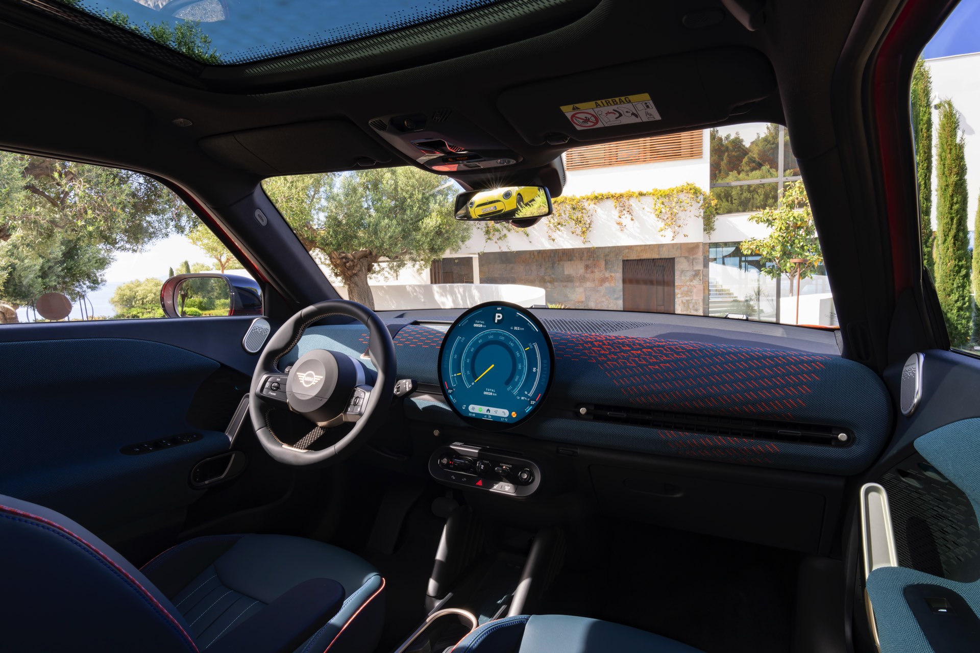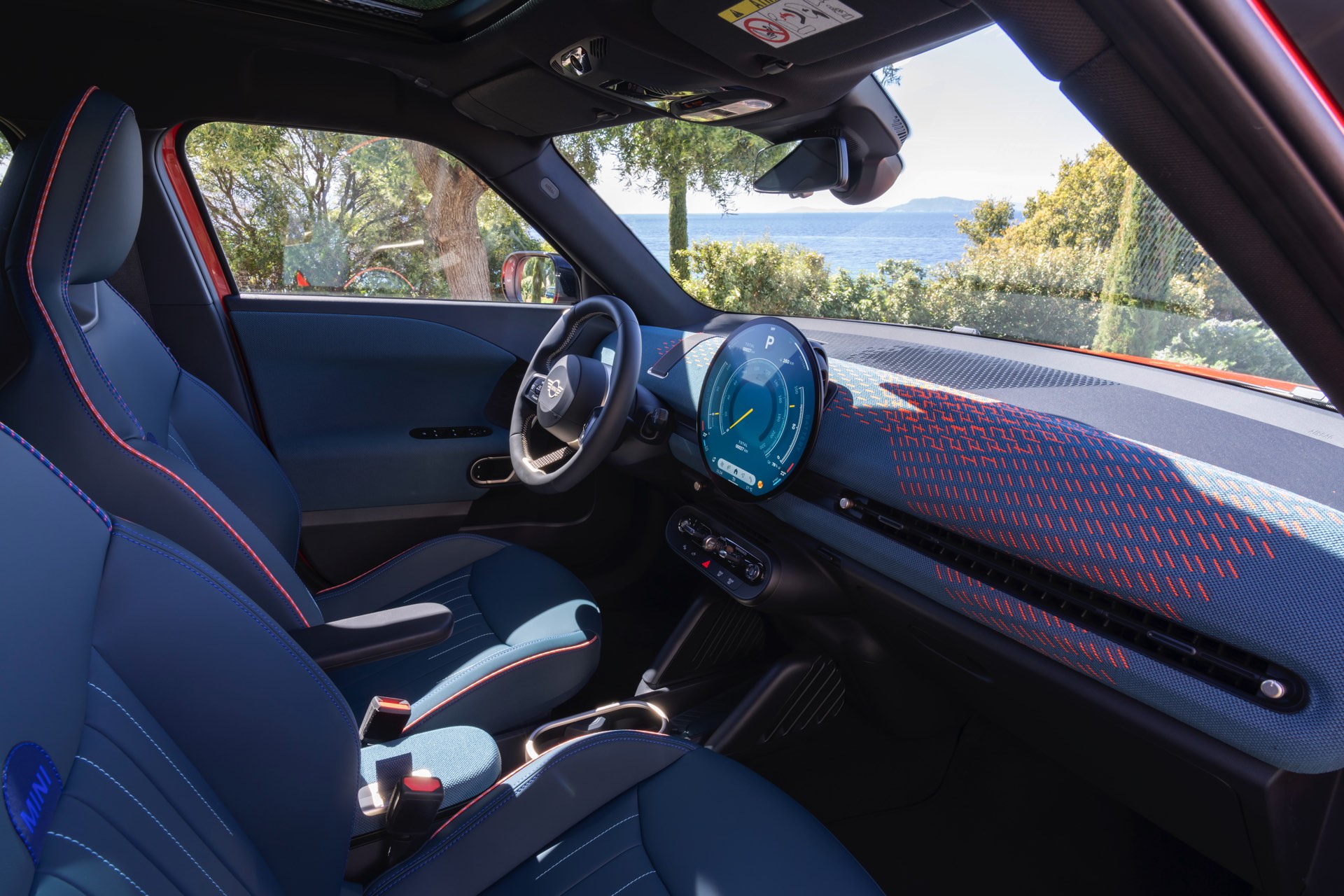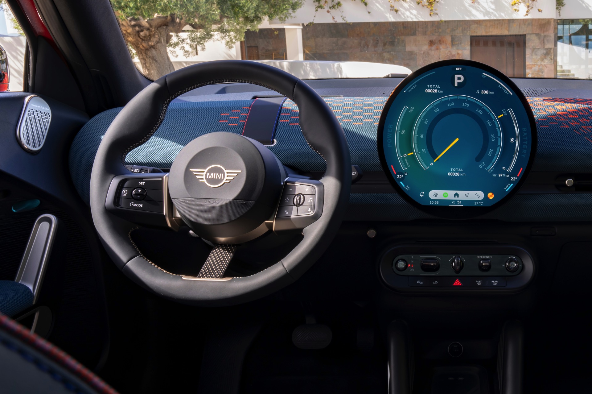 Im Innenraum verfolgt der MINI Aceman einen ganz ähnlichen Ansatz wie die übrigen Mitglieder der aktuellen MIIN-Familie: Hier wie da dominiert das kreisrunde OLED-Display das Cockpit, außerdem sorgen textile Oberflächen für eine wohnliche Atmosphäre.