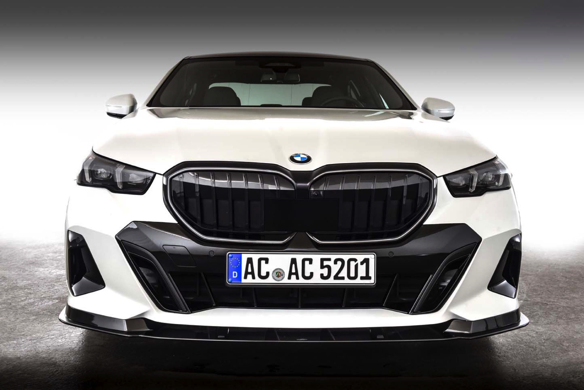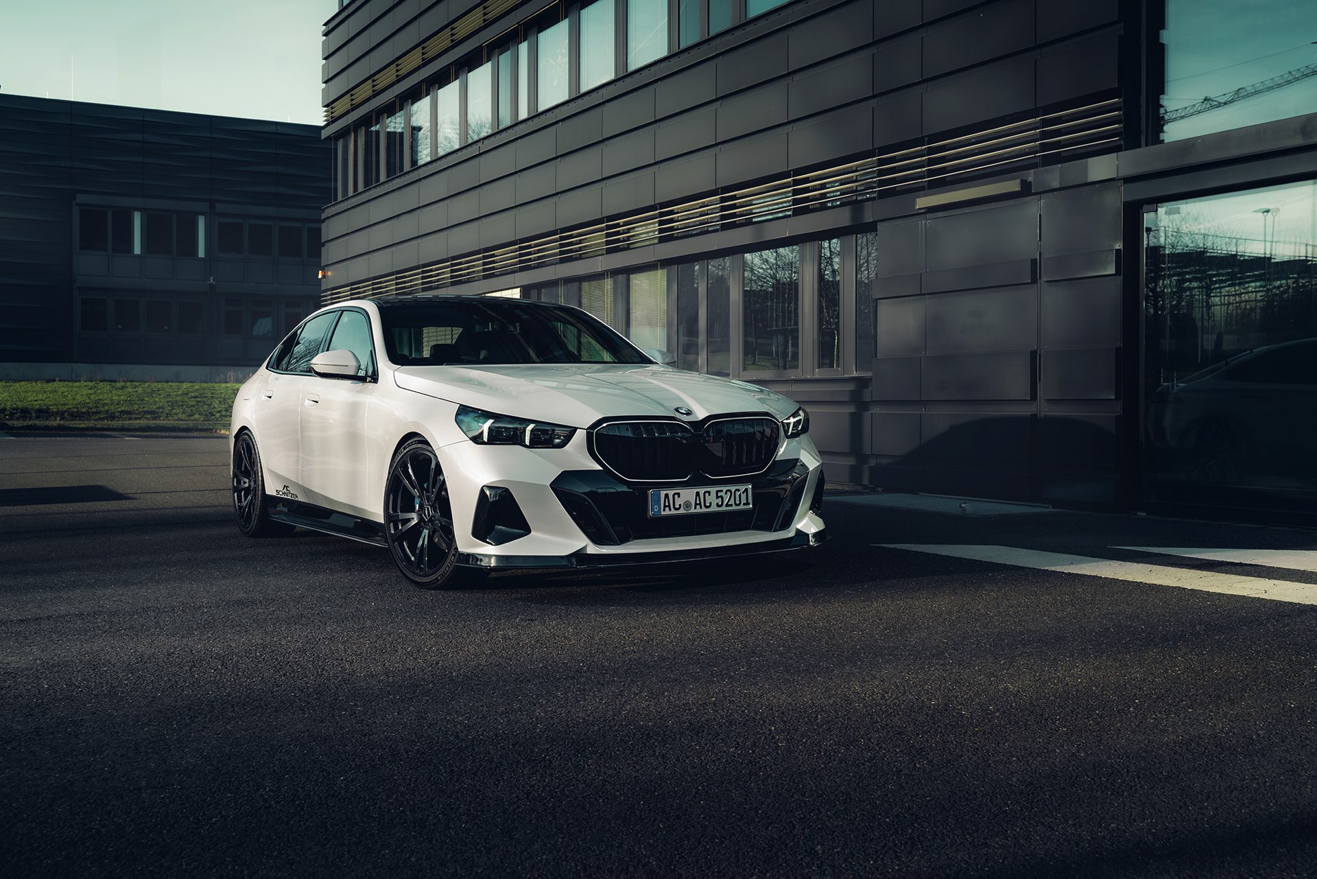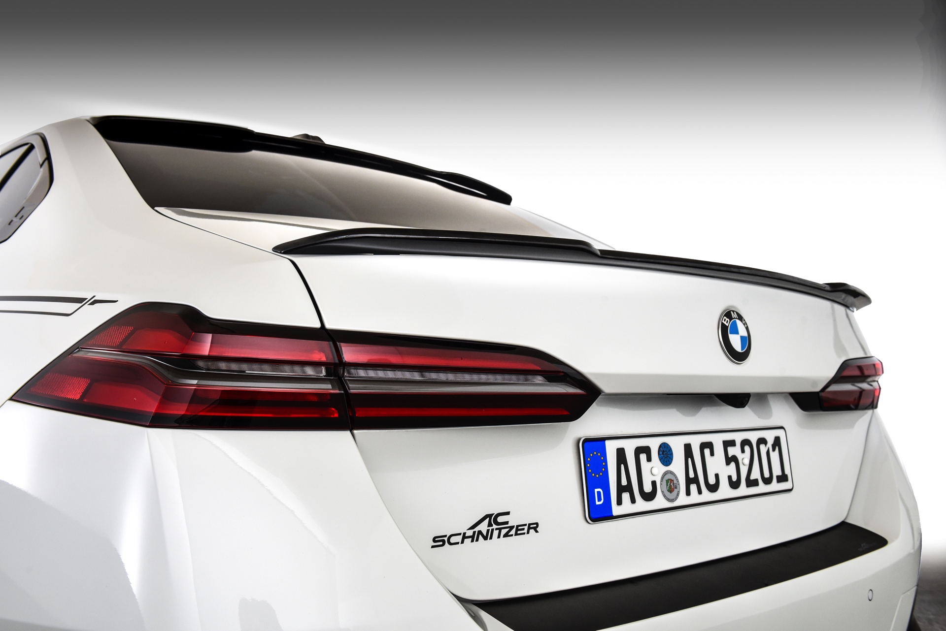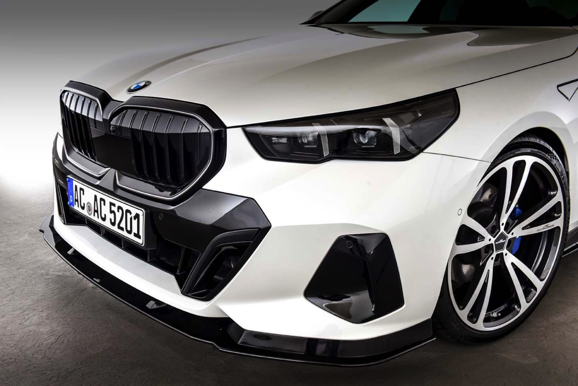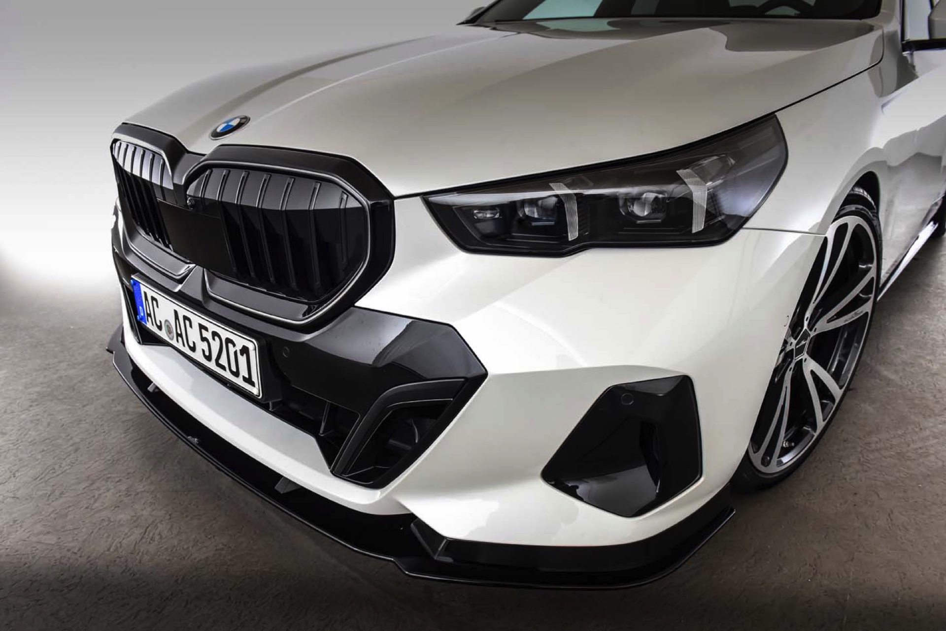 Mit konsequentem Fokus auf Schwarz und Weiß präsentiert sich der neue BMW 5er (G60) in der Tuning-Interpretation von AC Schnitzer. Die Aachener zeigen bereits wenige Wochen nach dem Marktstart ihr Aerodynamik-Programm, ihre Felgen und ihre Fahrwerks-Teile für die Business-Limousine, die erstmals auch als Elektroauto i5 angeboten wird. Die Komponenten sind dabei für BMW i5 und konventionell angetriebene 5er gleichermaßen erhältlich, auch wenn es bei den Fahrwerks-Federnsätze gewisse Unterschiede anhand der Gewichtsklassen gibt und noch nicht alle Varianten lieferbar sind.