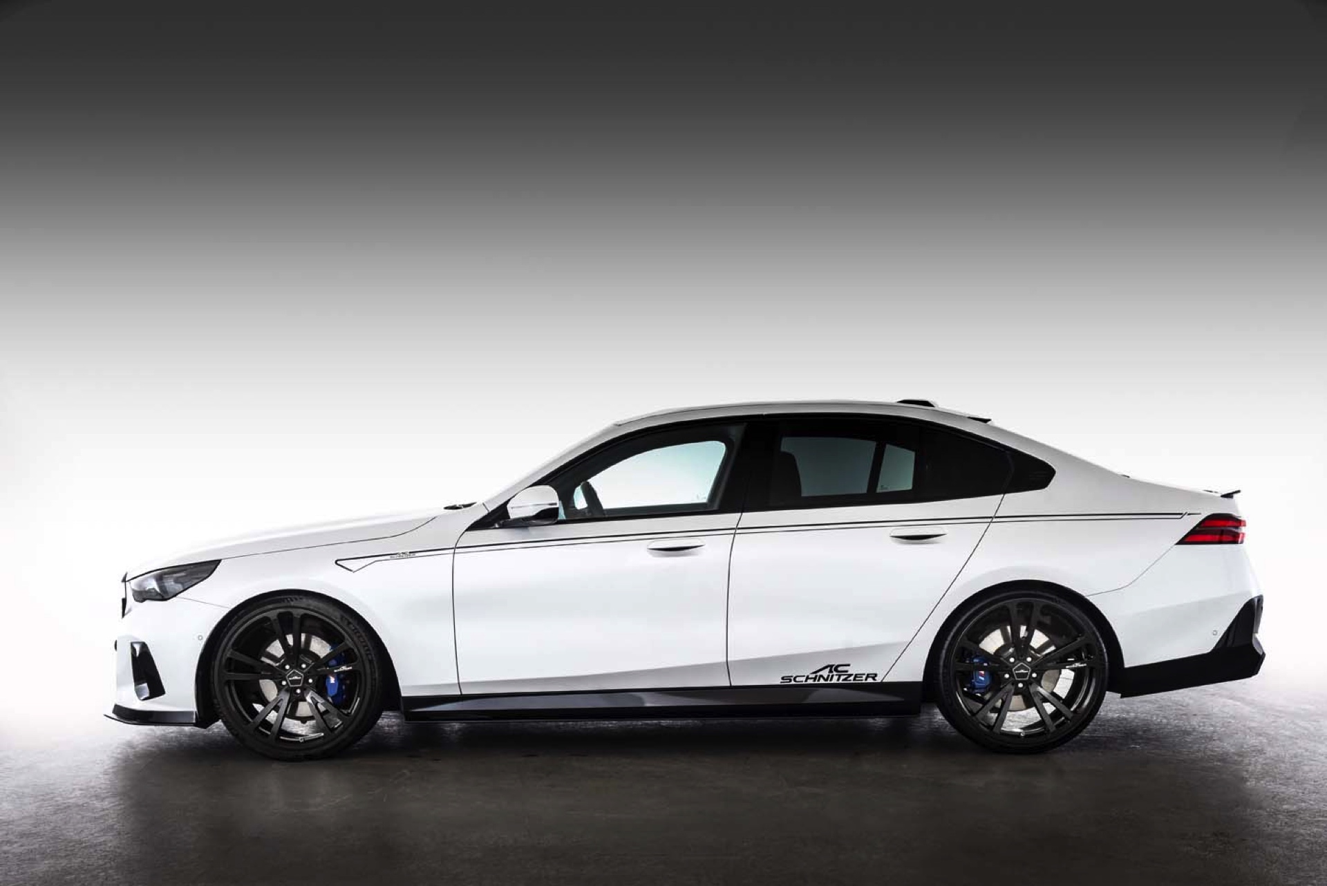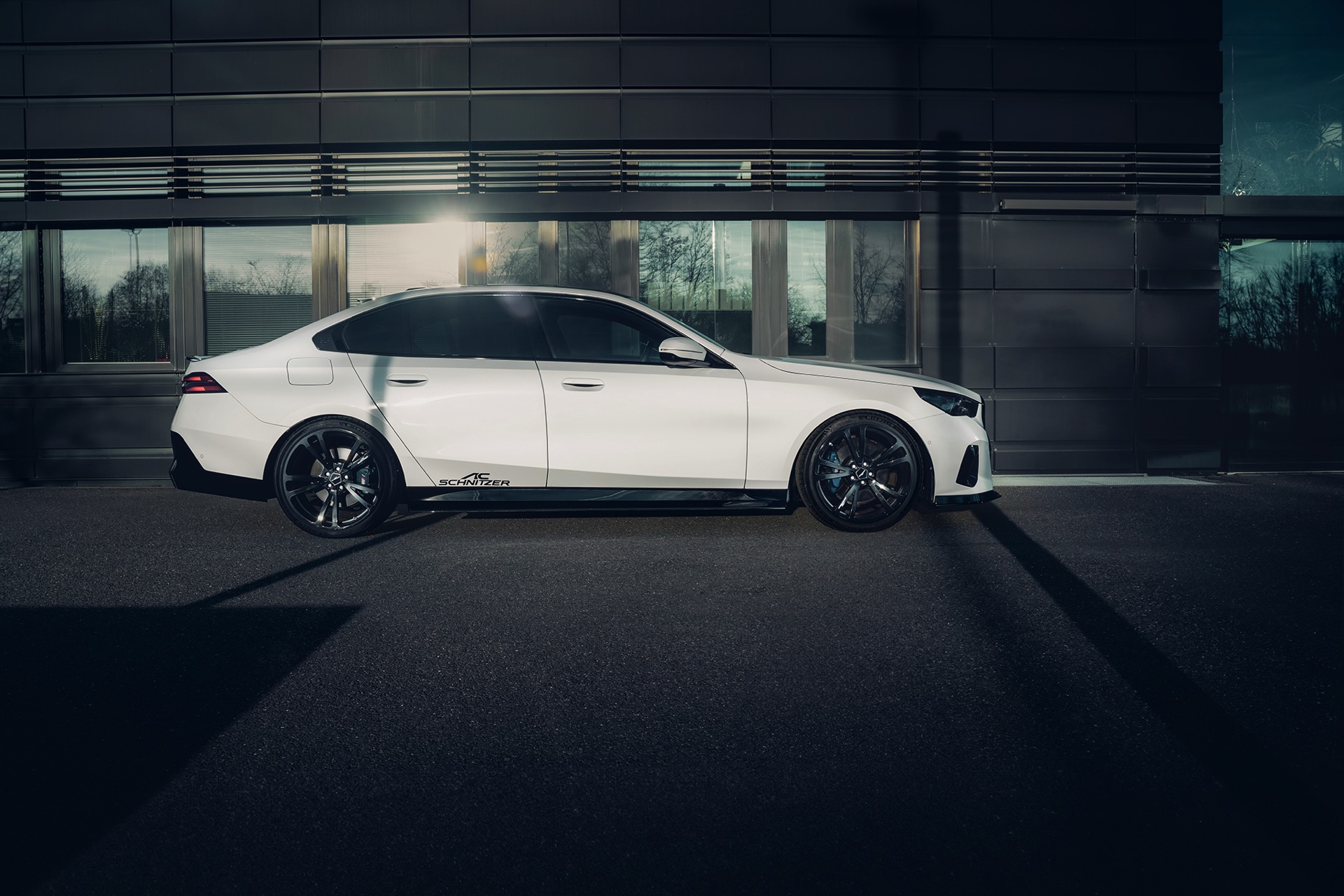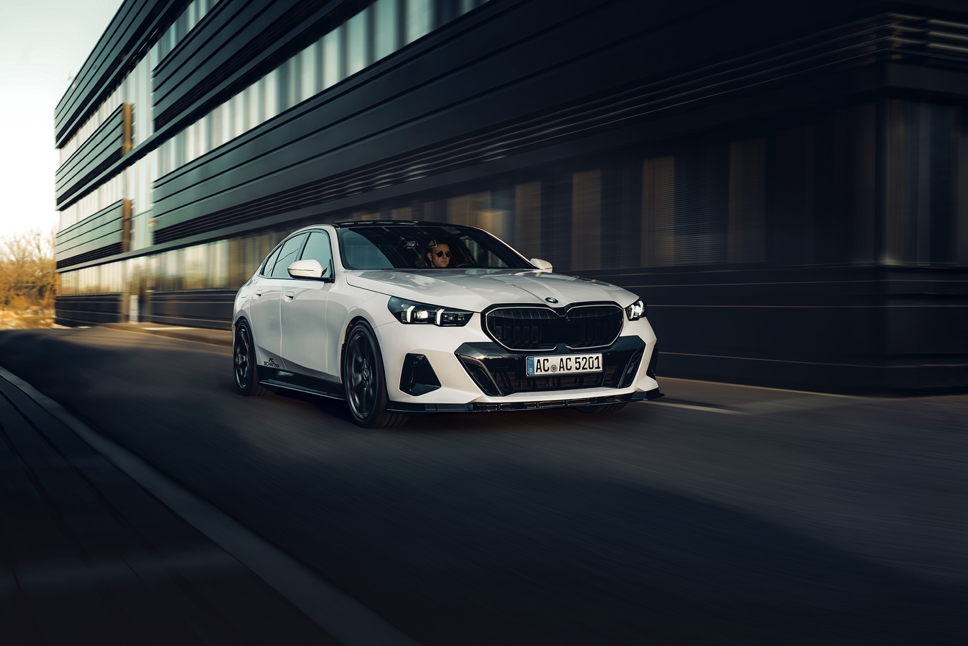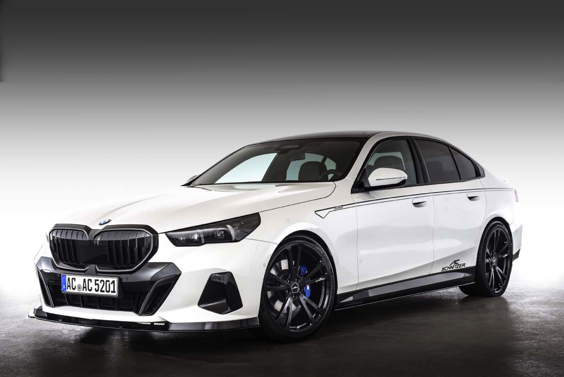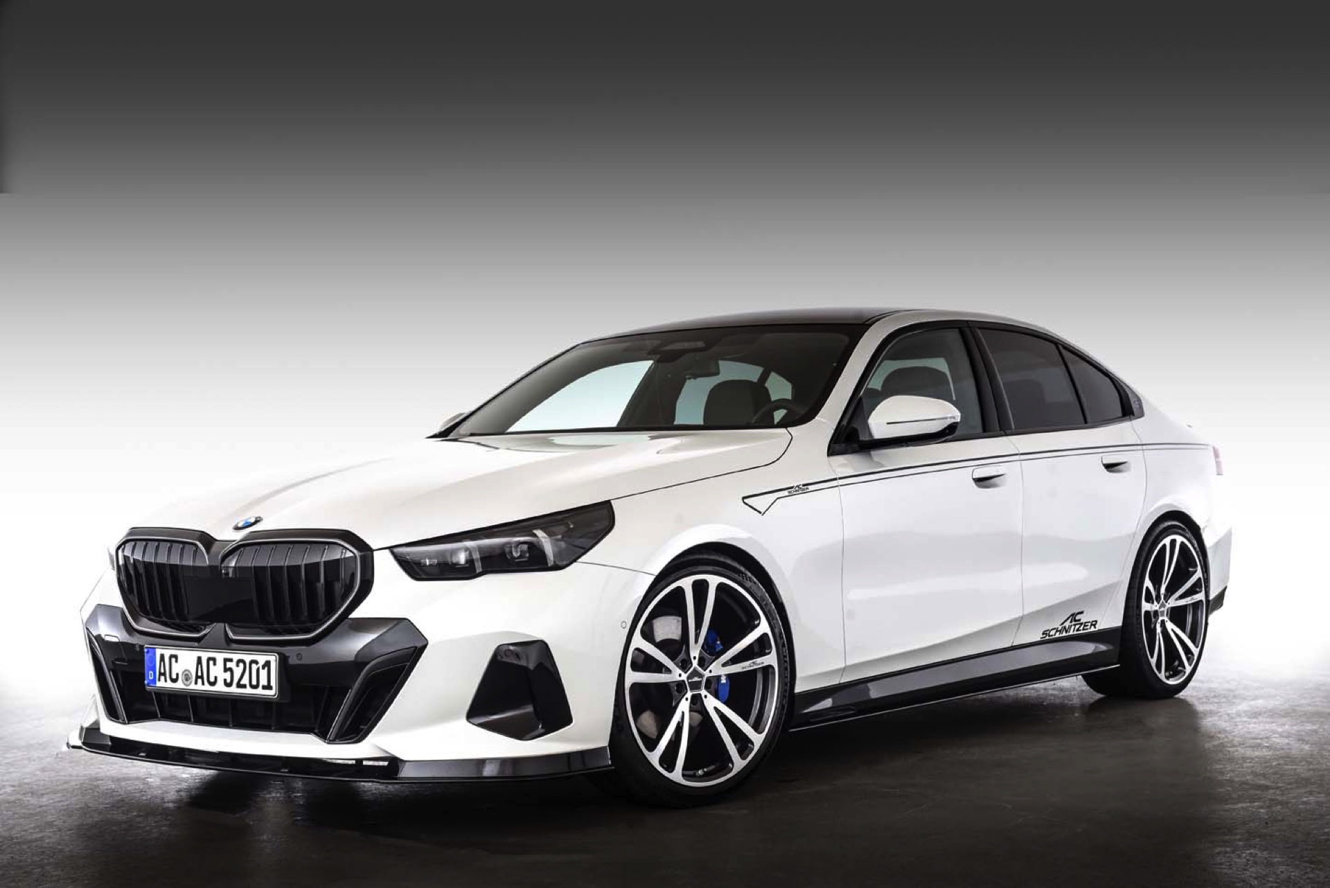 Mit konsequentem Fokus auf Schwarz und Weiß präsentiert sich der neue BMW 5er (G60) in der Tuning-Interpretation von AC Schnitzer. Die Aachener zeigen bereits wenige Wochen nach dem Marktstart ihr Aerodynamik-Programm, ihre Felgen und ihre Fahrwerks-Teile für die Business-Limousine, die erstmals auch als Elektroauto i5 angeboten wird. Die Komponenten sind dabei für BMW i5 und konventionell angetriebene 5er gleichermaßen erhältlich, auch wenn es bei den Fahrwerks-Federnsätze gewisse Unterschiede anhand der Gewichtsklassen gibt und noch nicht alle Varianten lieferbar sind.