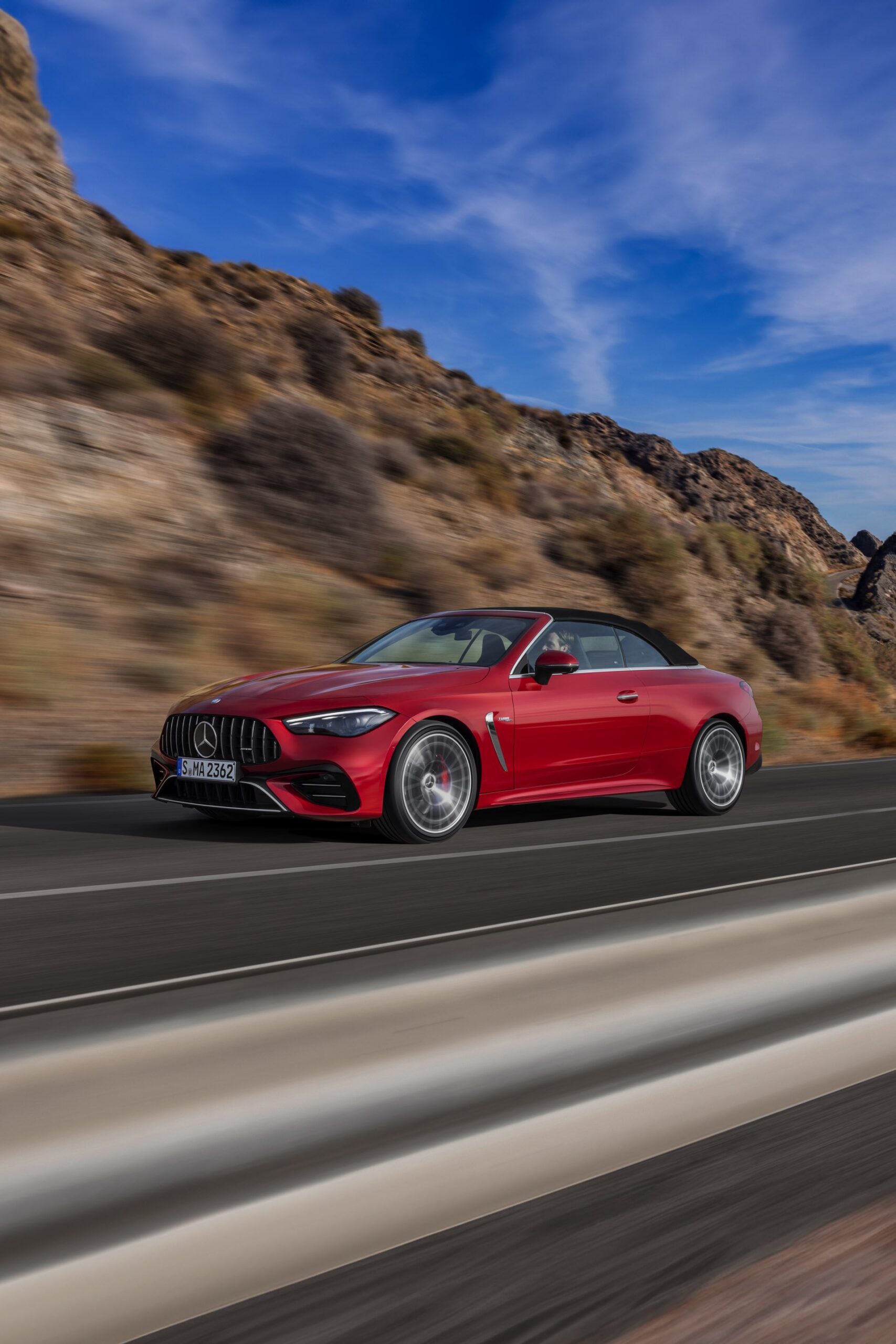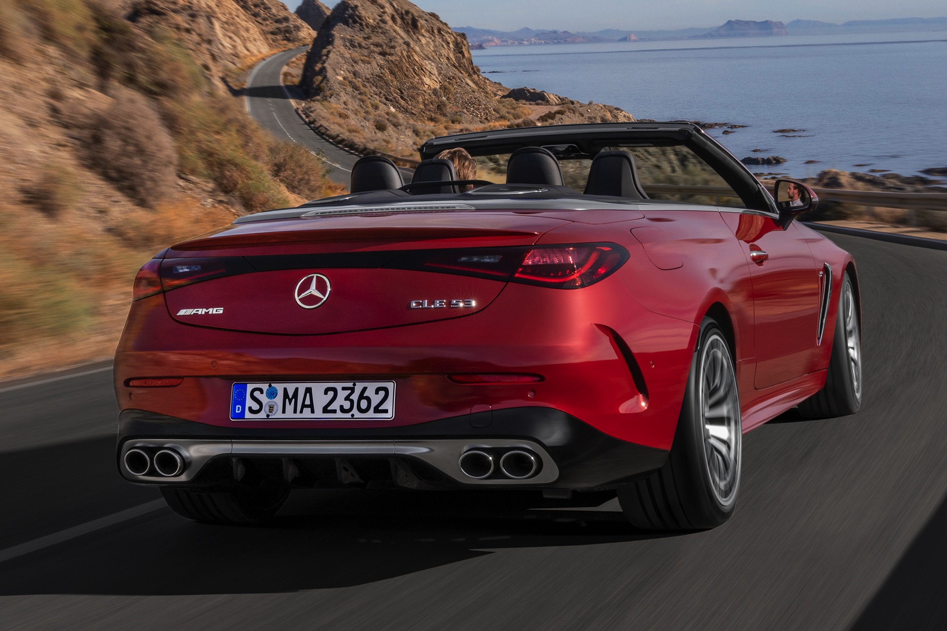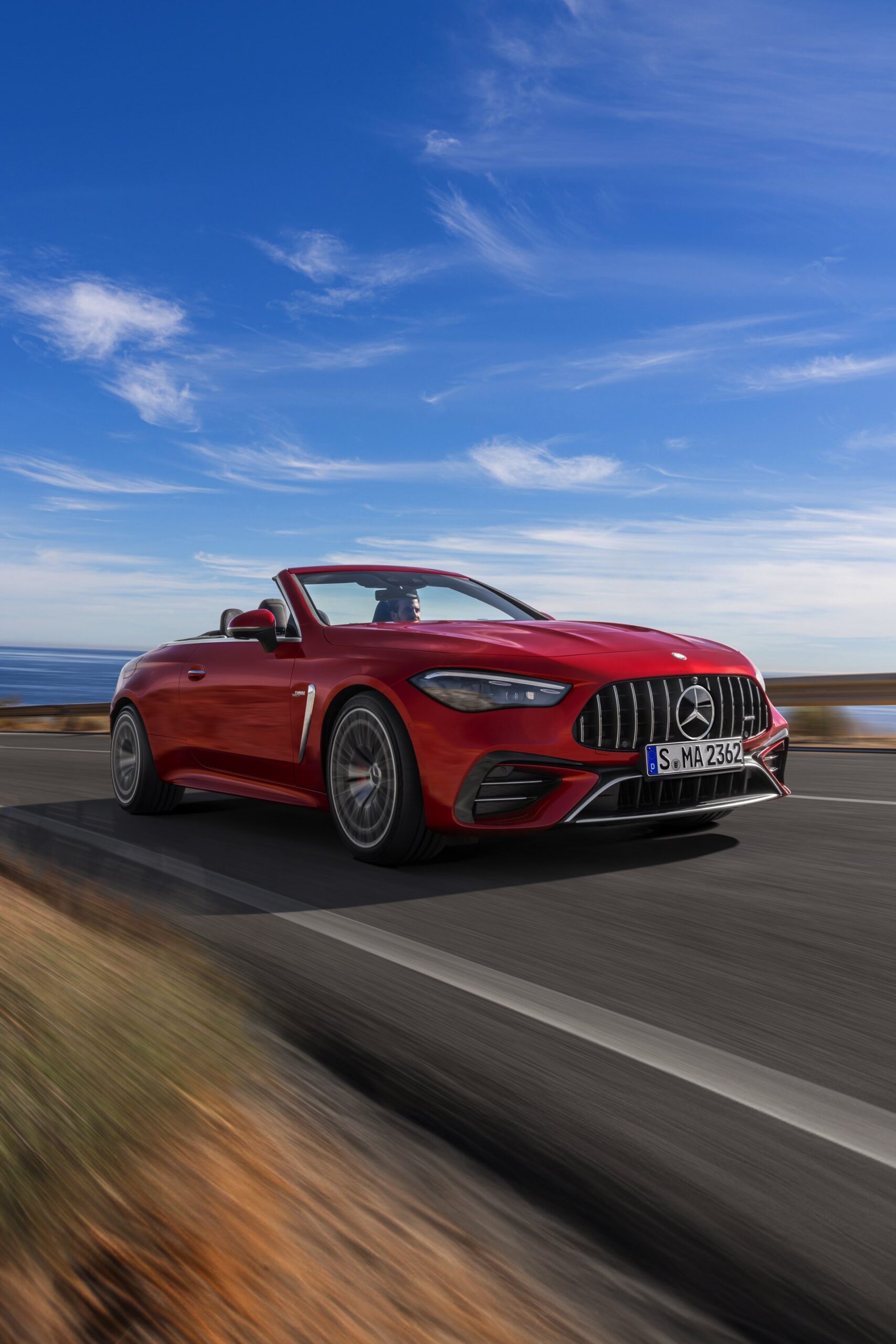Mit 449 PS und 560 Newtonmeter Drehmoment ist der CLE 53 ausgesprochen souverän motorisiert, im Overboost stehen kurzzeitig sogar 600 Newtonmeter zur Verfügung. Für Souveränität stehen auch die Fahrleistungen, denn bereits im Serien-Zustand gelingt der Sprint von 0 auf 100 in 4,4 Sekunden – mit dem optionalen AMG Dynamic Plus Paket samt Race Start genannter Launch Control ist der Standardsprint sogar in 4,2 Sekunden zu schaffen. Gleichzeitig klettert das elektronische Vmax-Limit von 250 auf 270 km/h. Mit allen genannten Werten rangiert das Mercedes-AMG CLE 53 Cabrio zwischen den beiden M-Varianten der BMW 4er-Reihe, die wahlweise etwas langsamer oder ein gutes Stück schneller sind.
