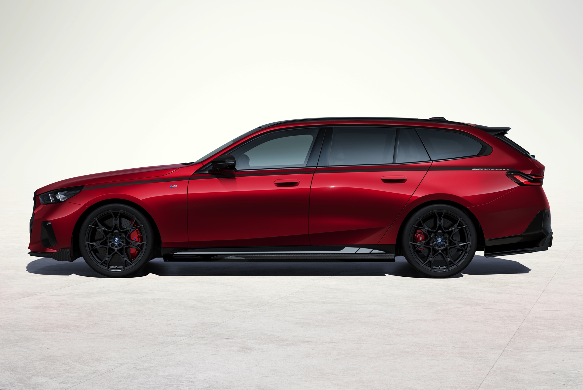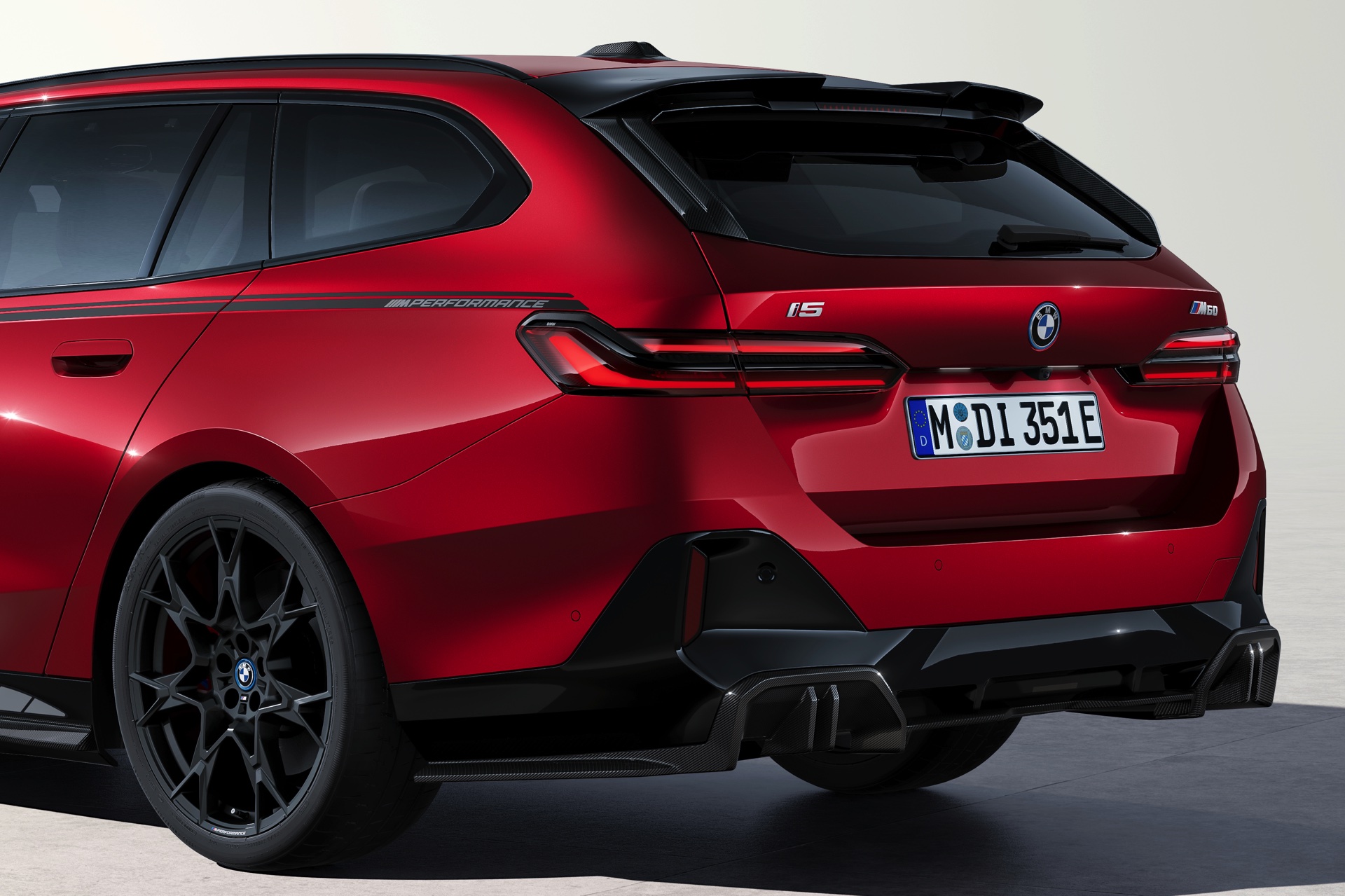 Speziell für den Touring wurden ein Dach-Heckspoiler in Hochglanz-Schwarz und Heckfinnen aus Carbon entworfen, die meisten anderen Teile dürften Interessierten bereits von der Limousine BMW 5er (G60) mit M Performance Parts bekannt sein. Auf den ersten Fotos zum Tuning-Kombi sehen wir den BMW i5 M60 Touring mit M Sport Pro-Paket und seiner wohl aufregendsten Lackierung diesseits vom 150 Farben starken BMW Individual-Programm: Fire Red Metallic beschert dem Praktiker einen absolut außergewöhnlichen Look, der von den schwarzen Details aus dem M Performance-Regal noch weiter verfeinert wird. "