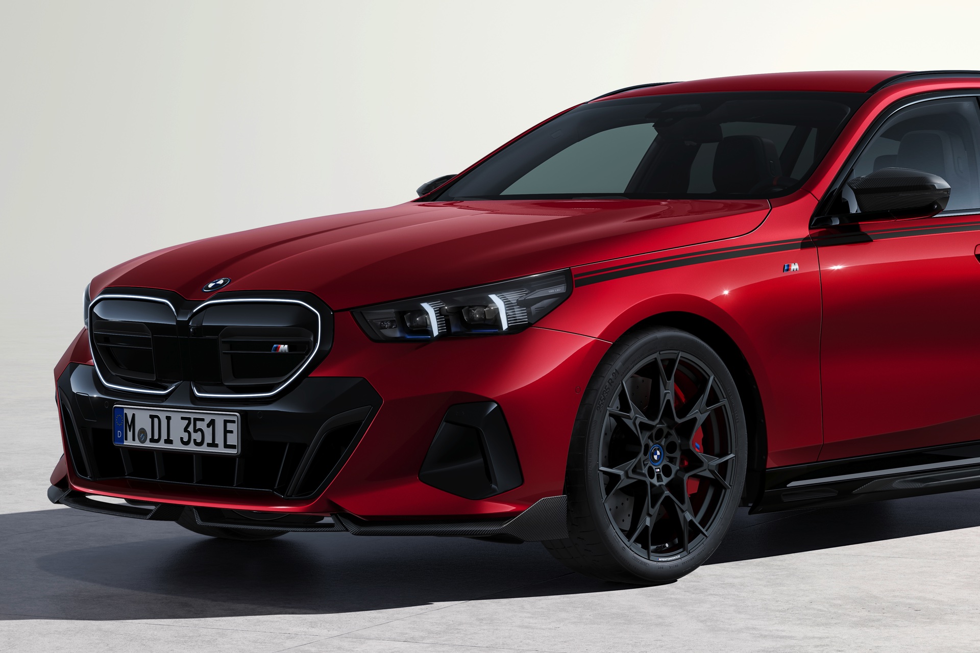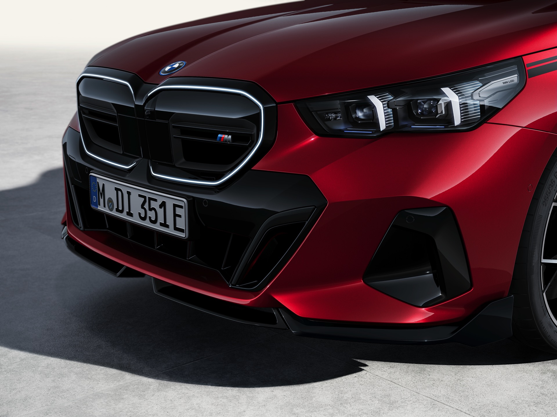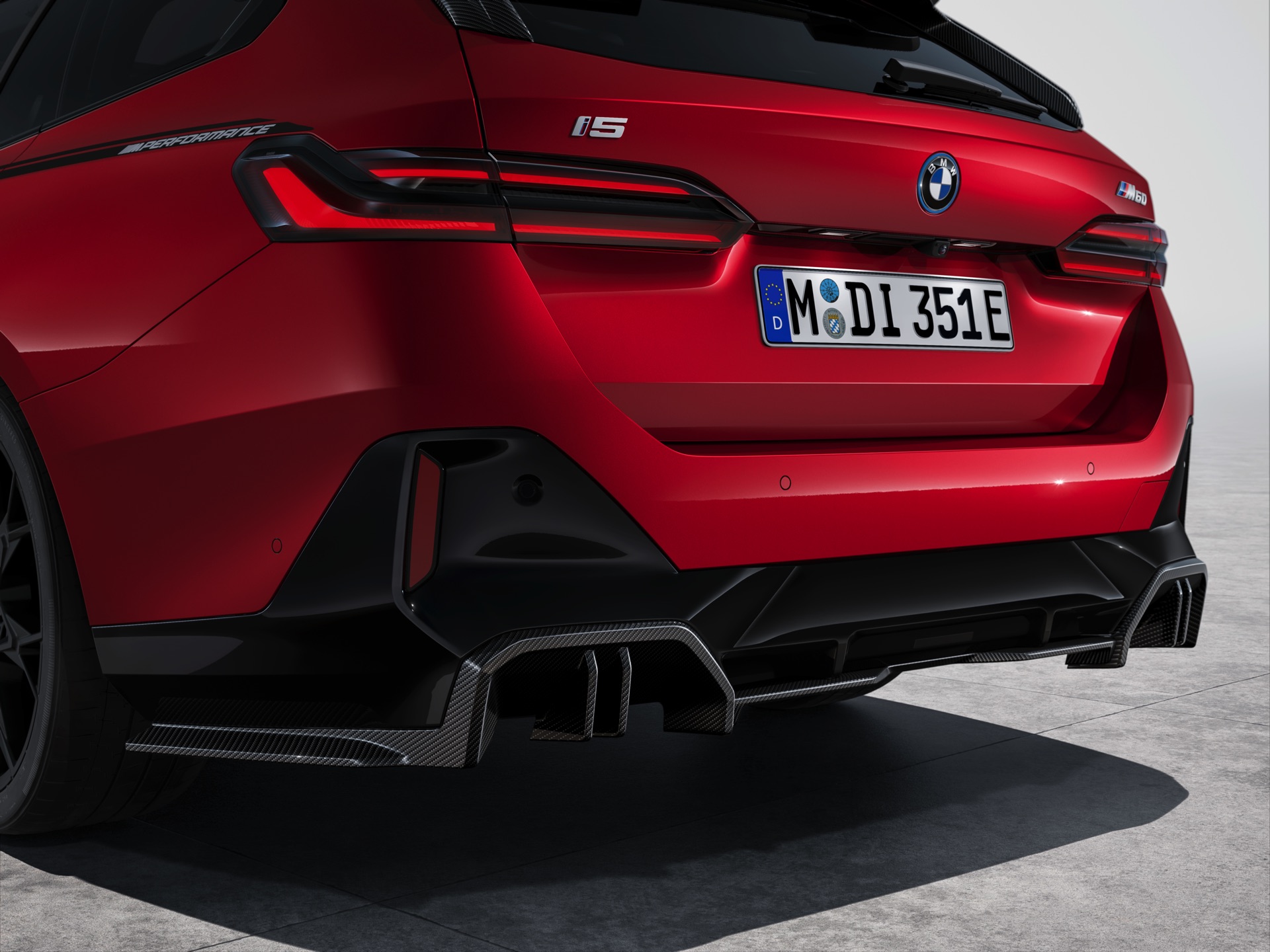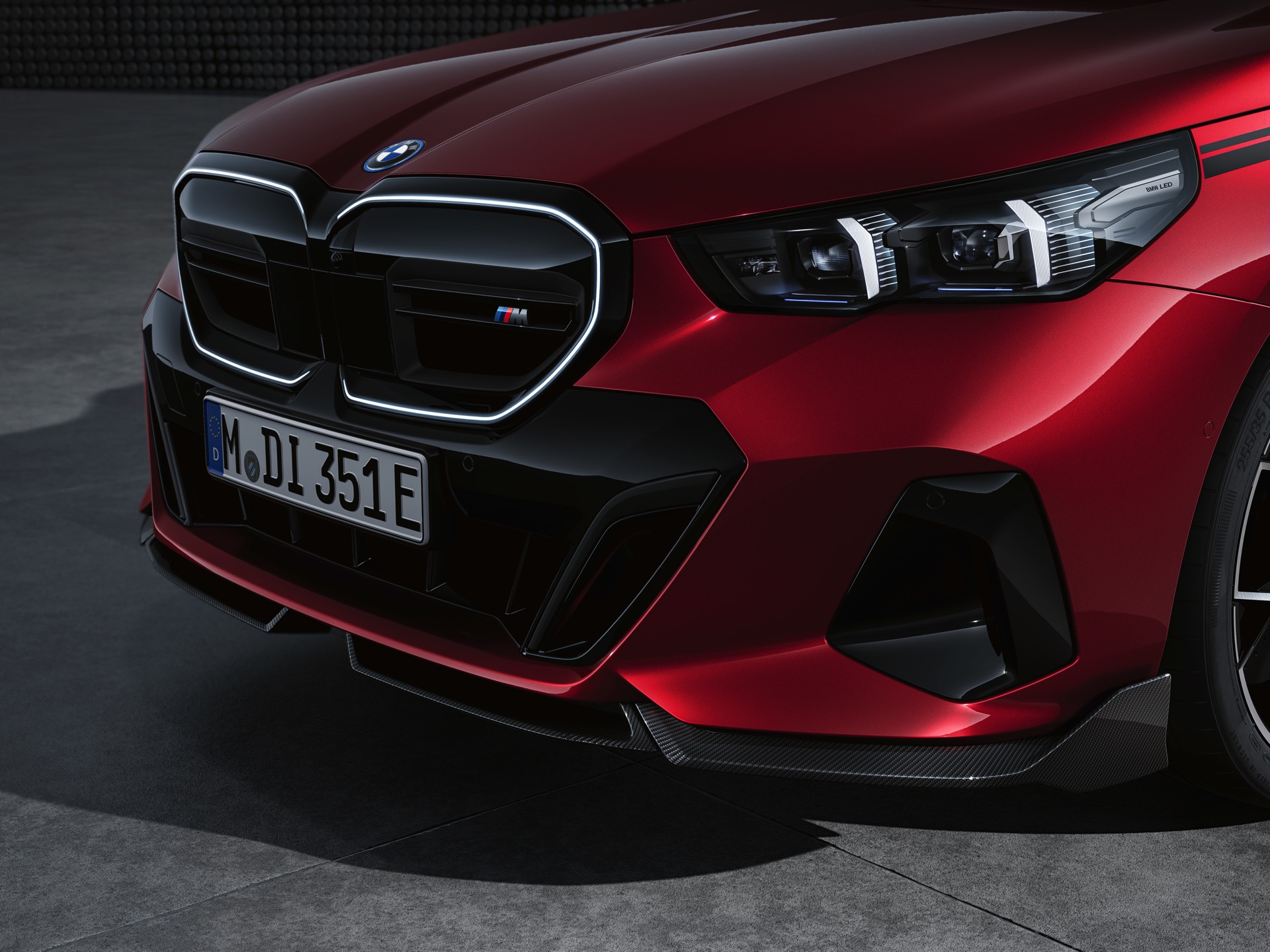 Frontsplitter, Seitenschweller, Außenspiegel-Aufsätze in zwei Varianten, sowohl für die regulären 5er und i5 Touring als auch für das Topmodell i5 M60, ein Diffusor-Einsatz für die Heckschürze des M Sport-Pakets und eine Dekor-Beklebung für die Seiten des Fahrzeugs verleihen dem G61 jede Menge zusätzliche Würze.
