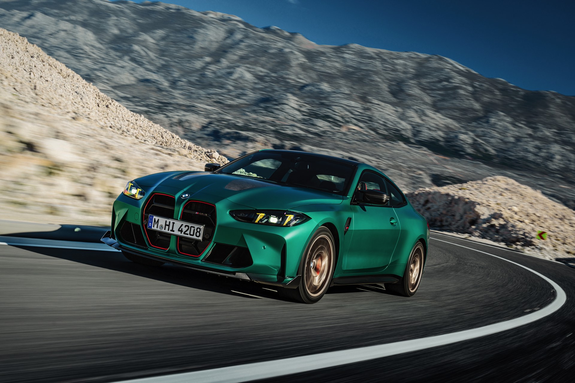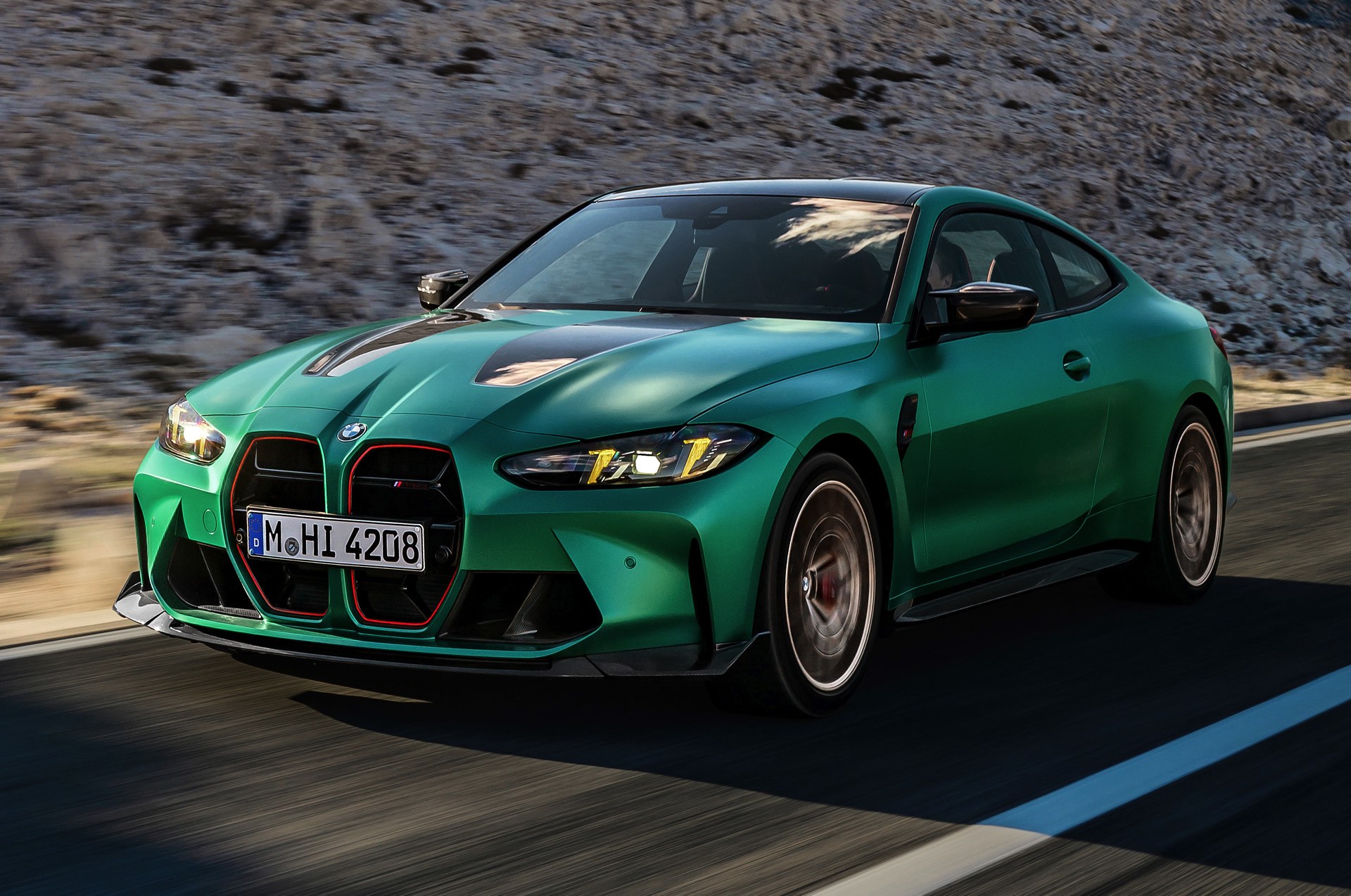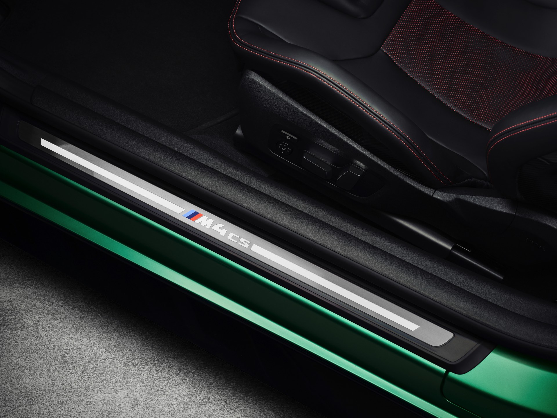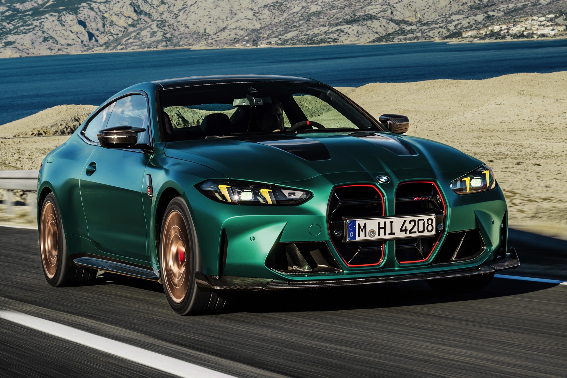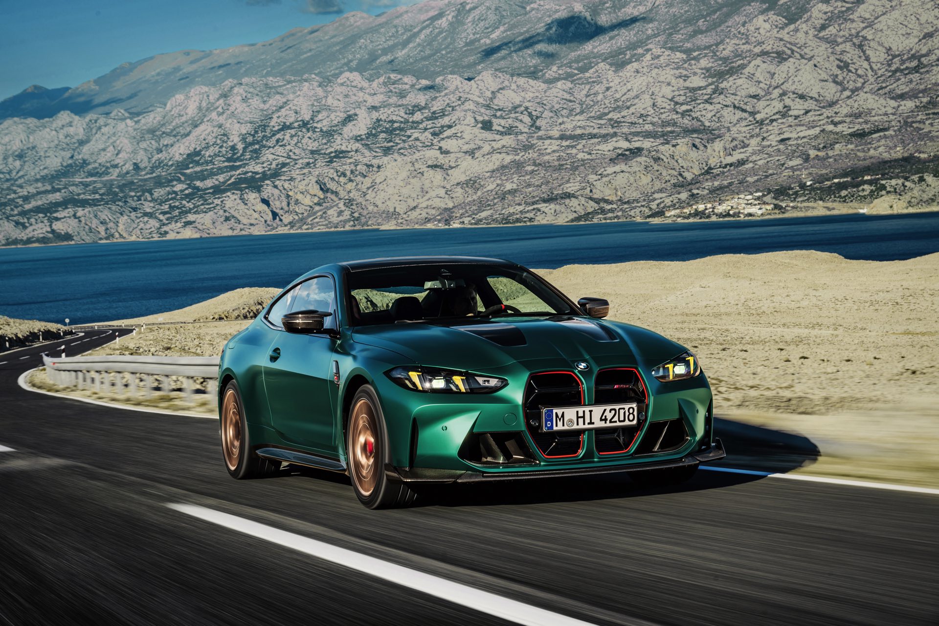 Im Vergleich zum regulären M4 Competition mit M xDrive bietet der BMW M4 CS nicht nur 20 zusätzliche Pferdestärken, sondern auch eine schärfere Fahrwerks-Abstimmung und ein mit viel Carbon um 20 Kilogramm reduziertes Gewicht. Zu den optischen Highlights zählen das gelbe Tagfahrlicht, die zum Teil in Sicht-Carbon ausgeführte Motorhaube, die von M3 CS und M4 CSL bekannte Niere mit nur drei horizontalen Streben und natürlich die exklusiven Farben: Als Weltpremiere debütiert Frozen Isle of Man Green auf dem BMW M4 CS, außerdem stehen Riviera Blau, Brooklyn Grey und Saphirschwarz zur Wahl. Am Heck trägt der M4 CS die seit dem Facelift für alle 4er und M4 erhältlichen, vormals aber dem M4 CSL vorbehaltenen Rückleuchten mit Laser-Technik und filigranen Lichtleiterbahnen. "