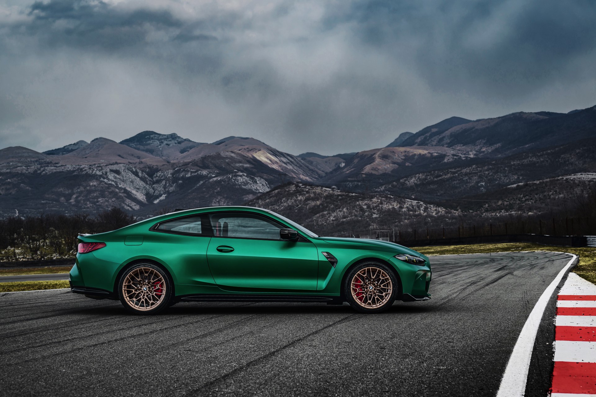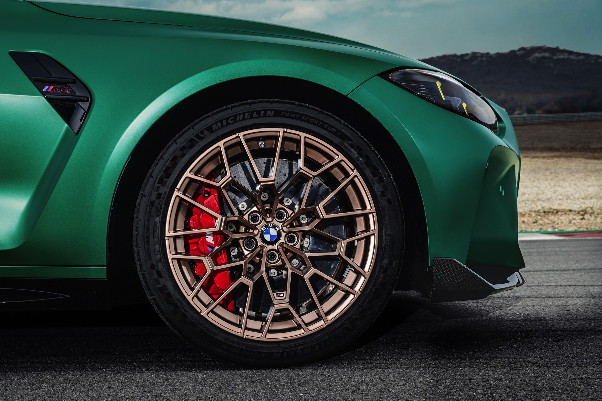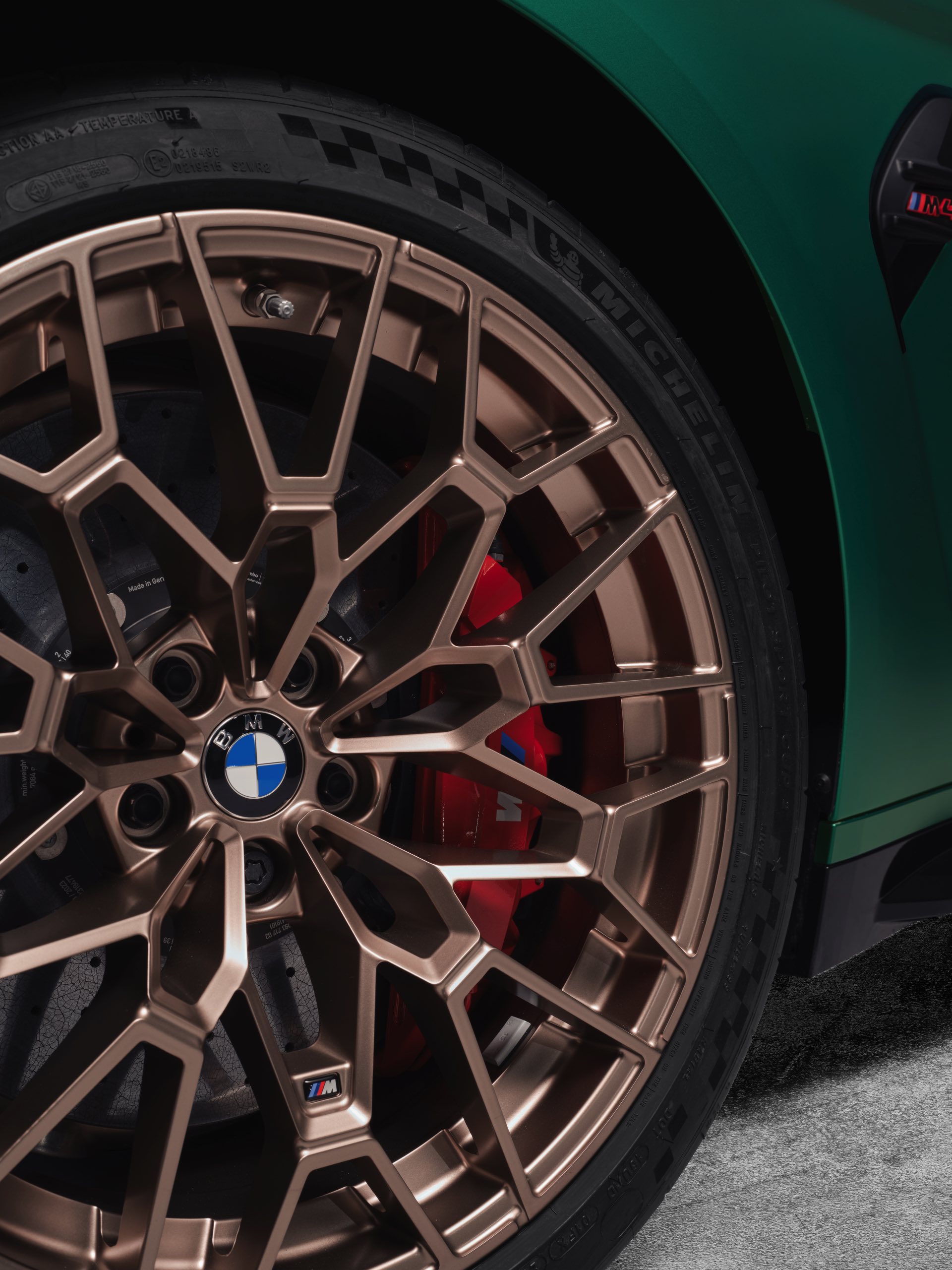 Ein weiterer Hingucker sind die Leichtbau-Schmiedefelgen im V-Speichen-Design. Die vorne 19 und hinten 20 Zoll großen Felgen sind wahlweise in Goldbronze matt oder Schwarz matt lackiert und werden serienmäßig mit Michelin Pilot Sport Cup 2 bezogen. Alternativ dazu gibt es auf Wunsch auch die noch stärker auf den Rennstrecken-Einsatz optimierten Michelin Pilot Sport Cup 2 R. Wer lieber bessere Nässeeigenschaften für den Alltag wünscht, kann den M4 CS natürlich auch mit einer regulären High Performance-Bereifung bestellen.
