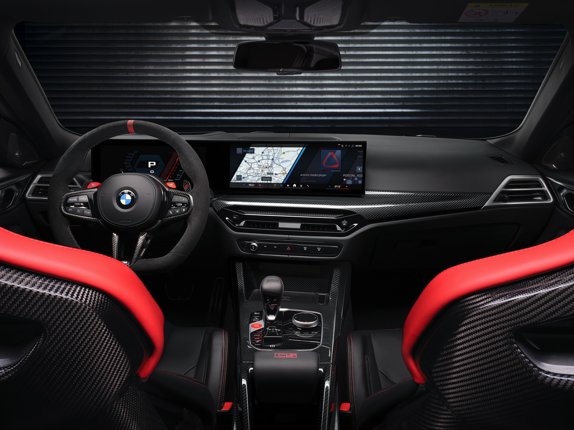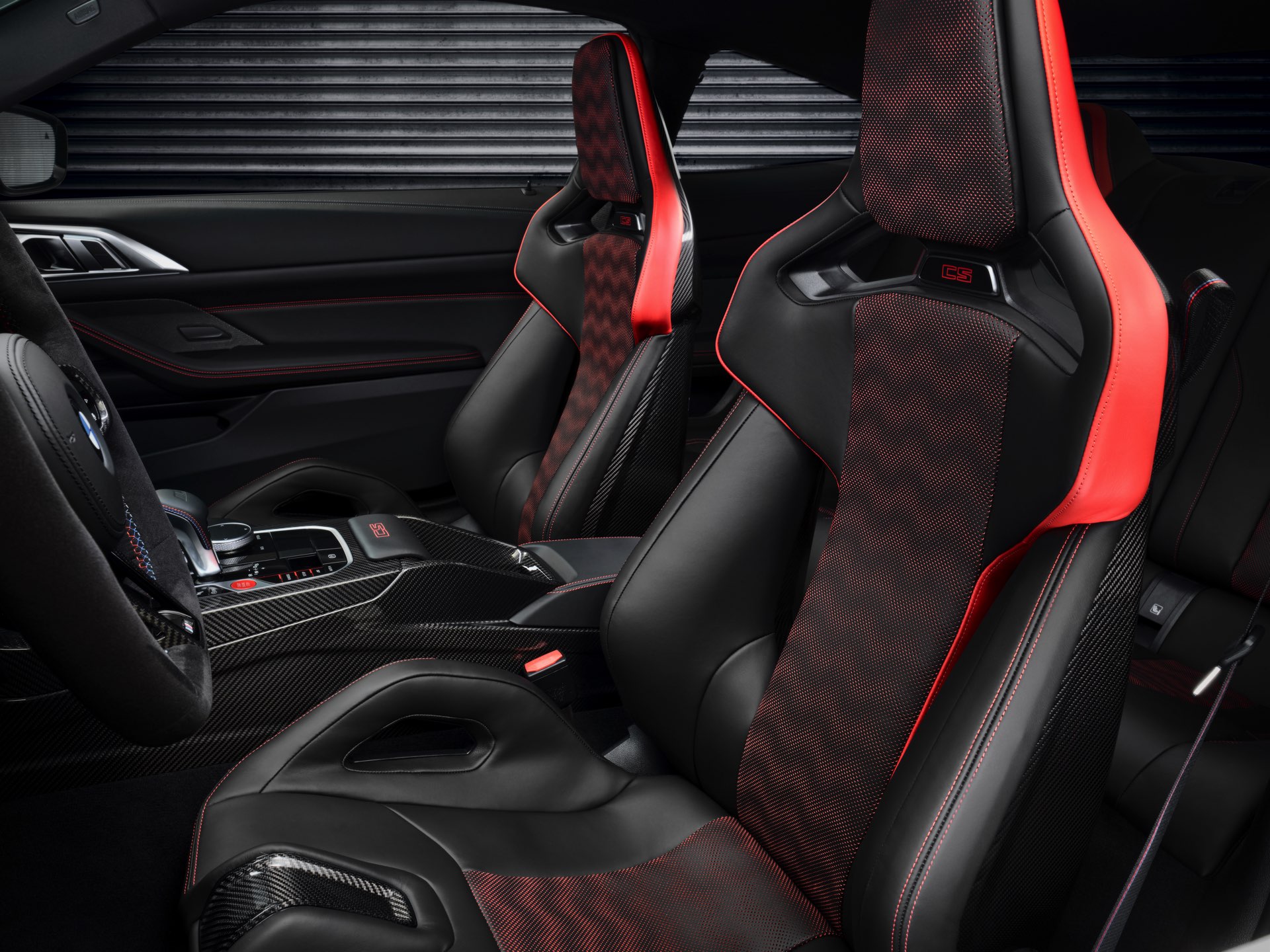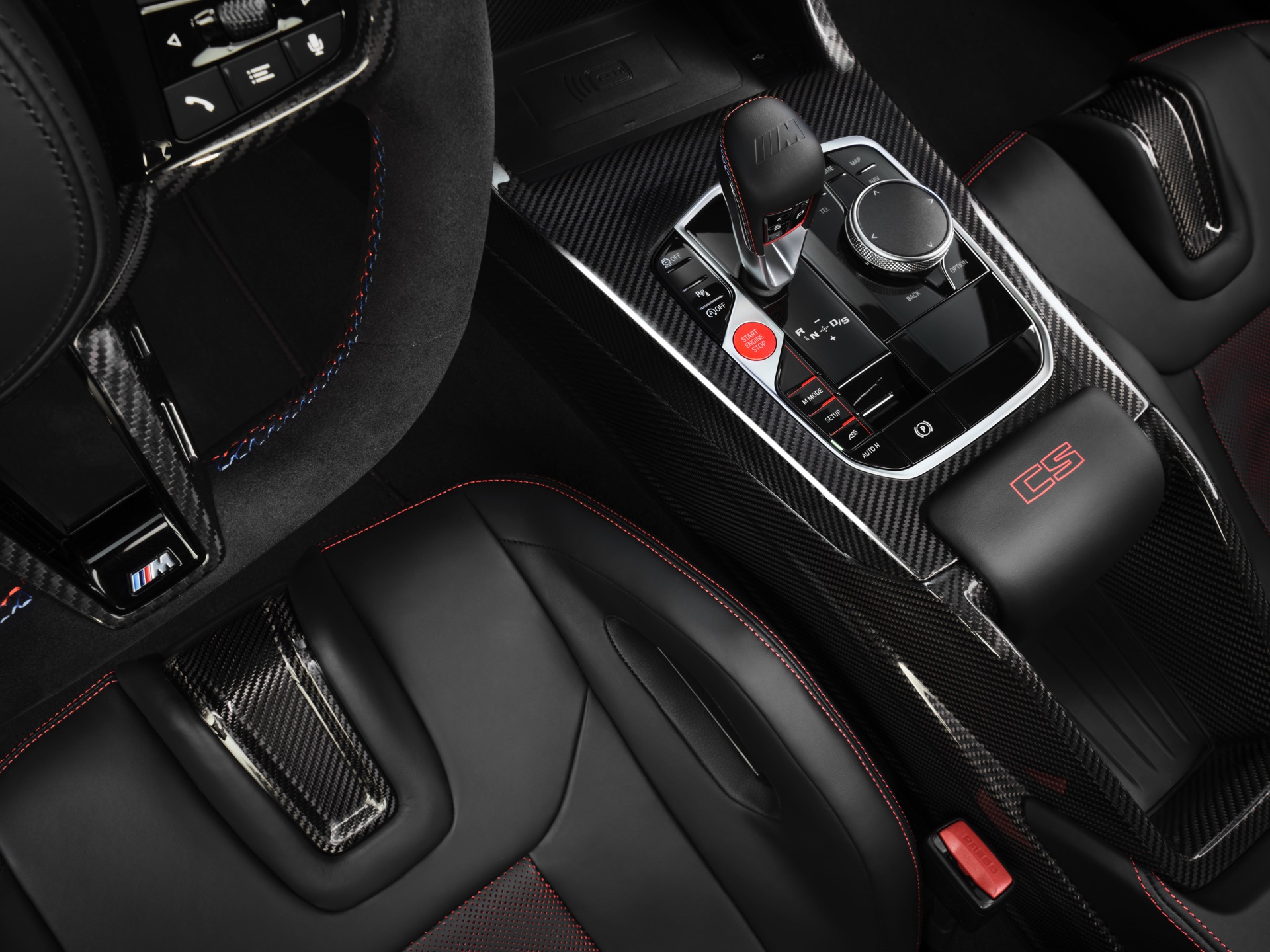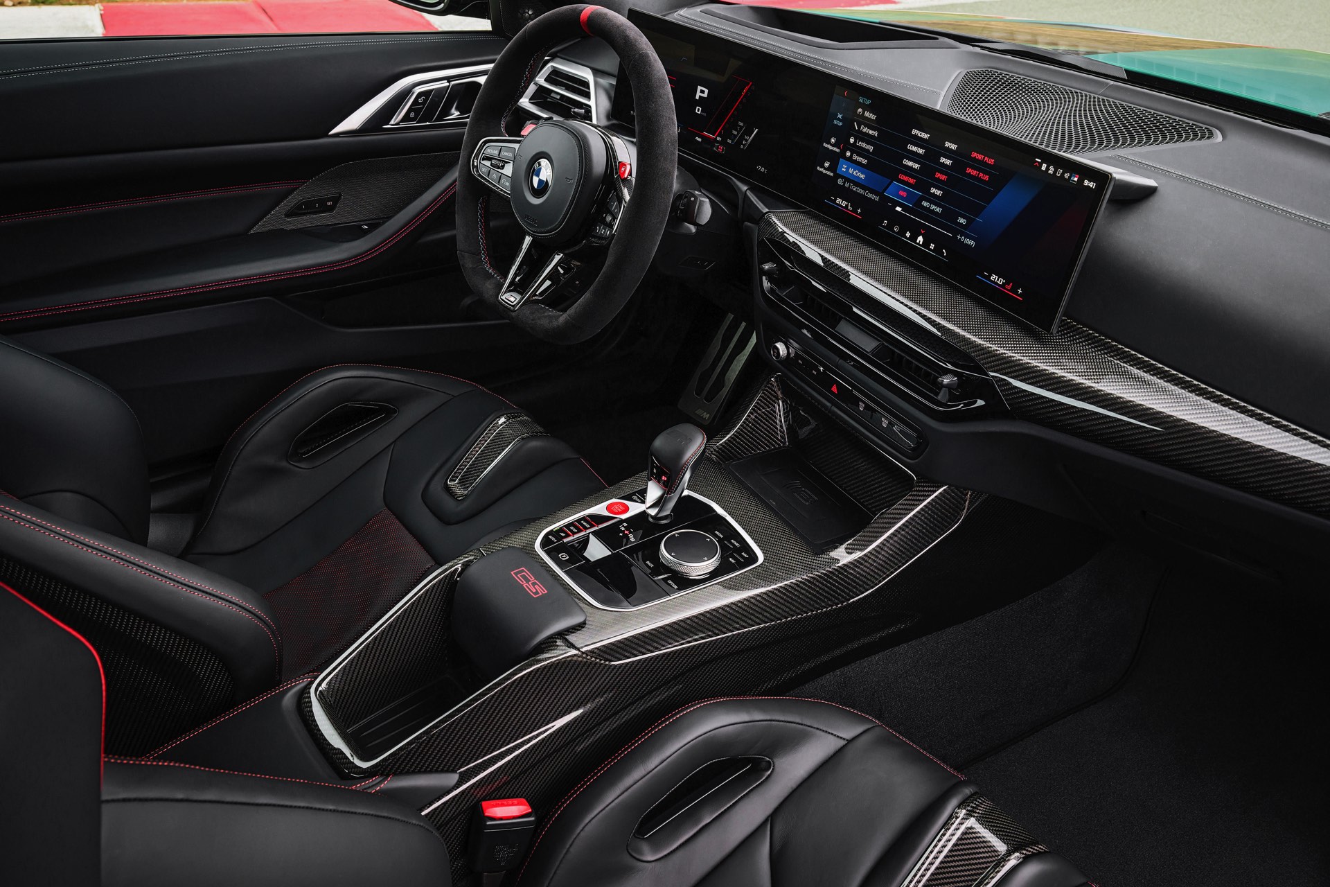 Neben Dach und Motorhaube bestehen auch viele kleinere Bauteile wie Frontsplitter, Heckdiffusor, Heckspoiler und Außenspiegel-Kappen aus Carbon, dazu kommen leichte Schmiedefelgen und eine Titan-Abgasanlage mit Klappensteuerung, die in den Modi Sport und Sport+ für noch satteren Sound sorgt. Fortgesetzt wird das Diät-Programm im Innenraum, wo neben Interieurleisten und Schaltwippen auch die komplette Mittelkonsole und die Schalensitze aus Carbon bestehen. Anders als der CSL bleibt der M4 CS ein echter Viersitzer, er kommt also mit nutzbarer Rückbank und ohne Überrollkäfig.