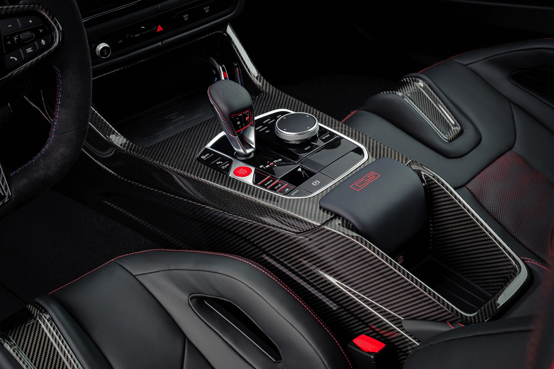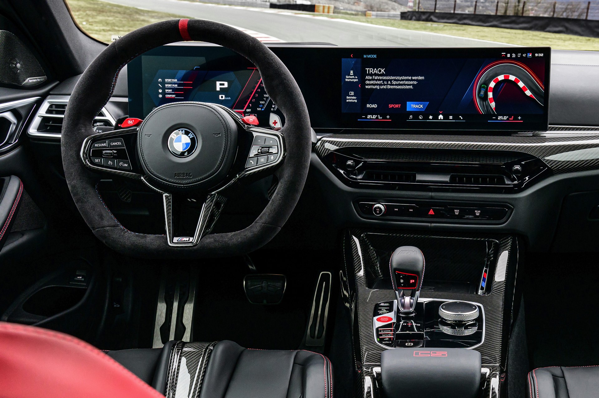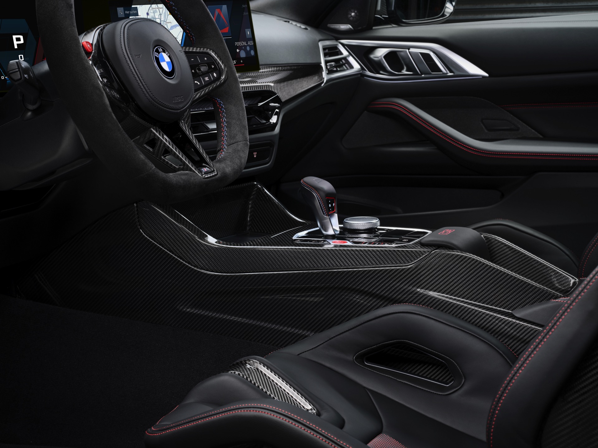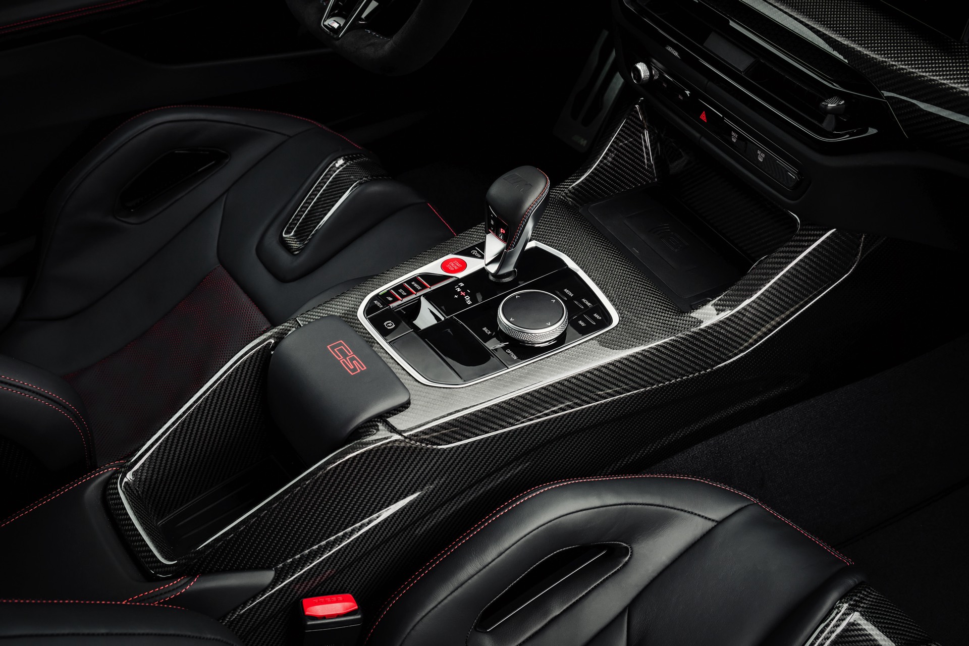 Neben Dach und Motorhaube bestehen auch viele kleinere Bauteile wie Frontsplitter, Heckdiffusor, Heckspoiler und Außenspiegel-Kappen aus Carbon, dazu kommen leichte Schmiedefelgen und eine Titan-Abgasanlage mit Klappensteuerung, die in den Modi Sport und Sport+ für noch satteren Sound sorgt. Fortgesetzt wird das Diät-Programm im Innenraum, wo neben Interieurleisten und Schaltwippen auch die komplette Mittelkonsole und die Schalensitze aus Carbon bestehen. Anders als der CSL bleibt der M4 CS ein echter Viersitzer, er kommt also mit nutzbarer Rückbank und ohne Überrollkäfig.