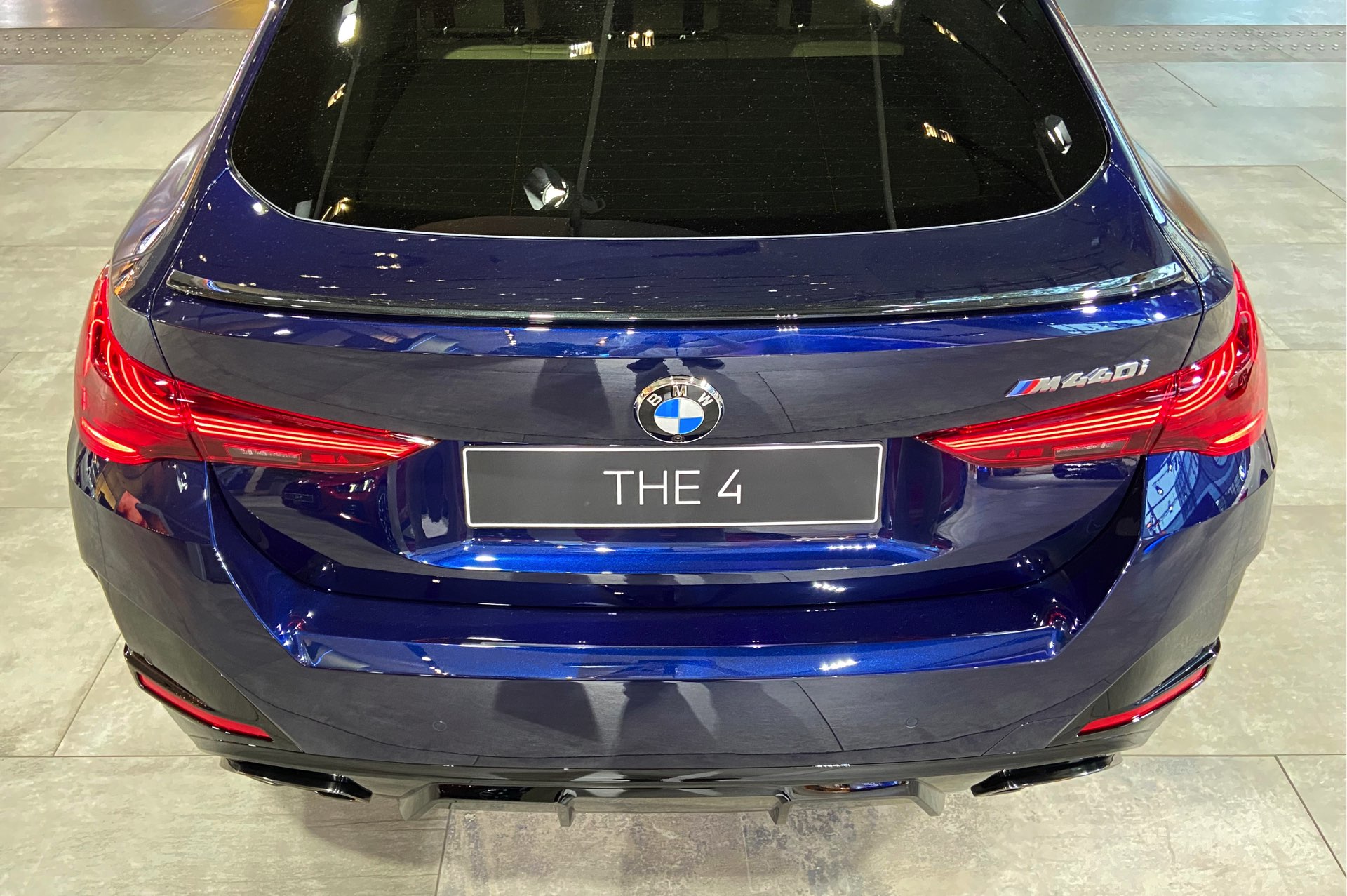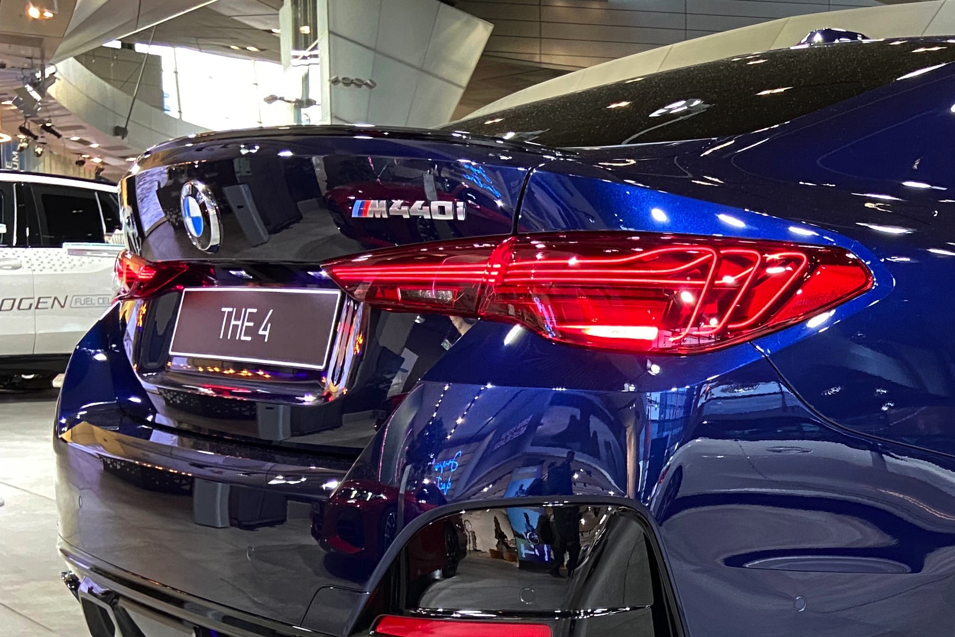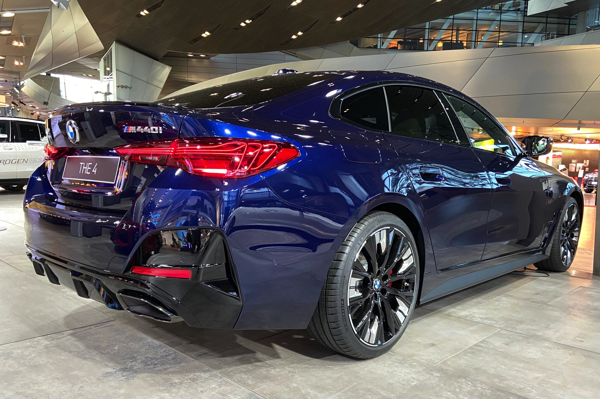 Im Fokus steht ein BMW M440i Facelift in Tansanitblau und mit M Sport Pro-Paket samt erweiterter Shadow Line, die unter anderem für eine schwarz lackierte Nieren-Einfassung sorgt. Ein frischer Anblick sind natürlich auch die neuen Scheinwerfer, deren aufrecht stehende Tagfahrlicht-Elemente für eine klare Abgrenzung vom Pre-Facelift sorgen. In der gezeigten Konfiguration verzichtet das 4er Gran Coupé überwiegend auf helle Farben, nur Teile der 20 Zoll großen Bicolor-Felgen, die dahinter erkennbaren Bremssättel der M Sportbremse in Rot und natürlich die neuen Heckleuchten mit ihrem vom M4 CSL übernommenen Look setzen kräftig-farbige Akzente zur dunkelblauen Lackierung. "