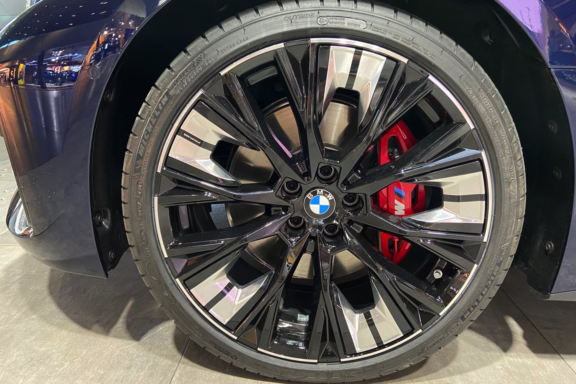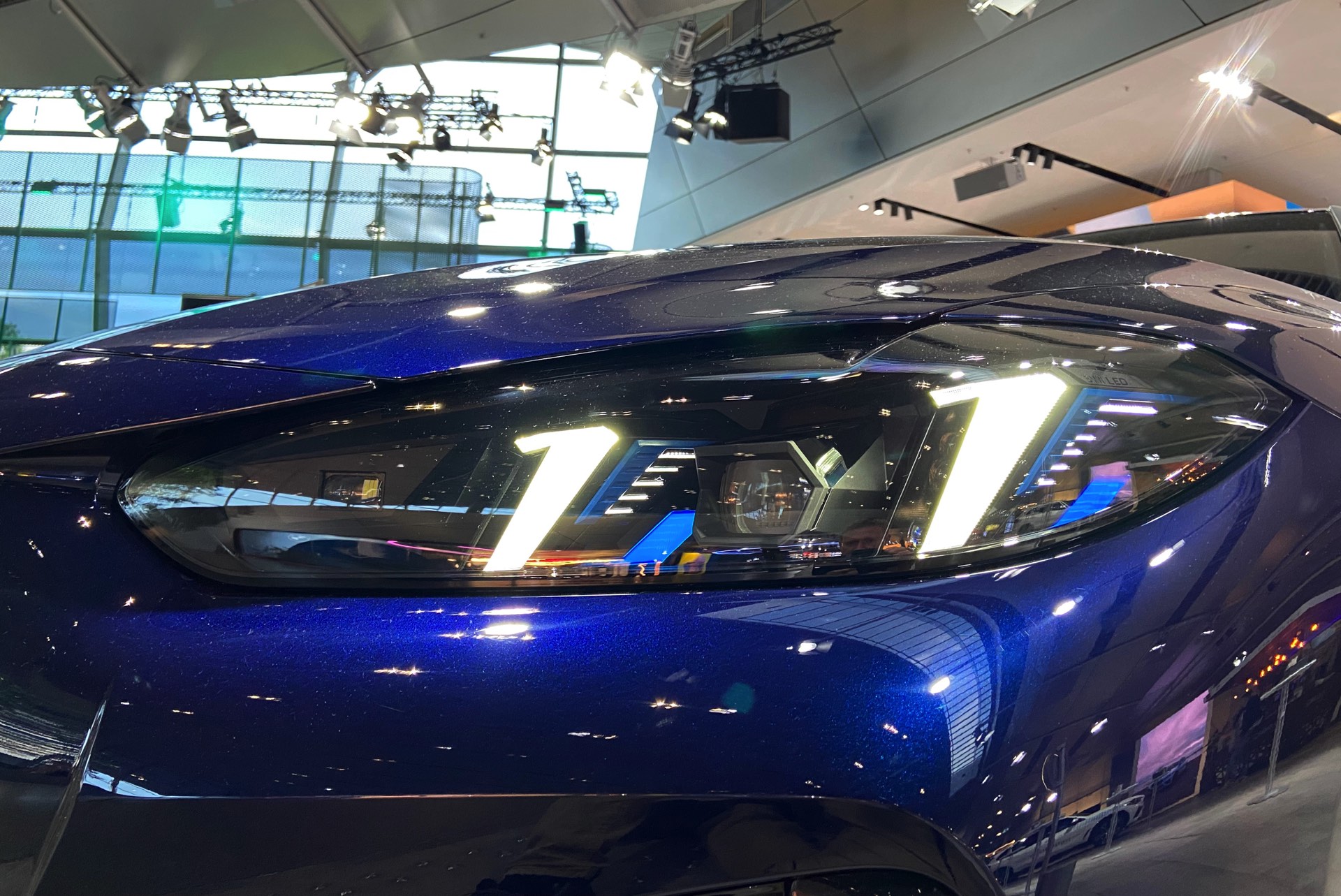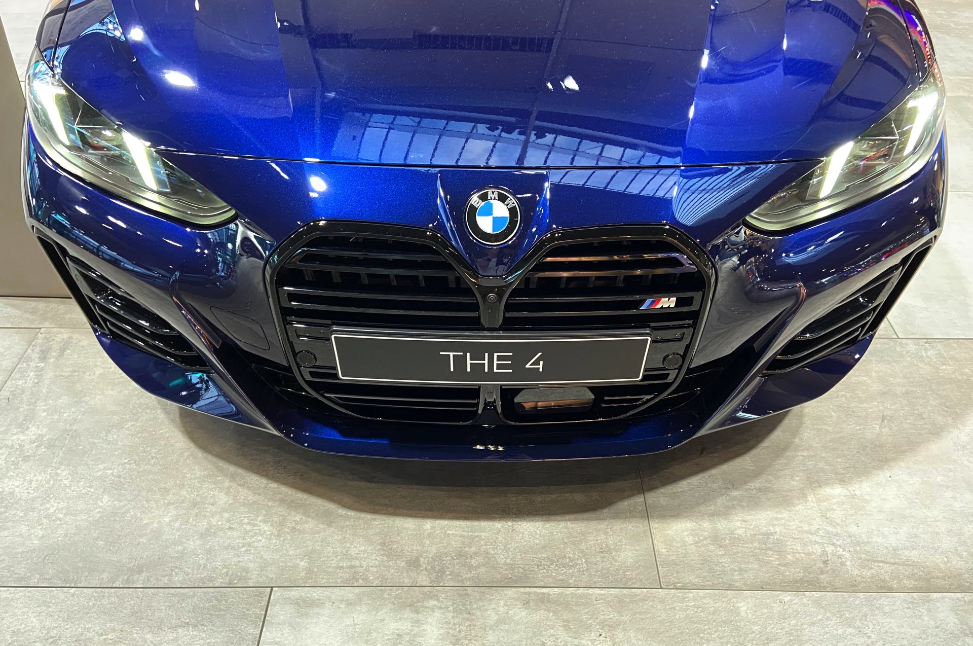 Im Fokus steht ein BMW M440i Facelift in Tansanitblau und mit M Sport Pro-Paket samt erweiterter Shadow Line, die unter anderem für eine schwarz lackierte Nieren-Einfassung sorgt. Ein frischer Anblick sind natürlich auch die neuen Scheinwerfer, deren aufrecht stehende Tagfahrlicht-Elemente für eine klare Abgrenzung vom Pre-Facelift sorgen. In der gezeigten Konfiguration verzichtet das 4er Gran Coupé überwiegend auf helle Farben, nur Teile der 20 Zoll großen Bicolor-Felgen, die dahinter erkennbaren Bremssättel der M Sportbremse in Rot und natürlich die neuen Heckleuchten mit ihrem vom M4 CSL übernommenen Look setzen kräftig-farbige Akzente zur dunkelblauen Lackierung. "