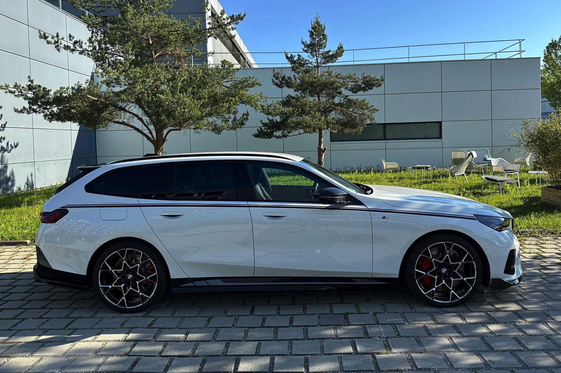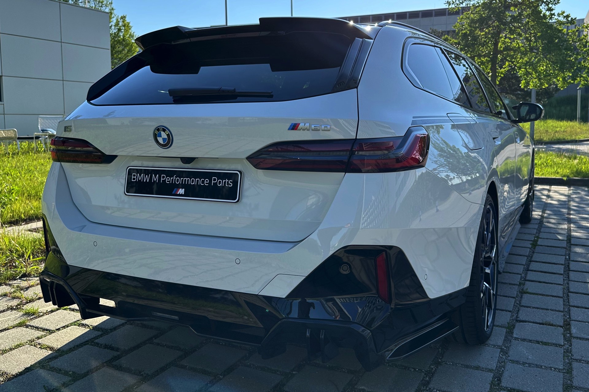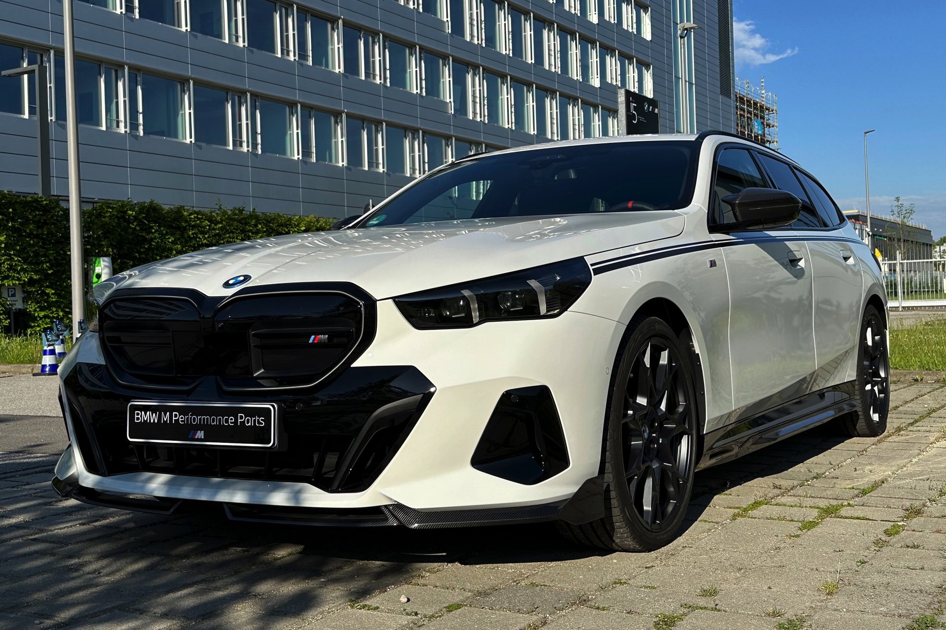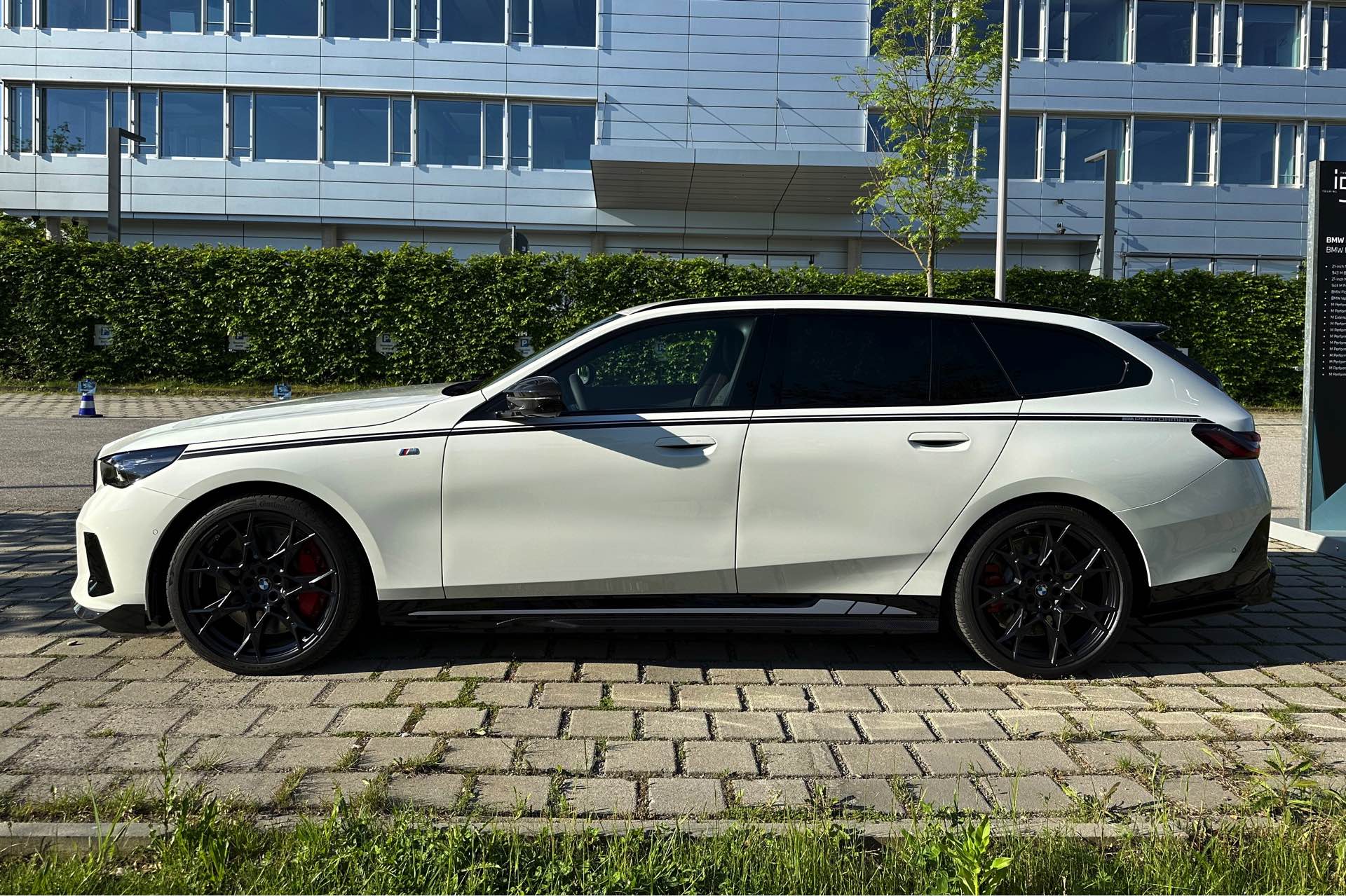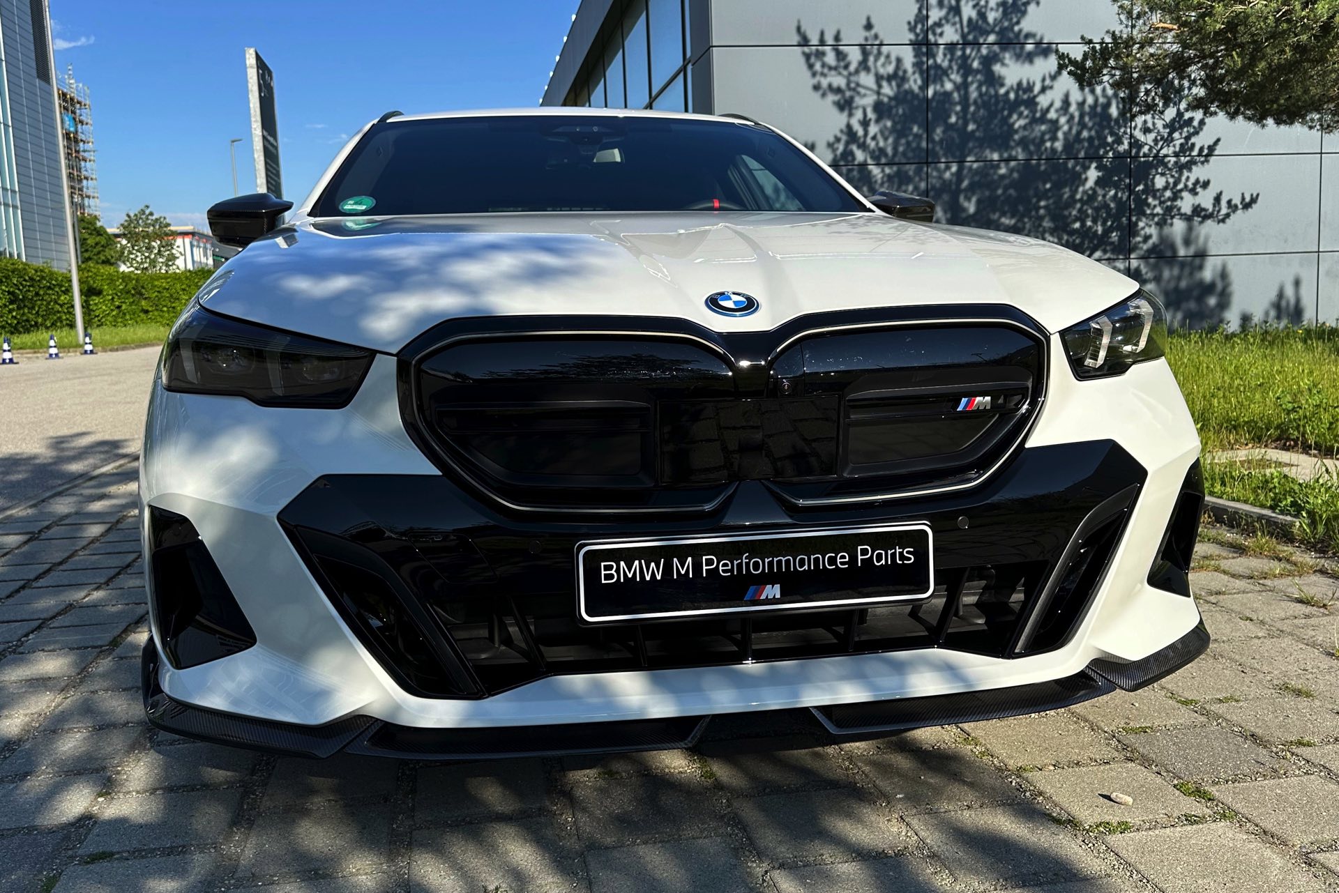 Der erste BMW i5 Touring glänzt auf den ersten Live-Fotos mit Tuning-Teilen aus dem Programm der M Performance Parts in einer schwarz-weißen Konfiguration, die man durchaus als Sinnbild für seinen ambivalenten Charakter sehen kann: Mit 601 PS ist er ein bitterböser Performance-Kombi, aber seine dunkle Seite wird mit sauberem Elektroantrieb und der damit verbundenen Fähigkeit zum lokal emissionsfreiem Fahren kombiniert. Die gezeigte Konfiguration kann in praktisch identischer Form natürlich auch für den neuen BMW 5er Touring (G61) mit konventionellem Antrieb bestellt werden, nur die Niere mit ihren horizontalen Streben bleibt für den Moment dem M Performance-Modell i5 M60 vorbehalten.