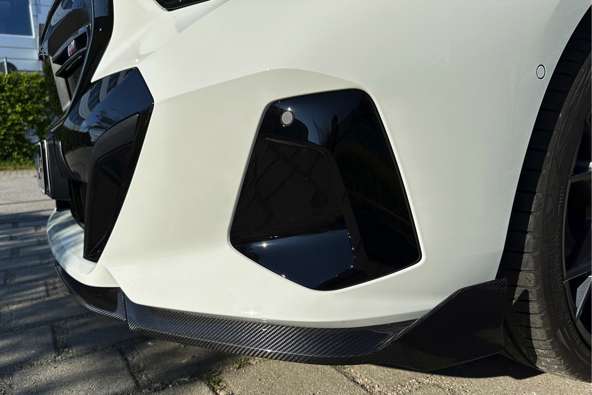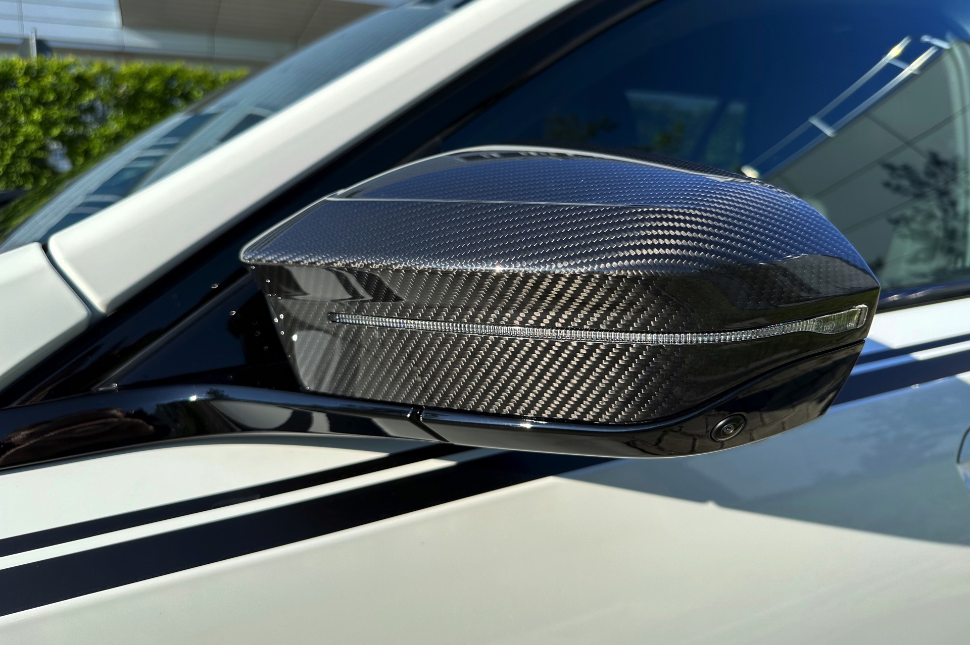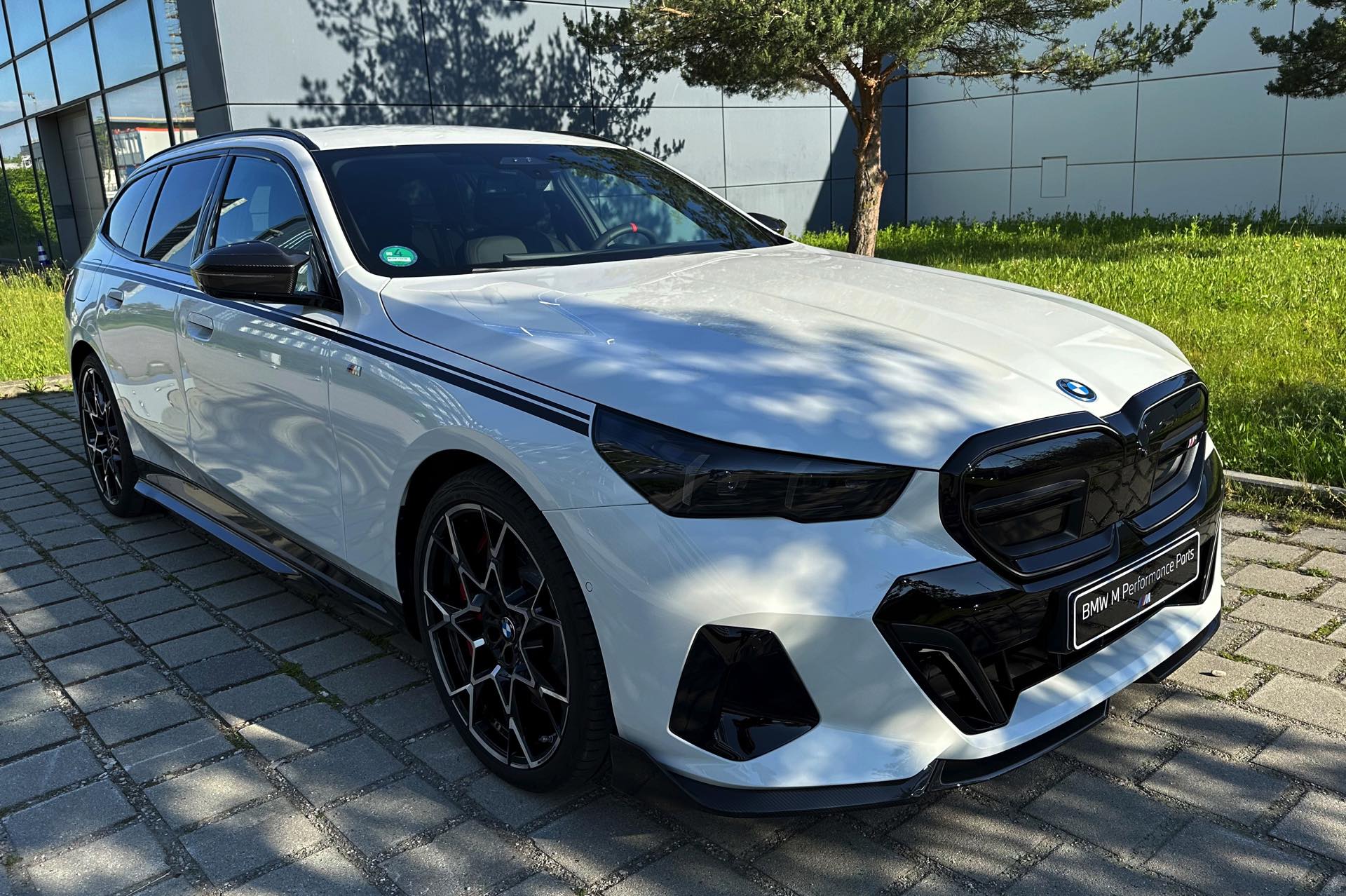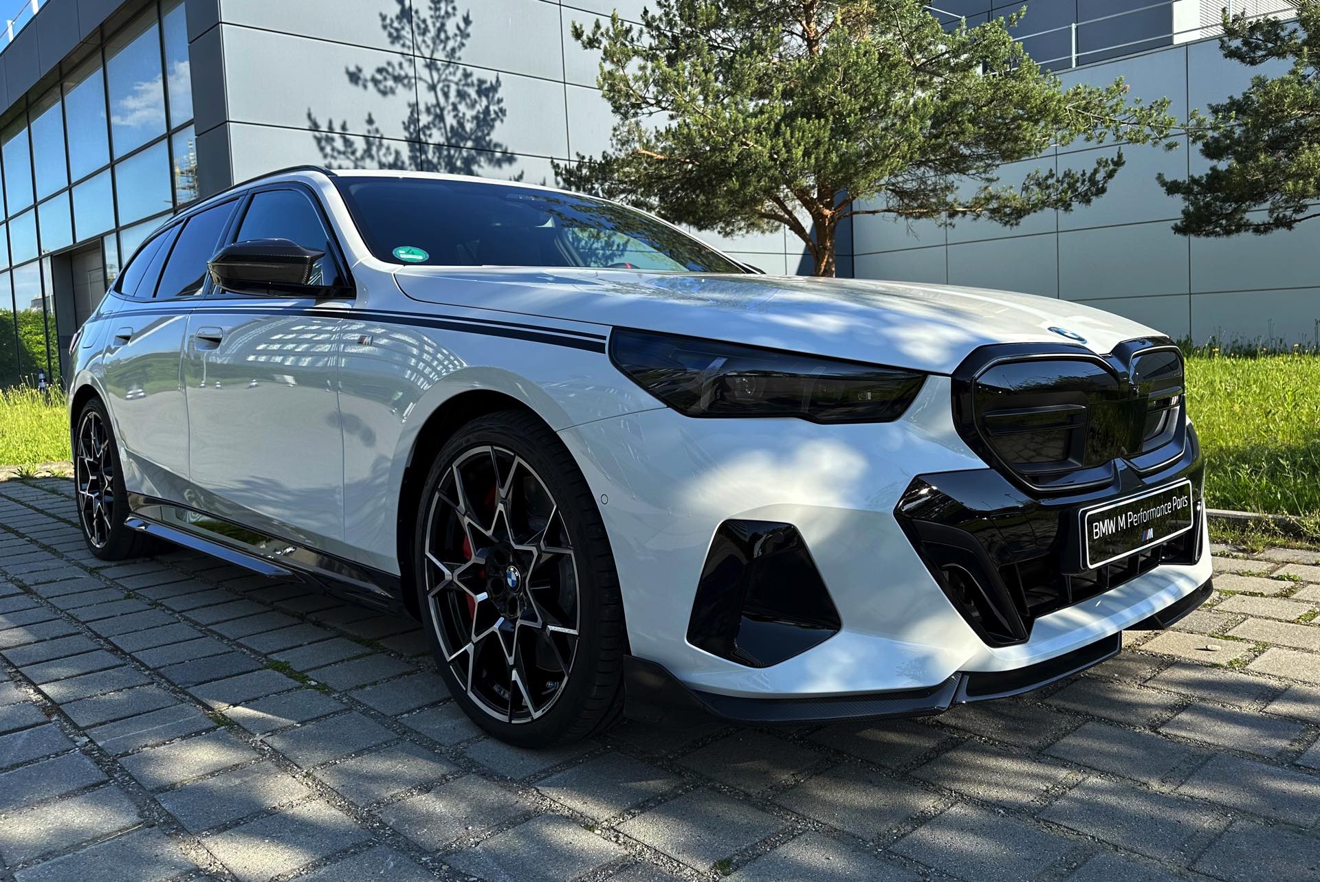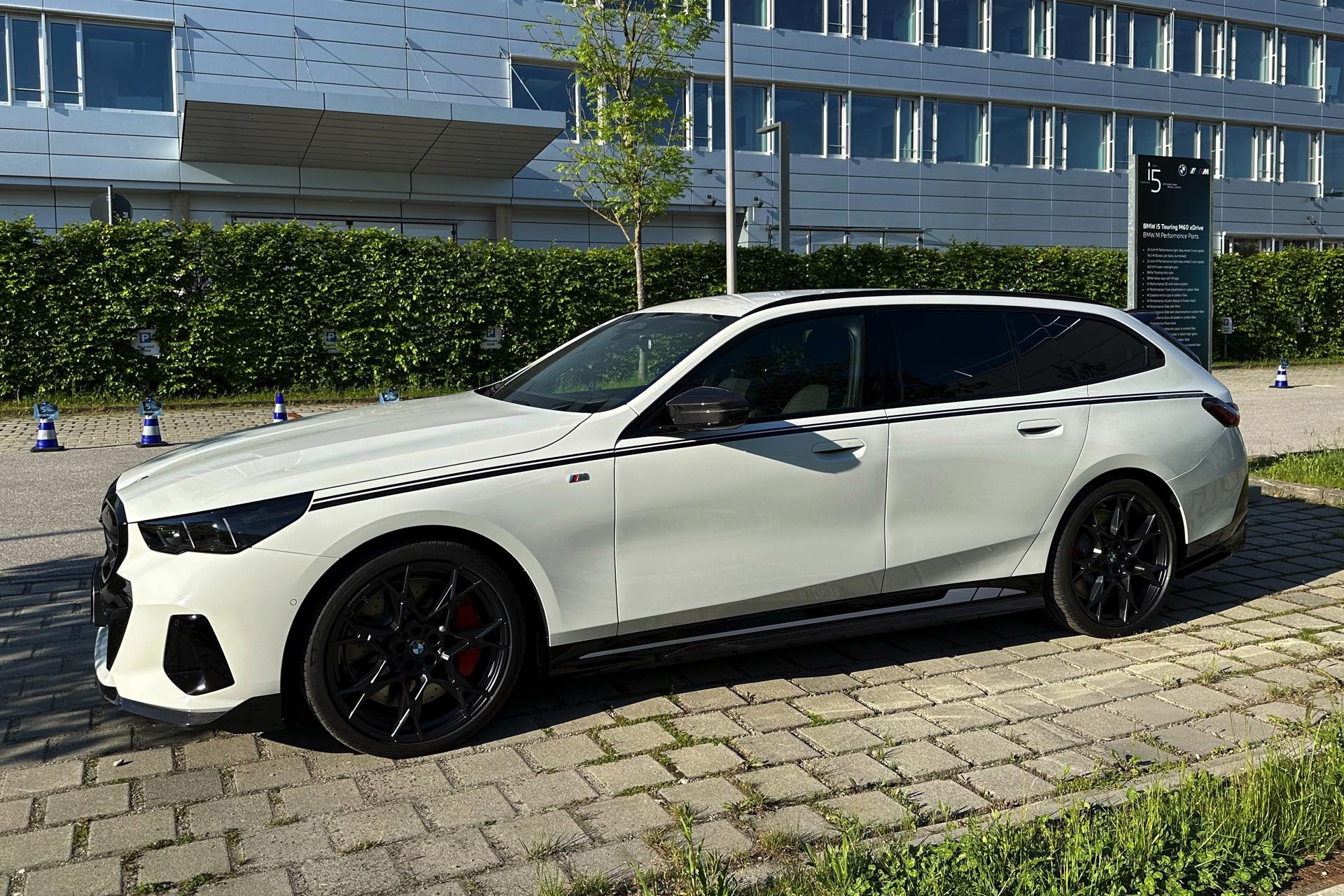 Der erste BMW i5 Touring glänzt auf den ersten Live-Fotos mit Tuning-Teilen aus dem Programm der M Performance Parts in einer schwarz-weißen Konfiguration, die man durchaus als Sinnbild für seinen ambivalenten Charakter sehen kann: Mit 601 PS ist er ein bitterböser Performance-Kombi, aber seine dunkle Seite wird mit sauberem Elektroantrieb und der damit verbundenen Fähigkeit zum lokal emissionsfreiem Fahren kombiniert. Die gezeigte Konfiguration kann in praktisch identischer Form natürlich auch für den neuen BMW 5er Touring (G61) mit konventionellem Antrieb bestellt werden, nur die Niere mit ihren horizontalen Streben bleibt für den Moment dem M Performance-Modell i5 M60 vorbehalten.