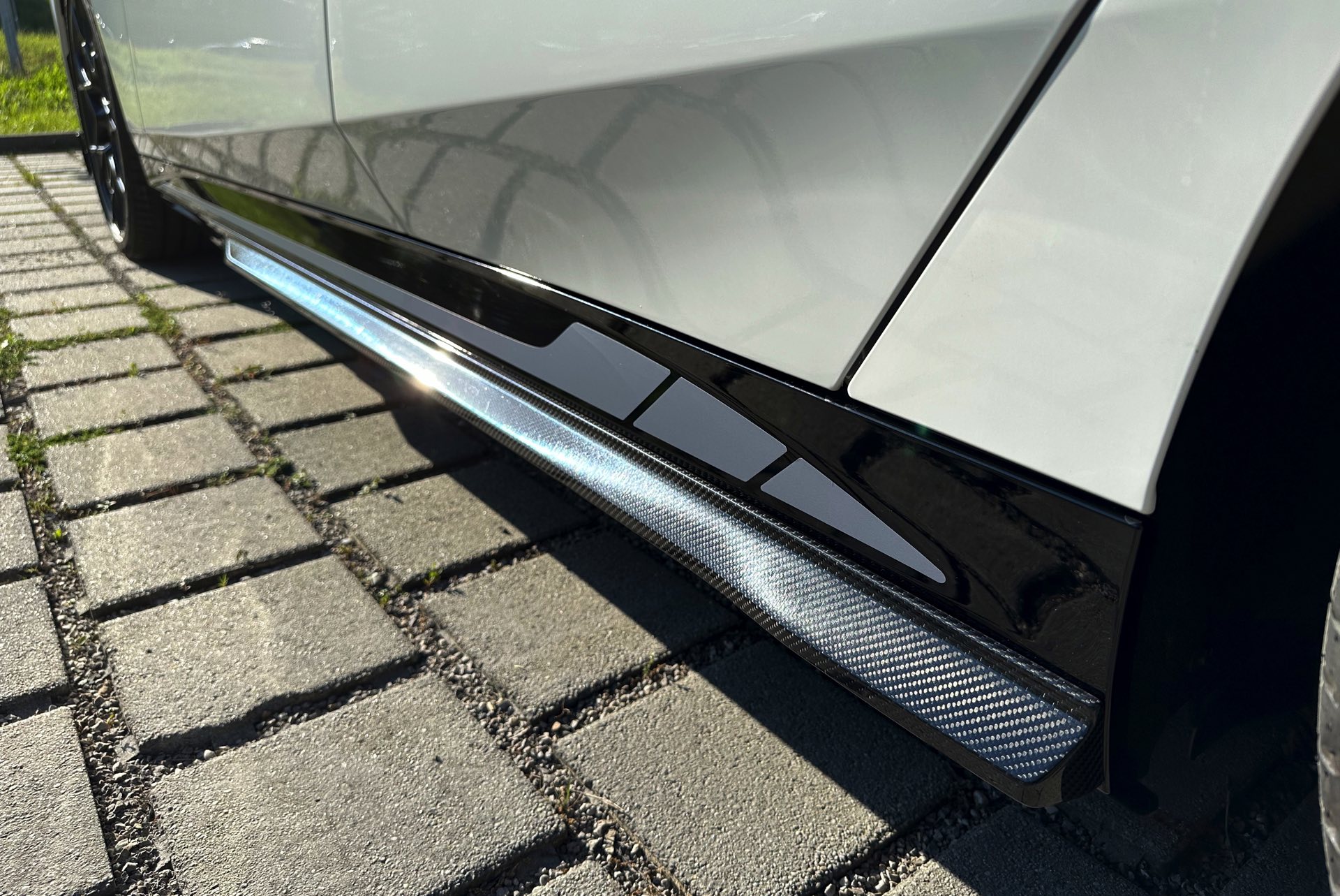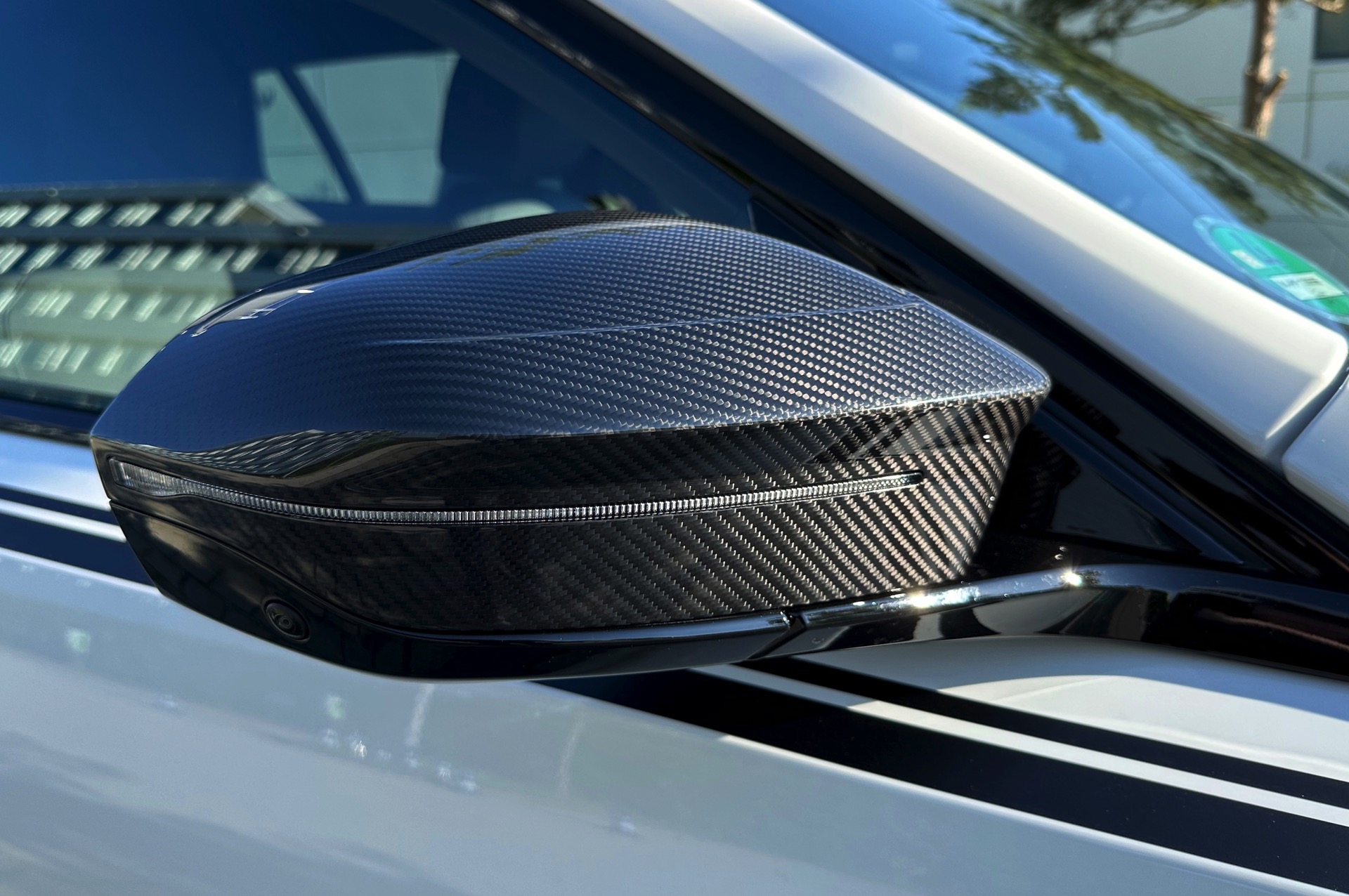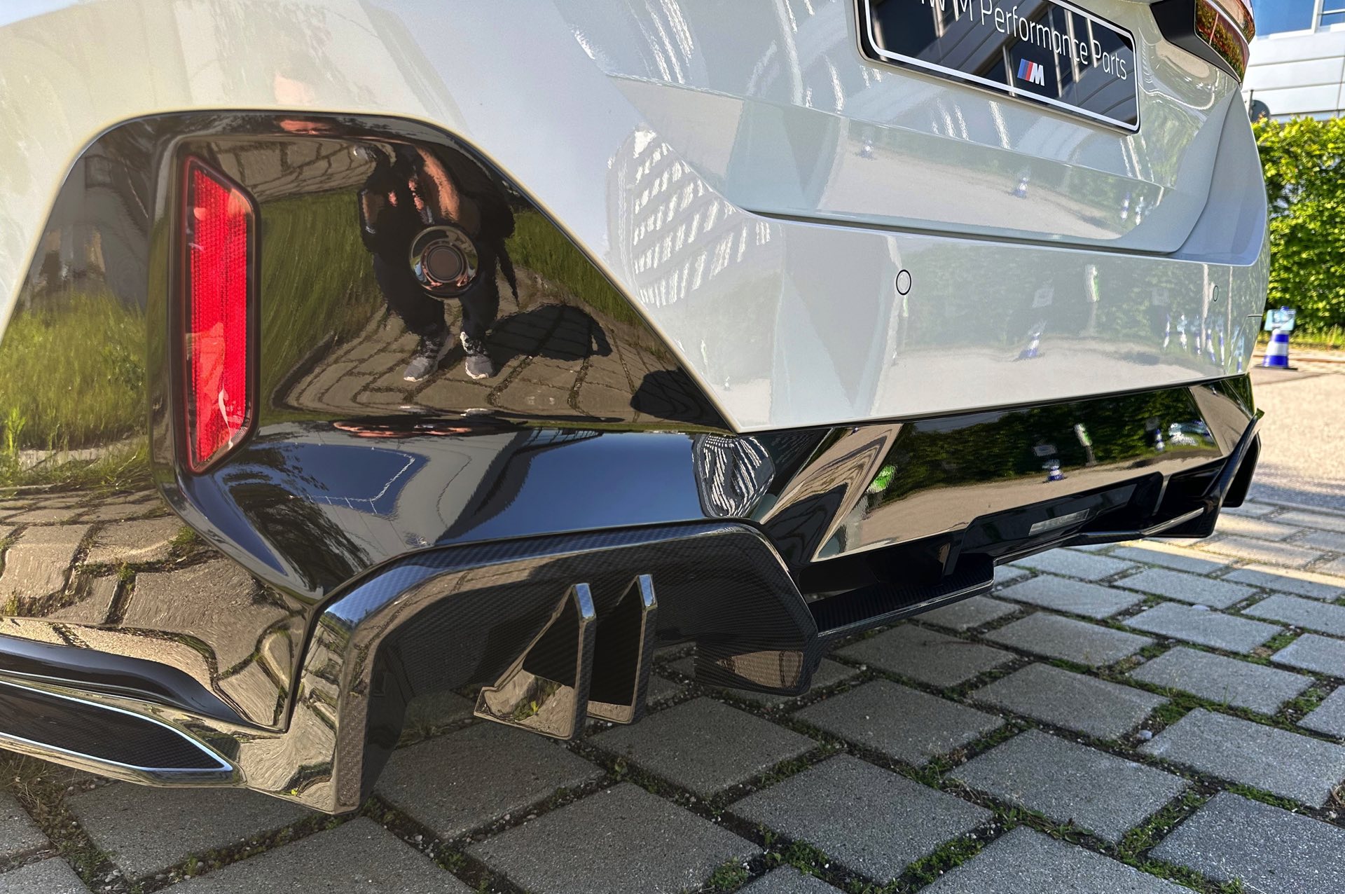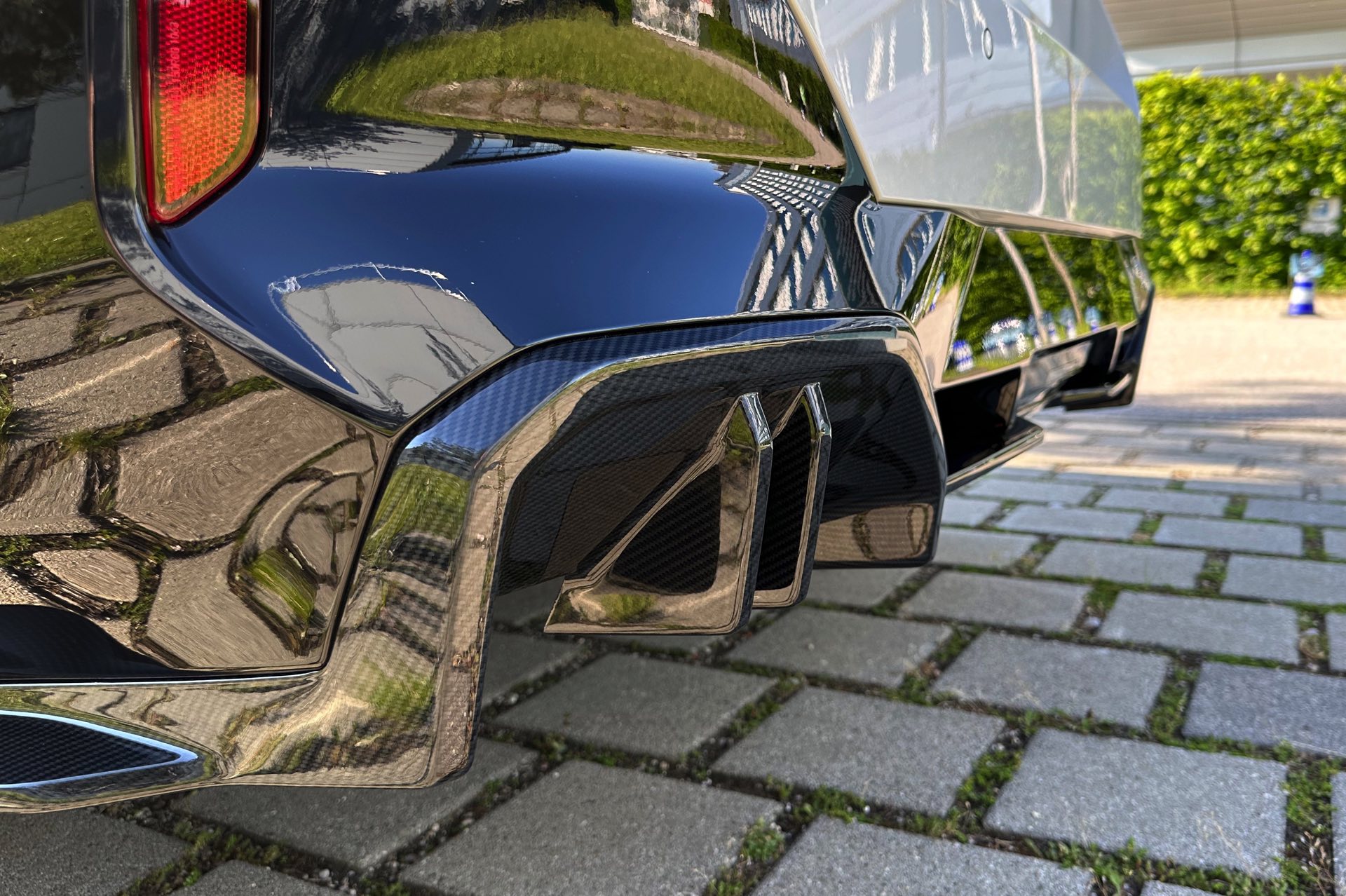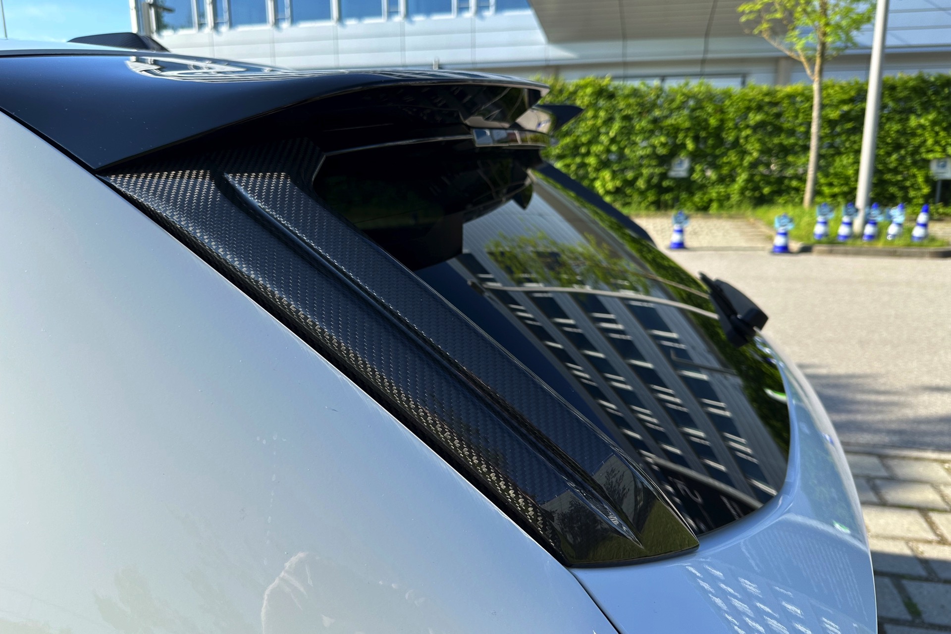 Für die dunklen Seiten des gezeigten i5 ist nicht nur das M Sport Pro-Paket mit seinen schwarzen Nieren und weiteren Umfängen in Hochglanz-Schwarz verantwortlich, sondern auch eine ganze Serie von Carbon-Teilen. Angefangen vom Frontsplitter über die Außenspiegel und Seitenschweller bis hin zum Diffusor finden sich aus praktisch jeder Perspektive Teile in Sicht-Carbon, bei genauerem Hinsehen fallen weitere Details wie die Aero-Finnen an den Seiten der Heckscheibe ins Auge.