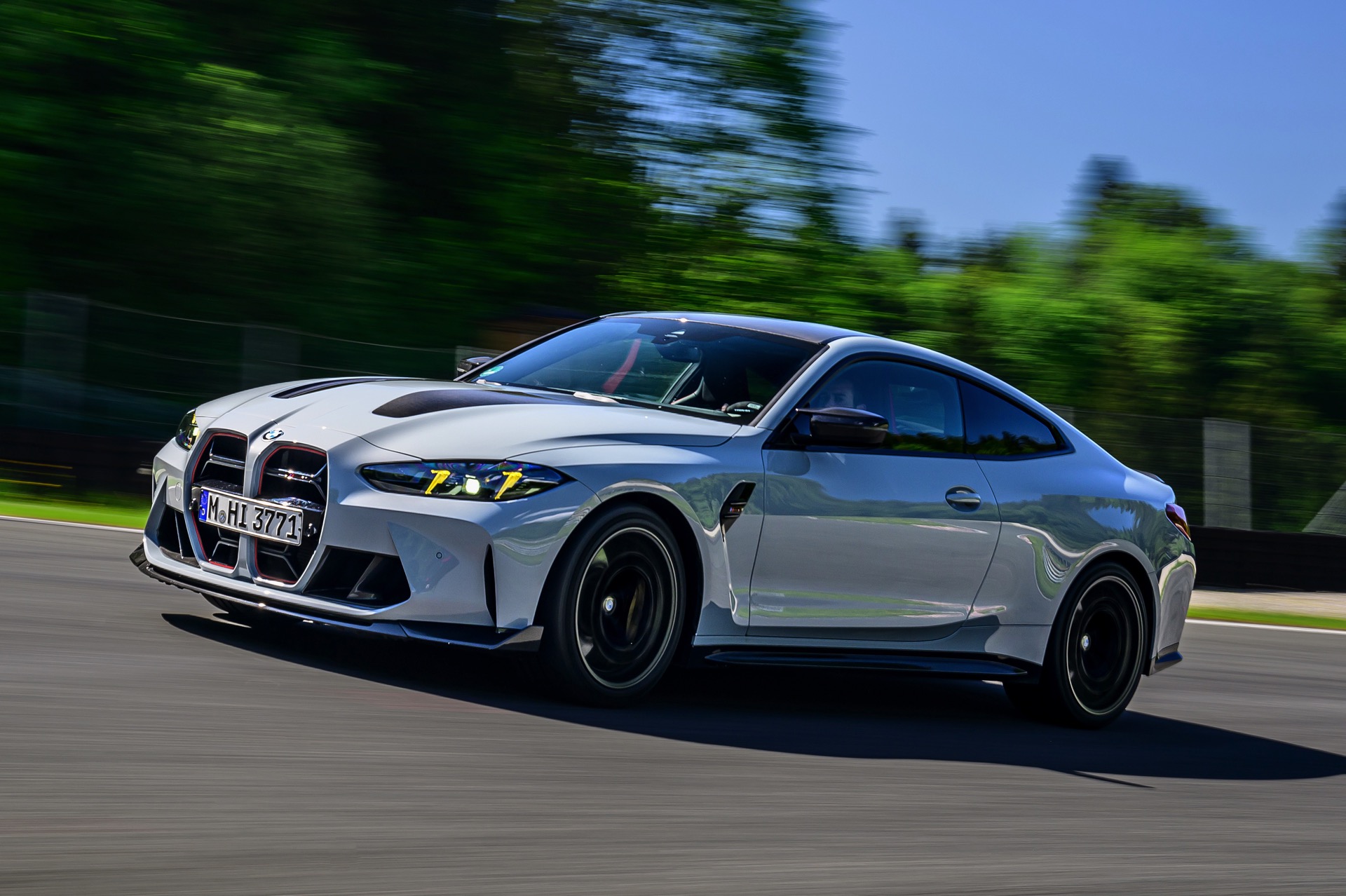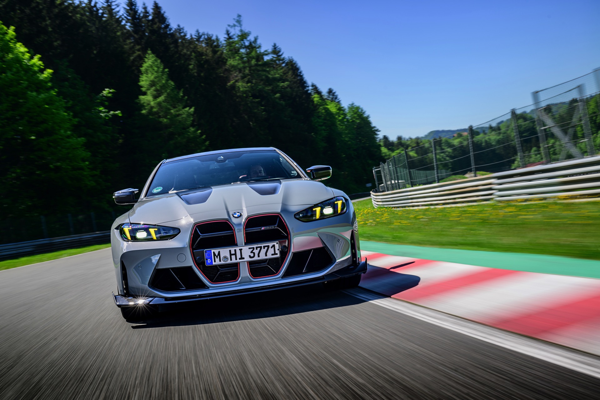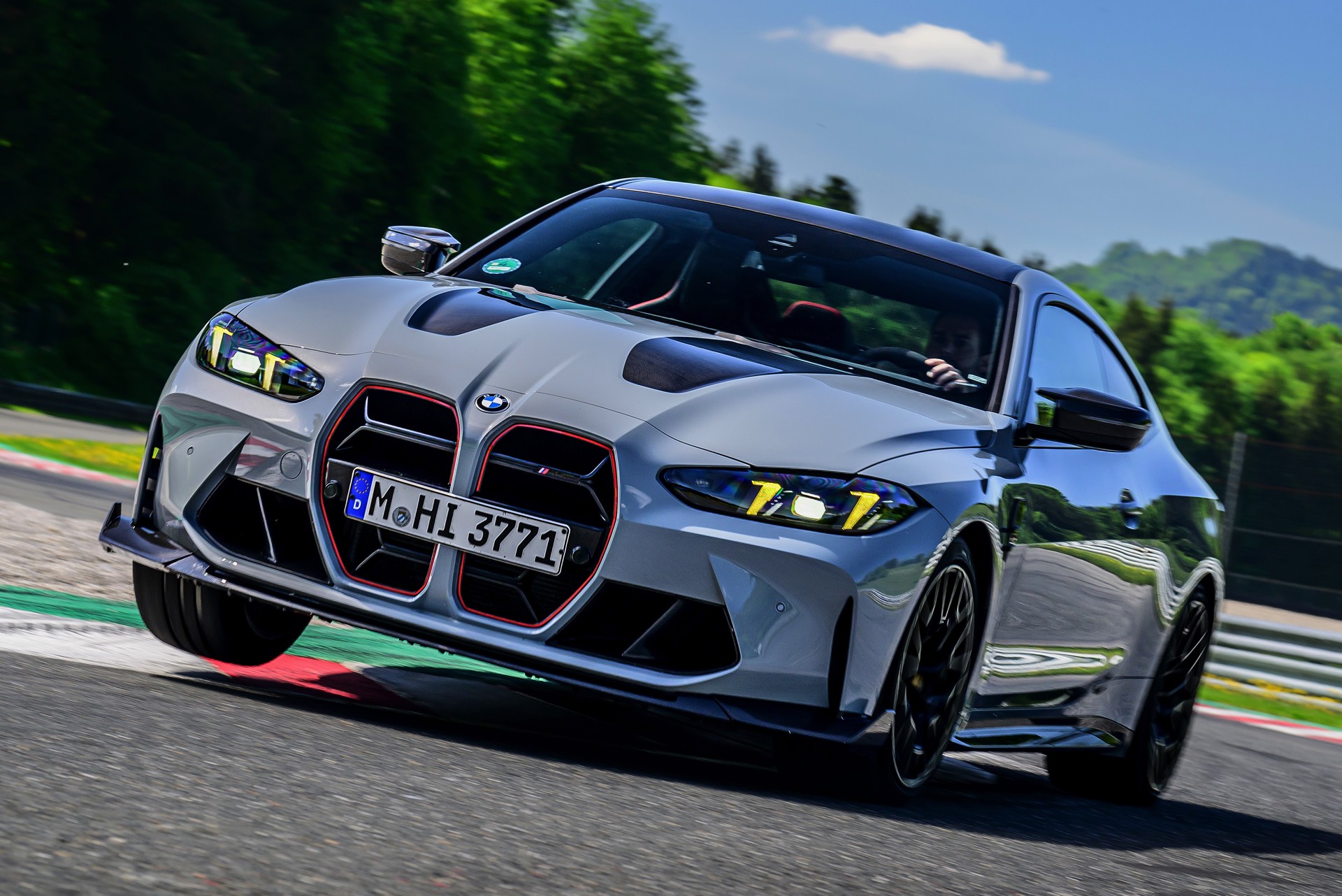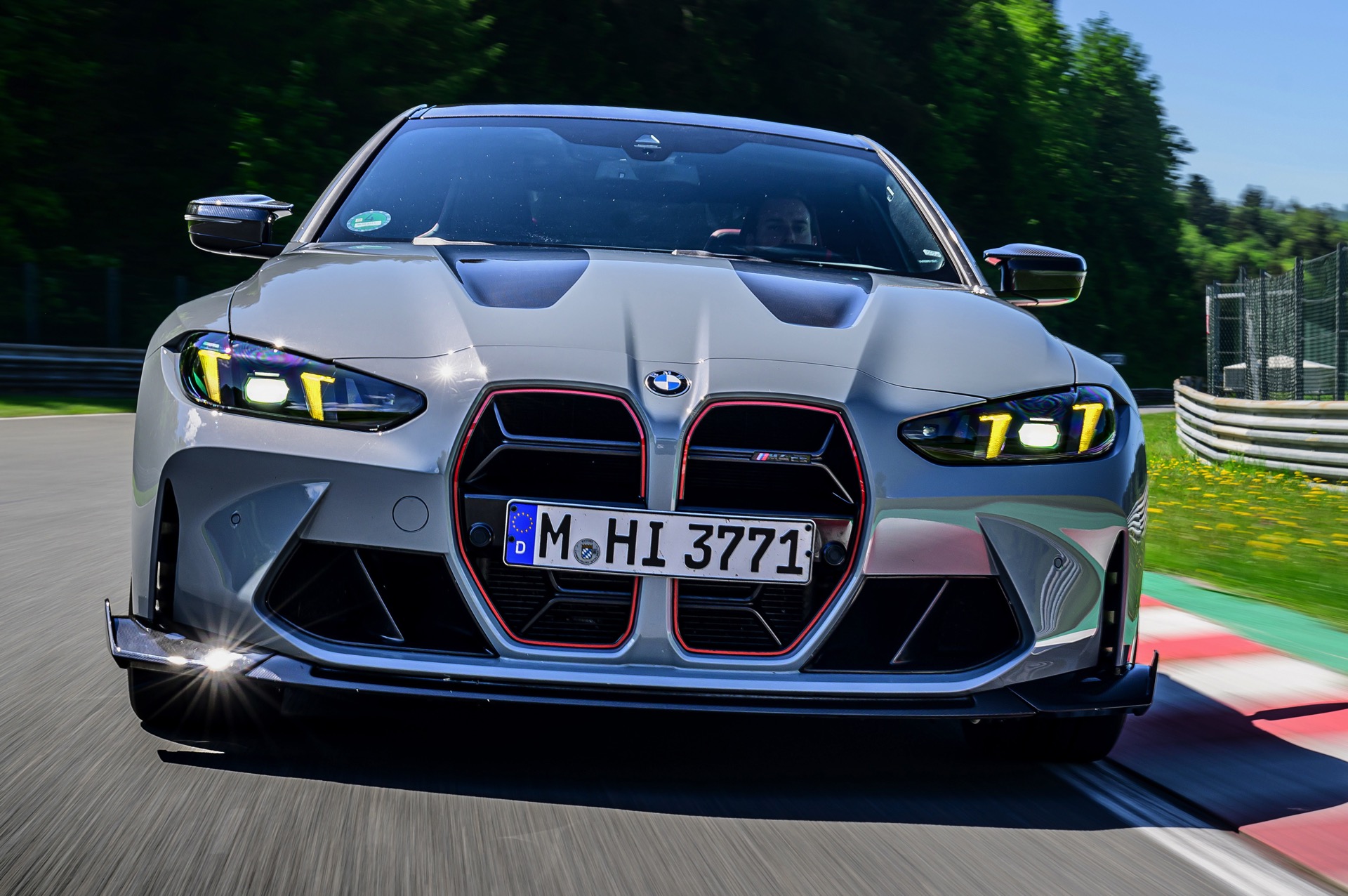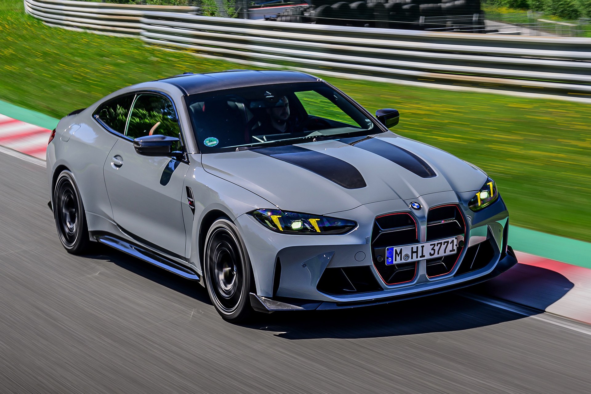 Dunkle Akzente zur grauen Lackierung setzen das Carbon-Dach, vor allem aber auch die teilweise in Sicht-Carbon ausgeführte Oberfläche der leichten Kohlefaser-Motorhaube. Unterhalb der regulären Frontschürze kommt ein großer Frontsplitter mit seitlichen Winglets zum Einsatz, der auch optisch zu einem noch dramatischeren Auftritt beiträgt. Die ohnehin wuchtige M4-Niere orientiert sich im Fall des CS eng am noch schnelleren CSL: Ganze drei Querstreben lassen eine maximale Menge an Luft in den Motorraum, außerdem betont eine rote Einfassung die Form der Nieren. "