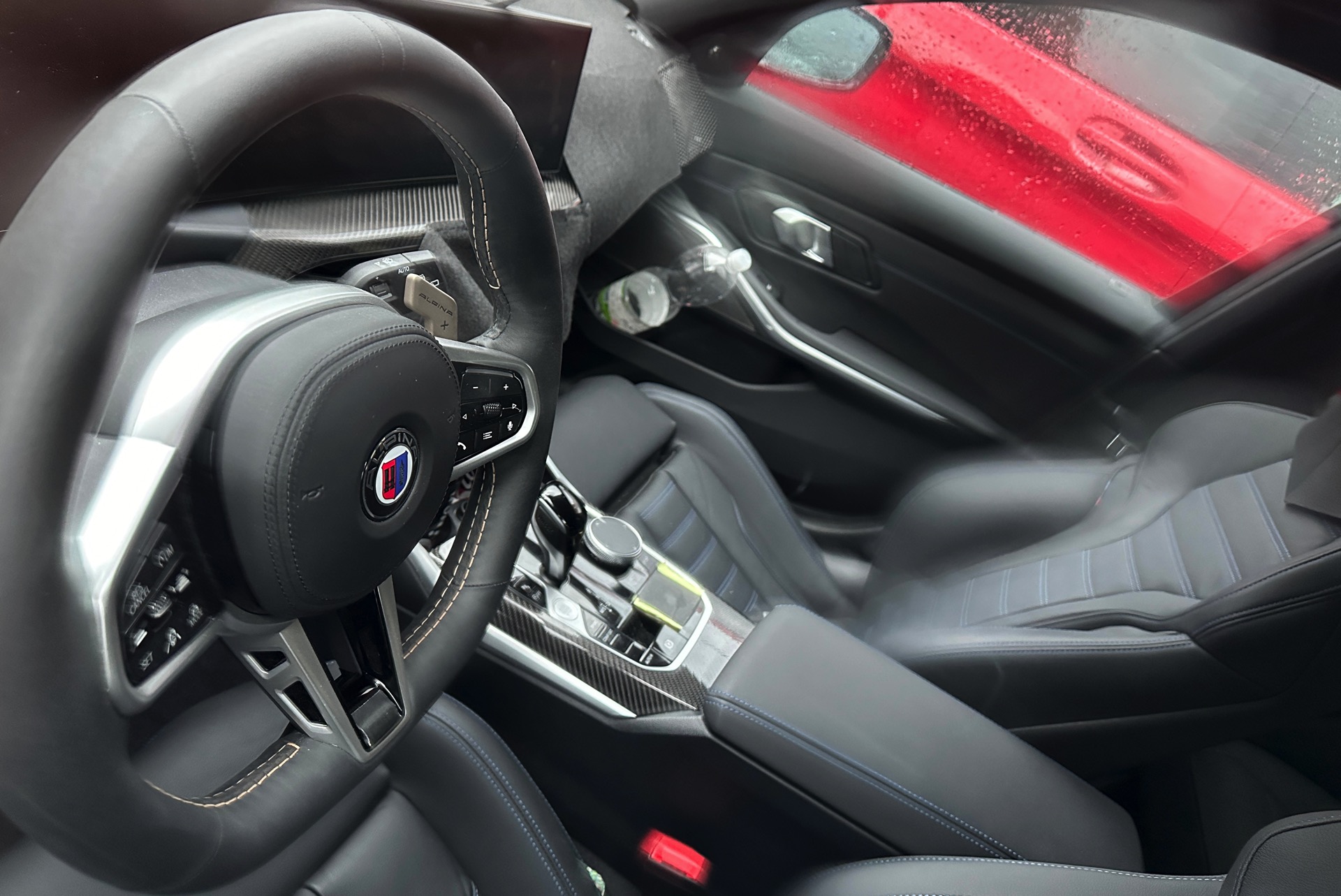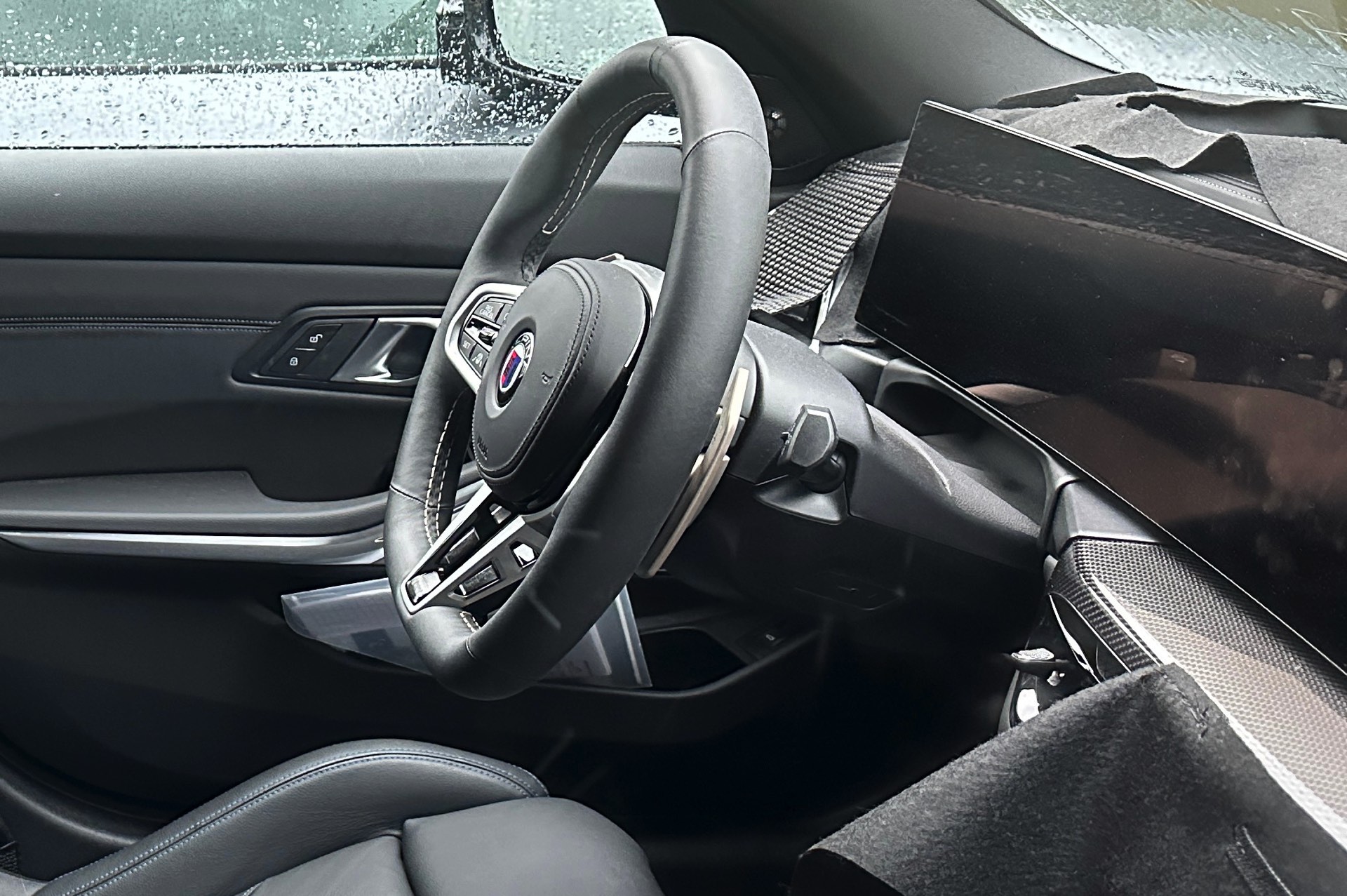 Während der Alpina B3 GT nur eine kleine Zielgruppe ins Visier nimmt, ist sein Cockpit für jeden einzelnen BMW 3er-Kunden von Interesse: Klar zu erkennen ist nicht nur die neueste Lenkrad-Generation, in diesem Fall garniert mit Schaltwippen im Stil des Alpina B5 GT, sondern auch ein neues Lüftungselement unterhalb des zentralen Touchscreen-Bereichs des Curved Displays: Obwohl der Innenraum teilweise verhüllt ist, lässt sich einer der Einstell-Knöpfe für die Lüftungsdüsen gut erkennen – und dessen Form und Position verraten eindeutig, dass hier der gleiche Look wie im BMW 4er Facelift 2024 Einzug halten wird.
